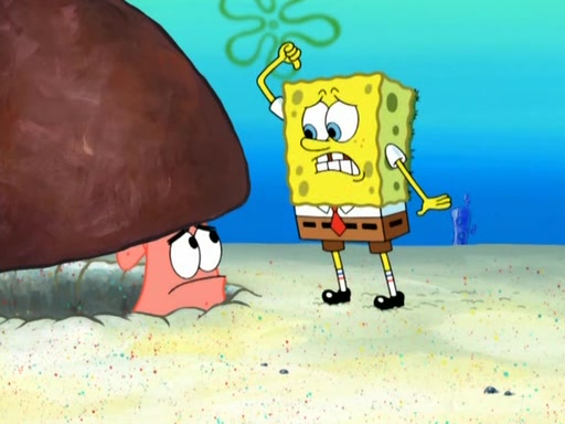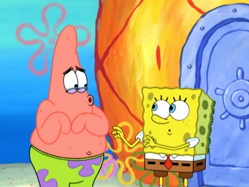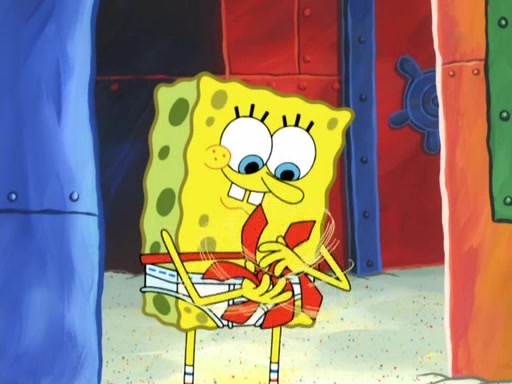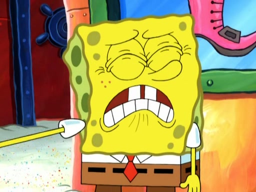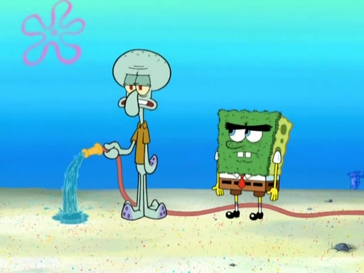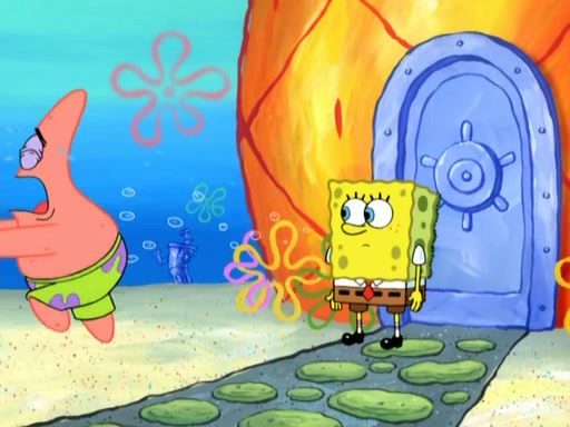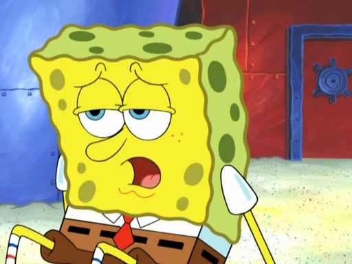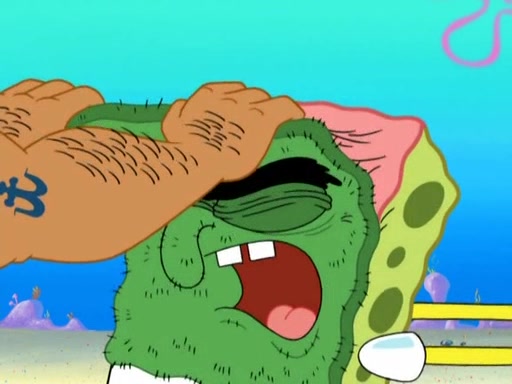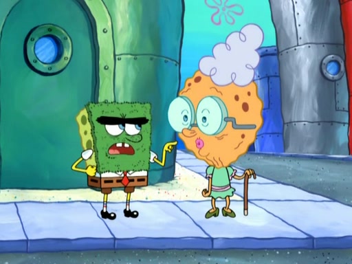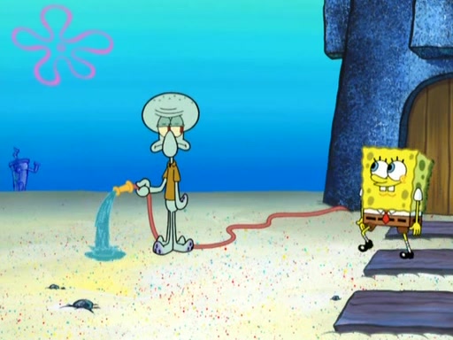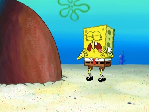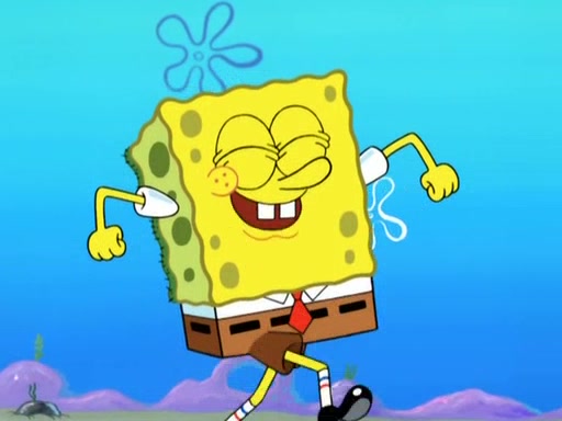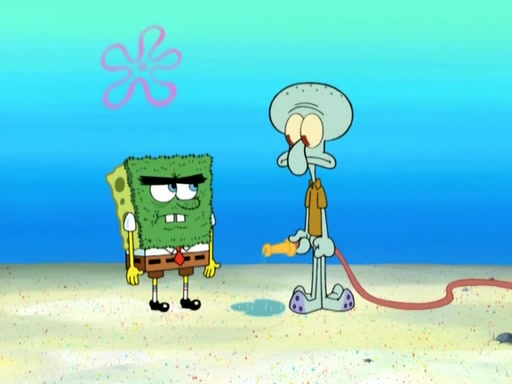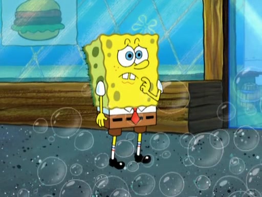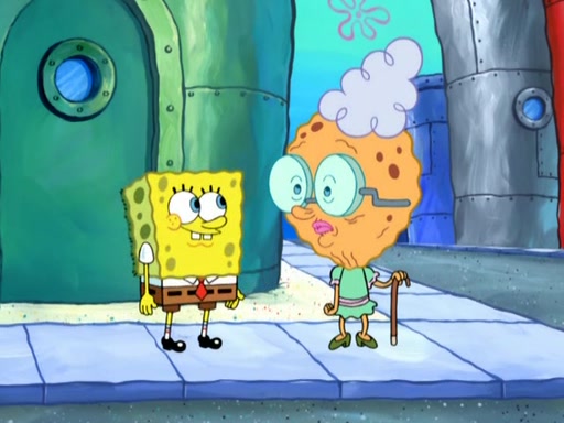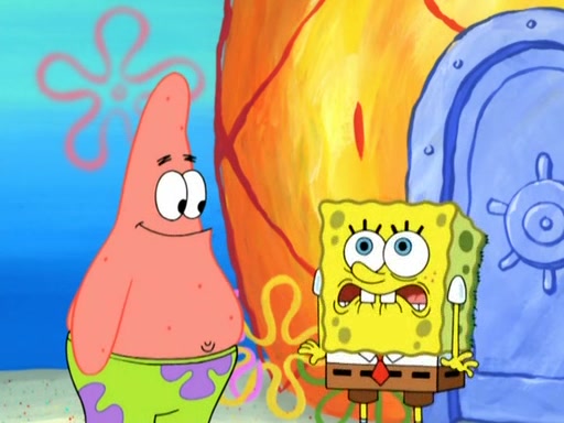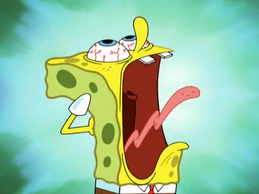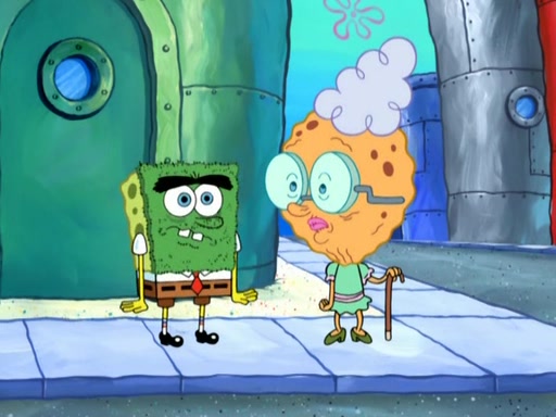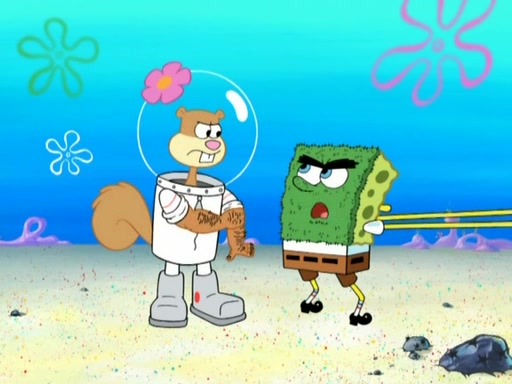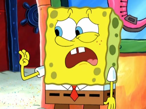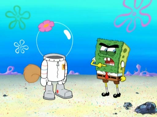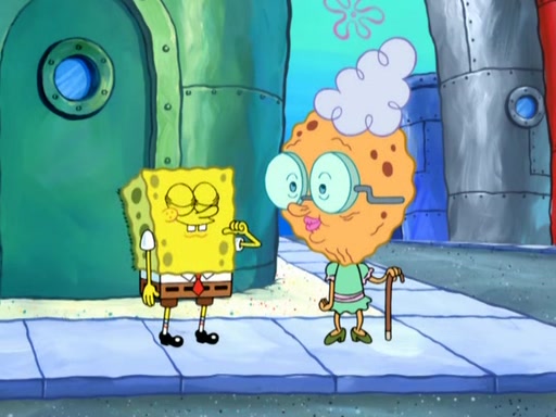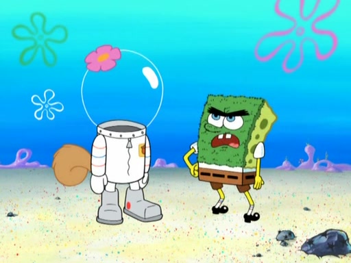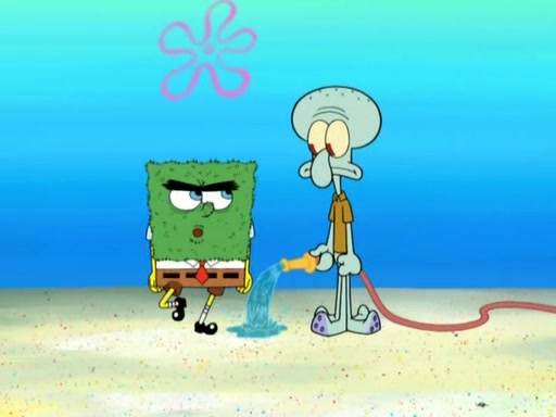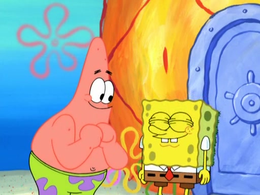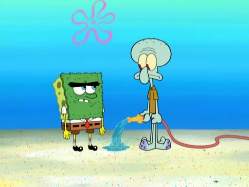 He goes out and Pilar asks him to carry his groceries for him. His body switches 180 degrees, showing the abrasive side, and says "Carry it yourself, fish-face" for SpongeBob. He does the same for Larry who asked him to help him put sun lotion on, Grandma who asked for help crossing the street, and Sandy who asked him to help her with a science invention. All of them getting harsh words thrown at them from SpongeBob's abrasive side leave, either baffled, hurt, or in Sandy's case, baffled, hurt, and physically damaged.