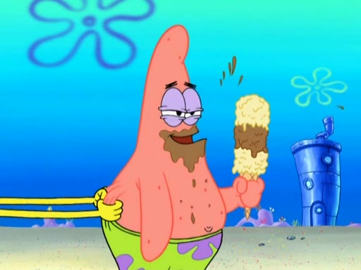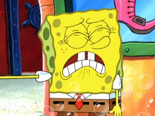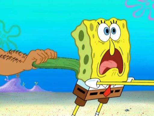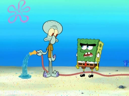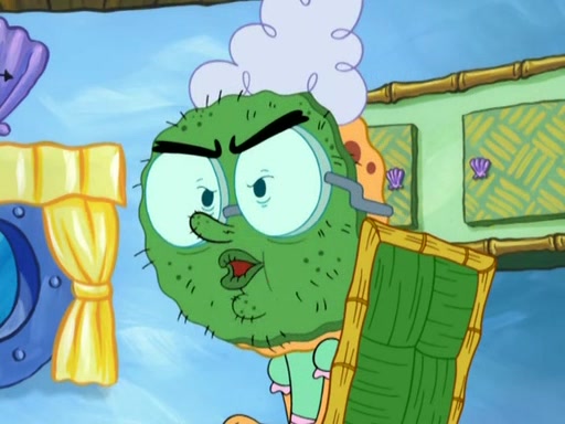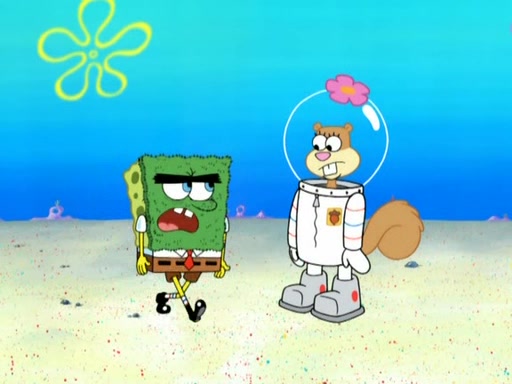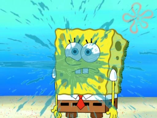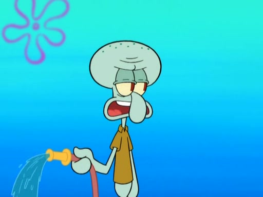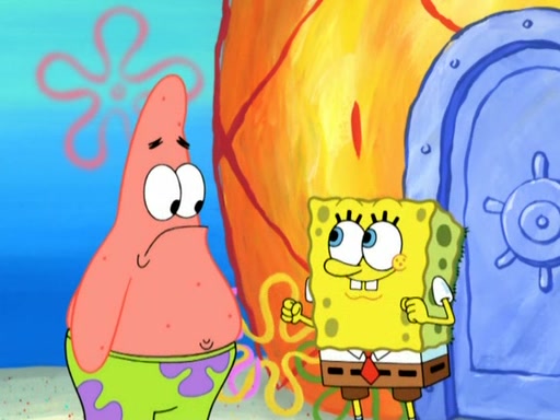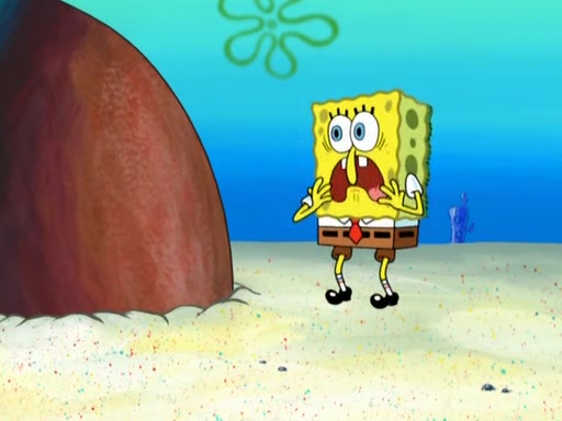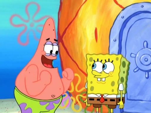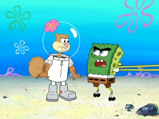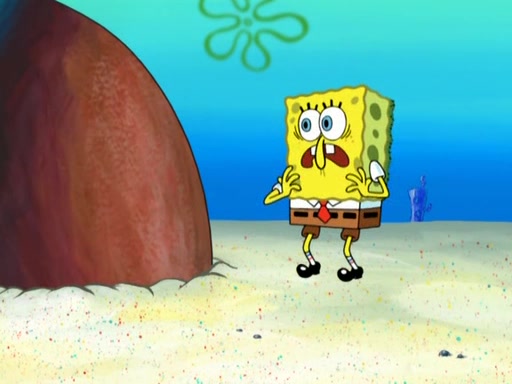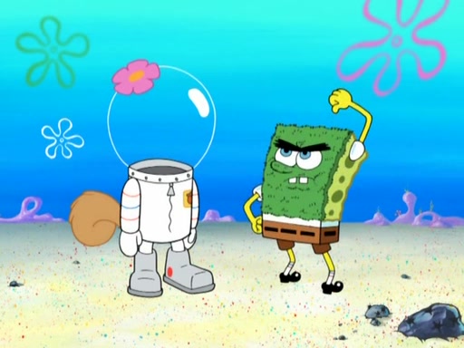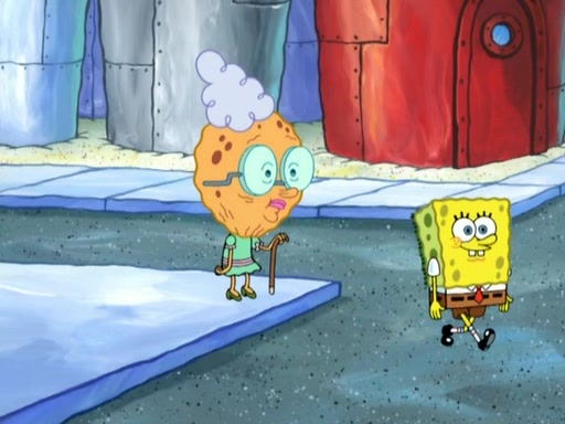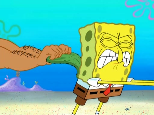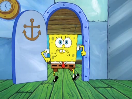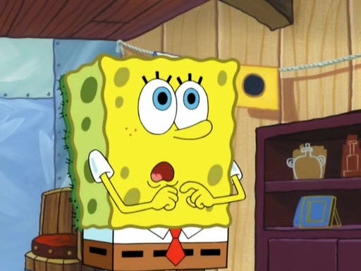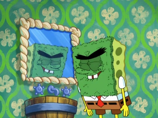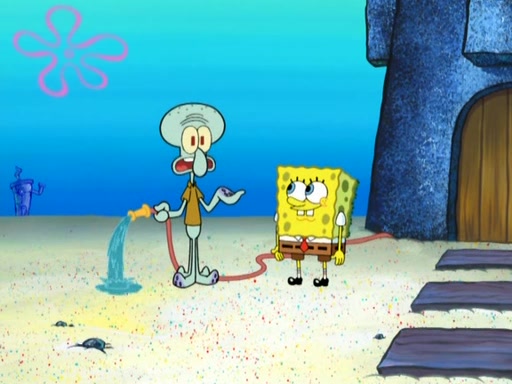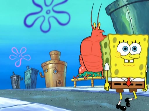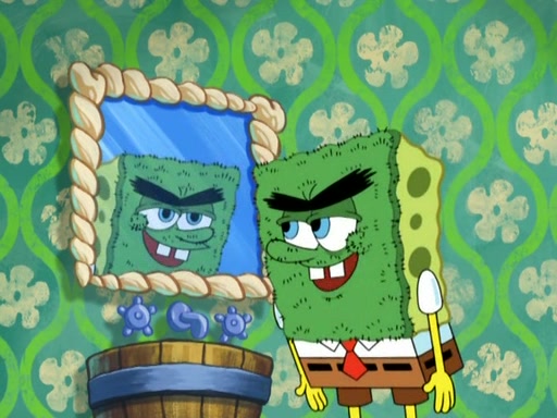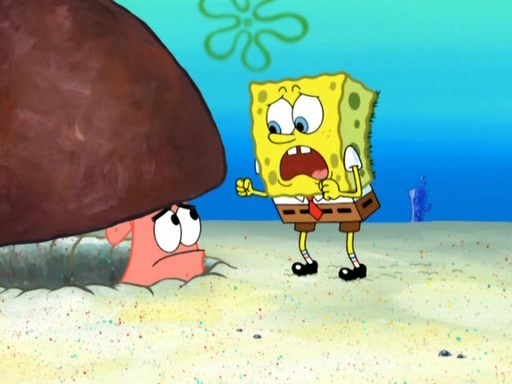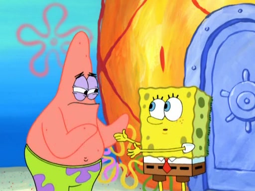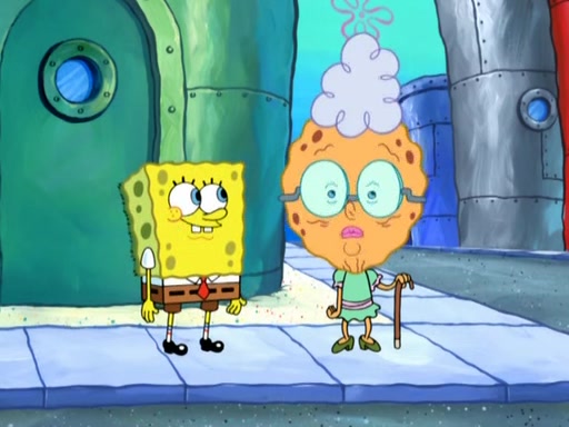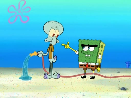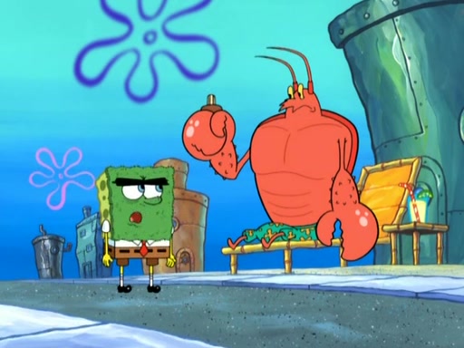He goes out and Pilar asks him to carry his groceries for him. His body switches 180 degrees, showing the abrasive side, and says "Carry it yourself, fish-face" for SpongeBob. He does the same for Larry who asked him to help him put sun lotion on, Grandma who asked for help crossing the street, and Sandy who asked him to help her with a science invention. All of them getting harsh words thrown at them from SpongeBob's abrasive side leave, either baffled, hurt, or in Sandy's case, baffled, hurt, and physically damaged.