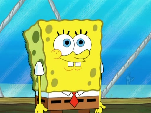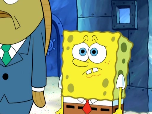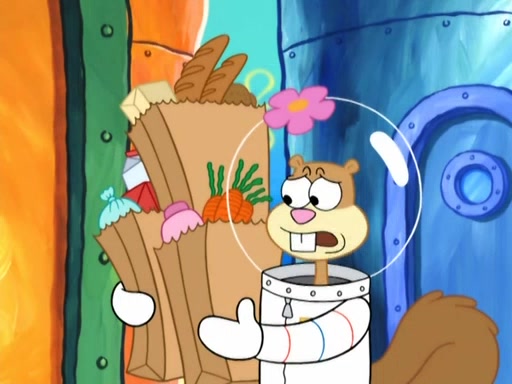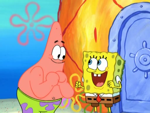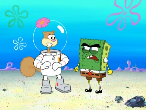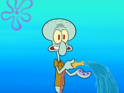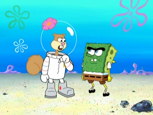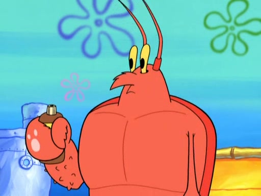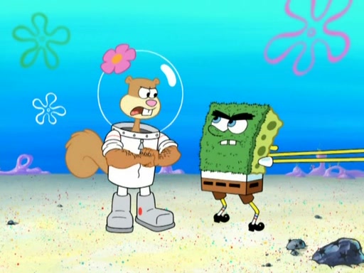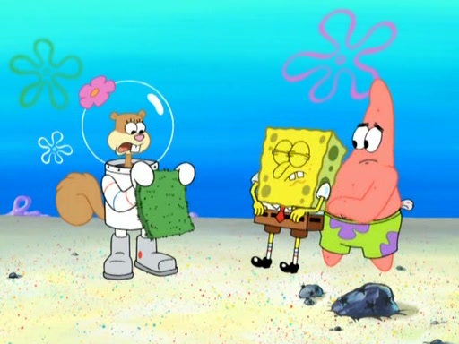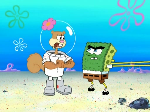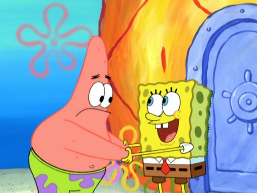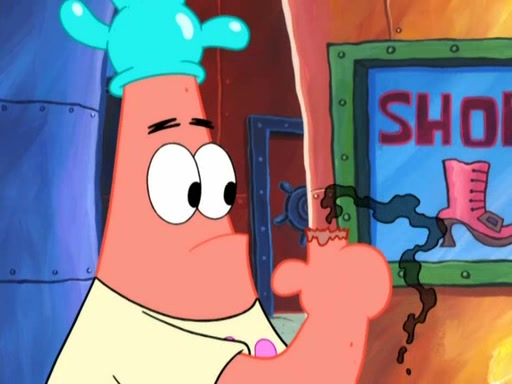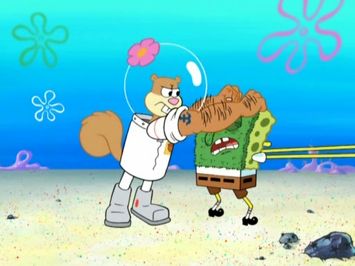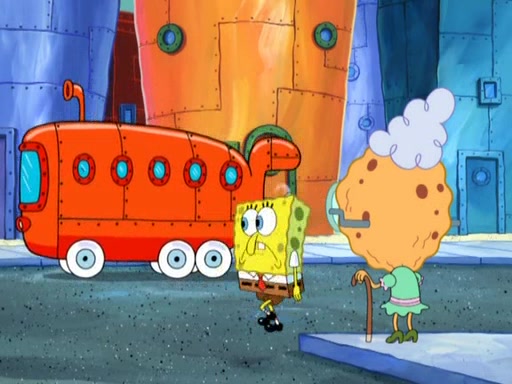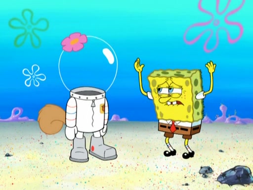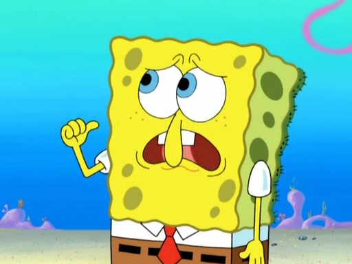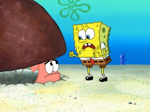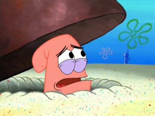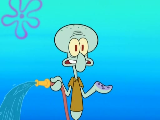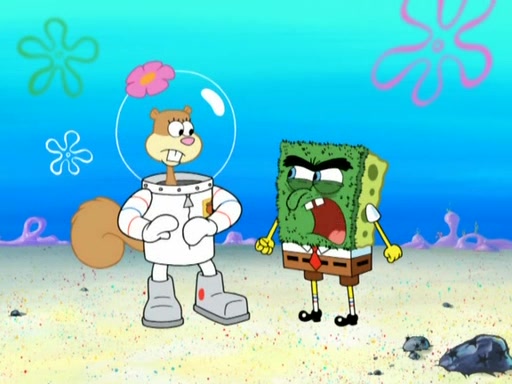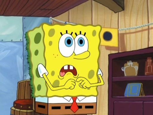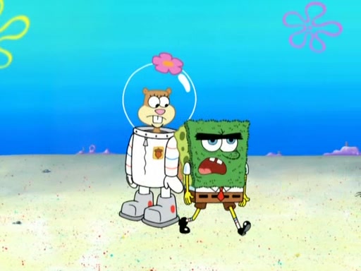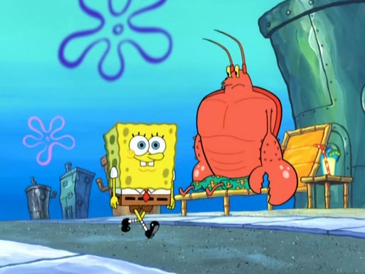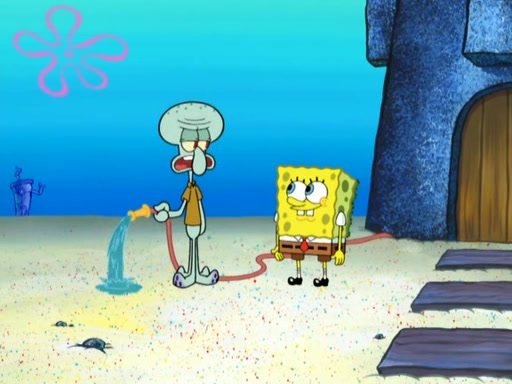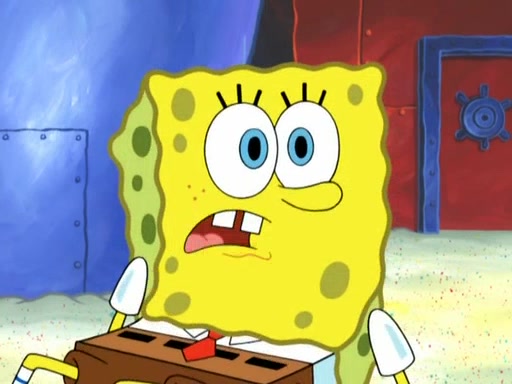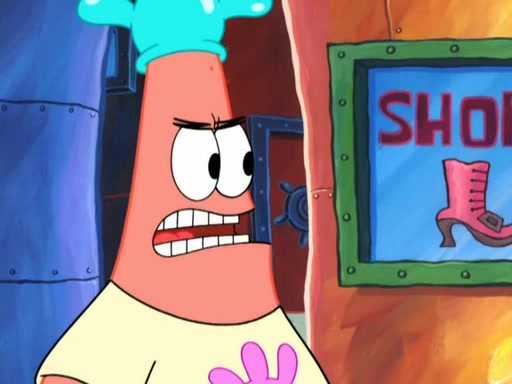 He goes out and Pilar asks him to carry his groceries for him. His body switches 180 degrees, showing the abrasive side, and says "Carry it yourself, fish-face" for SpongeBob. He does the same for Larry who asked him to help him put sun lotion on, Grandma who asked for help crossing the street, and Sandy who asked him to help her with a science invention. All of them getting harsh words thrown at them from SpongeBob's abrasive side leave, either baffled, hurt, or in Sandy's case, baffled, hurt, and physically damaged.