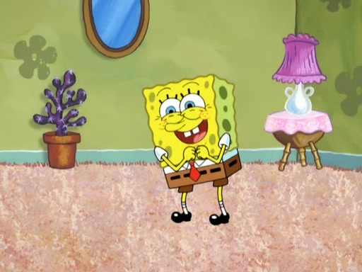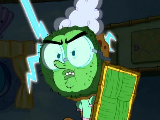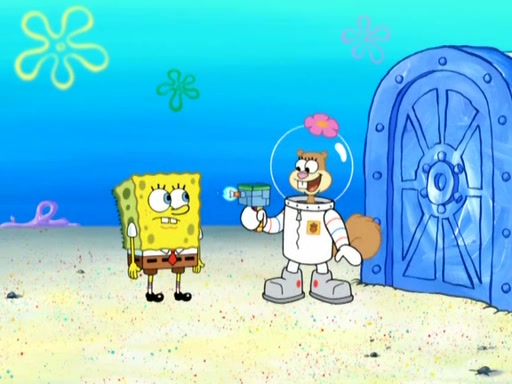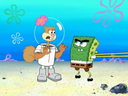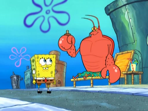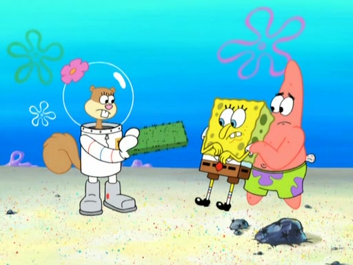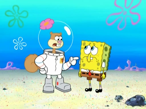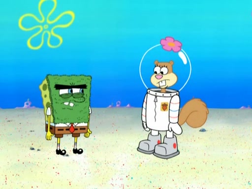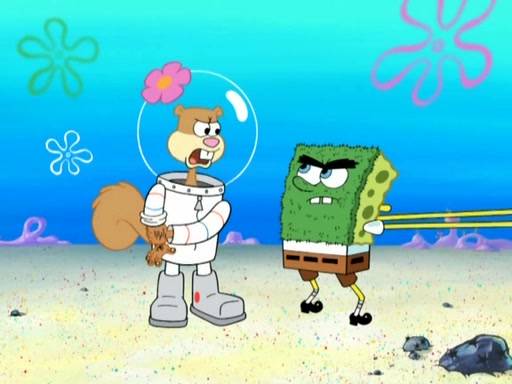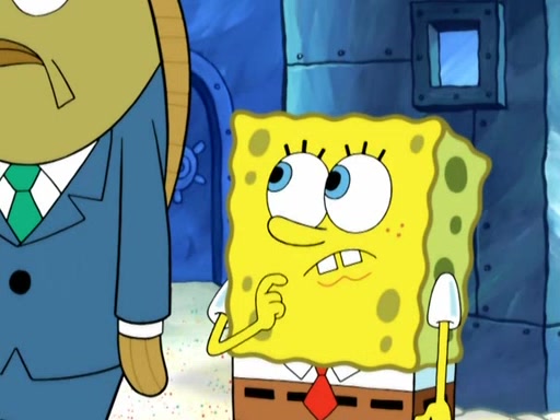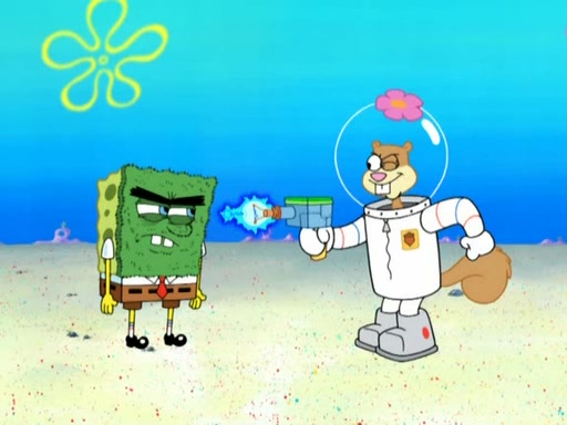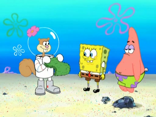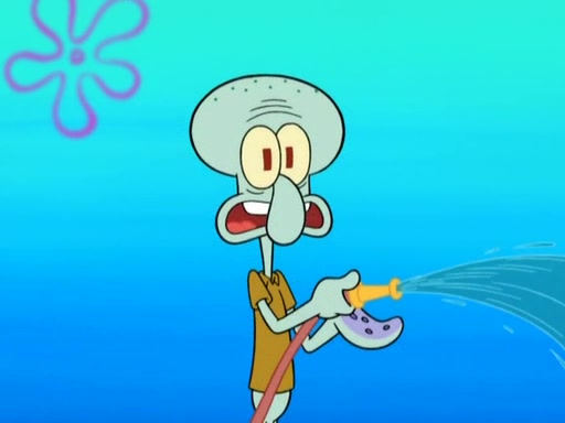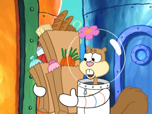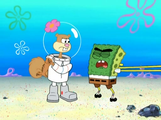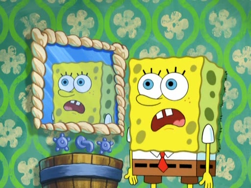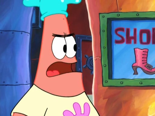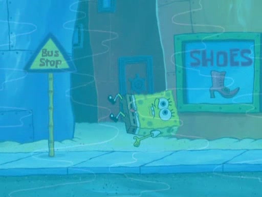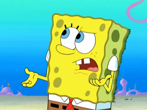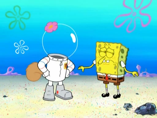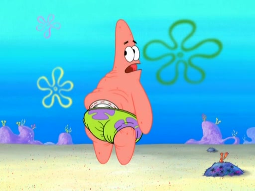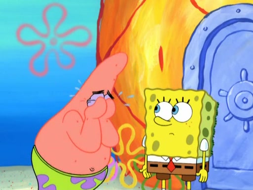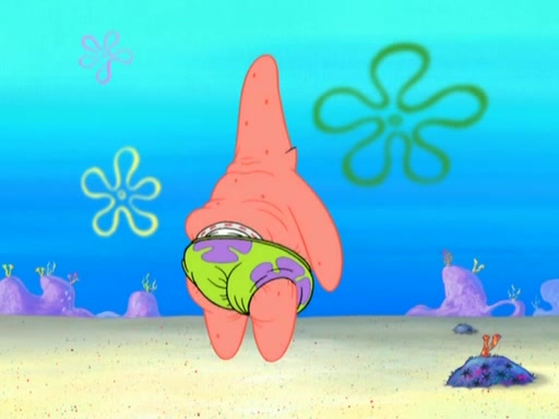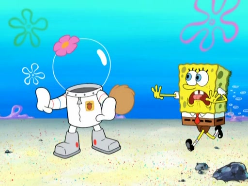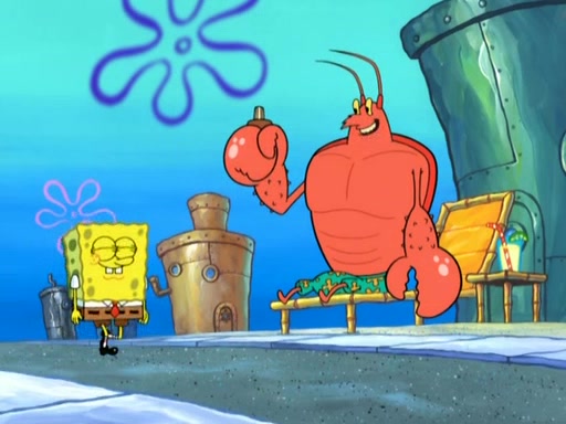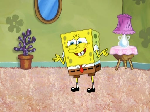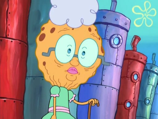 He goes out and Pilar asks him to carry his groceries for him. His body switches 180 degrees, showing the abrasive side, and says "Carry it yourself, fish-face" for SpongeBob. He does the same for Larry who asked him to help him put sun lotion on, Grandma who asked for help crossing the street, and Sandy who asked him to help her with a science invention. All of them getting harsh words thrown at them from SpongeBob's abrasive side leave, either baffled, hurt, or in Sandy's case, baffled, hurt, and physically damaged.