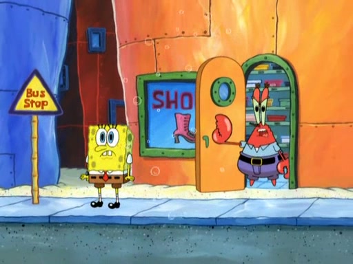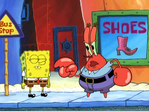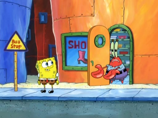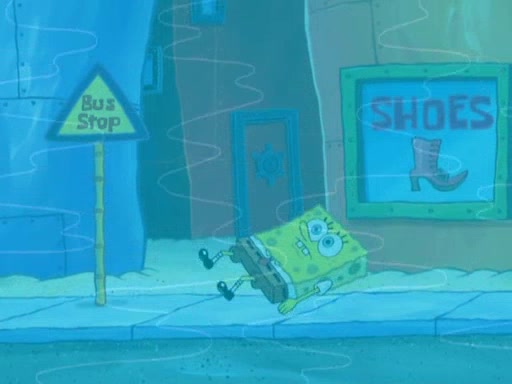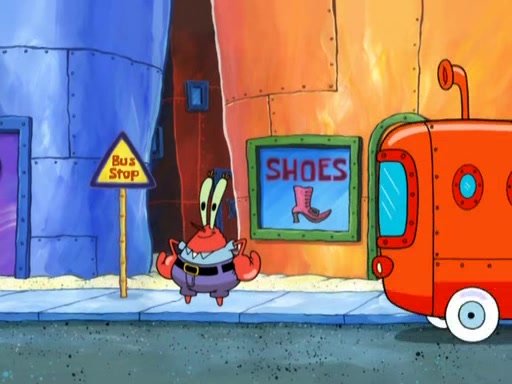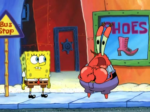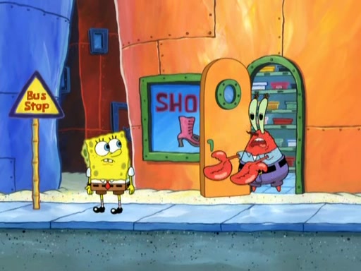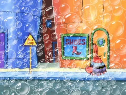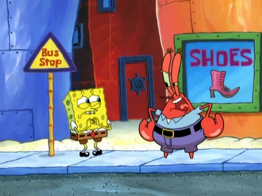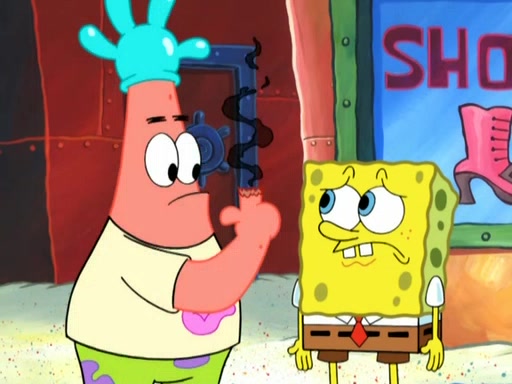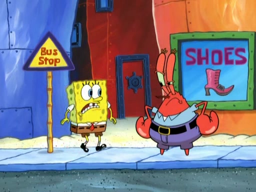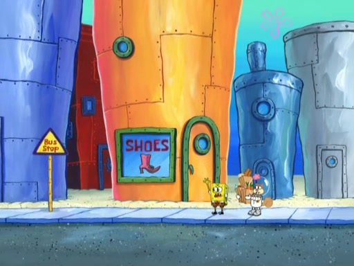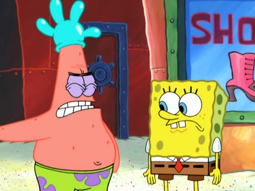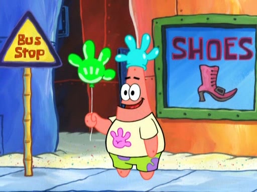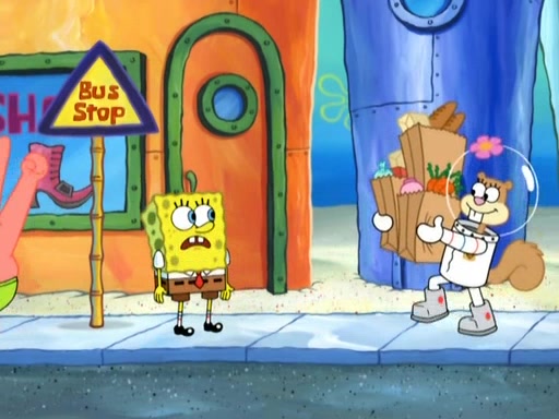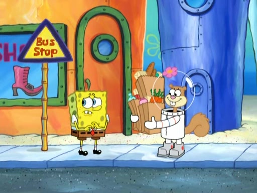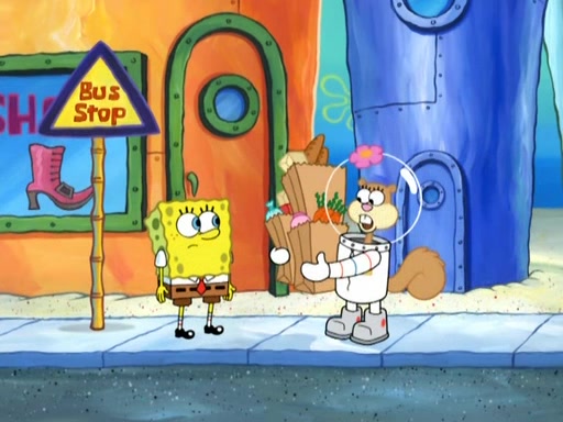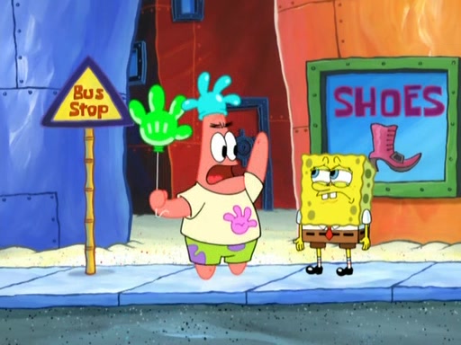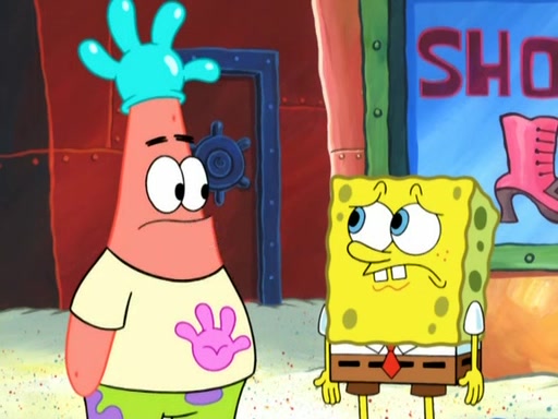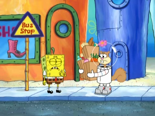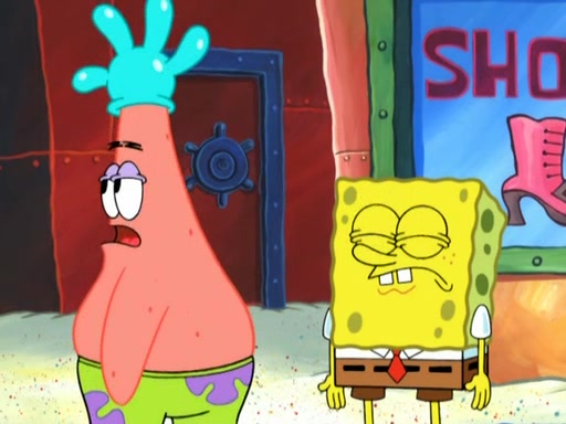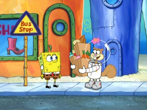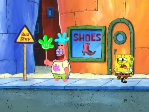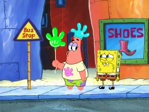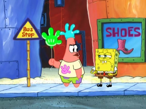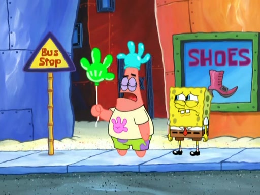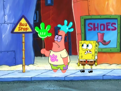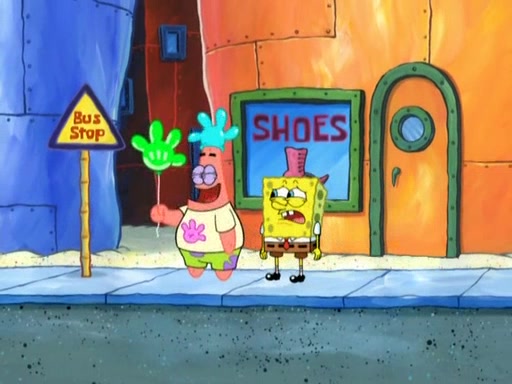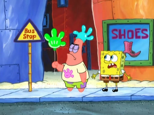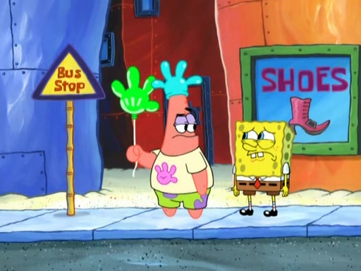 They almost get in the bus, but then Sandy comes and asks SpongeBob for him to do "Operation: Acorn Smoothie." SpongeBob says no but after a guilt trip from Sandy, he unhappily agrees. He tells Patrick he'll be on the next bus, so Patrick goes to Glove World without SpongeBob. After the situation with Sandy, he goes back to the bus stop, then Mr. Krabs asks SpongeBob to say no to Pearl about the new shoes that she desperately wants.