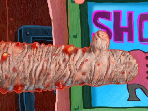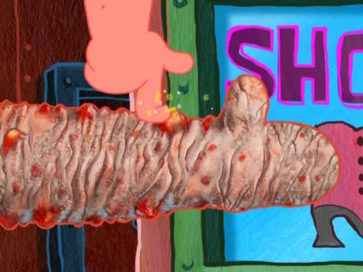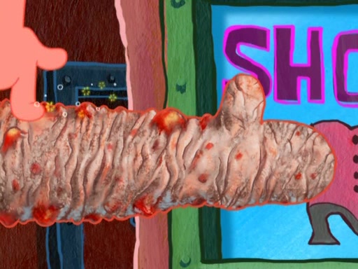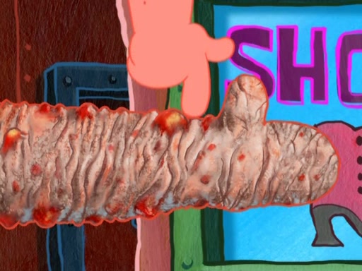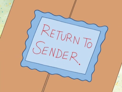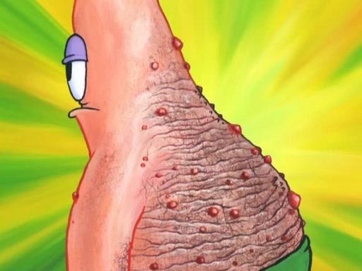 Sandy then rips it off his back, while SpongeBob holds Patrick, then it is shown with intense pain for a short while as Sandy rips the abrasive side off. Sandy puts it in a box labelled "Return to sender" and puts it in the mailbox. The green skin growls. SpongeBob then remembers he needs to apologize to Grandma for what happened earlier. He goes, then it turns out that Grandma has the abrasive side now too, much to SpongeBob's horror. The episode ends with SpongeBob screaming "NOOOOOOOOOO!!!!!!!!"