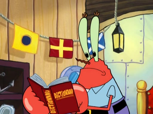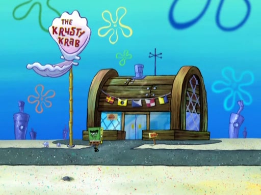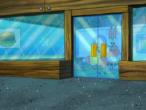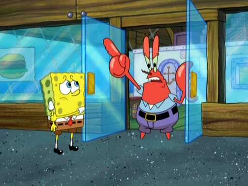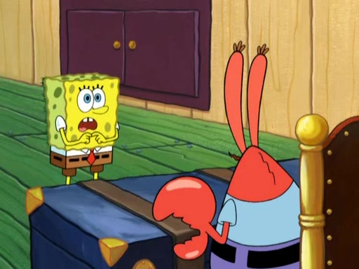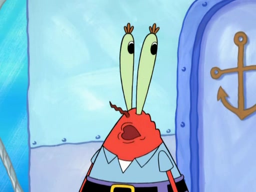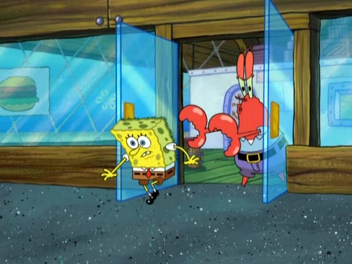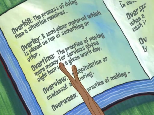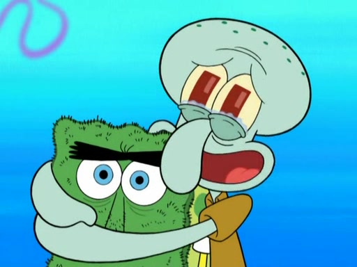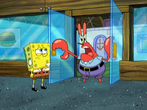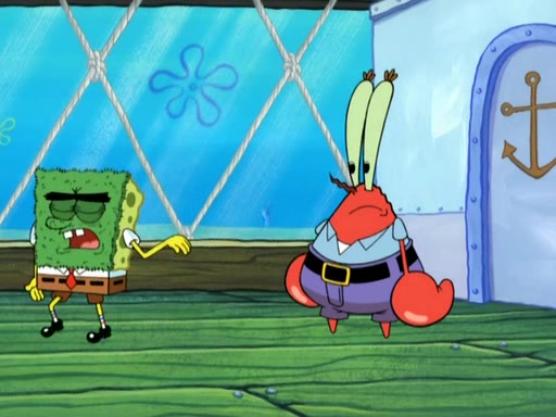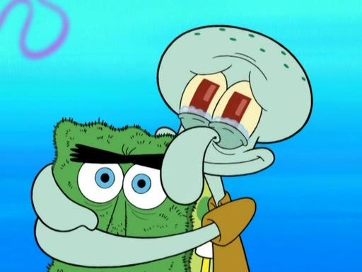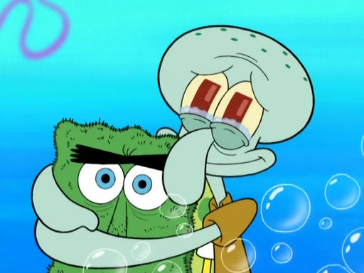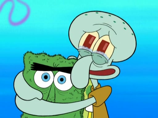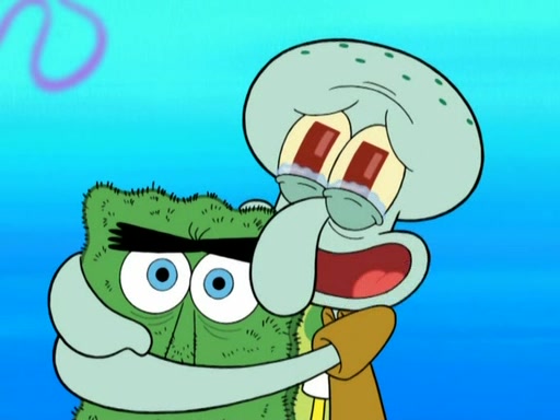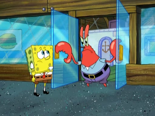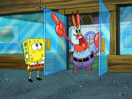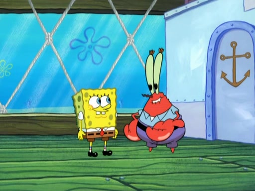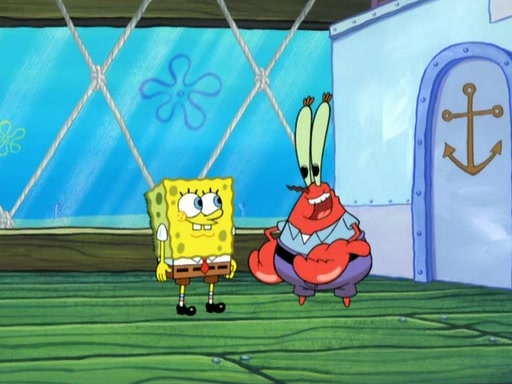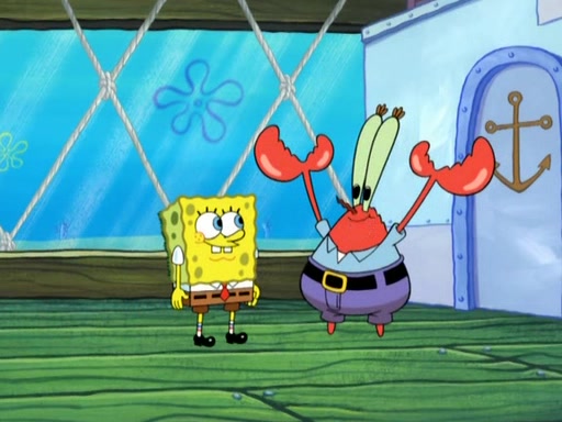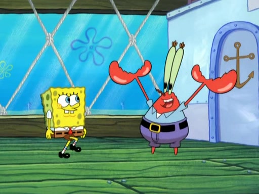 He then goes into the Krusty Krab, where Mr. Krabs asks him to do a seventeen hour extra shift. SpongeBob says yes, but then his abrasive side says no, unless Mr. Krabs pays for overtime, Mr. Krabs is confused for he never heard this word before, so he goes into his office and looks it up on a dictionary, he finds out it means "being paid more than the standard wage for coming in over his contracted hours.' He is shocked that SpongeBob could use such a "disgusting" word. He goes home and Squidward sarcastically says "Oh goody! I suppose you're going to ask me to play some stupid game or follow me around all day!" SpongeBob's abrasive side says the complete opposite that SpongeBob would normally say which is "Afraid not big nose, I wouldn't hang out with you for all the money in Krab's mattress!" then Squidward gets happy and hugs him, saying: "You don't know how long I have waited to hear those words." Patrick says it's time for their play-date.