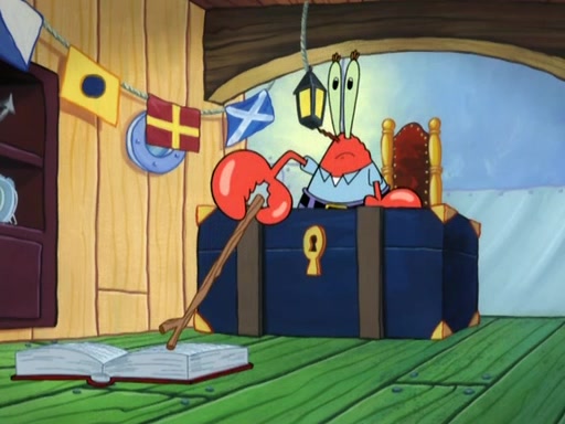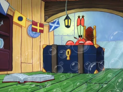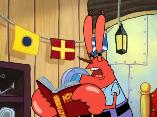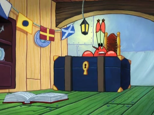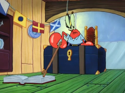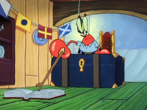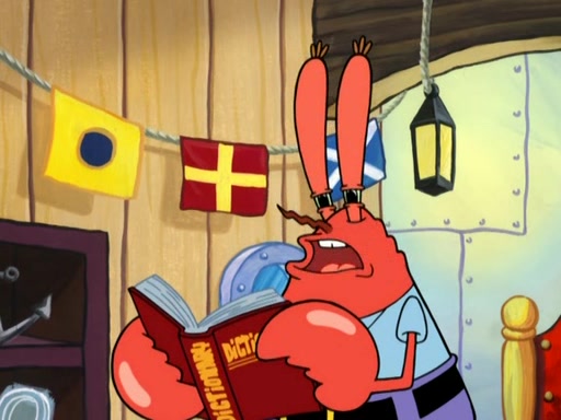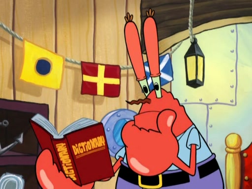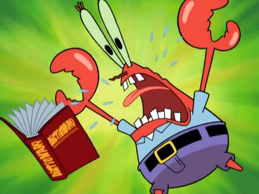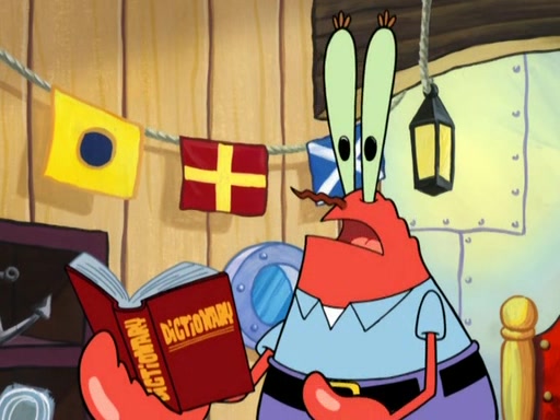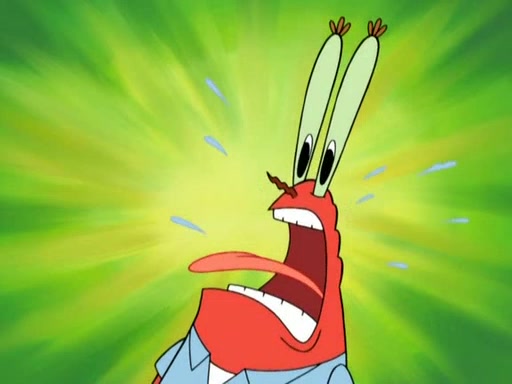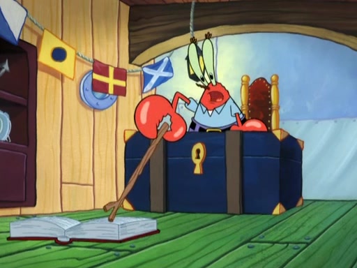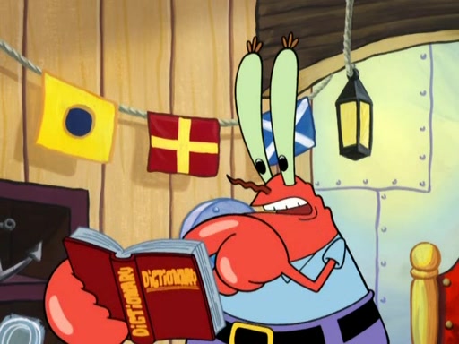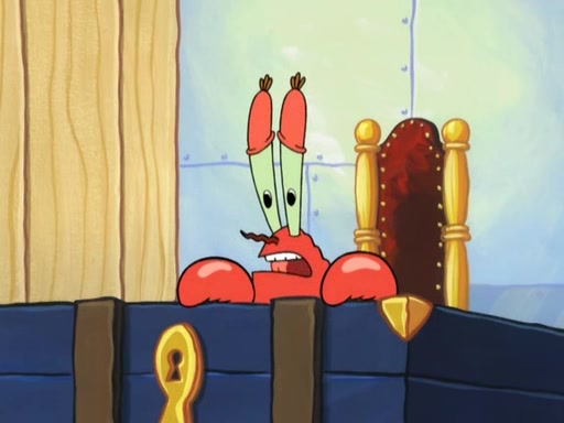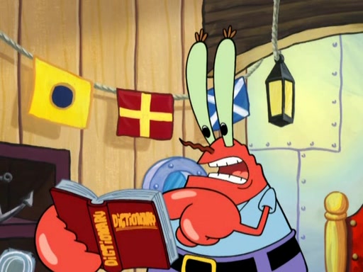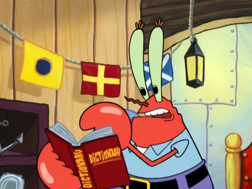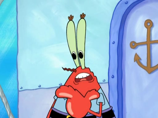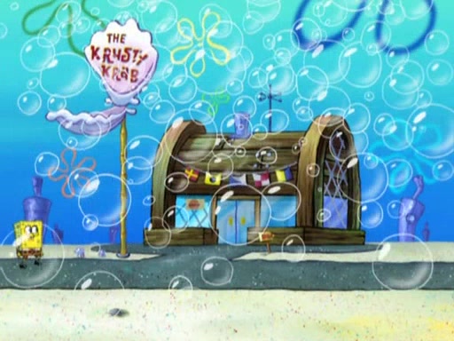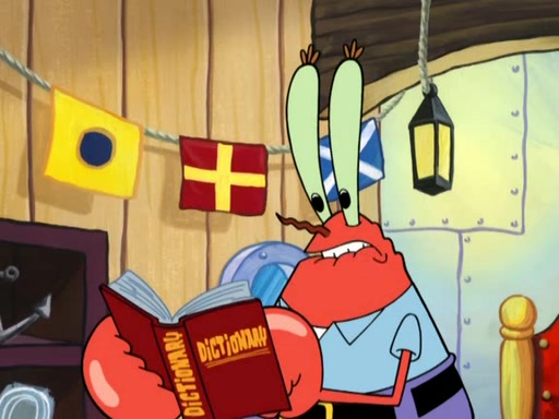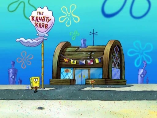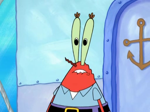 He then goes into the Krusty Krab, where Mr. Krabs asks him to do a seventeen hour extra shift. SpongeBob says yes, but then his abrasive side says no, unless Mr. Krabs pays for overtime, Mr. Krabs is confused for he never heard this word before, so he goes into his office and looks it up on a dictionary, he finds out it means "being paid more than the standard wage for coming in over his contracted hours.' He is shocked that SpongeBob could use such a "disgusting" word. He goes home and Squidward sarcastically says "Oh goody! I suppose you're going to ask me to play some stupid game or follow me around all day!" SpongeBob's abrasive side says the complete opposite that SpongeBob would normally say which is "Afraid not big nose, I wouldn't hang out with you for all the money in Krab's mattress!" then Squidward gets happy and hugs him, saying: "You don't know how long I have waited to hear those words." Patrick says it's time for their play-date.