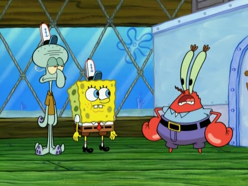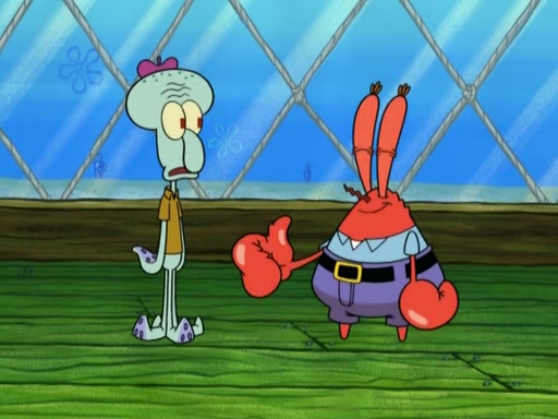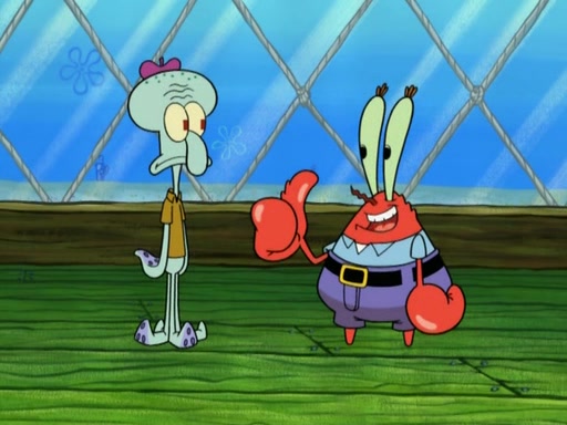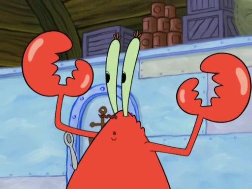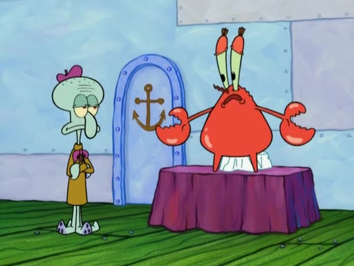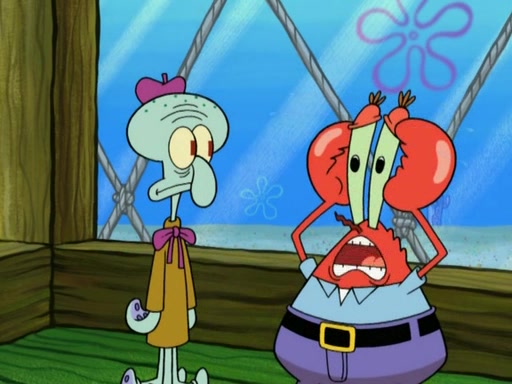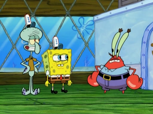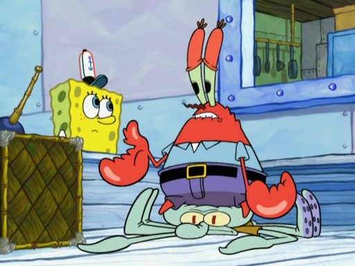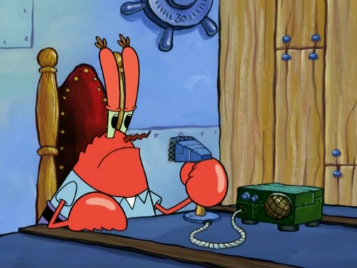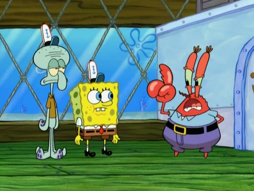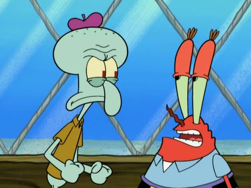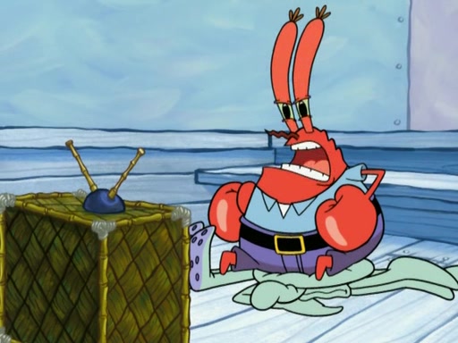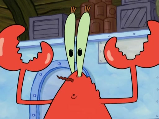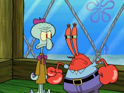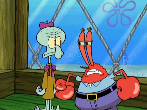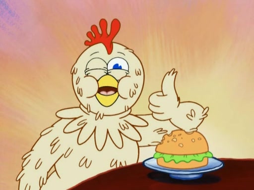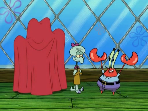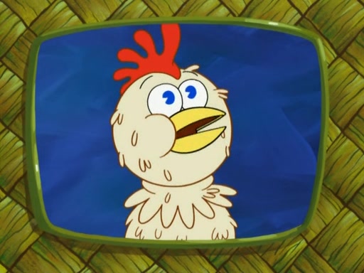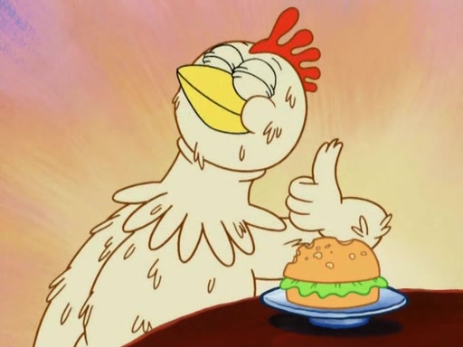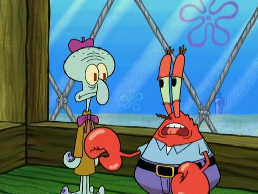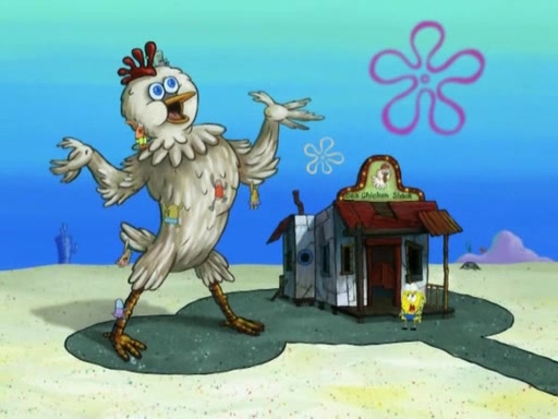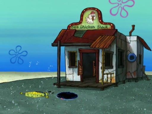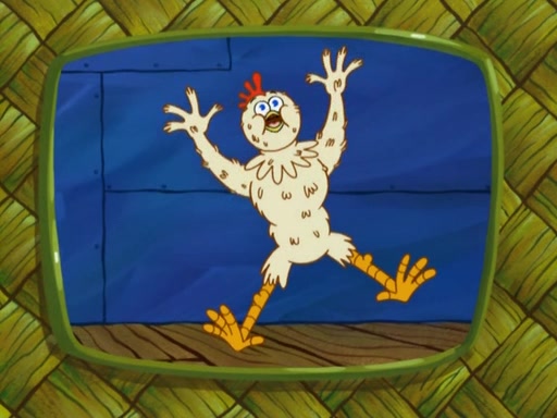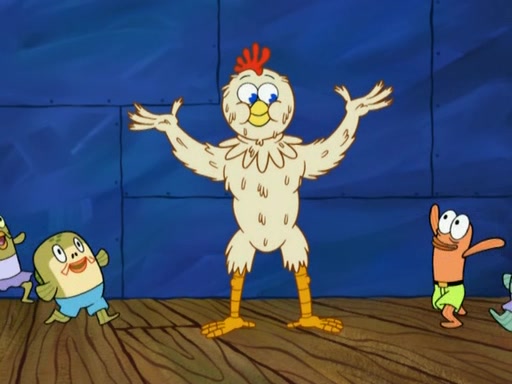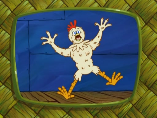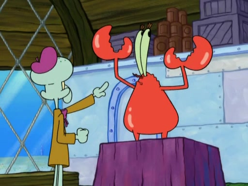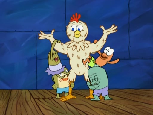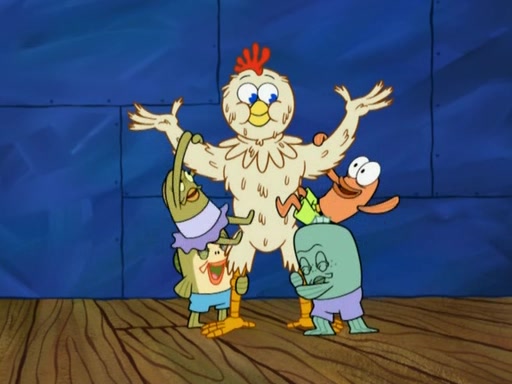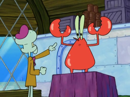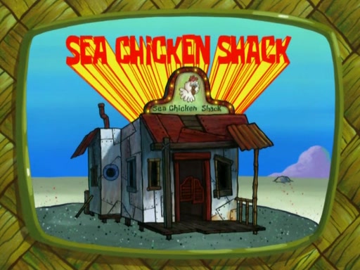 Mr. Krabs is about to open the Krusty Krab, but nobody shows up. A commercial reveals everyone is at the Sea Chicken Shack, and he sends SpongeBob to find out what is making them more popular than them. He arrives at the place in a disguise. He tells Mr. Krabs that the store is a dump and it smells bad. He gets thrown out when he violates their No headbands rule. The large, outdoor Mr. Seachicken statue is why everyone is going there instead of the Krusty Krab. So, Mr. Krabs asks Squidward to make a statue of him. Mr. Krabs makes some various poses and Squidward keeps saying no until Mr. Krabs holds his arms in the air, and Squidward finds the perfect pose.