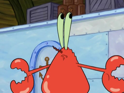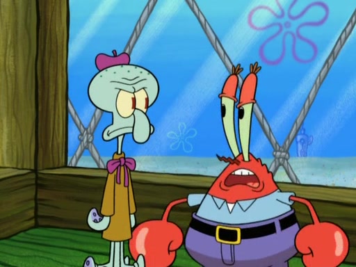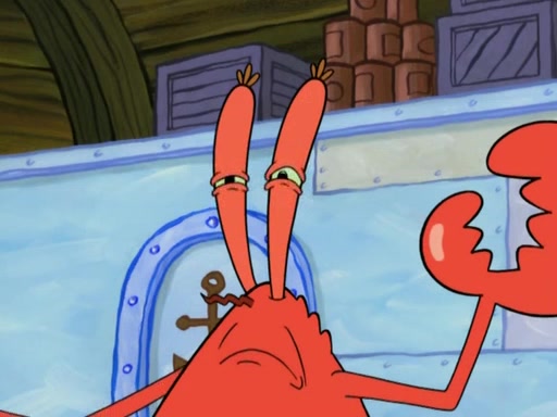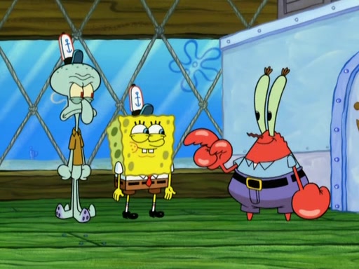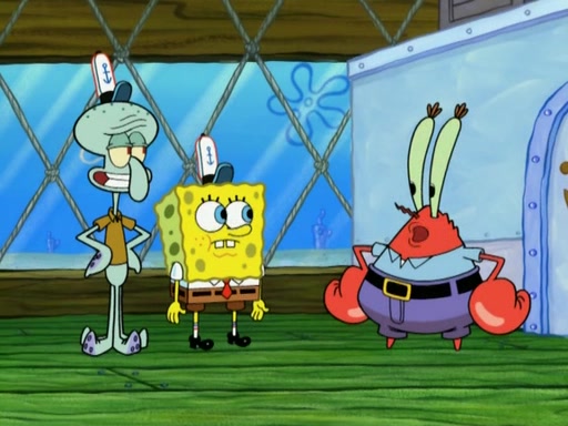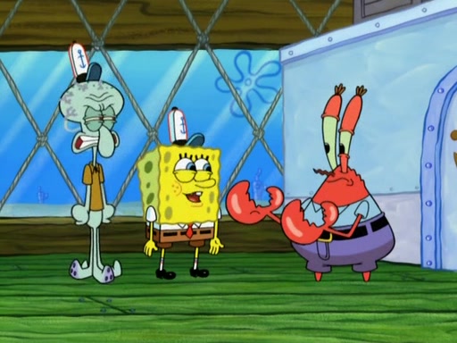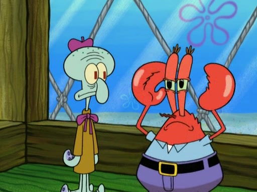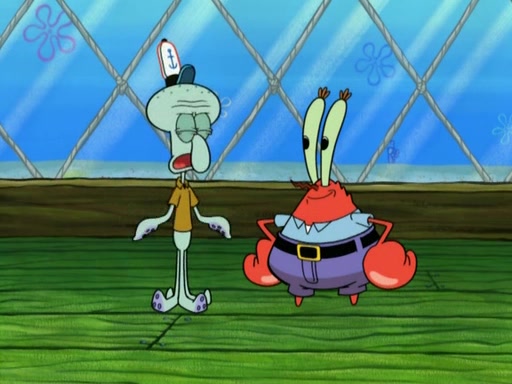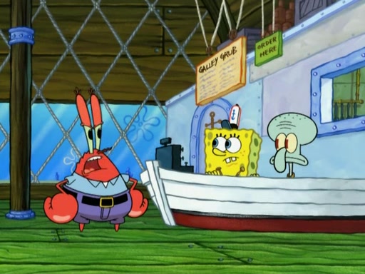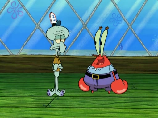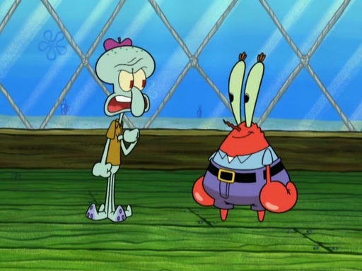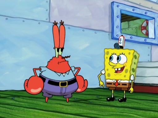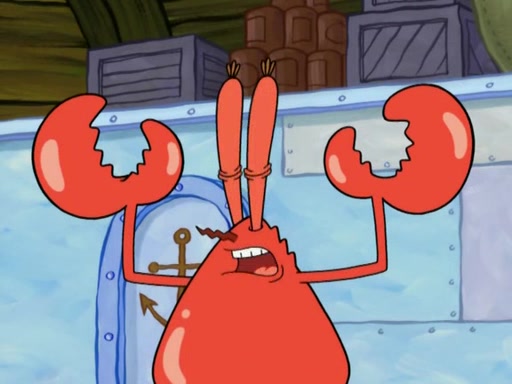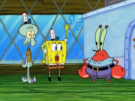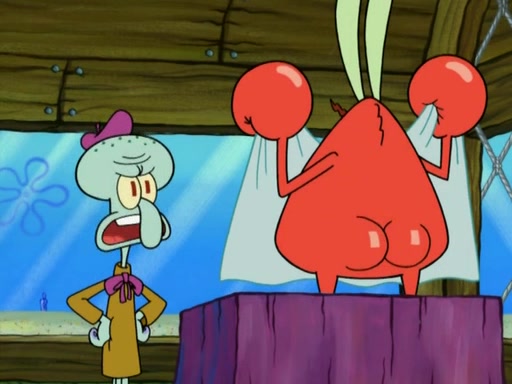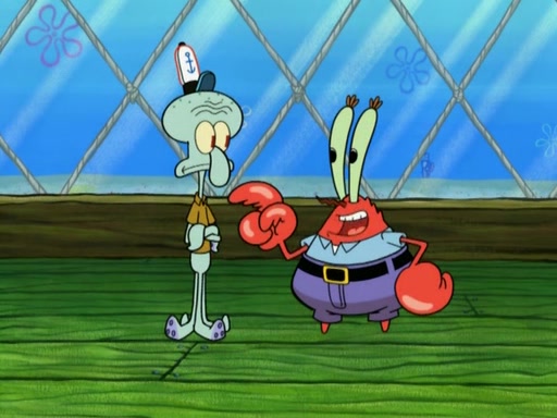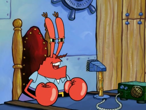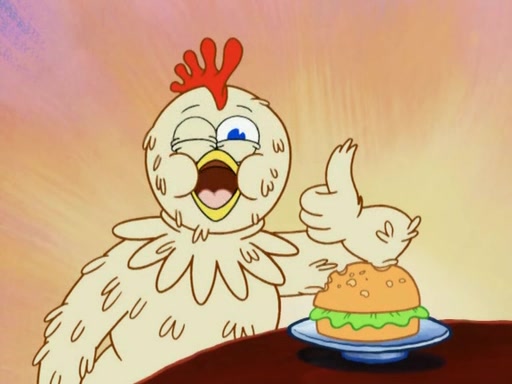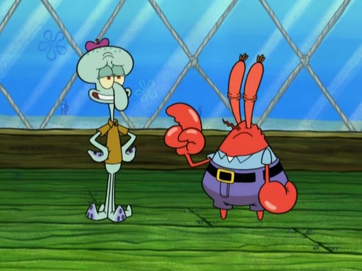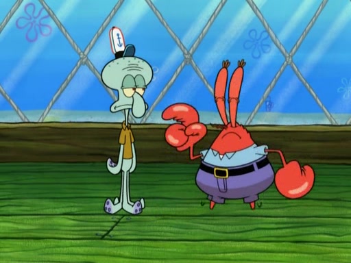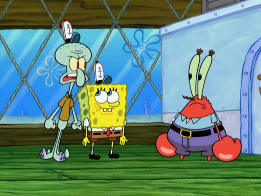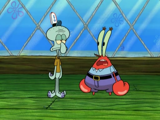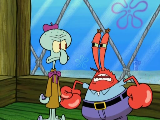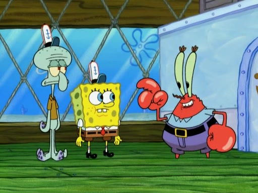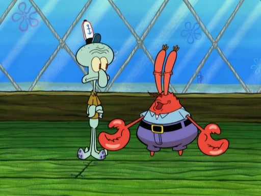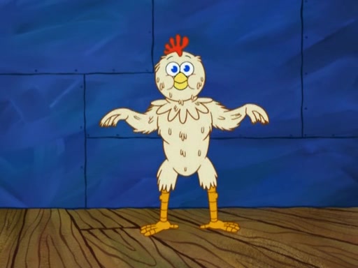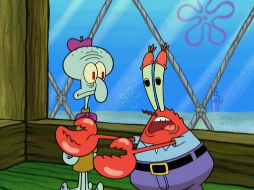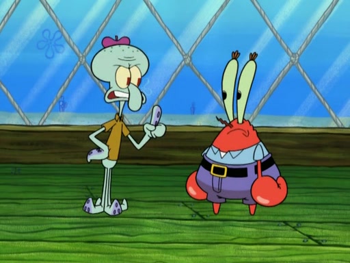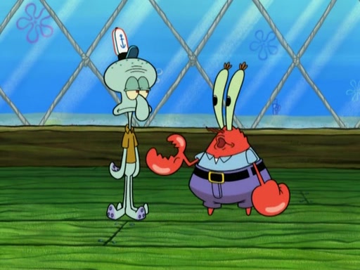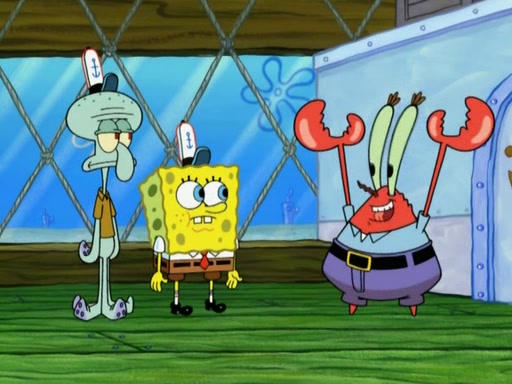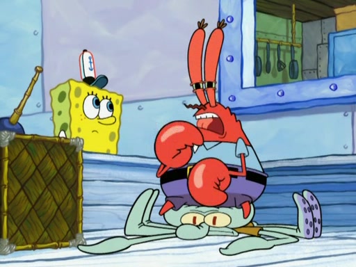 Mr. Krabs is about to open the Krusty Krab, but nobody shows up. A commercial reveals everyone is at the Sea Chicken Shack, and he sends SpongeBob to find out what is making them more popular than them. He arrives at the place in a disguise. He tells Mr. Krabs that the store is a dump and it smells bad. He gets thrown out when he violates their No headbands rule. The large, outdoor Mr. Seachicken statue is why everyone is going there instead of the Krusty Krab. So, Mr. Krabs asks Squidward to make a statue of him. Mr. Krabs makes some various poses and Squidward keeps saying no until Mr. Krabs holds his arms in the air, and Squidward finds the perfect pose.