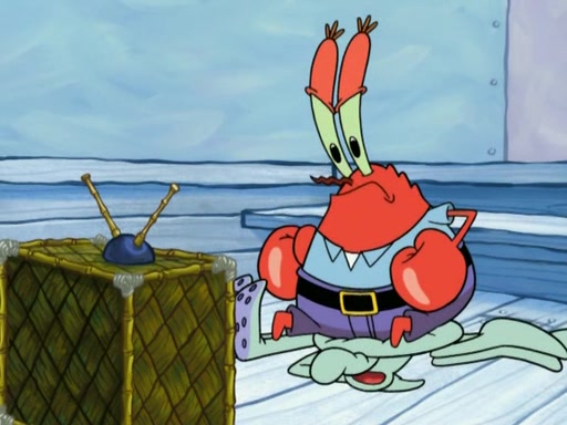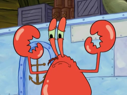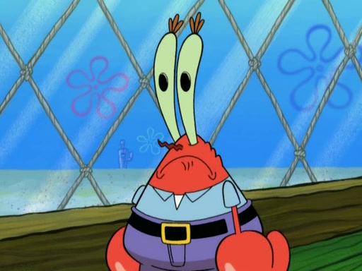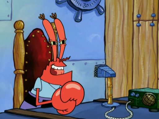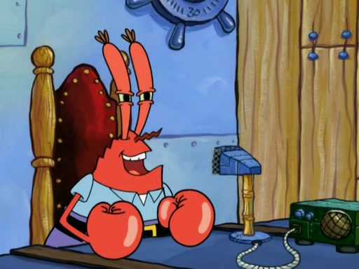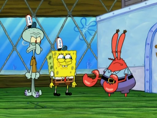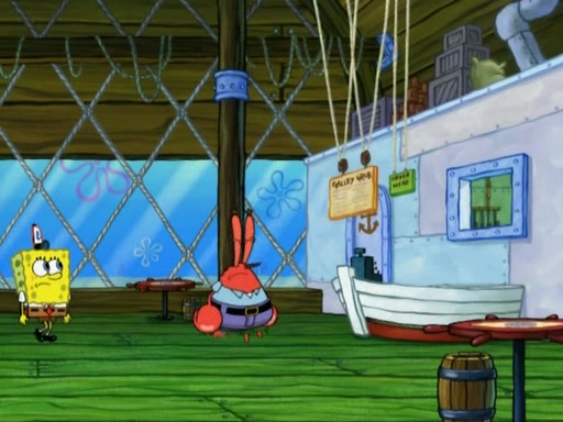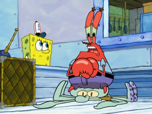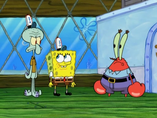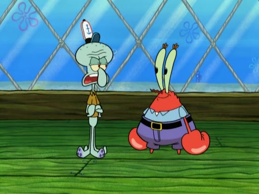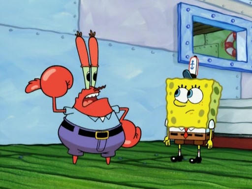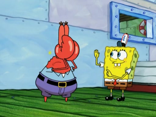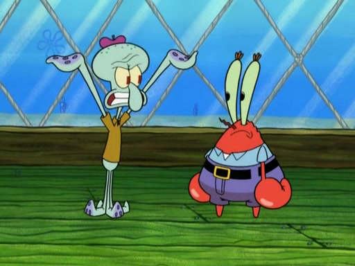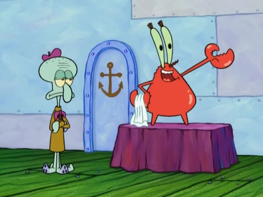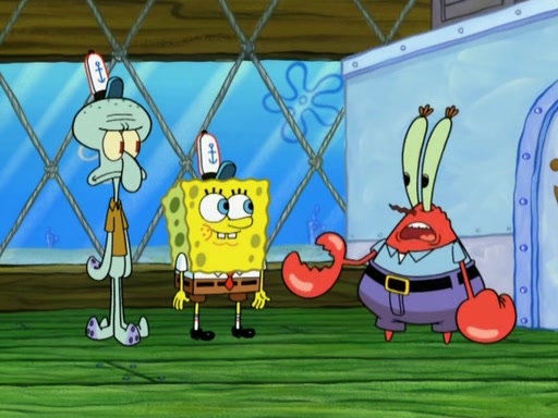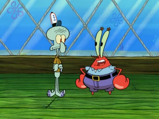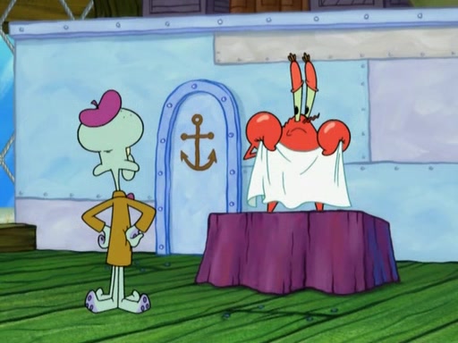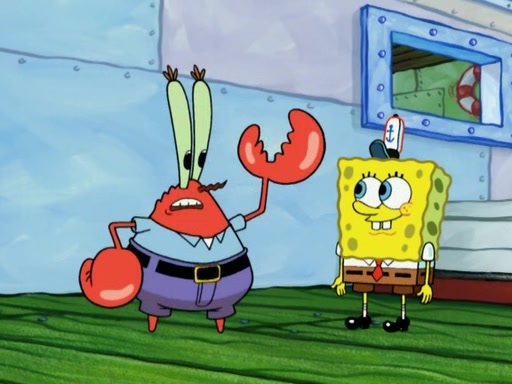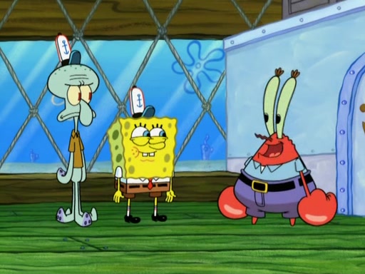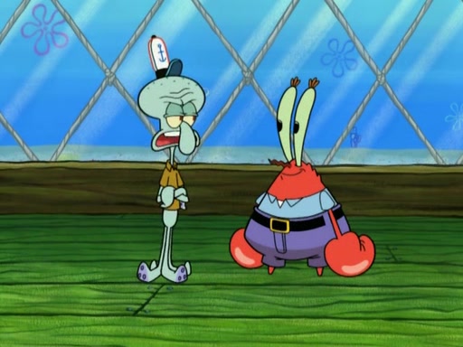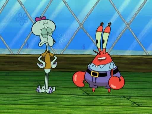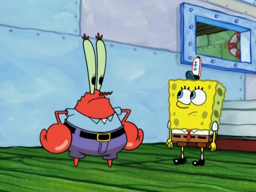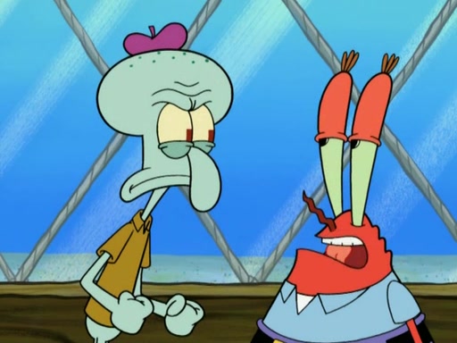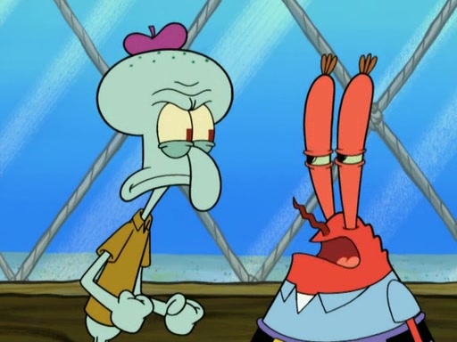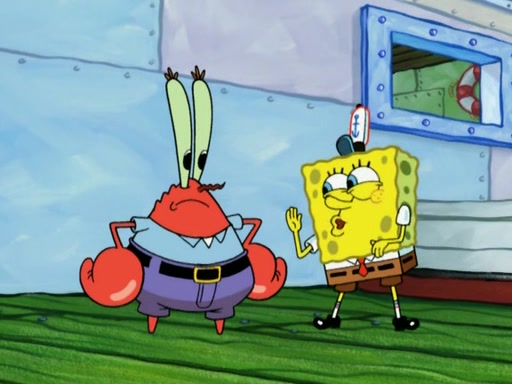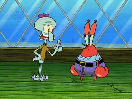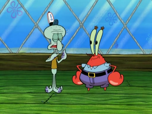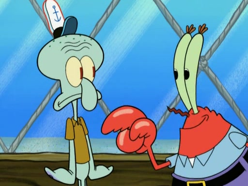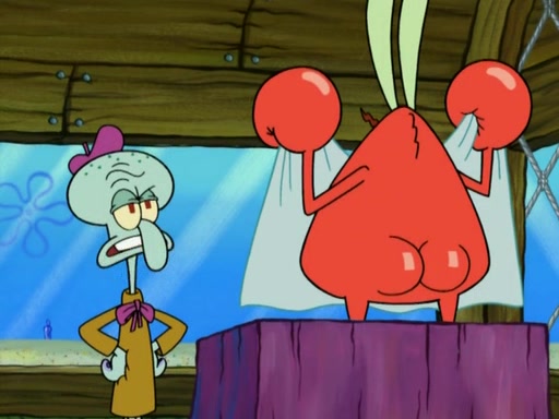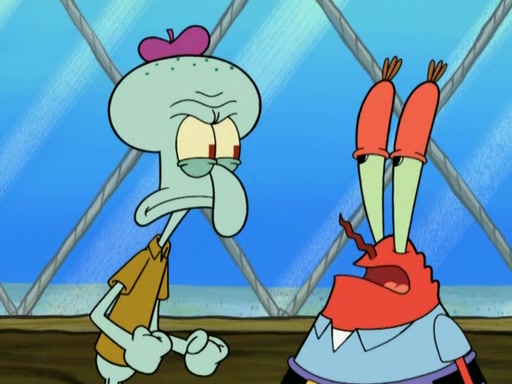 Mr. Krabs is about to open the Krusty Krab, but nobody shows up. A commercial reveals everyone is at the Sea Chicken Shack, and he sends SpongeBob to find out what is making them more popular than them. He arrives at the place in a disguise. He tells Mr. Krabs that the store is a dump and it smells bad. He gets thrown out when he violates their No headbands rule. The large, outdoor Mr. Seachicken statue is why everyone is going there instead of the Krusty Krab. So, Mr. Krabs asks Squidward to make a statue of him. Mr. Krabs makes some various poses and Squidward keeps saying no until Mr. Krabs holds his arms in the air, and Squidward finds the perfect pose.