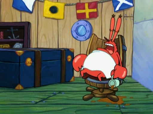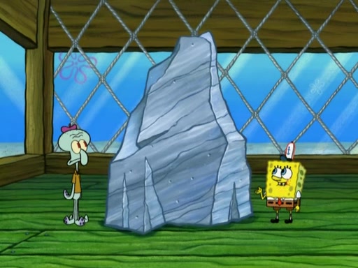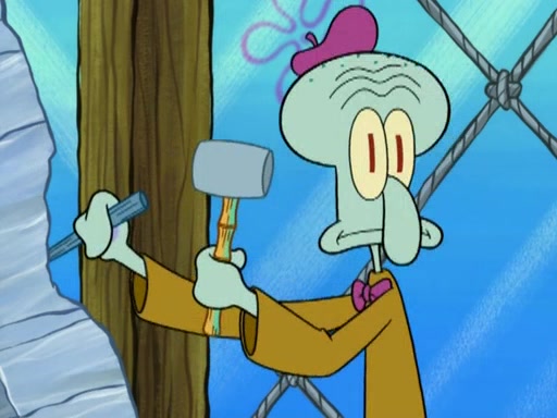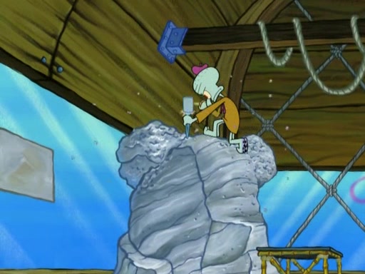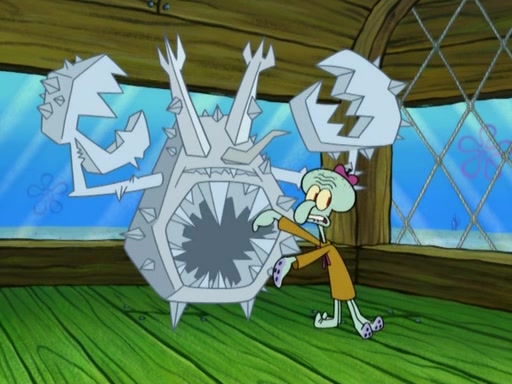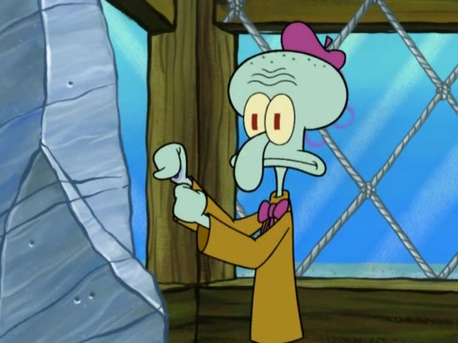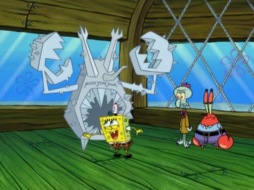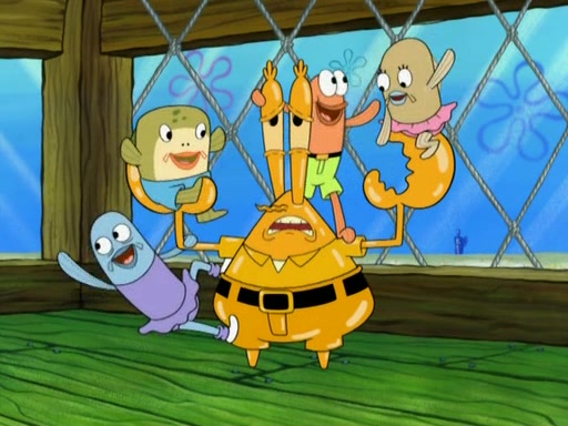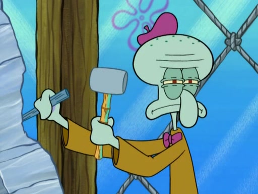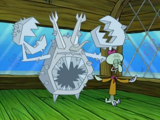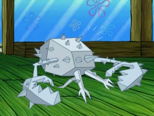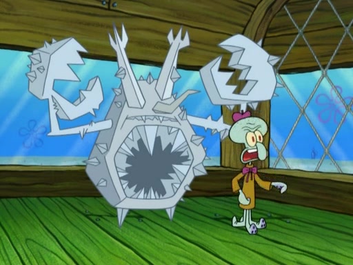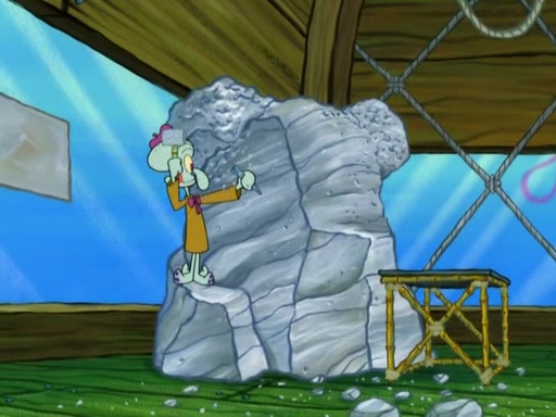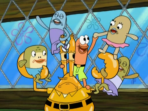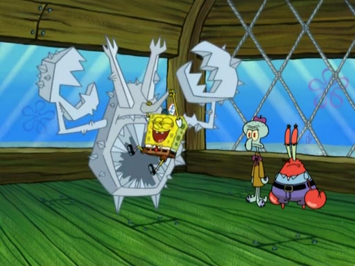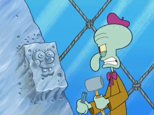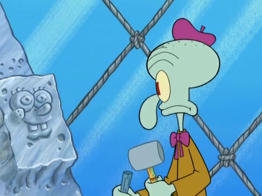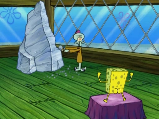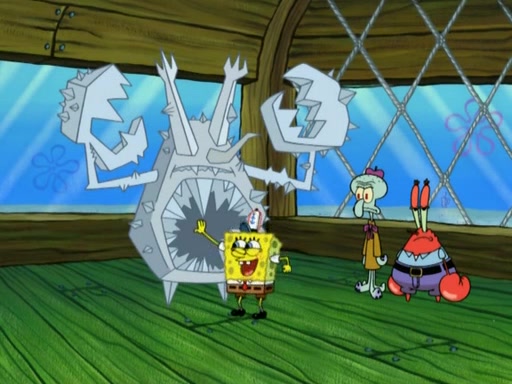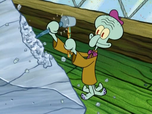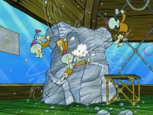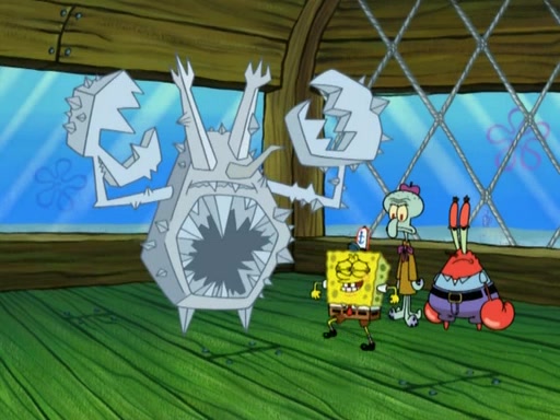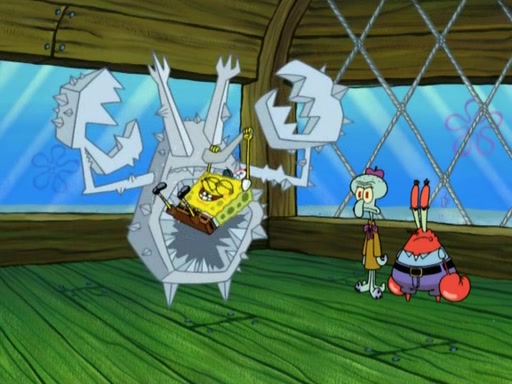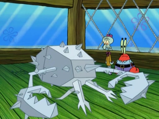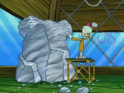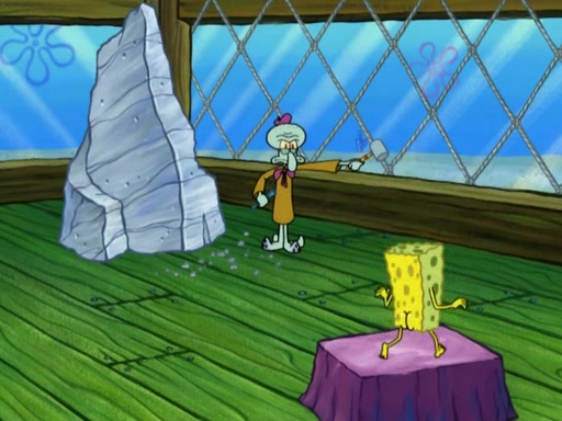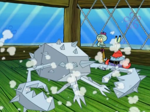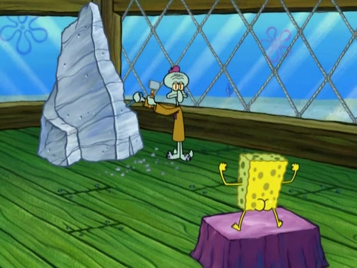 It takes Squidward almost twenty-four hours to finish making the statue. He has Mr. Krabs stand in one position with his hands up in the air for all that time, but Mr. Krabs isn't pleased when the statue is finished. The final result expresses what Squidward may actually feel about Mr. Krabs, because it has spikes and a second mouth near the stomach area. Spongebob plays on it after Mr. Krabs tells him to make sure it's safe, but it falls on him: The statue isn't safe as a playground object, and it may even result in a lawsuit. Spongebob decides to paint Mr. Krabs gold so the children can play on him instead of the statue.