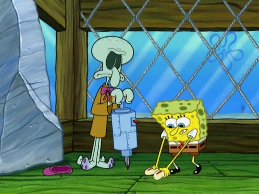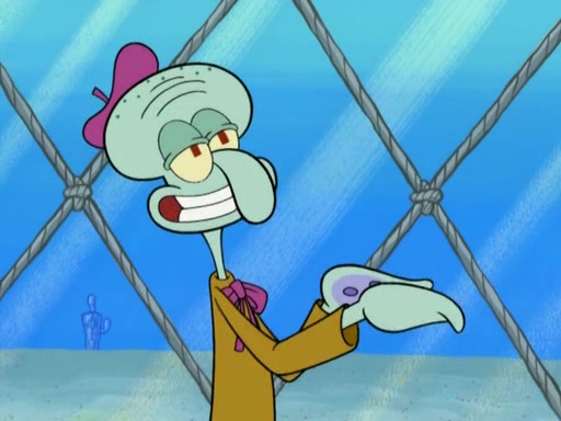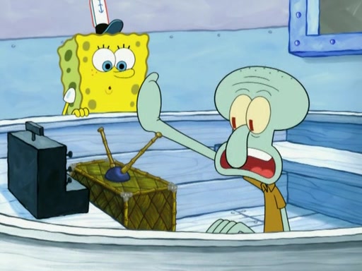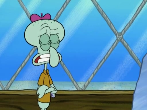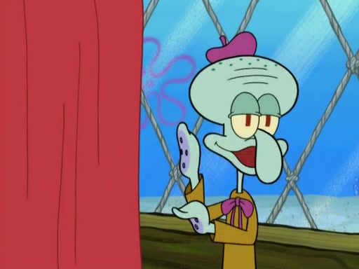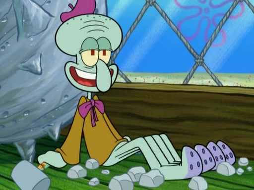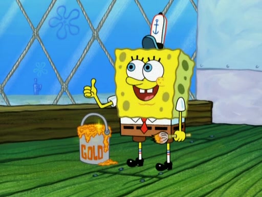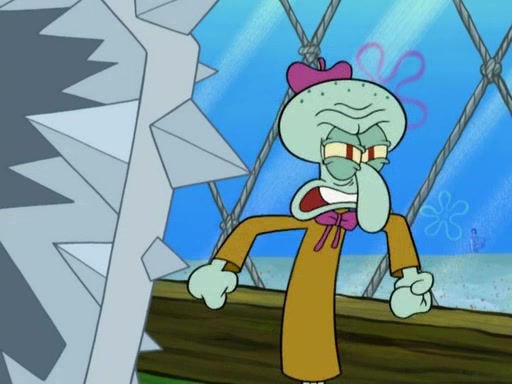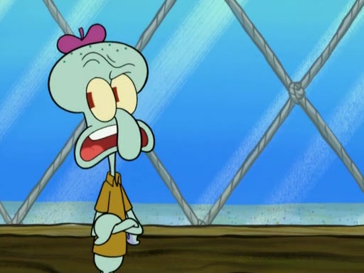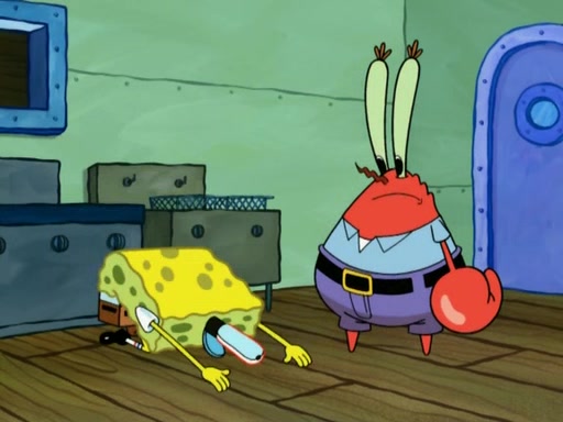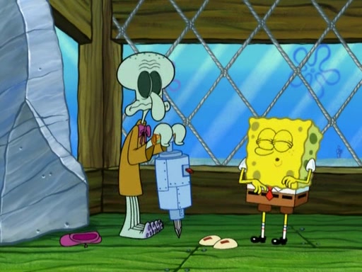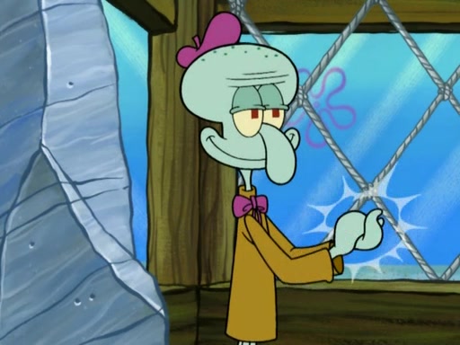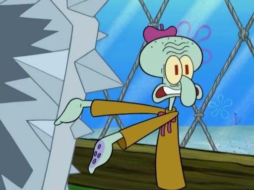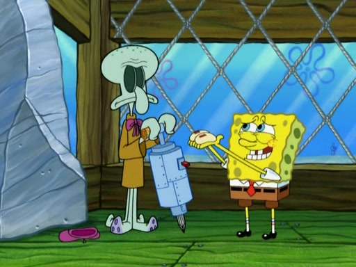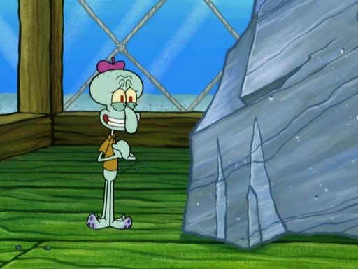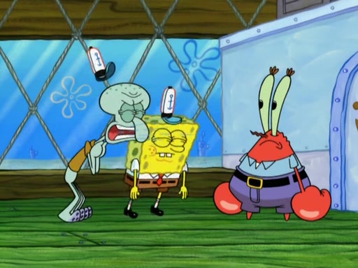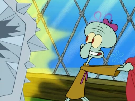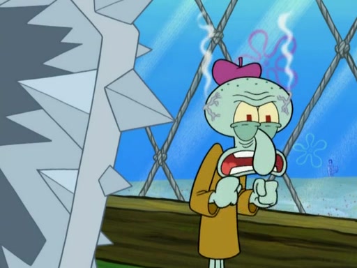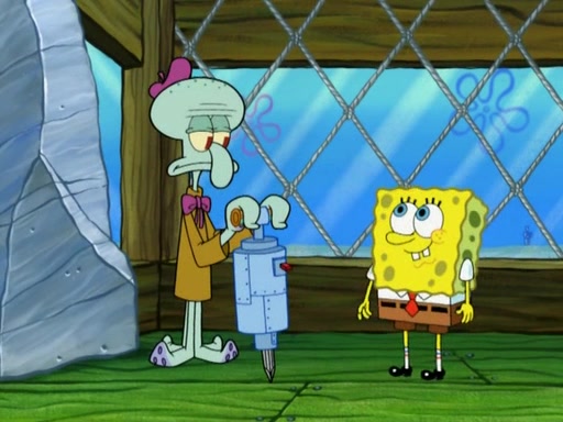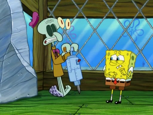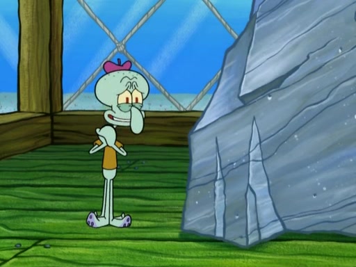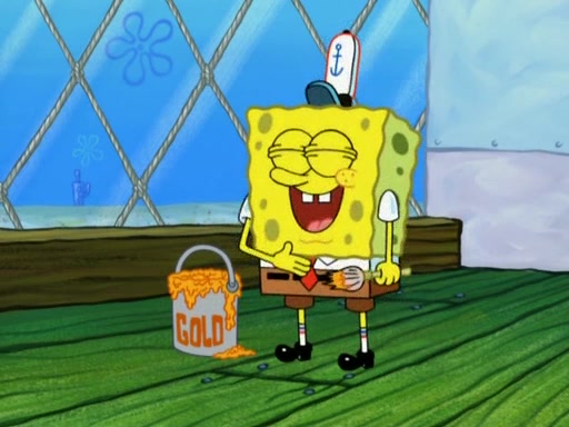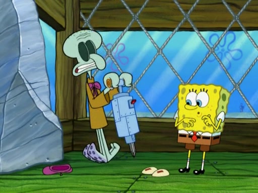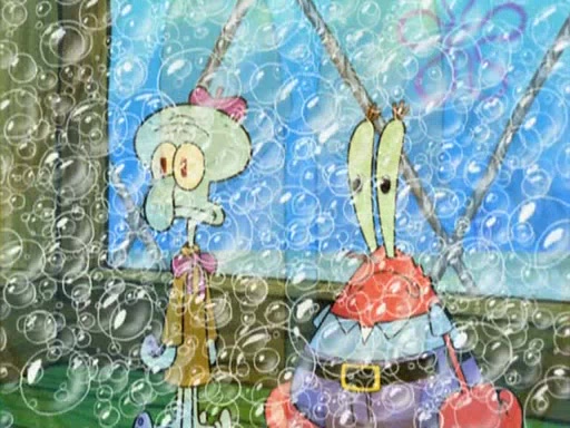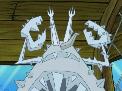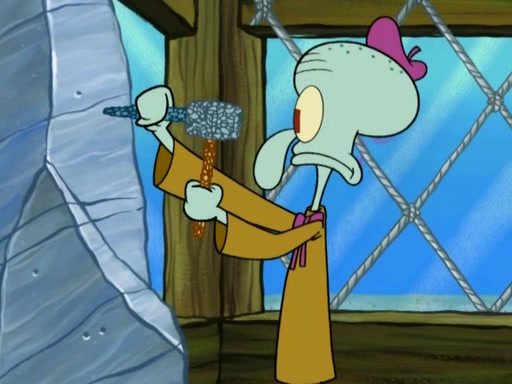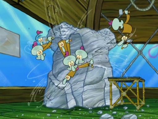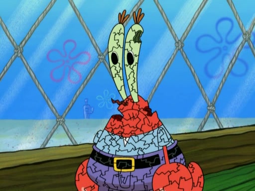 It takes Squidward almost twenty-four hours to finish making the statue. He has Mr. Krabs stand in one position with his hands up in the air for all that time, but Mr. Krabs isn't pleased when the statue is finished. The final result expresses what Squidward may actually feel about Mr. Krabs, because it has spikes and a second mouth near the stomach area. Spongebob plays on it after Mr. Krabs tells him to make sure it's safe, but it falls on him: The statue isn't safe as a playground object, and it may even result in a lawsuit. Spongebob decides to paint Mr. Krabs gold so the children can play on him instead of the statue.