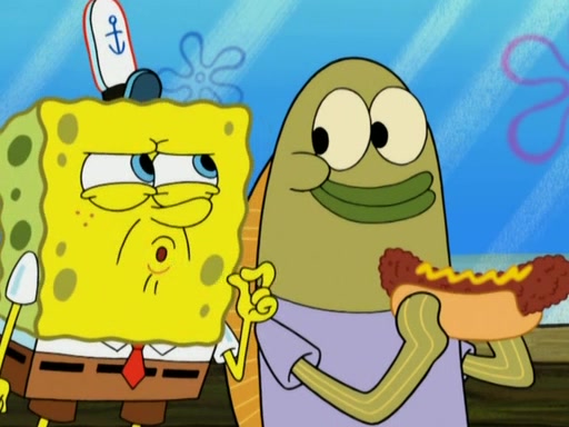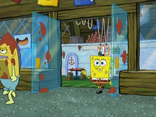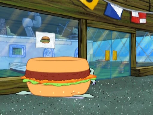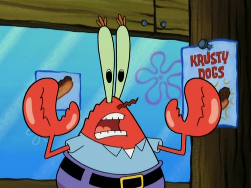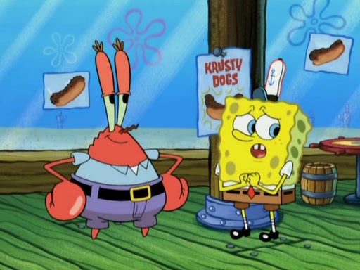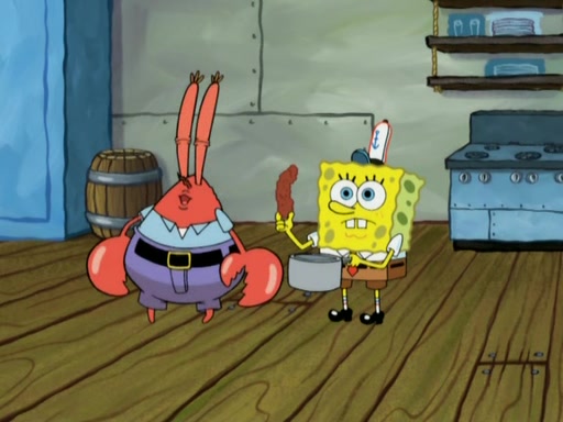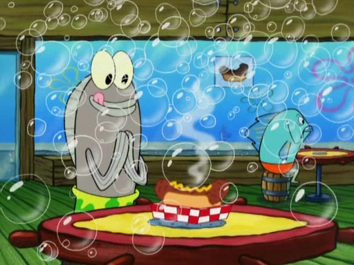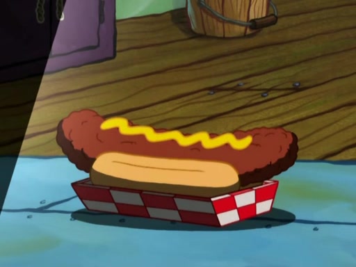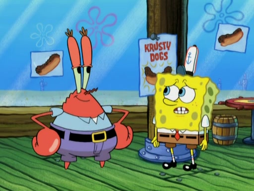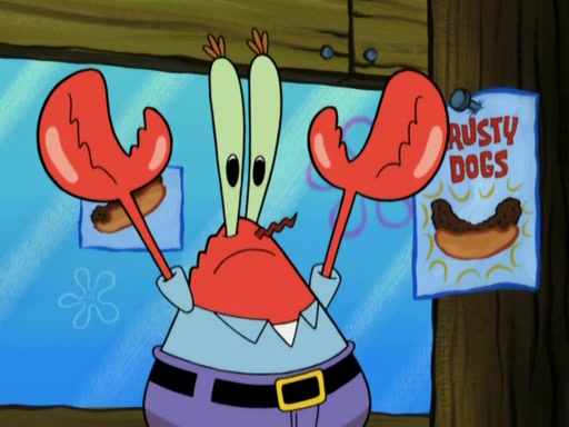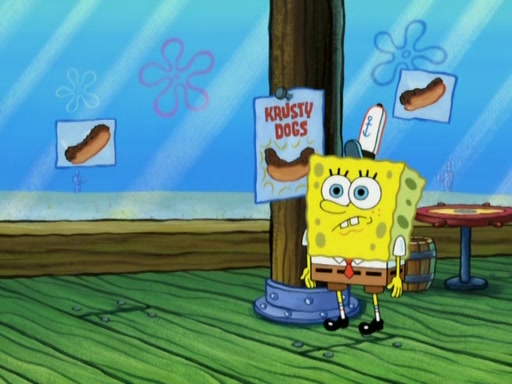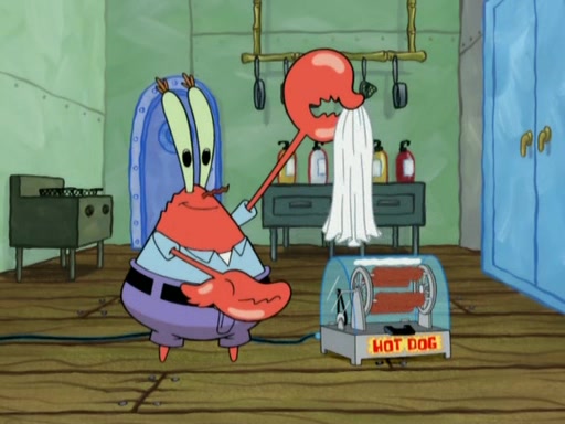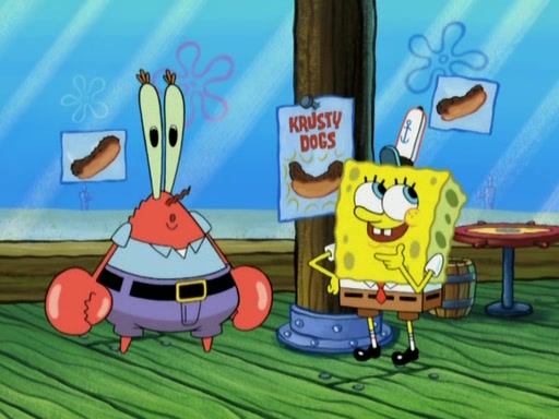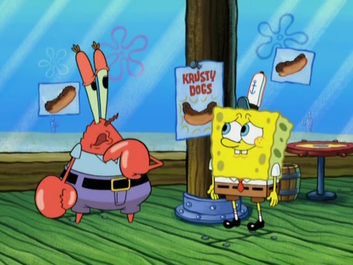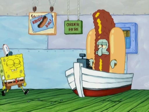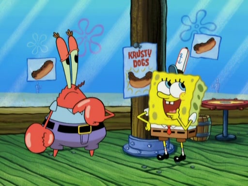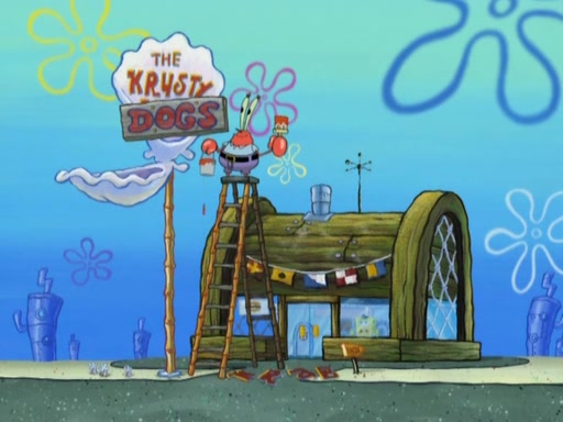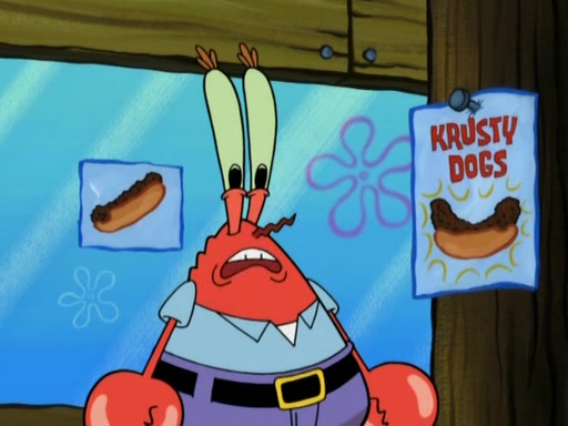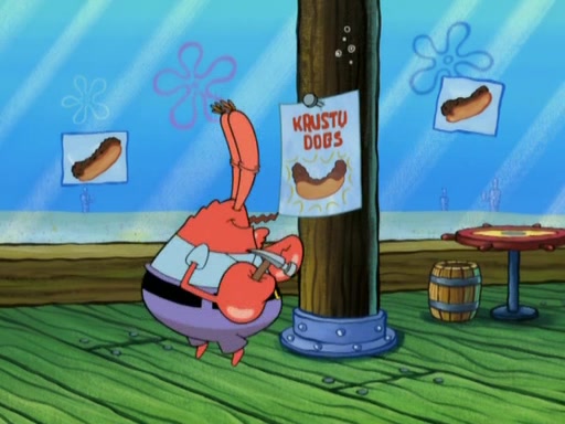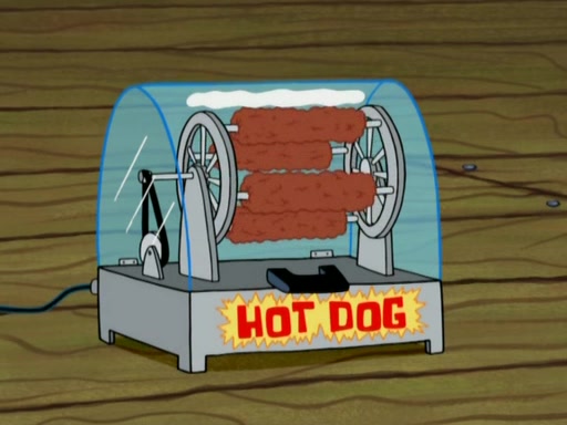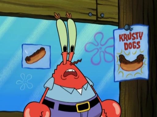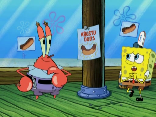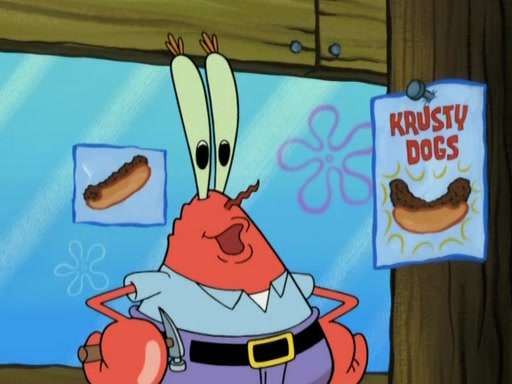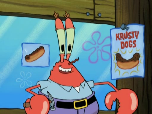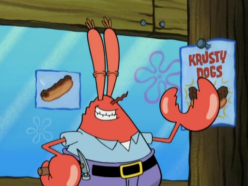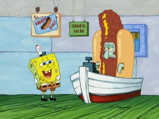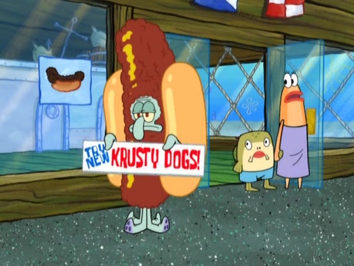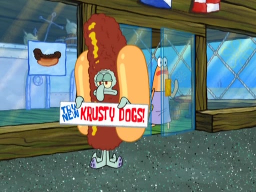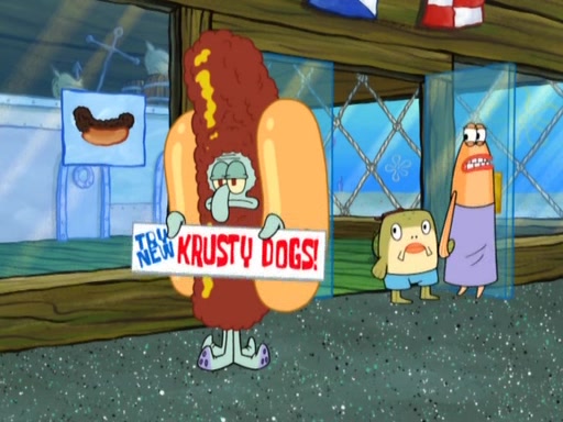 At the Krusty Krab, SpongeBob's preparing a large batch of Krabby Patties and humorously shaping its byproduct with the last of the Krabby Patty pieces. After his last joke in which he seems to be talking to Gary, he made a figure resembling a hot dog. He cooked it in a pot and the Krusty dog was given to Mr. Krabs. SpongeBob suggests adding the Krusty dog to the menu only if he uses the leftover meat which possibly means Mr. Krabs doesn't want to buy extra meat to make Krusty dogs.