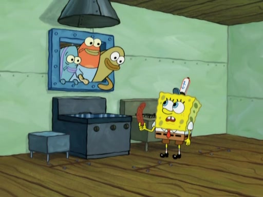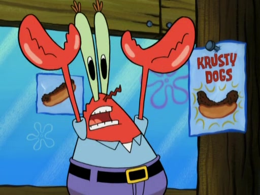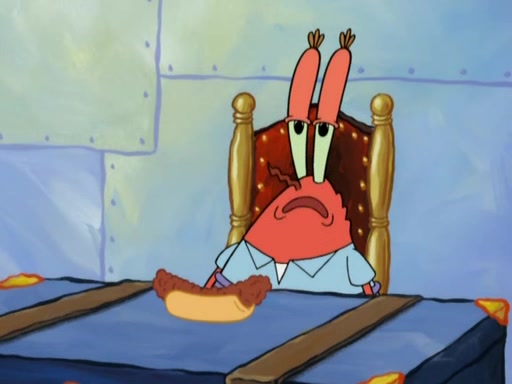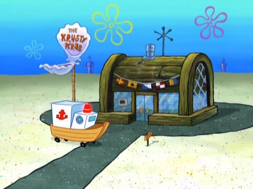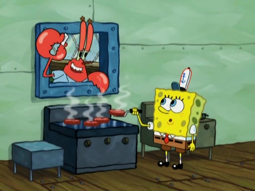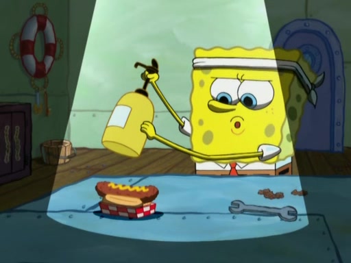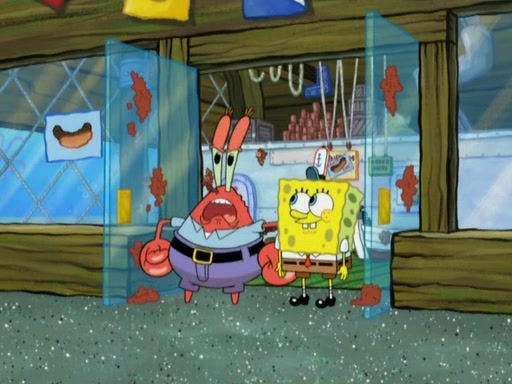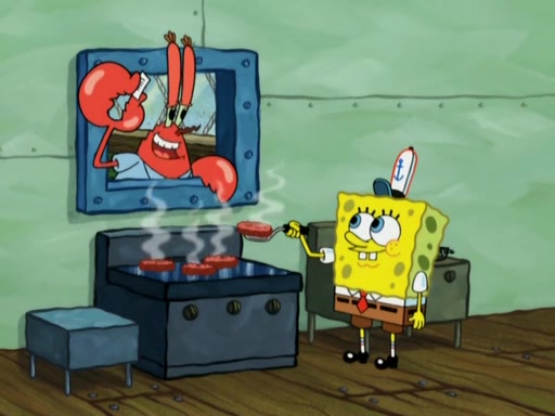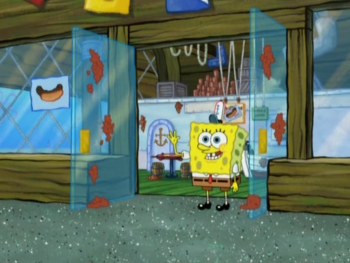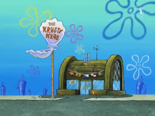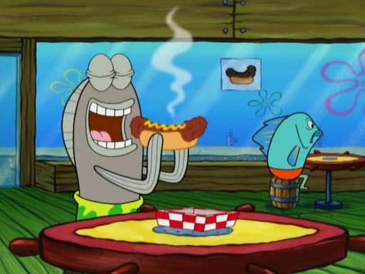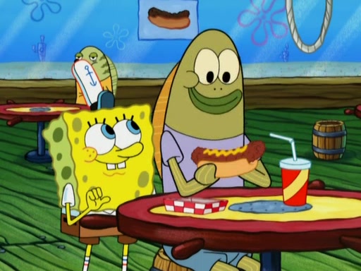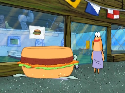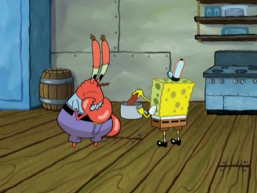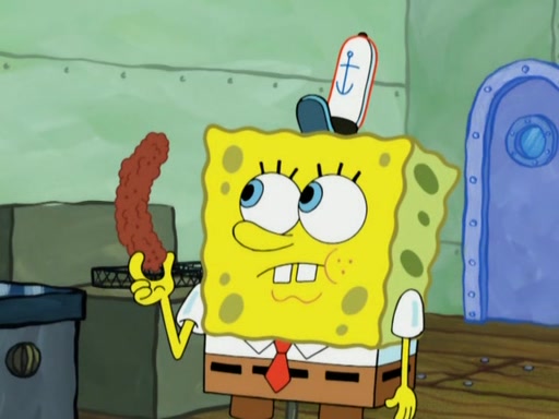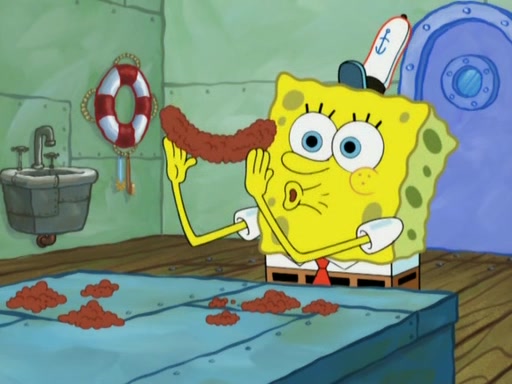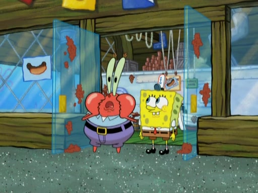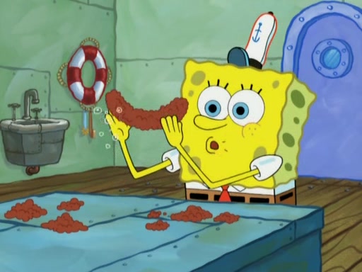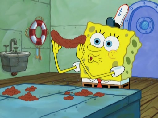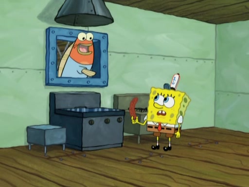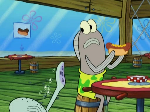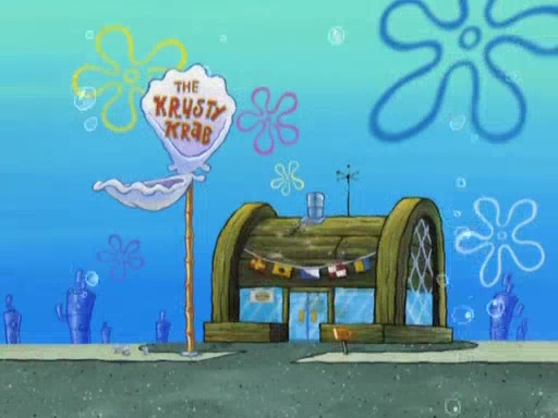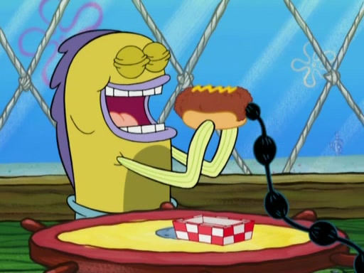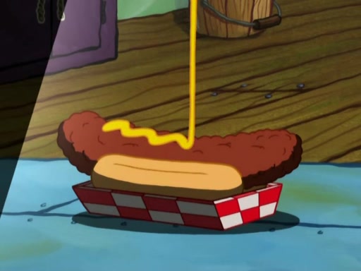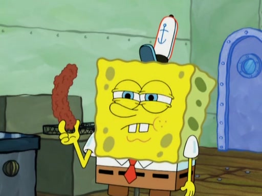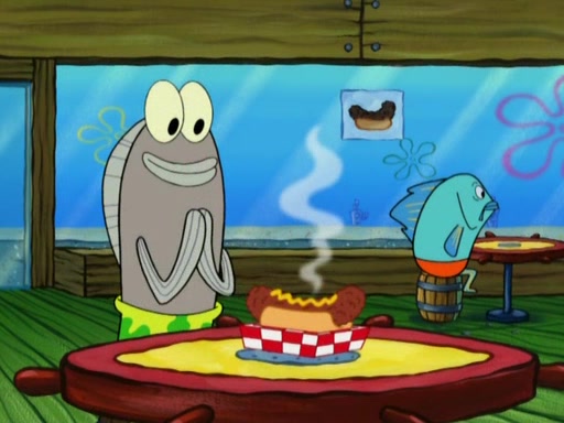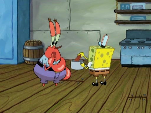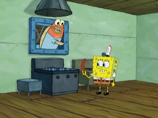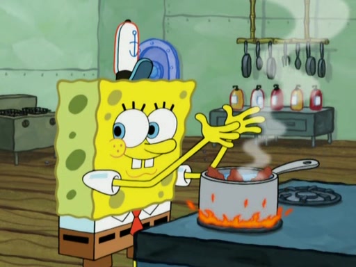 At the Krusty Krab, SpongeBob's preparing a large batch of Krabby Patties and humorously shaping its byproduct with the last of the Krabby Patty pieces. After his last joke in which he seems to be talking to Gary, he made a figure resembling a hot dog. He cooked it in a pot and the Krusty dog was given to Mr. Krabs. SpongeBob suggests adding the Krusty dog to the menu only if he uses the leftover meat which possibly means Mr. Krabs doesn't want to buy extra meat to make Krusty dogs.