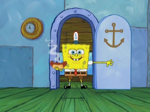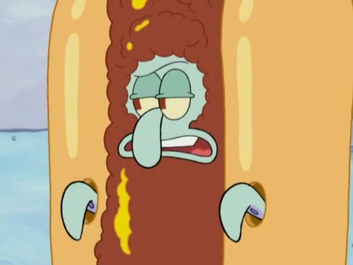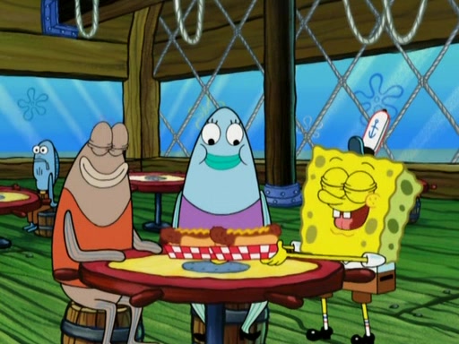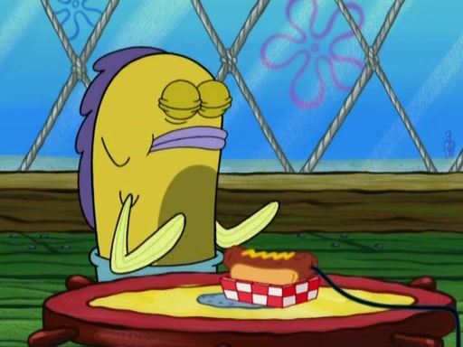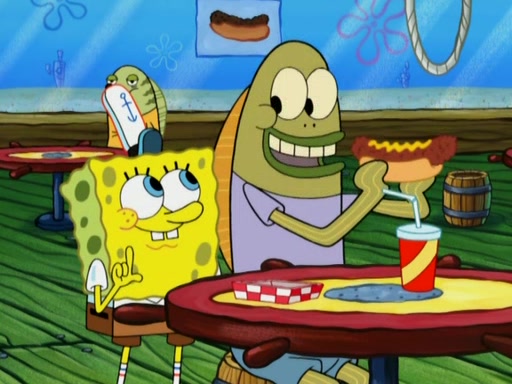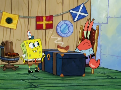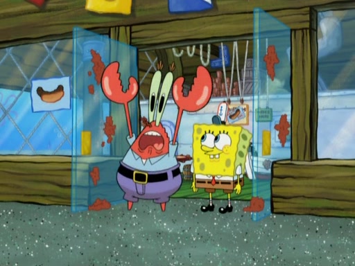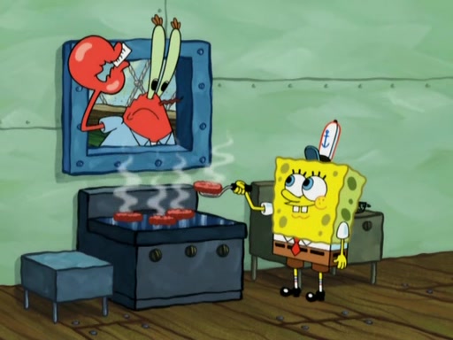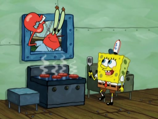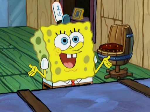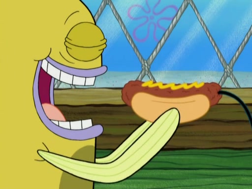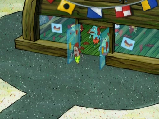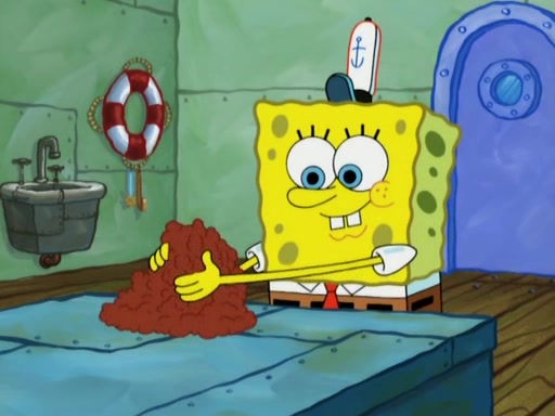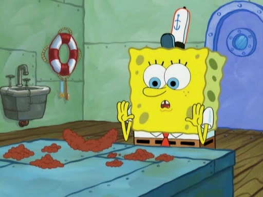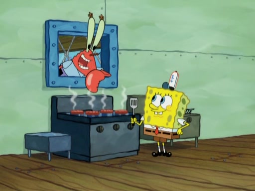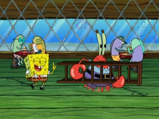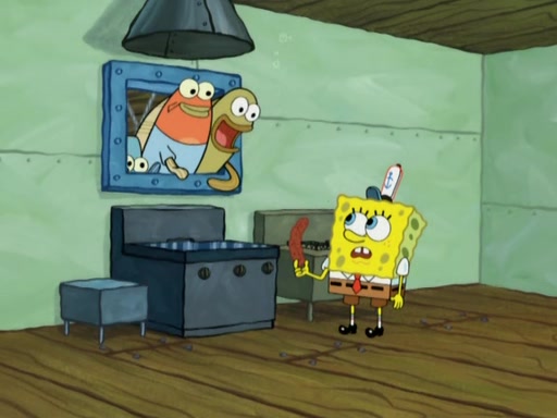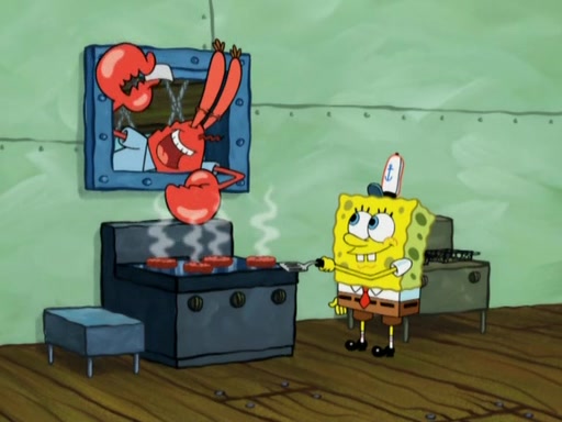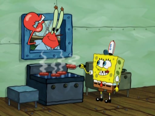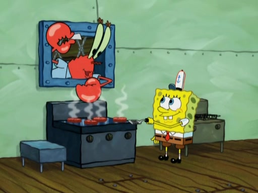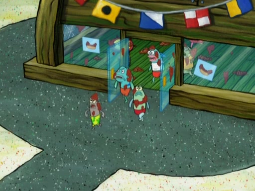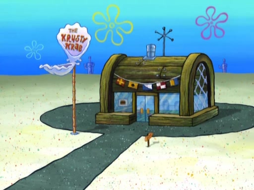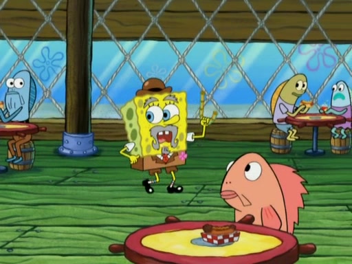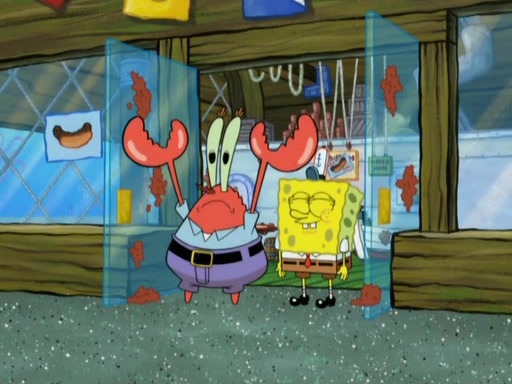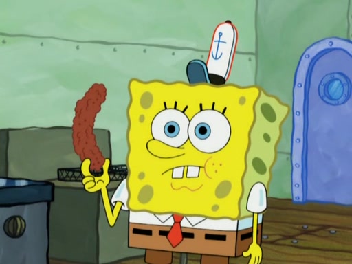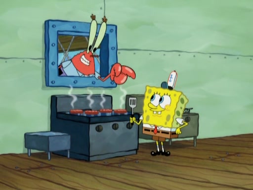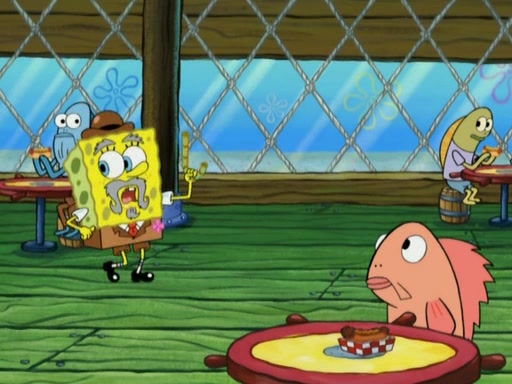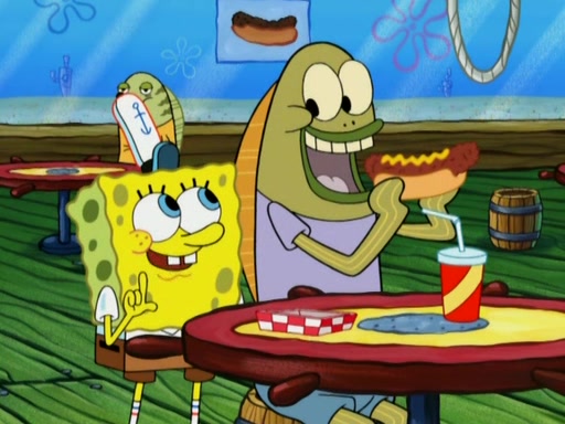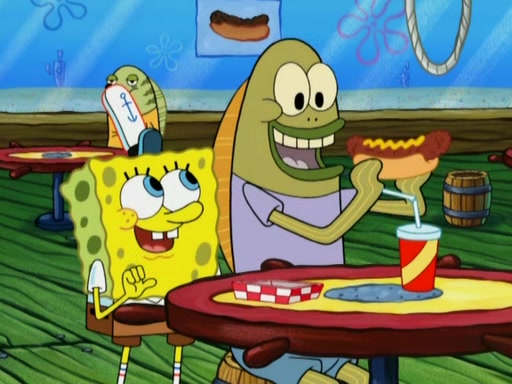 At the Krusty Krab, SpongeBob's preparing a large batch of Krabby Patties and humorously shaping its byproduct with the last of the Krabby Patty pieces. After his last joke in which he seems to be talking to Gary, he made a figure resembling a hot dog. He cooked it in a pot and the Krusty dog was given to Mr. Krabs. SpongeBob suggests adding the Krusty dog to the menu only if he uses the leftover meat which possibly means Mr. Krabs doesn't want to buy extra meat to make Krusty dogs.
