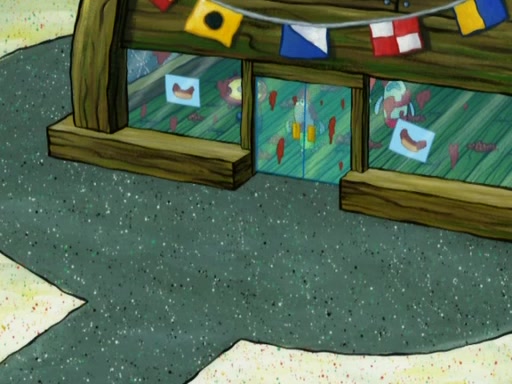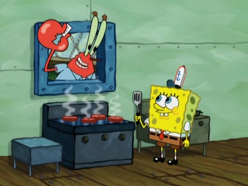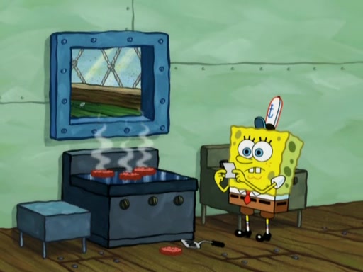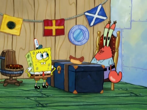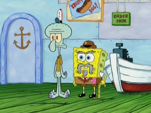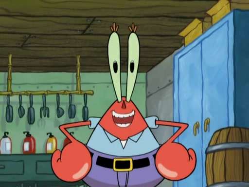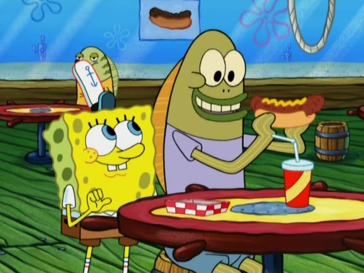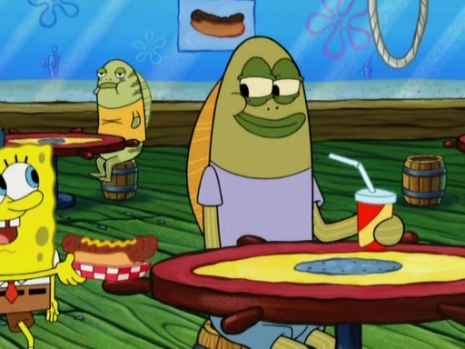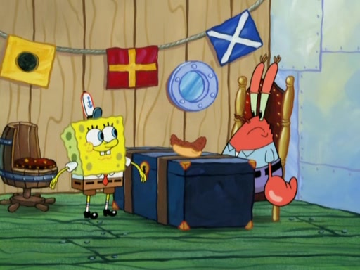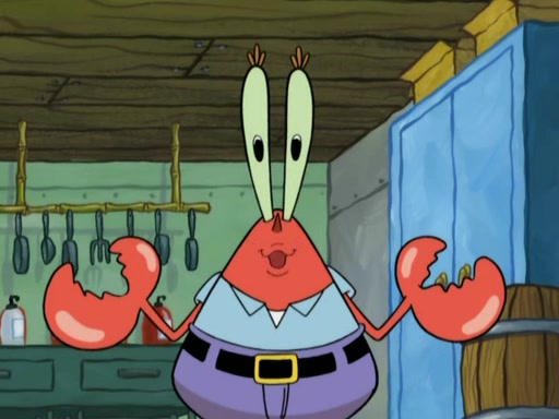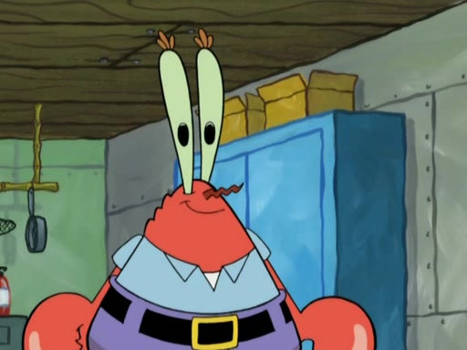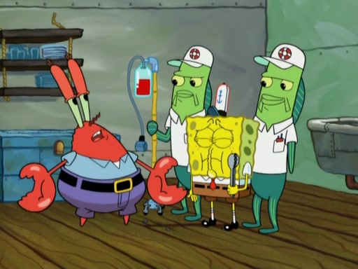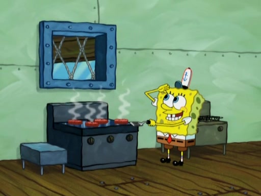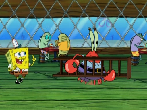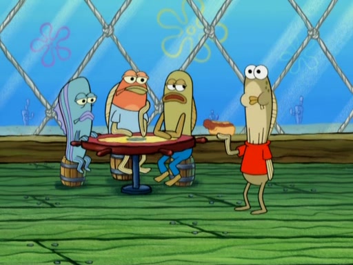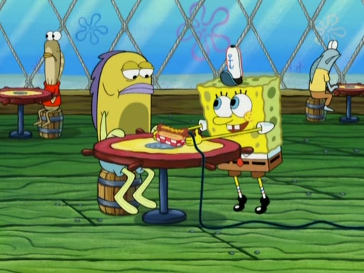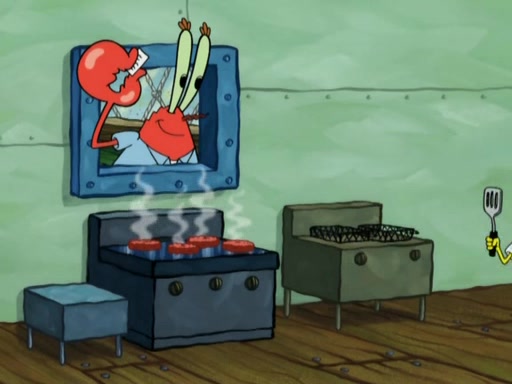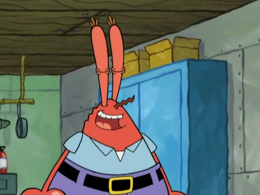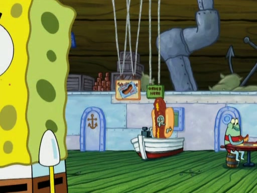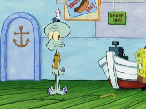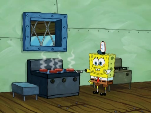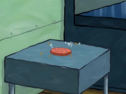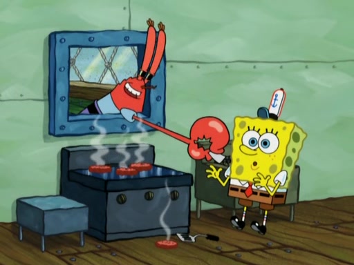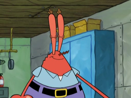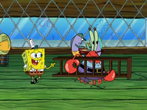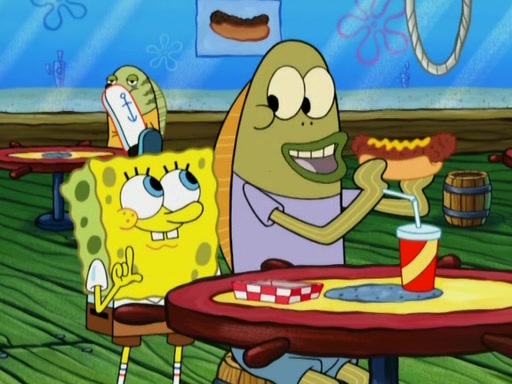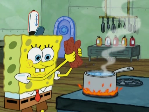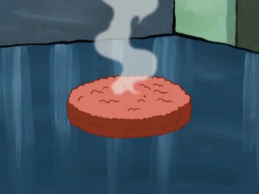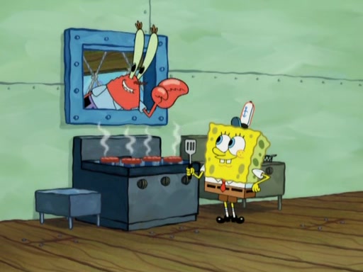 At the Krusty Krab, SpongeBob's preparing a large batch of Krabby Patties and humorously shaping its byproduct with the last of the Krabby Patty pieces. After his last joke in which he seems to be talking to Gary, he made a figure resembling a hot dog. He cooked it in a pot and the Krusty dog was given to Mr. Krabs. SpongeBob suggests adding the Krusty dog to the menu only if he uses the leftover meat which possibly means Mr. Krabs doesn't want to buy extra meat to make Krusty dogs.