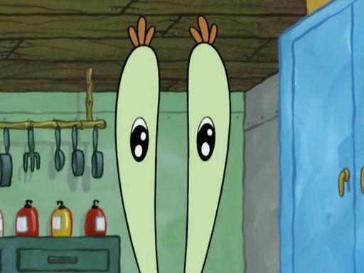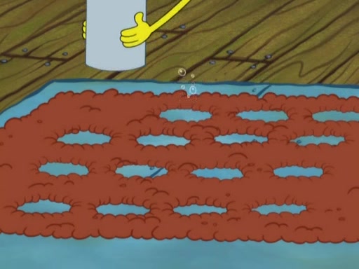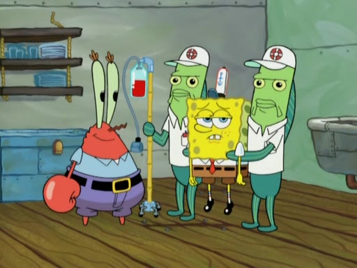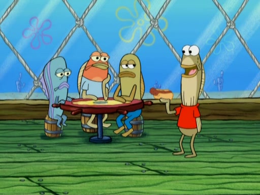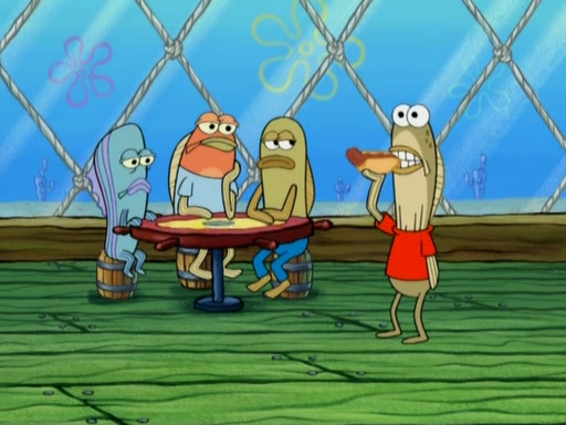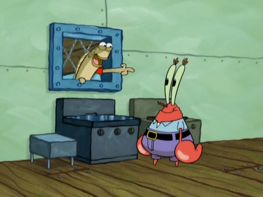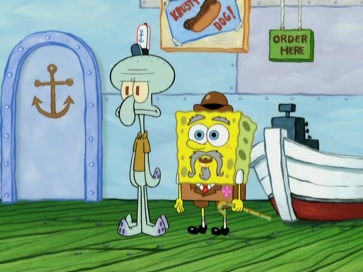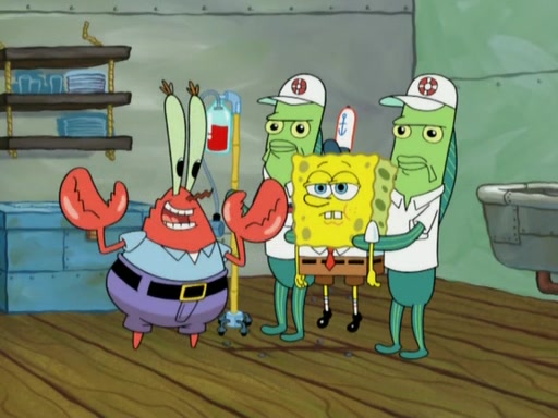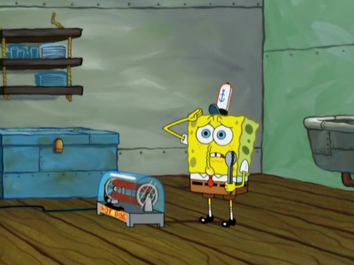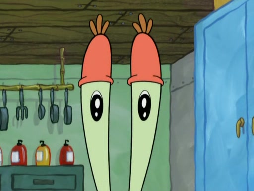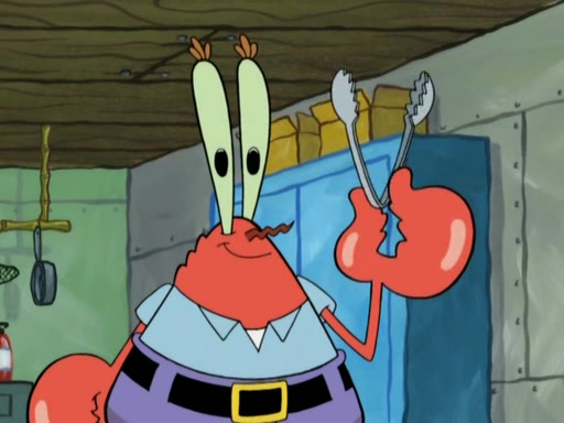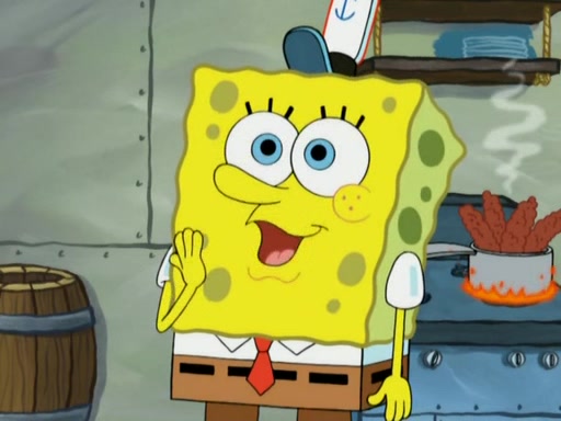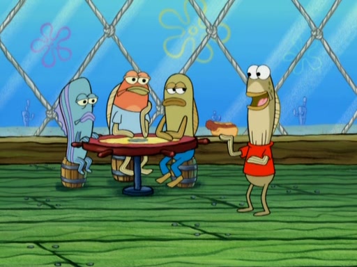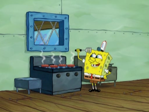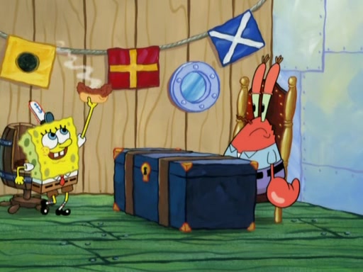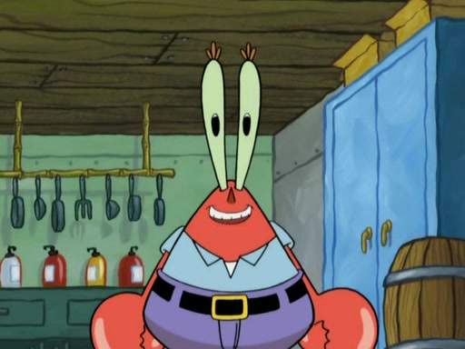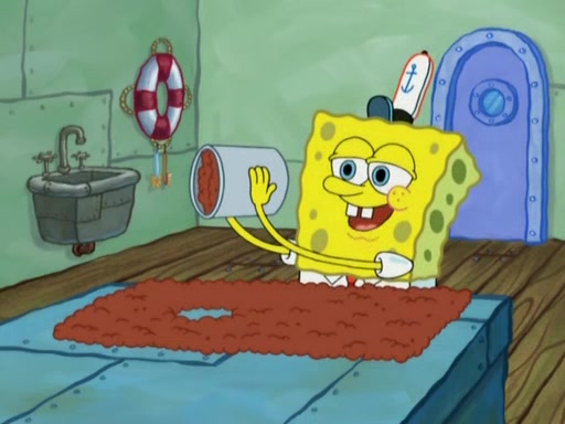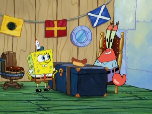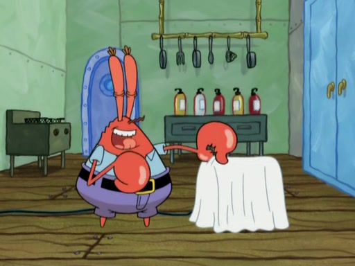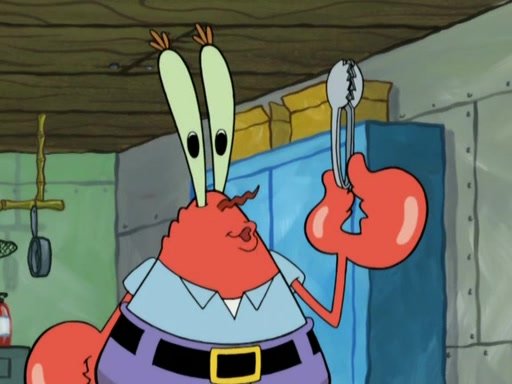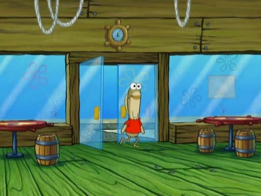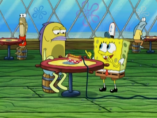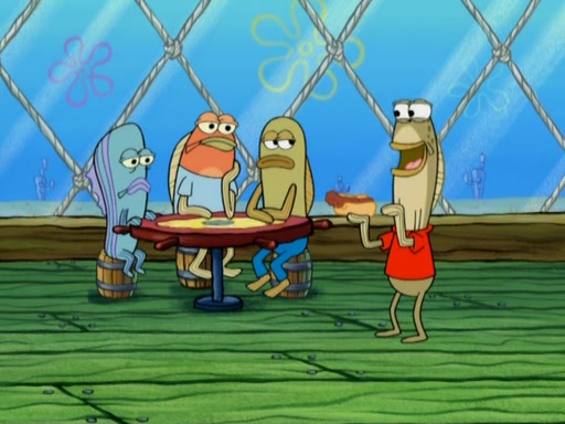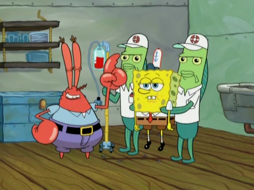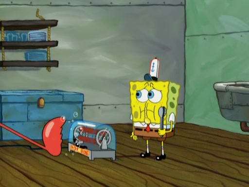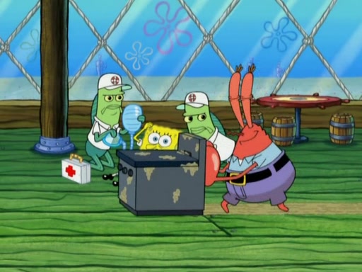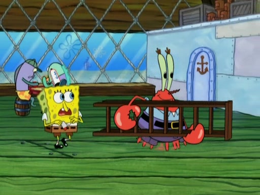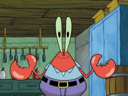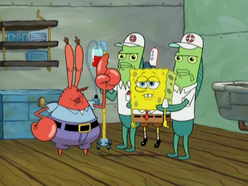 At the Krusty Krab, SpongeBob's preparing a large batch of Krabby Patties and humorously shaping its byproduct with the last of the Krabby Patty pieces. After his last joke in which he seems to be talking to Gary, he made a figure resembling a hot dog. He cooked it in a pot and the Krusty dog was given to Mr. Krabs. SpongeBob suggests adding the Krusty dog to the menu only if he uses the leftover meat which possibly means Mr. Krabs doesn't want to buy extra meat to make Krusty dogs.
