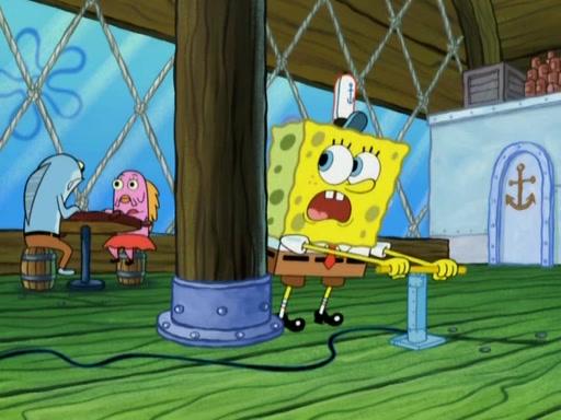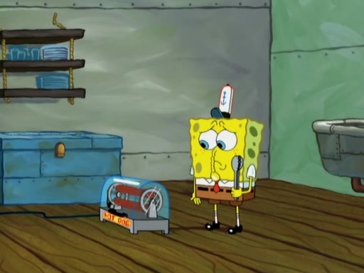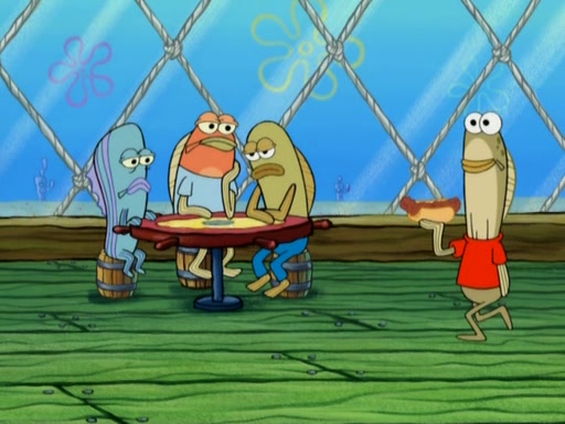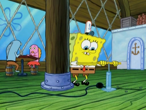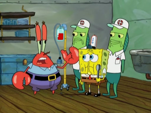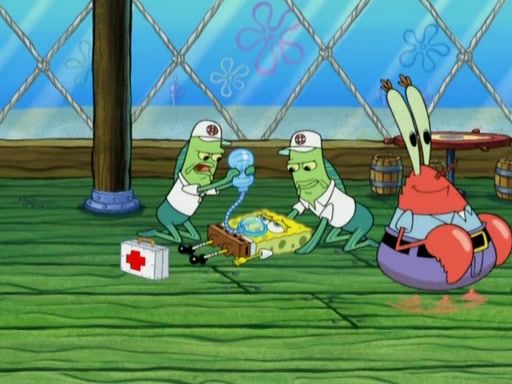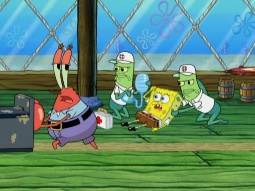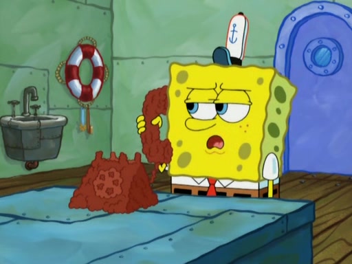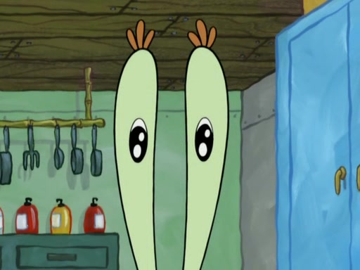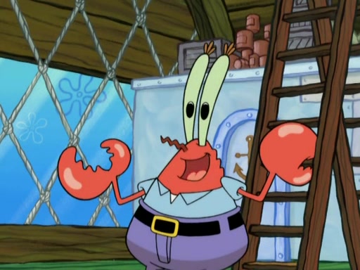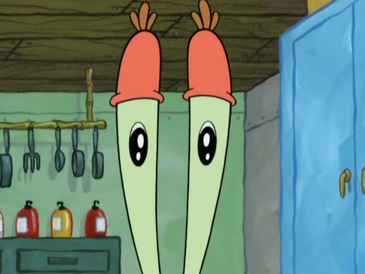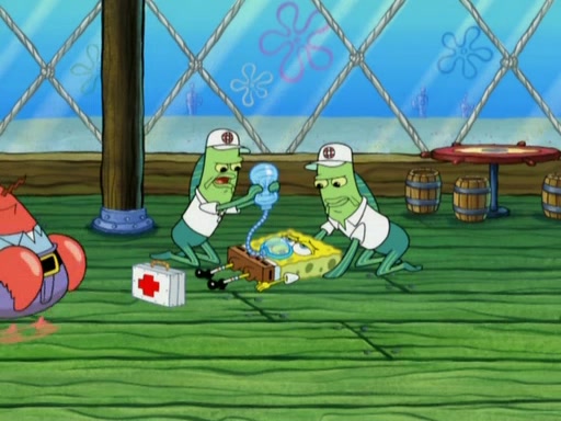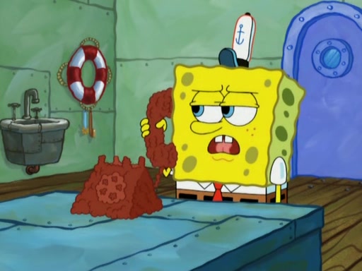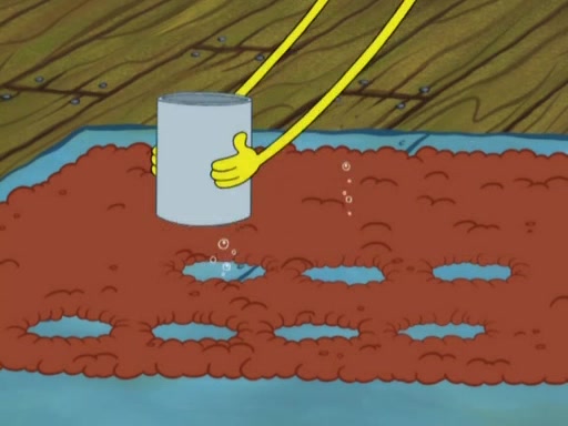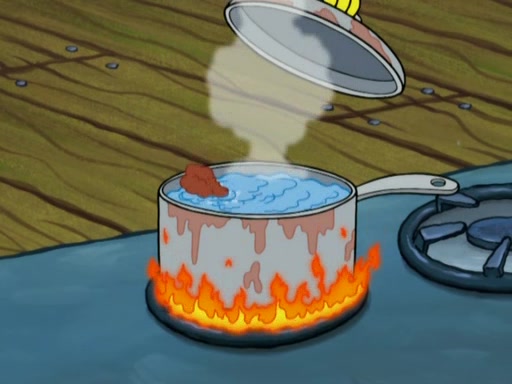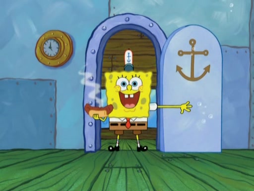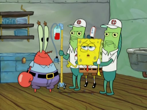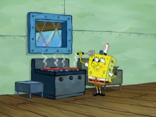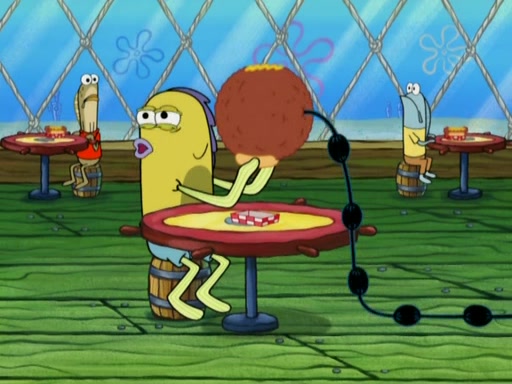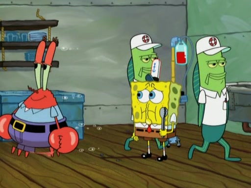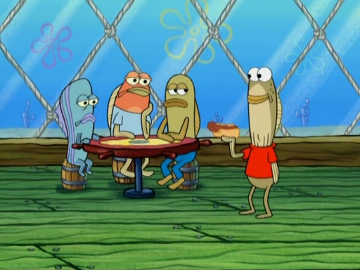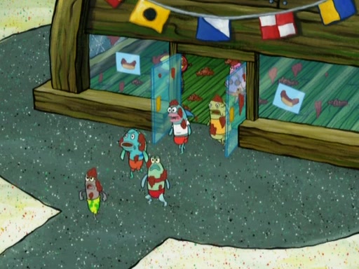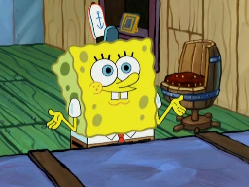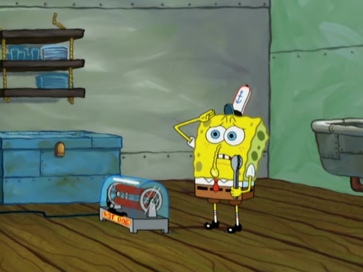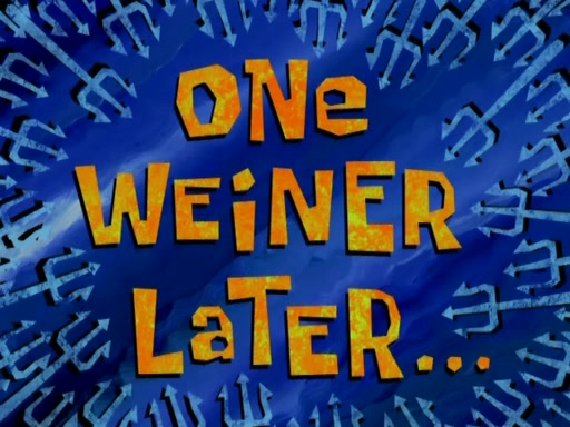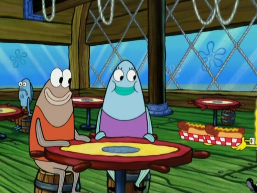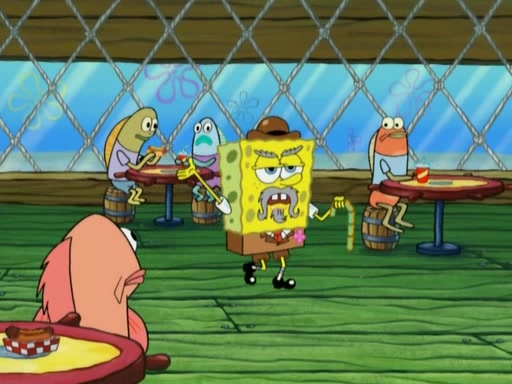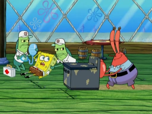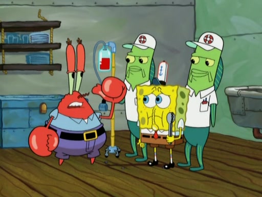 At the Krusty Krab, SpongeBob's preparing a large batch of Krabby Patties and humorously shaping its byproduct with the last of the Krabby Patty pieces. After his last joke in which he seems to be talking to Gary, he made a figure resembling a hot dog. He cooked it in a pot and the Krusty dog was given to Mr. Krabs. SpongeBob suggests adding the Krusty dog to the menu only if he uses the leftover meat which possibly means Mr. Krabs doesn't want to buy extra meat to make Krusty dogs.