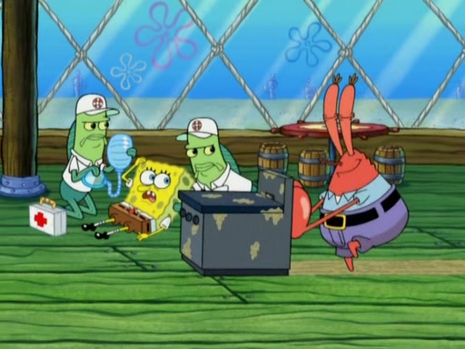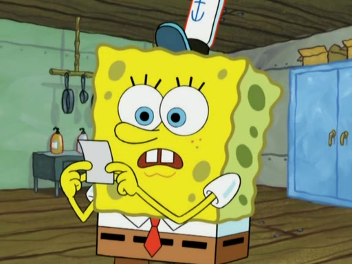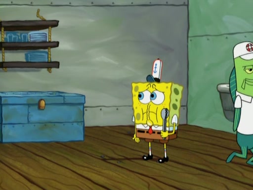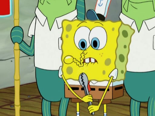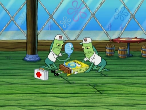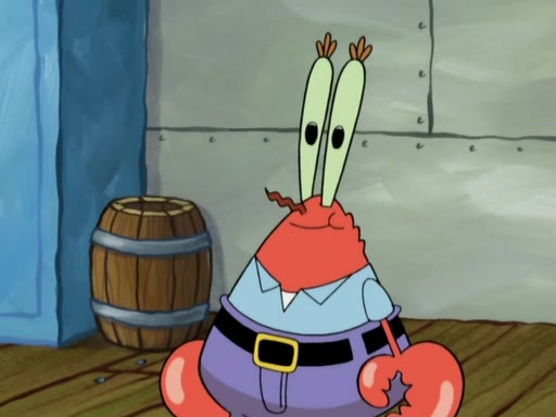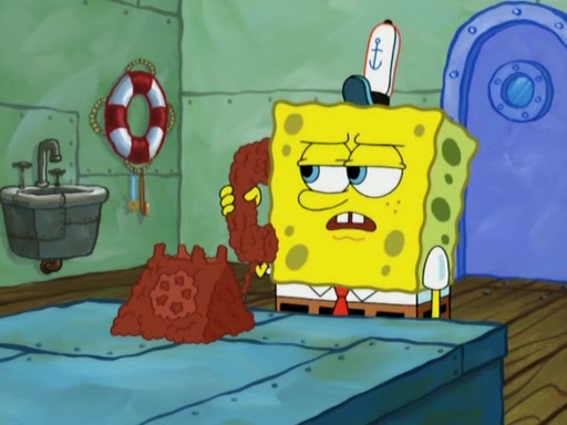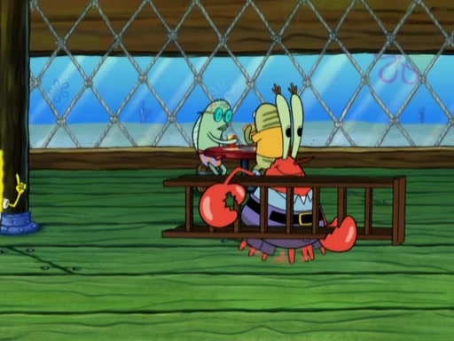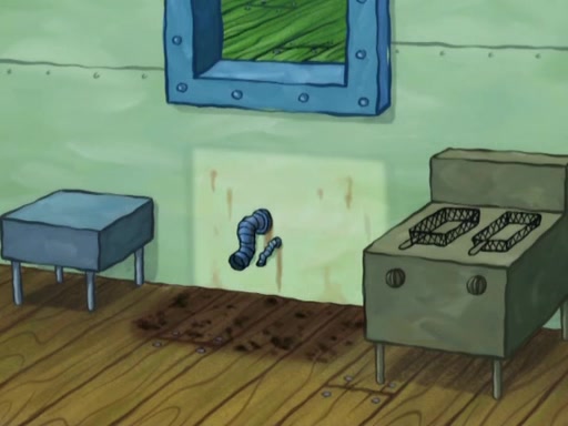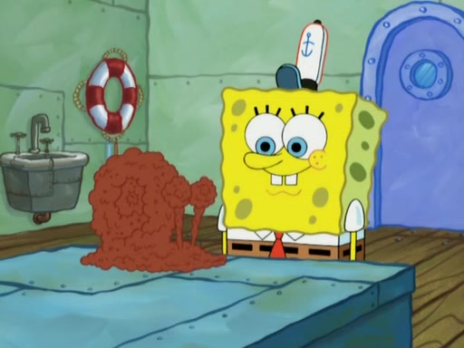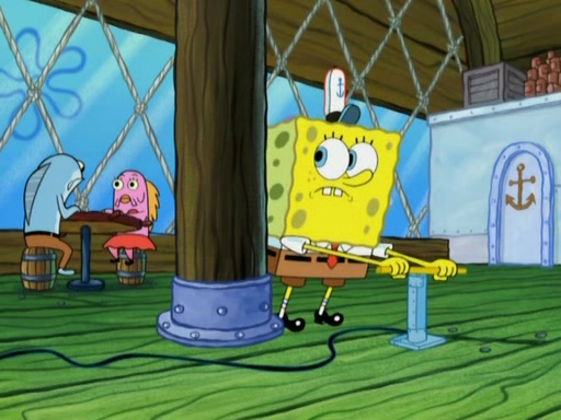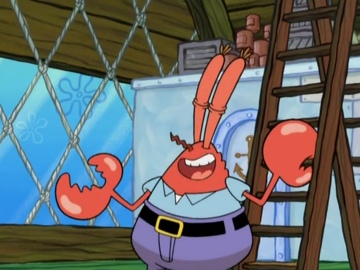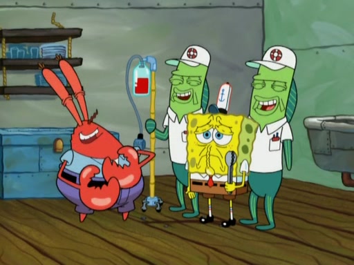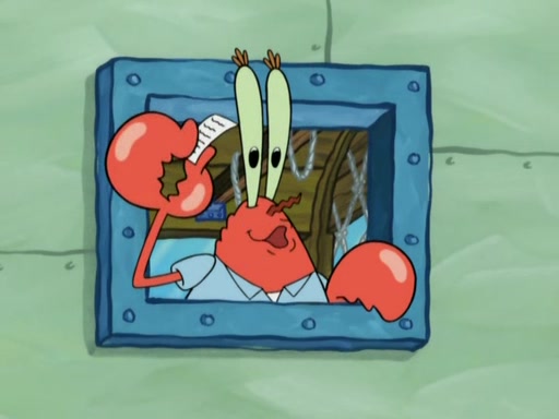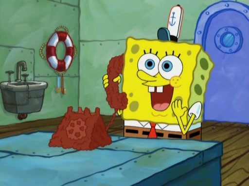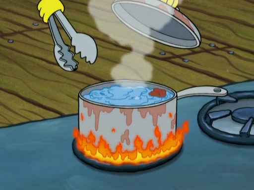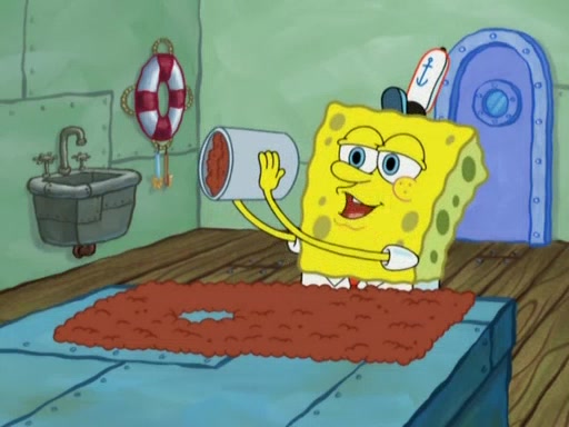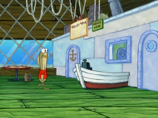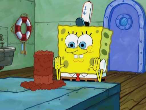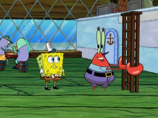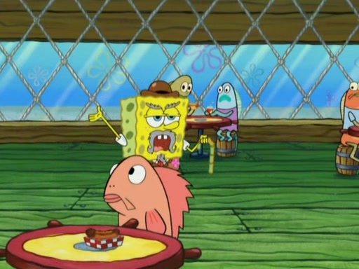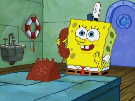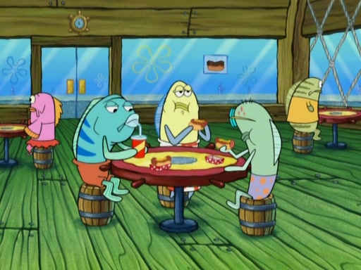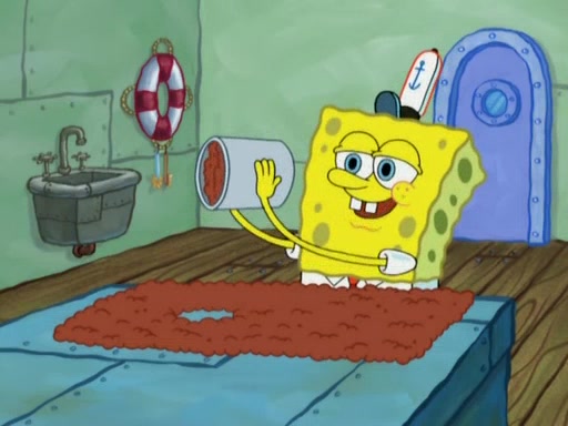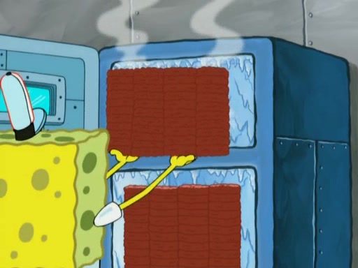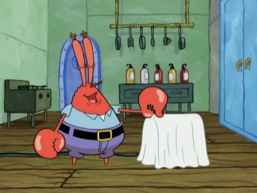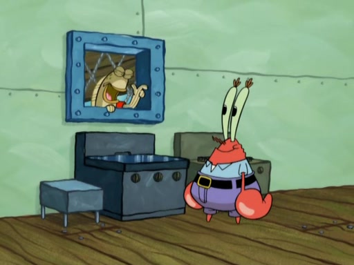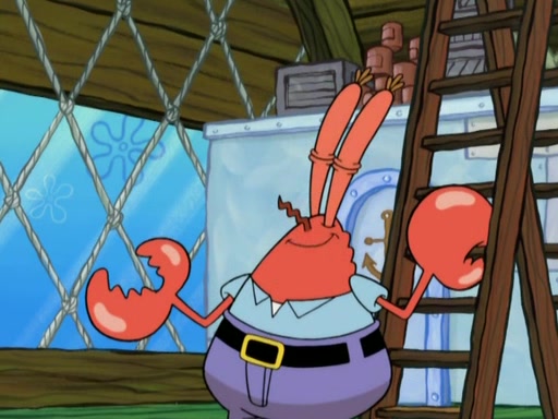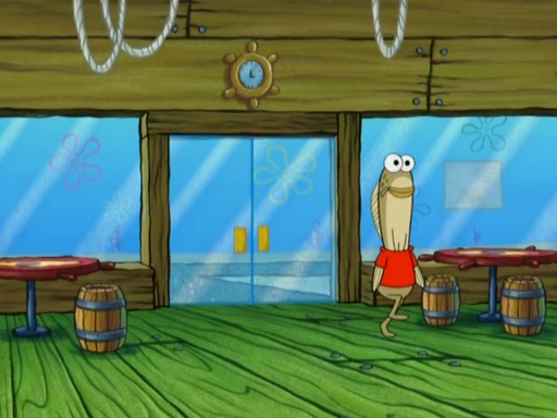 At the Krusty Krab, SpongeBob's preparing a large batch of Krabby Patties and humorously shaping its byproduct with the last of the Krabby Patty pieces. After his last joke in which he seems to be talking to Gary, he made a figure resembling a hot dog. He cooked it in a pot and the Krusty dog was given to Mr. Krabs. SpongeBob suggests adding the Krusty dog to the menu only if he uses the leftover meat which possibly means Mr. Krabs doesn't want to buy extra meat to make Krusty dogs.