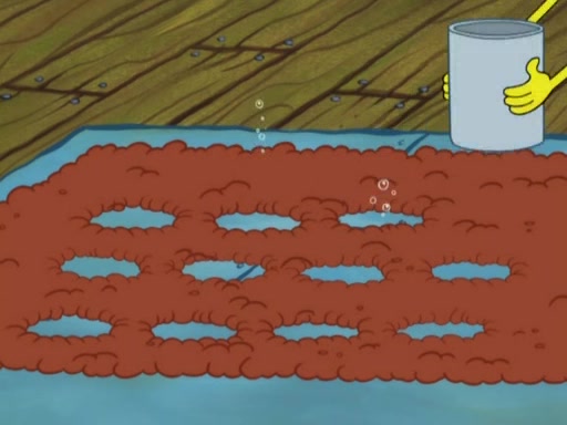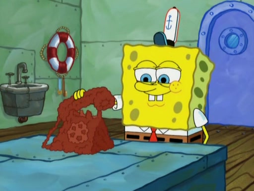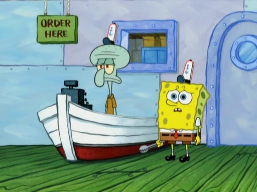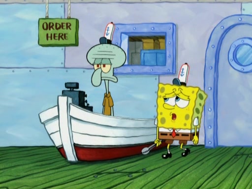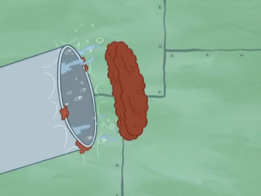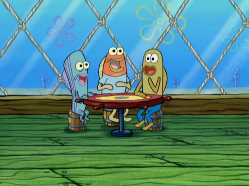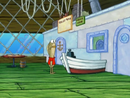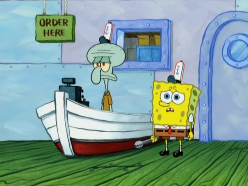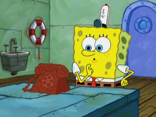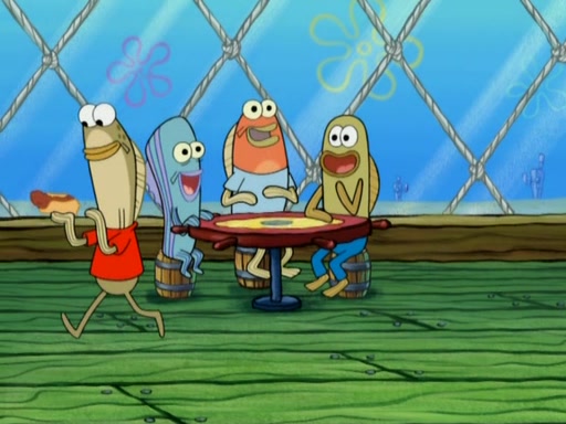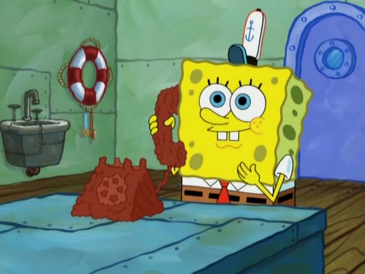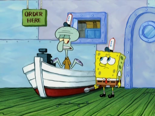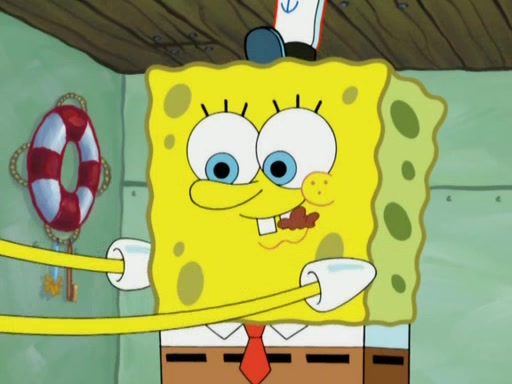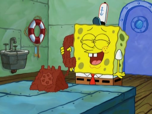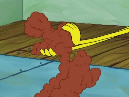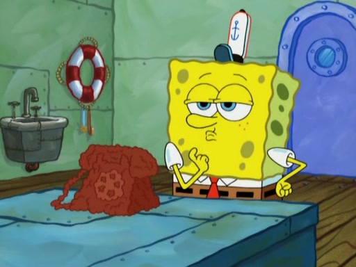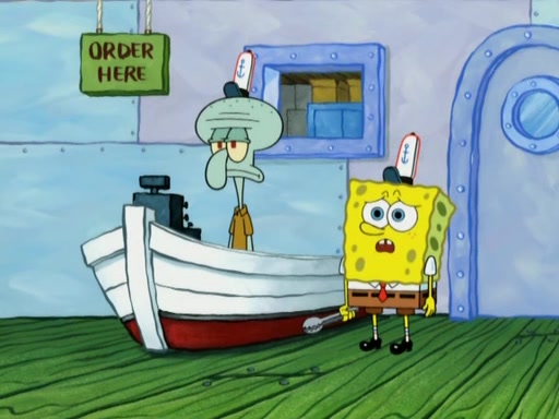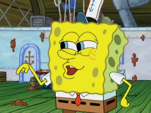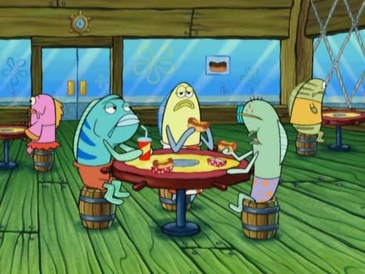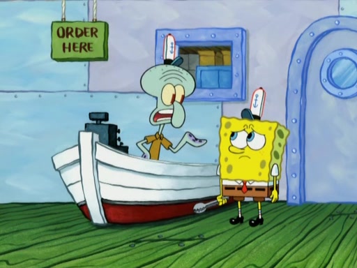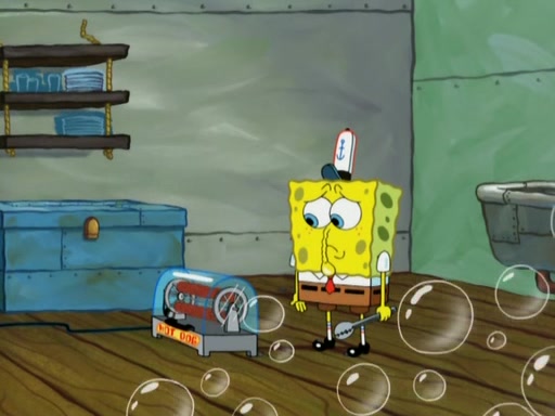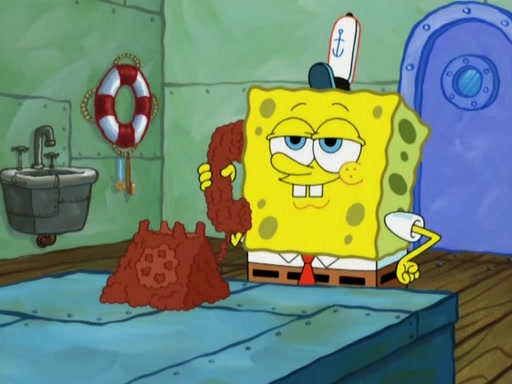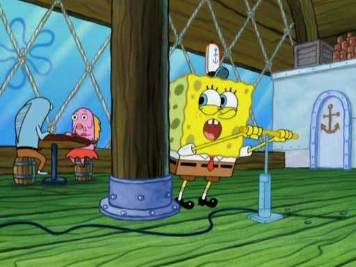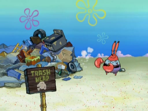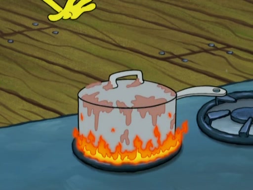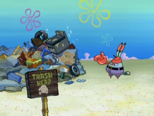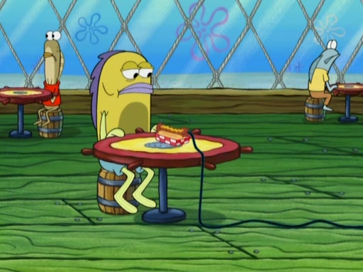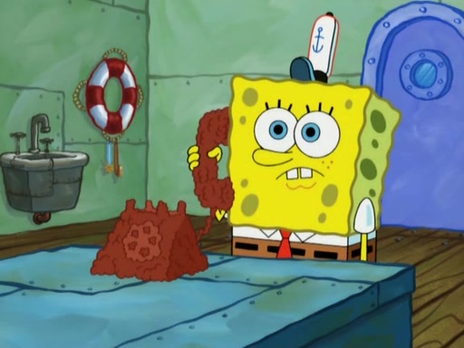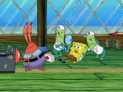 At the Krusty Krab, SpongeBob's preparing a large batch of Krabby Patties and humorously shaping its byproduct with the last of the Krabby Patty pieces. After his last joke in which he seems to be talking to Gary, he made a figure resembling a hot dog. He cooked it in a pot and the Krusty dog was given to Mr. Krabs. SpongeBob suggests adding the Krusty dog to the menu only if he uses the leftover meat which possibly means Mr. Krabs doesn't want to buy extra meat to make Krusty dogs.