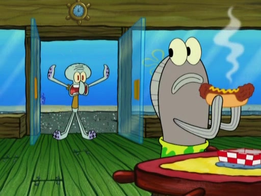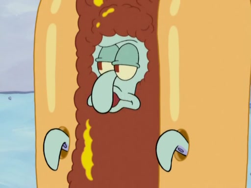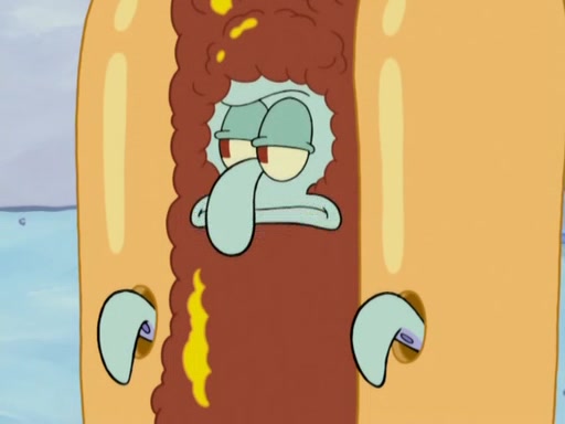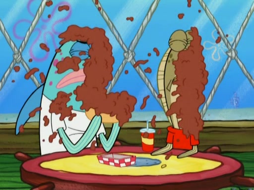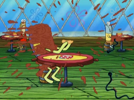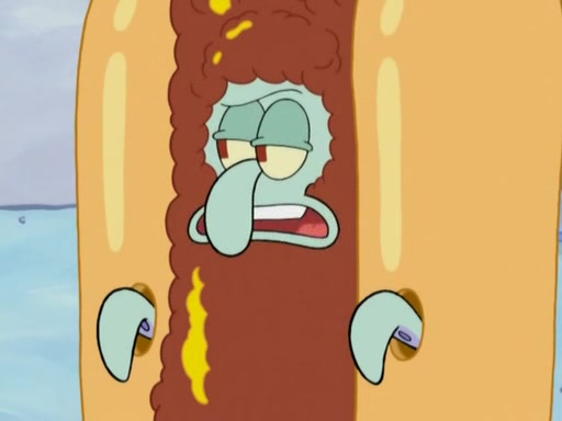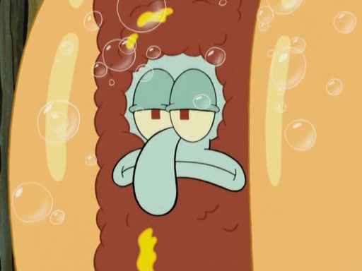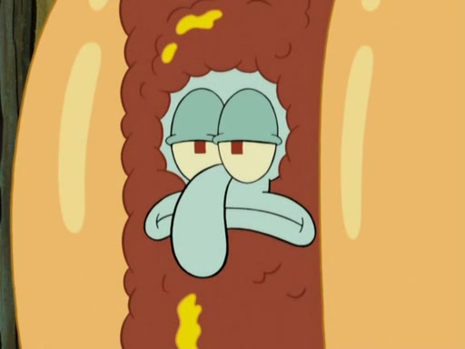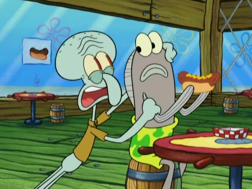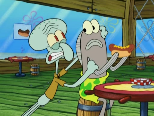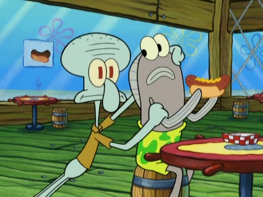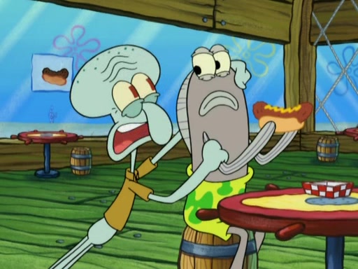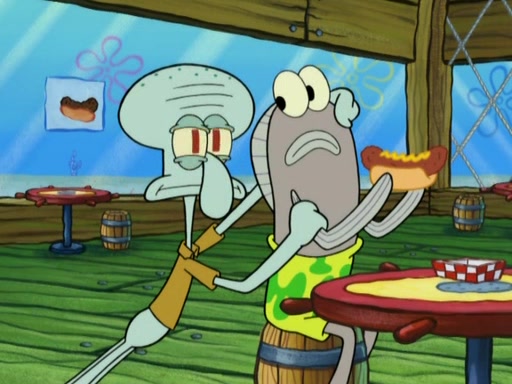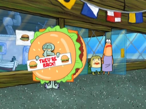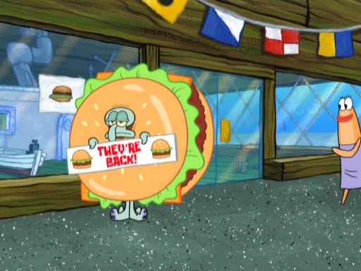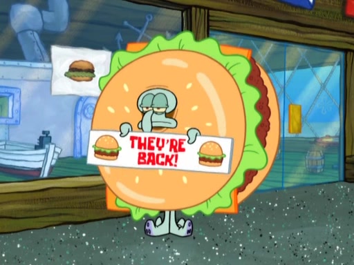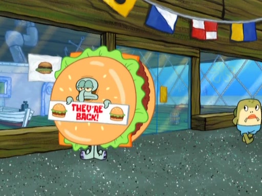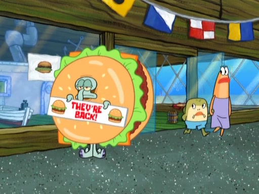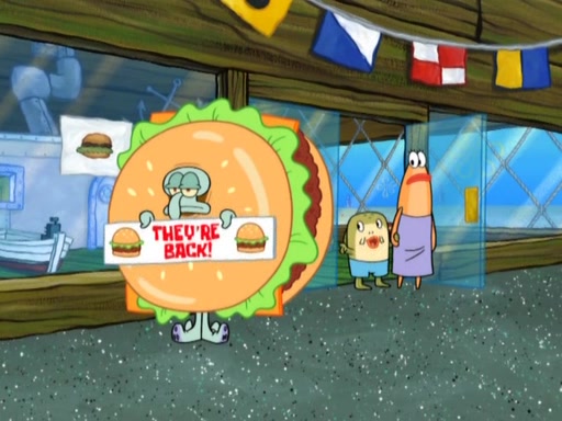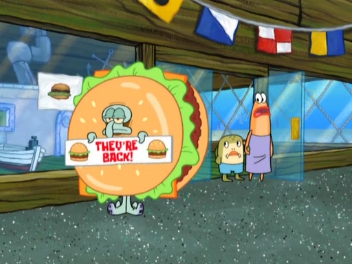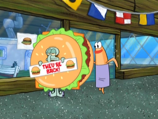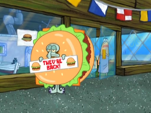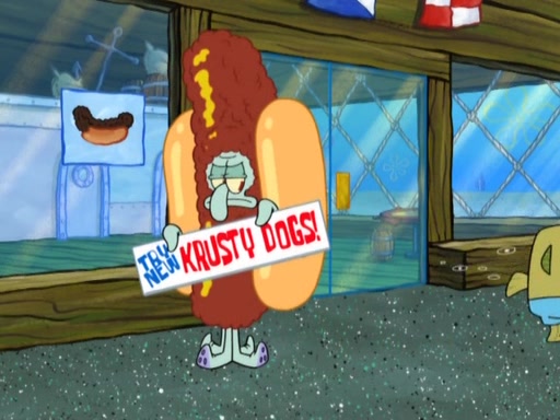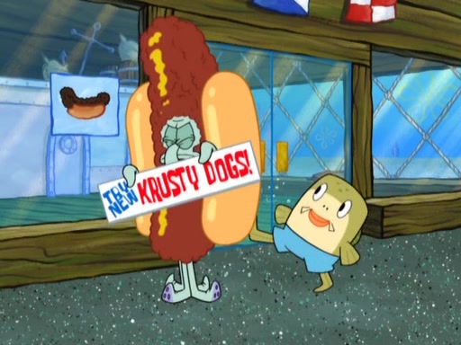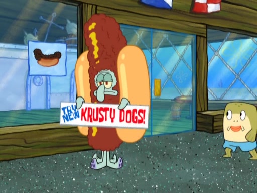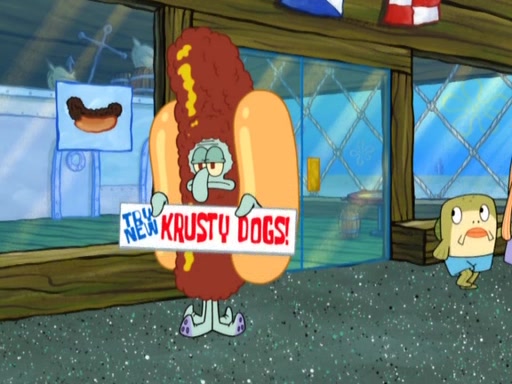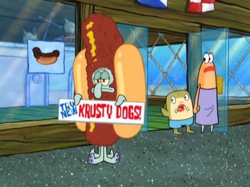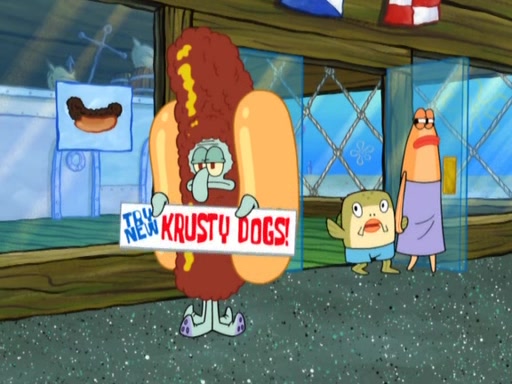 In a plan to put patties back, SpongeBob pasted out rumors and lies about what some of the real ingredients are. After little success and help from Squidward, he made people think that a Krusty Dog will explode which annoyed them by exploding a Krusty Dog with a pump in one customers face. When Krabby Patties regained popularity, Squidward is dressed in a costume again only to be kicked by Sadie, thinking that the patties are only as bad as the Krusty dogs.