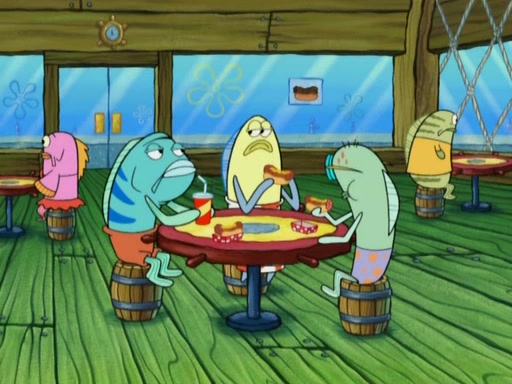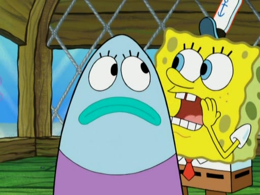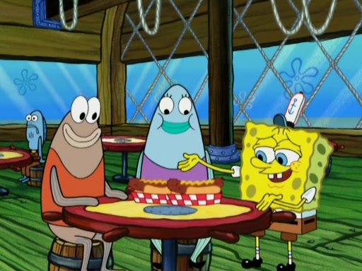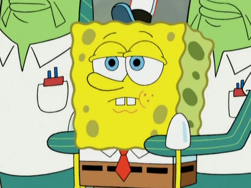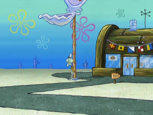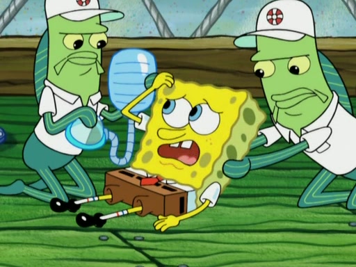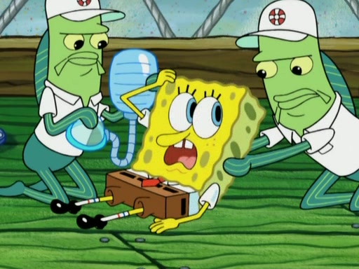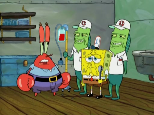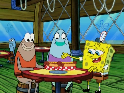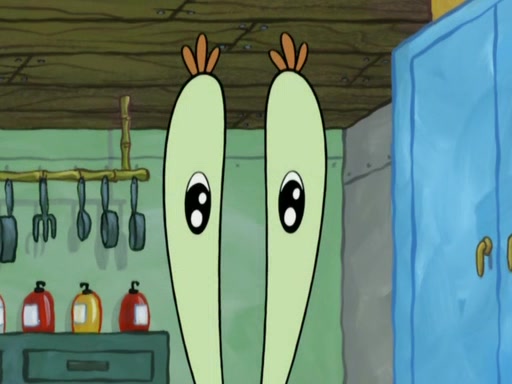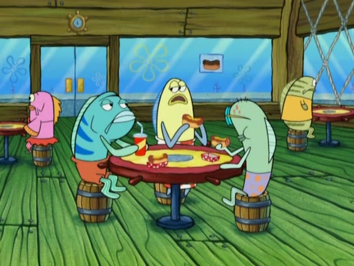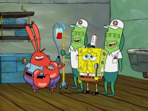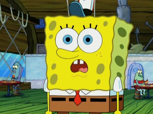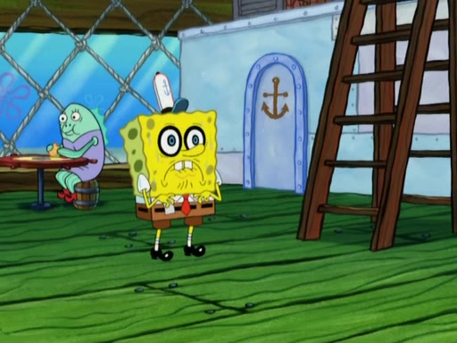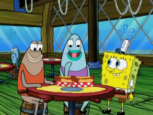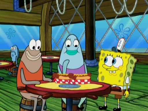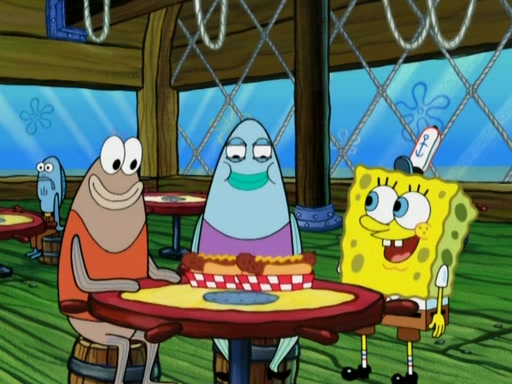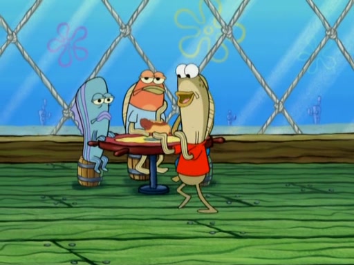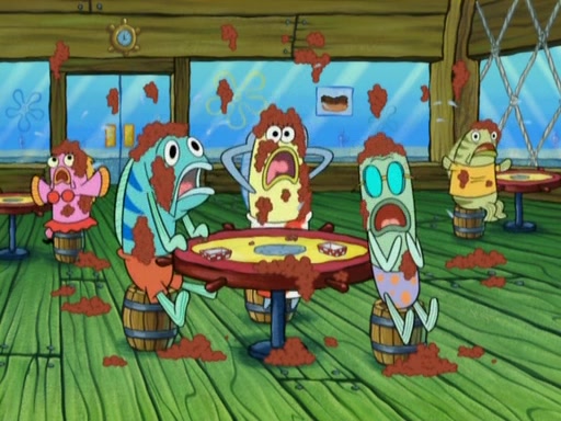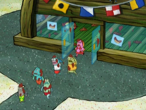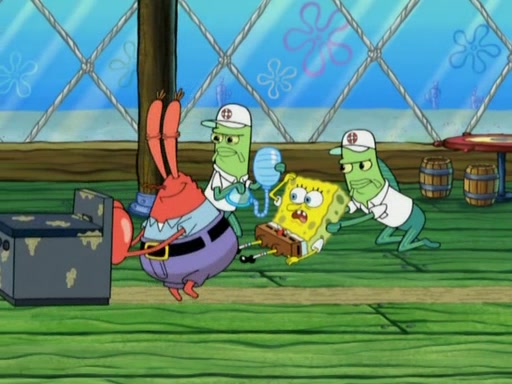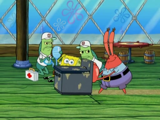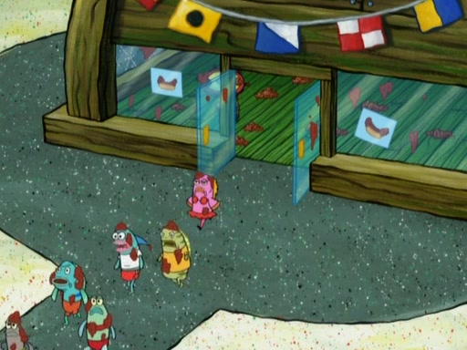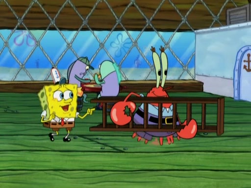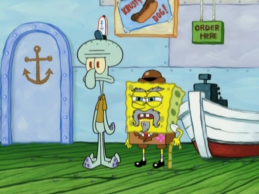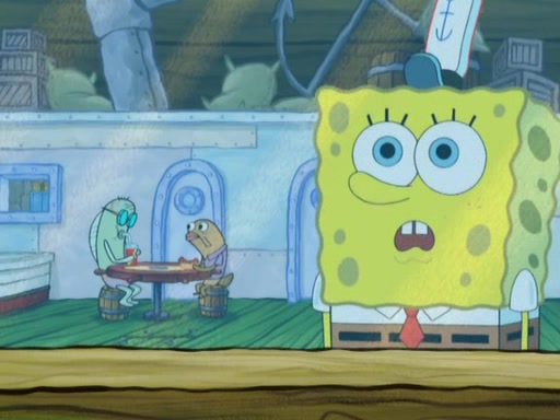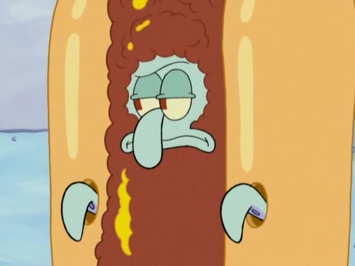 In a plan to put patties back, SpongeBob pasted out rumors and lies about what some of the real ingredients are. After little success and help from Squidward, he made people think that a Krusty Dog will explode which annoyed them by exploding a Krusty Dog with a pump in one customers face. When Krabby Patties regained popularity, Squidward is dressed in a costume again only to be kicked by Sadie, thinking that the patties are only as bad as the Krusty dogs.