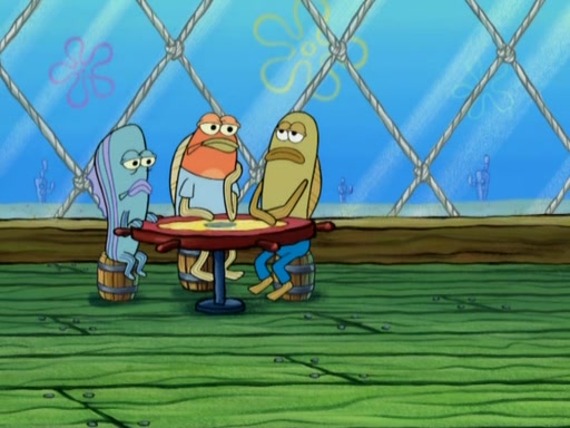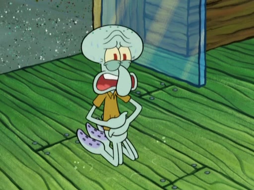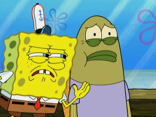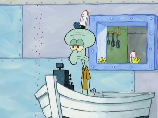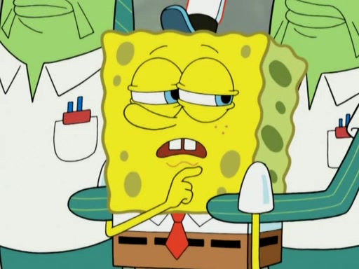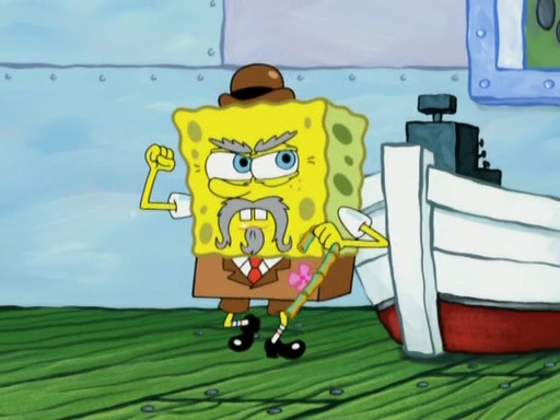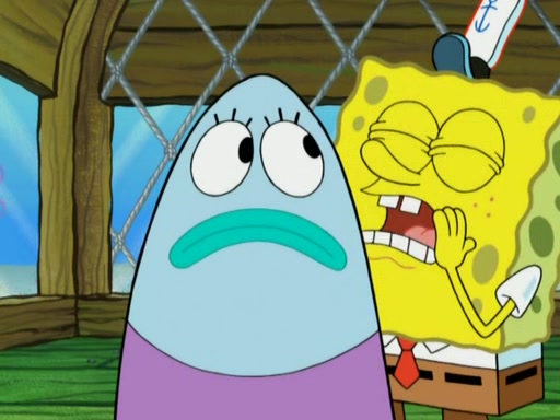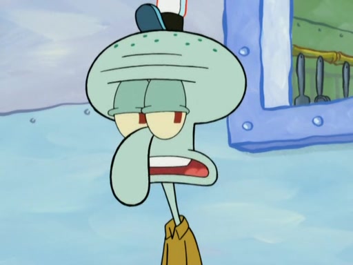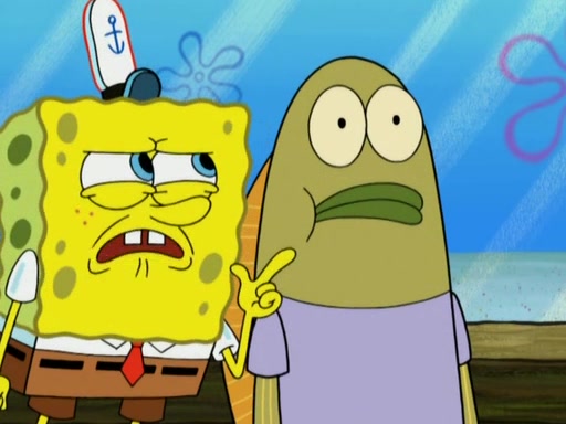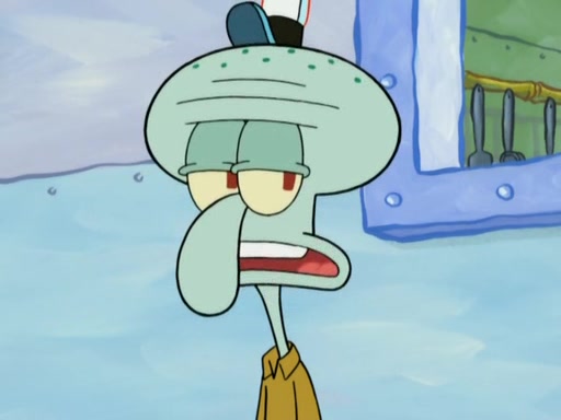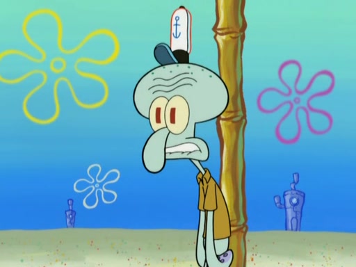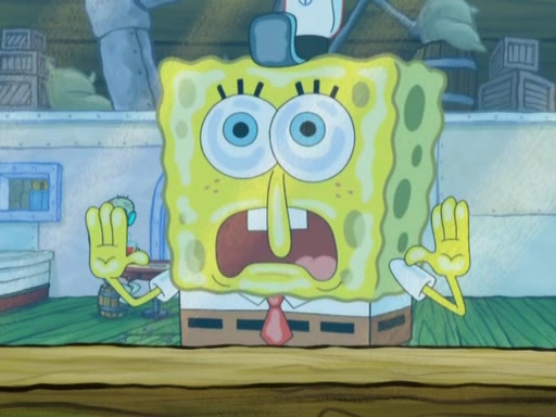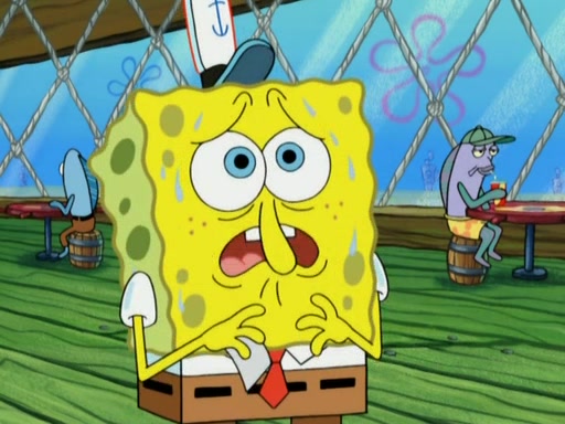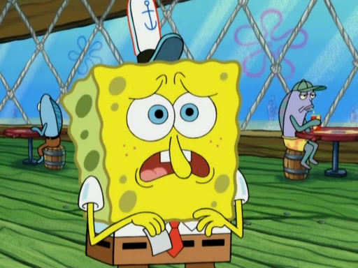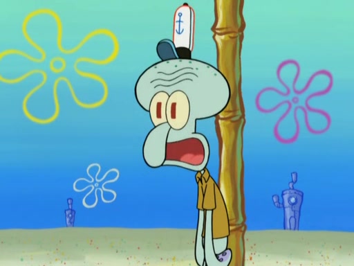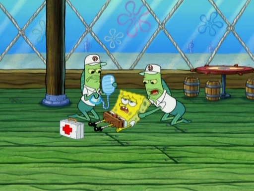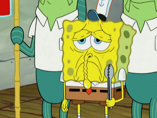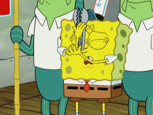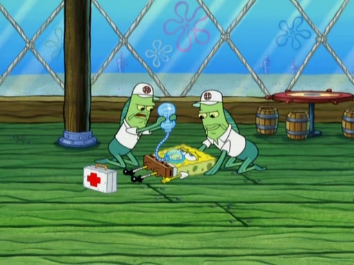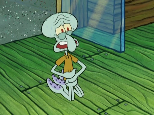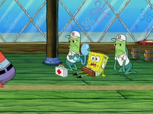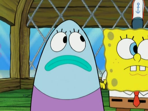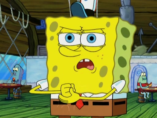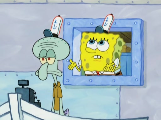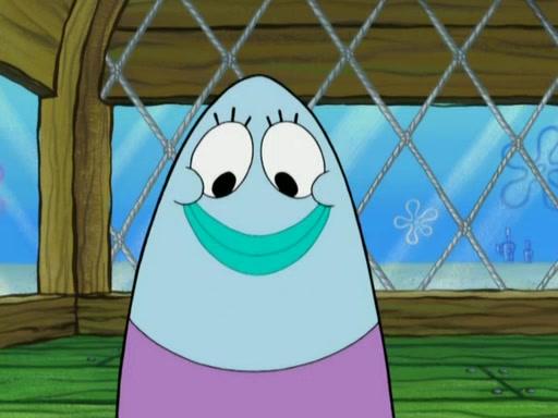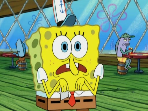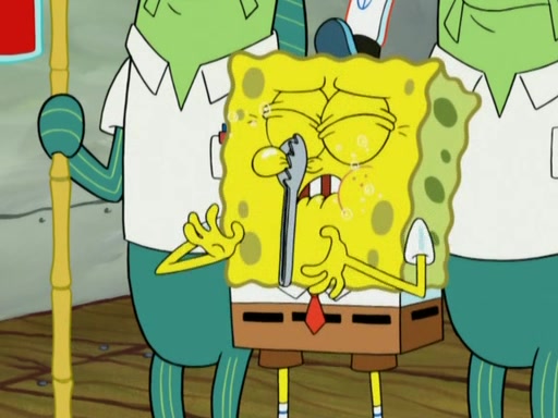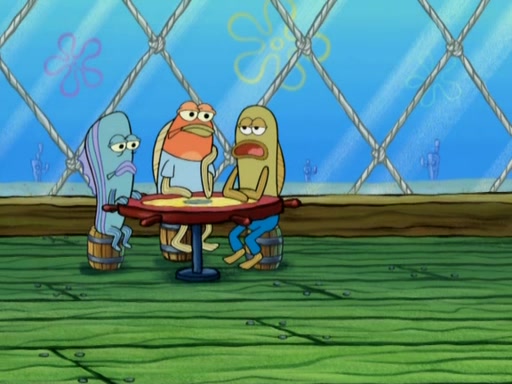 In a plan to put patties back, SpongeBob pasted out rumors and lies about what some of the real ingredients are. After little success and help from Squidward, he made people think that a Krusty Dog will explode which annoyed them by exploding a Krusty Dog with a pump in one customers face. When Krabby Patties regained popularity, Squidward is dressed in a costume again only to be kicked by Sadie, thinking that the patties are only as bad as the Krusty dogs.