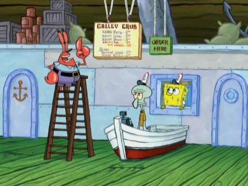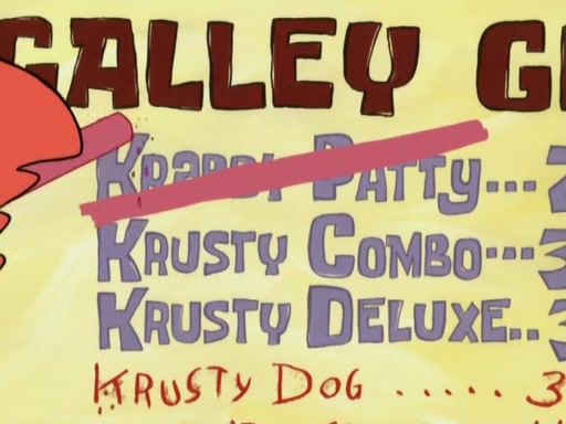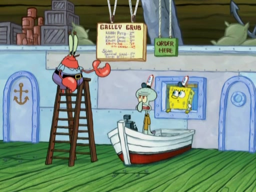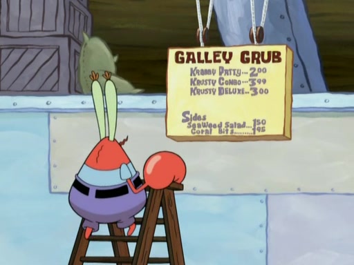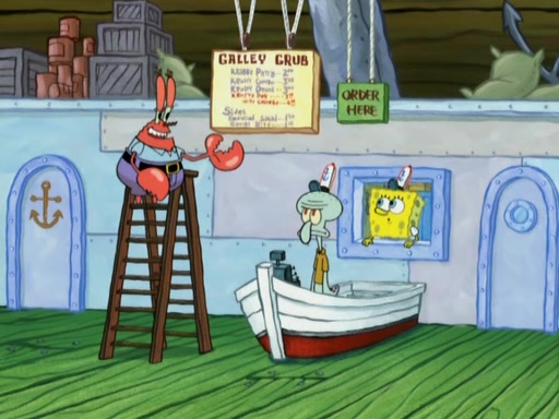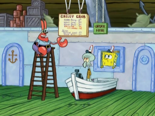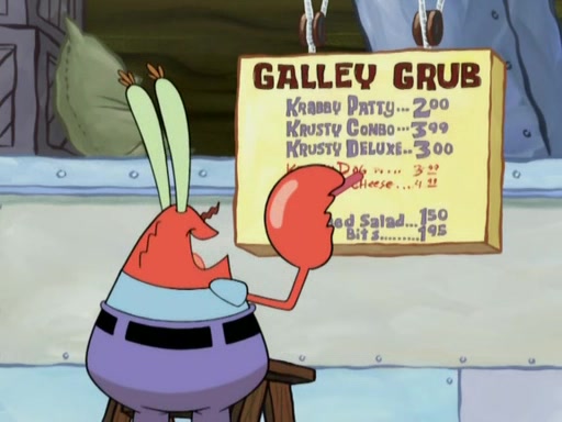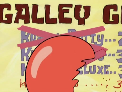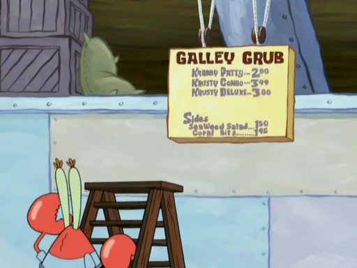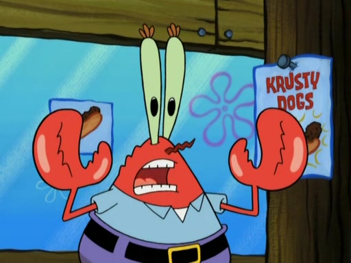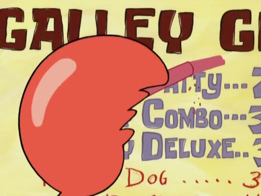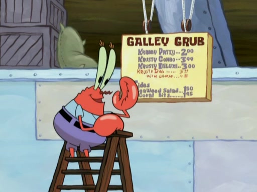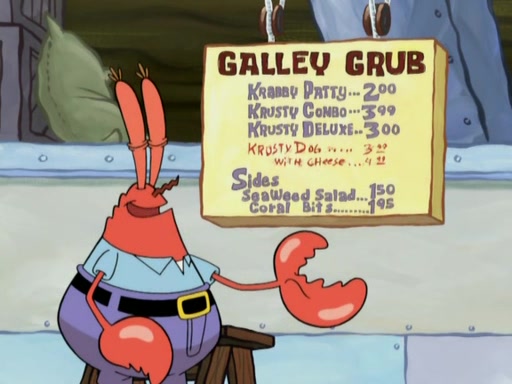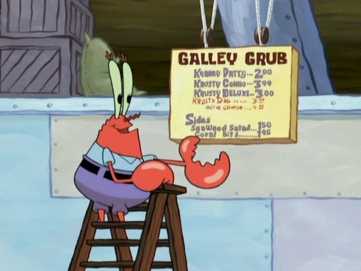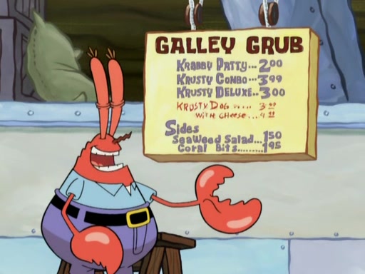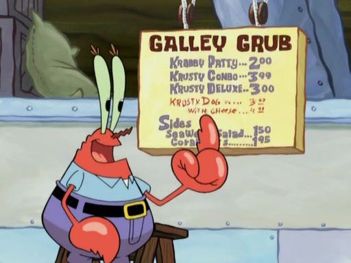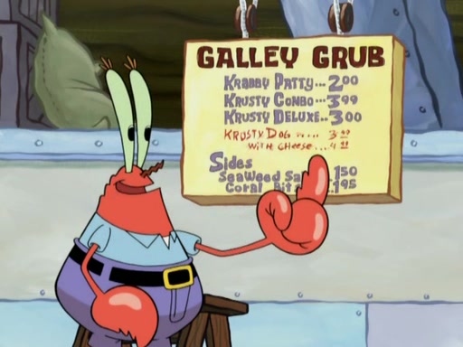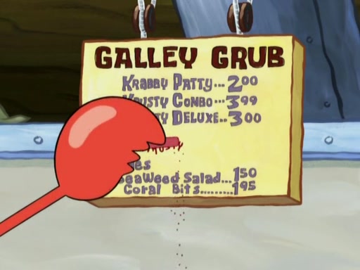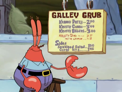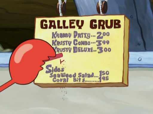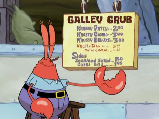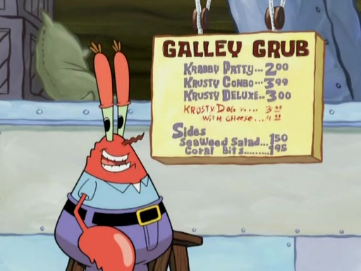 When a customer is curious about where the employees are, he looks into the kitchen to find the latest Krusty Krab product and is impressed. The happy customer convinced others to buy it. After serving several eager customers, Mr. Krabs posted the product with the name Krusty Dog on the Galley Grub for 3.99 or 4.99 with cheese. Gaining a higher popularity than Krabby Patties, Mr. Krabs ordered the patties off the menu since no one likes them anymore. He also throws out the grill and spatula which causes SpongeBob to suffer and go unconscious. The advertisement changed also as Squidward was dressed as a mascot, only to be kicked by Tyler, and posters were posted everywhere including changing the name of the restaurant.