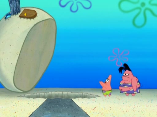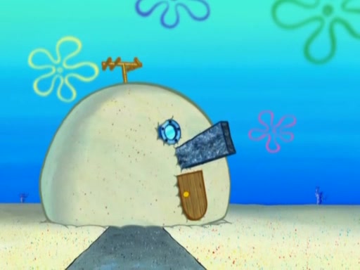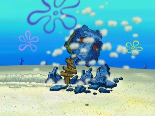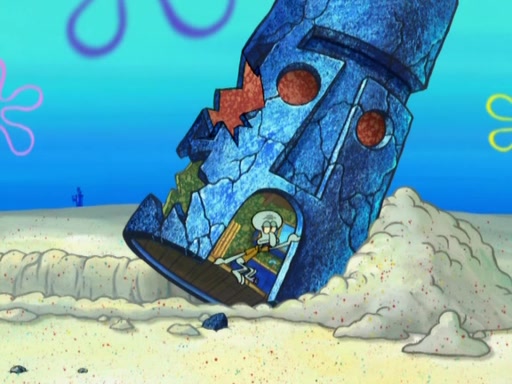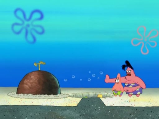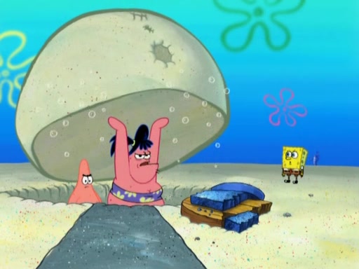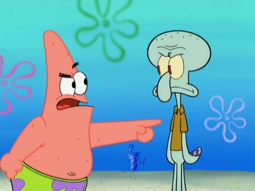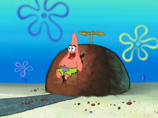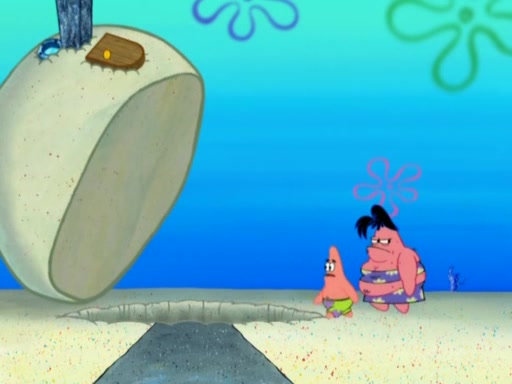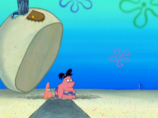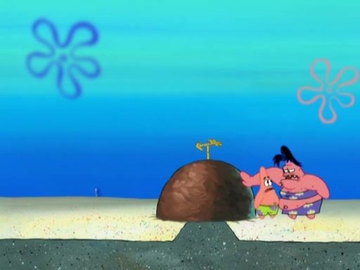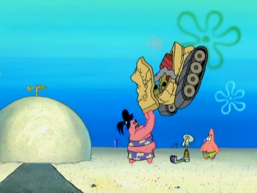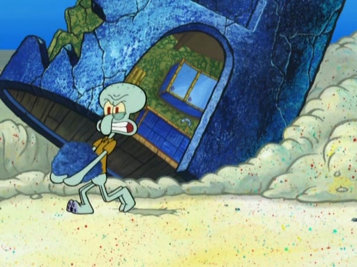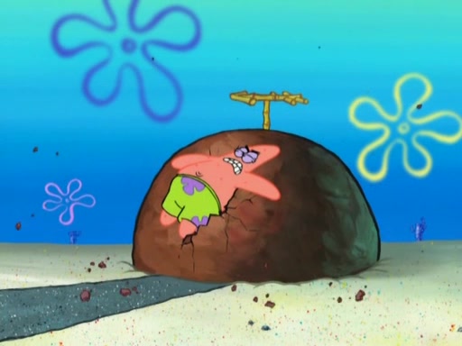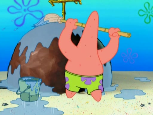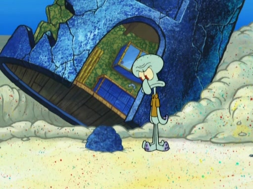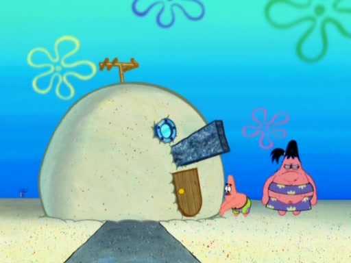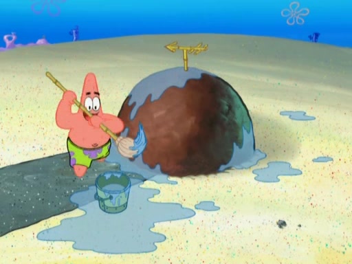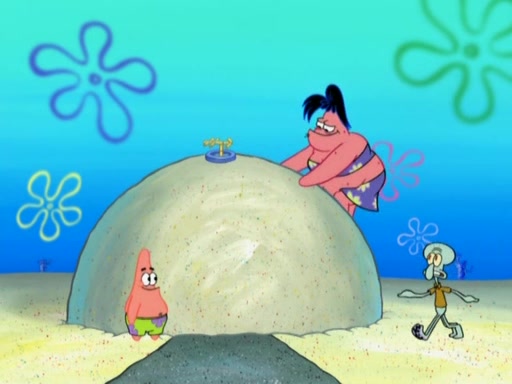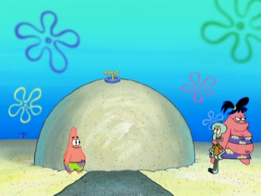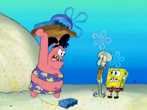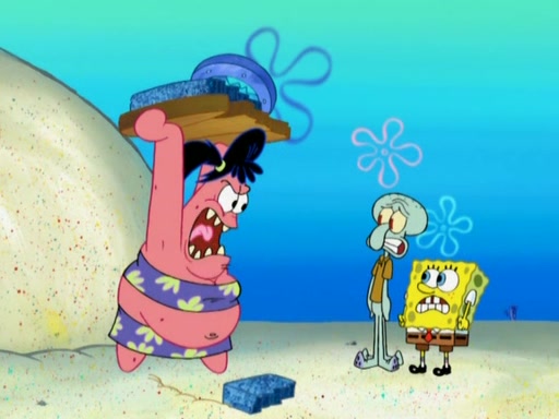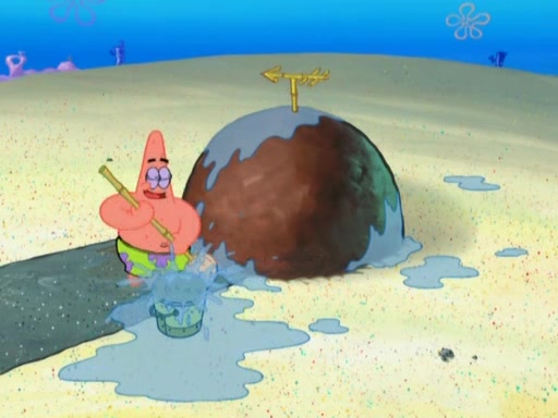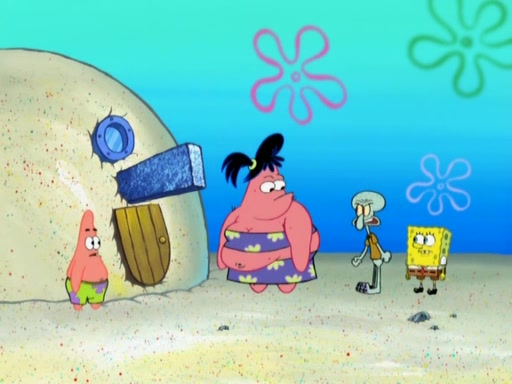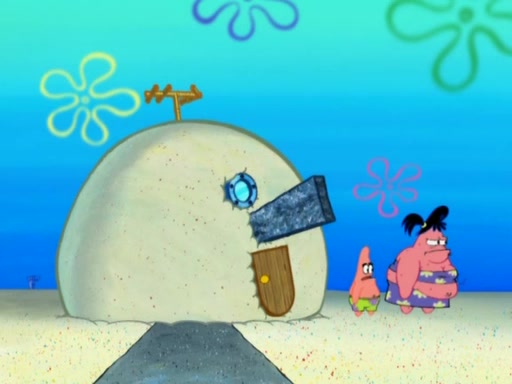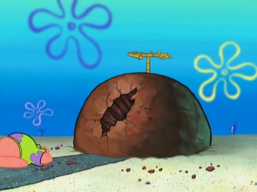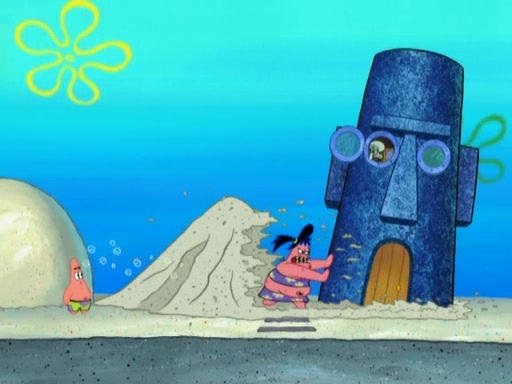 After that, Patrick becomes overprotective of Sam by saying that SpongeBob and Squidward are "meanies" and saying that they should blecorate (decorate) the rock. However, she uses parts of Squidward's house to decorate it. Then Squidward gets angry and calls her a thief. Then SpongeBob tries to talk some sense into Patrick, but Patrick does not care that Sam deliberately dismantled Squidward's house. Then he starts crying, thinking SpongeBob has become a traitor, and gets head-butted by Sam. Squidward gets angry and attempts to throw a rock at the house. In response, Sam and Patrick come out of the house and Sam chews up the loose parts and spits them at Squidward's house, destroying it.