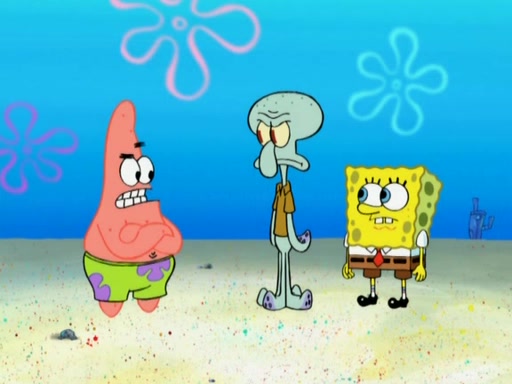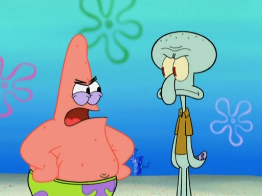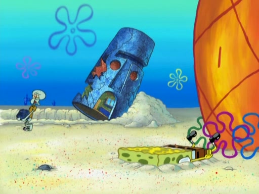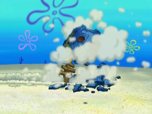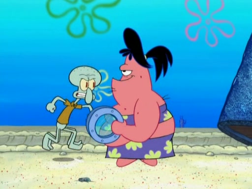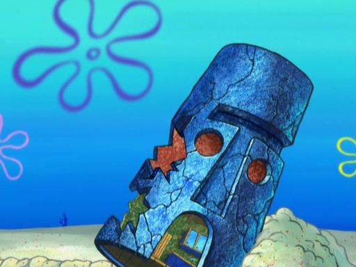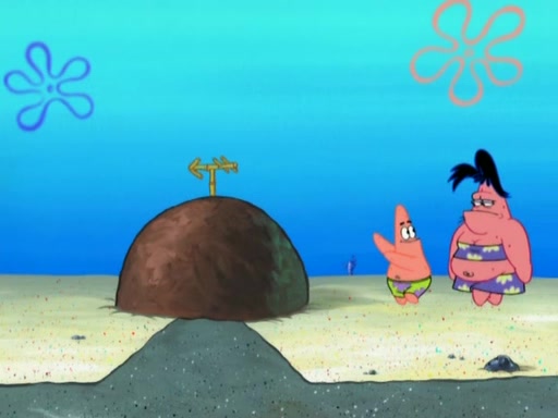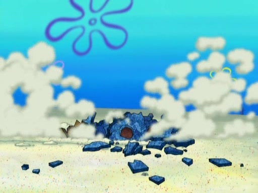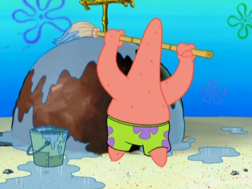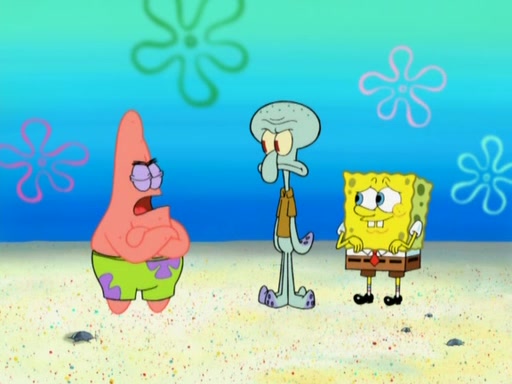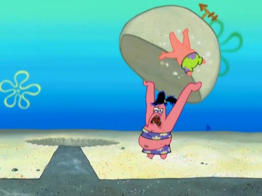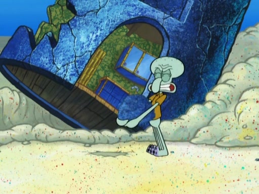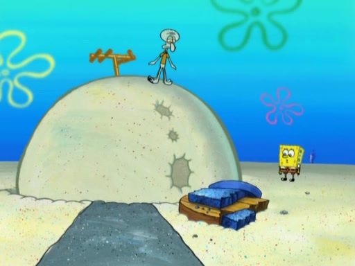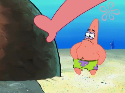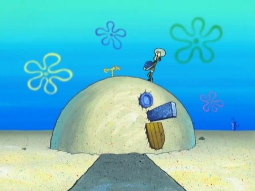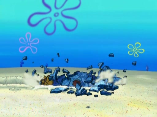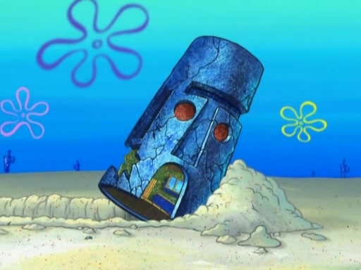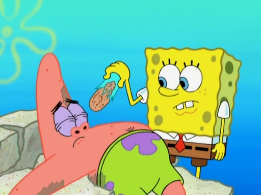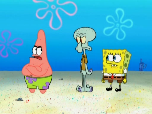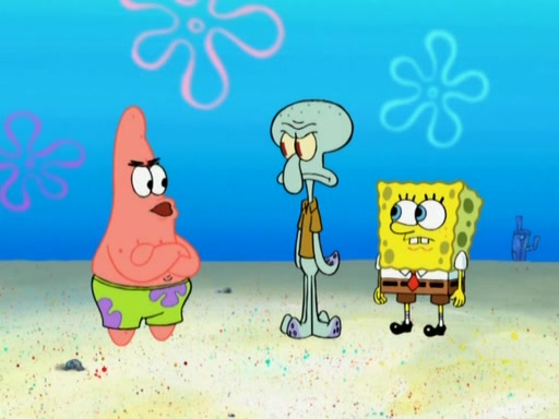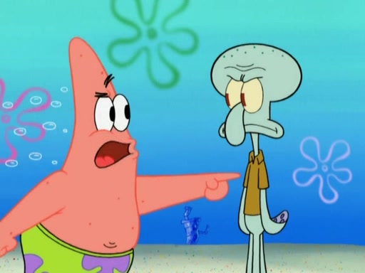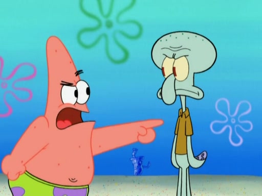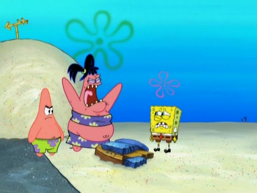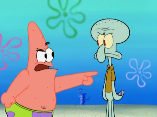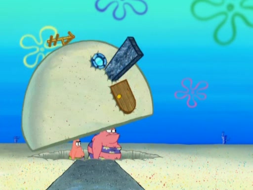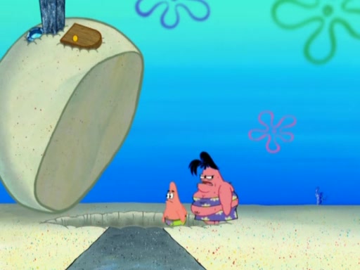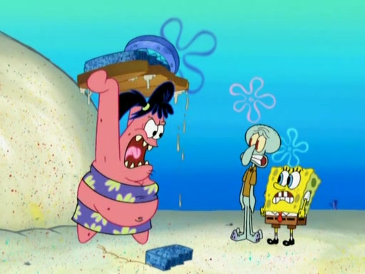 After that, Patrick becomes overprotective of Sam by saying that SpongeBob and Squidward are "meanies" and saying that they should blecorate (decorate) the rock. However, she uses parts of Squidward's house to decorate it. Then Squidward gets angry and calls her a thief. Then SpongeBob tries to talk some sense into Patrick, but Patrick does not care that Sam deliberately dismantled Squidward's house. Then he starts crying, thinking SpongeBob has become a traitor, and gets head-butted by Sam. Squidward gets angry and attempts to throw a rock at the house. In response, Sam and Patrick come out of the house and Sam chews up the loose parts and spits them at Squidward's house, destroying it.