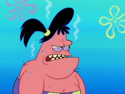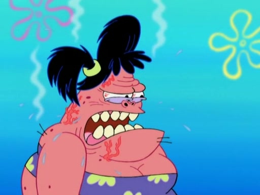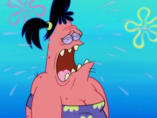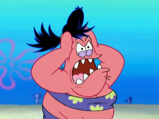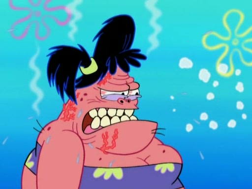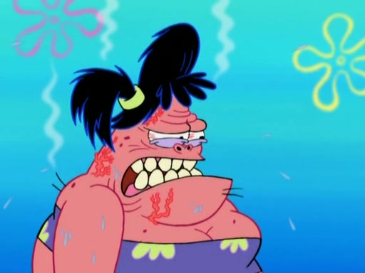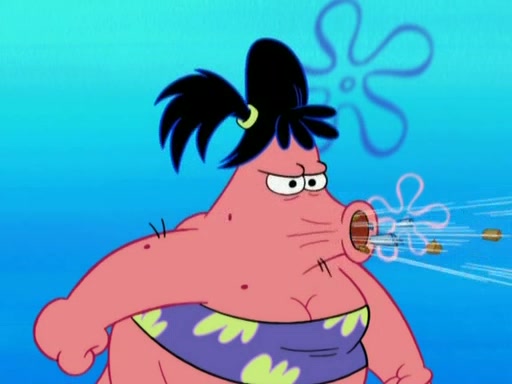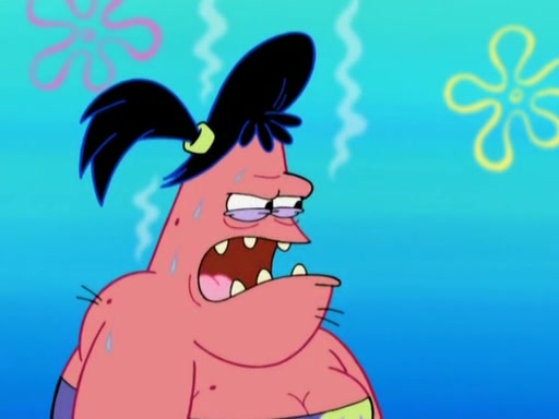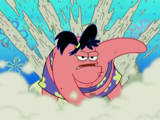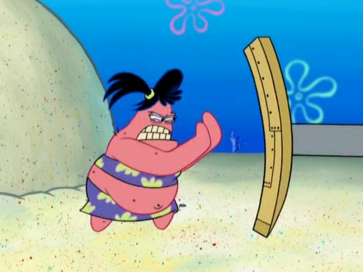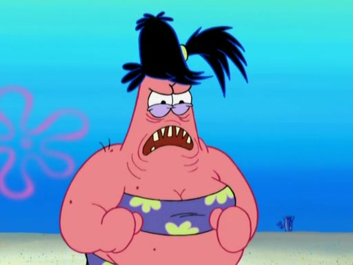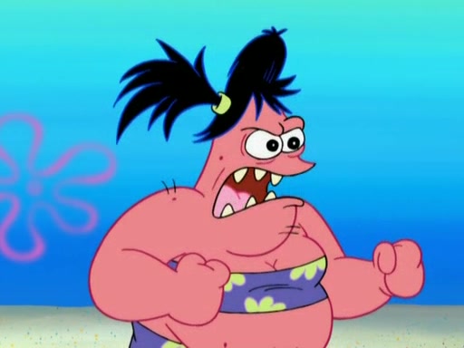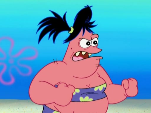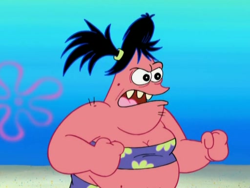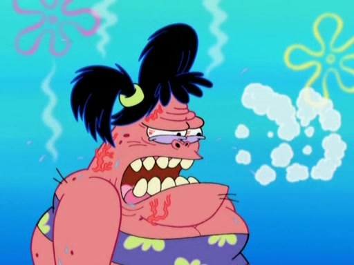 Squidward then drives a bulldozer at Patrick, Sam, and the house, making Patrick and Sam realize that Squidward is literally going to kill them. SpongeBob tries to stop him but to no avail. Sam, who throws the bulldozer at SpongeBob's house, stops Squidward. After that, SpongeBob finally becomes upset at the destruction of his house, making Patrick finally see what SpongeBob means. Patrick tries to tell her to control her temper, but she gets very angry and destroys her own home while Patrick sacrifices himself to save the house. Patrick lays there unconscious but SpongeBob successfully wakes him up by using cookie dough. Sam feels very guilty and explains that she must leave (She is late for a manicure and shows them her nails). As Sam leaves on the bus, SpongeBob and Patrick laugh about their experience with Patrick's sister.