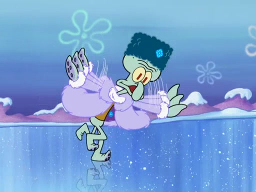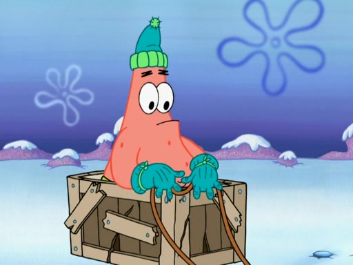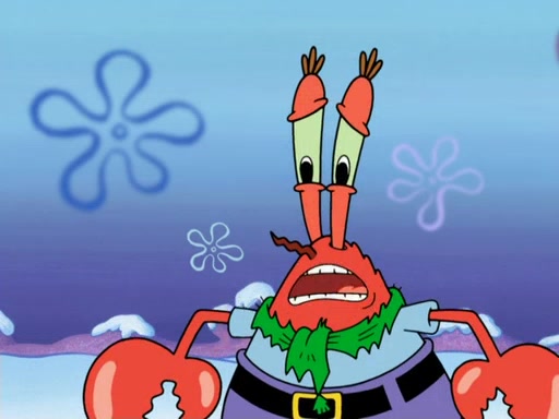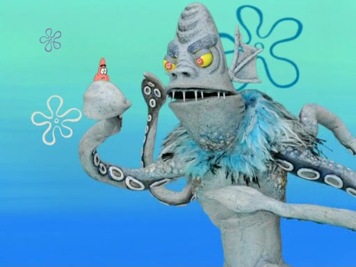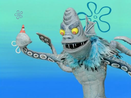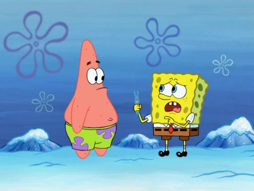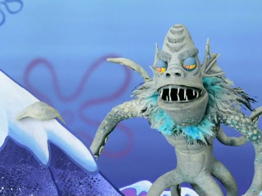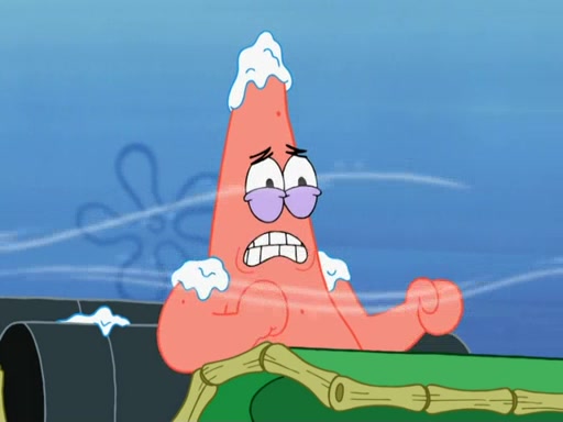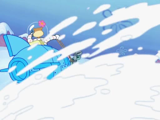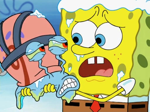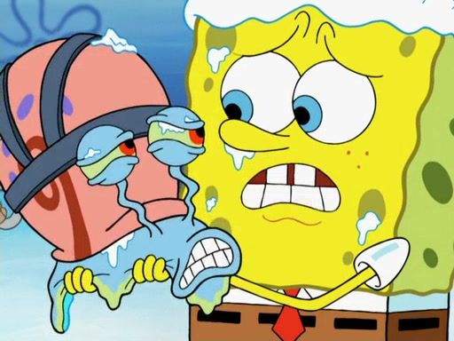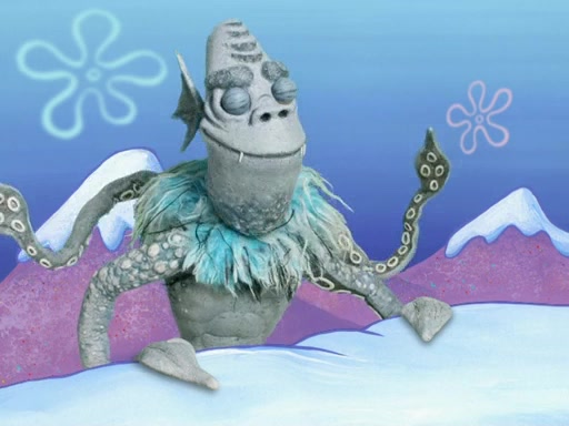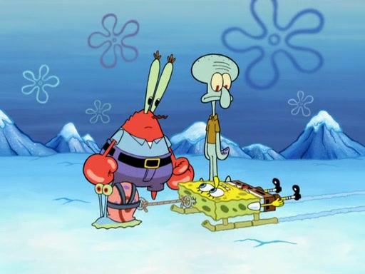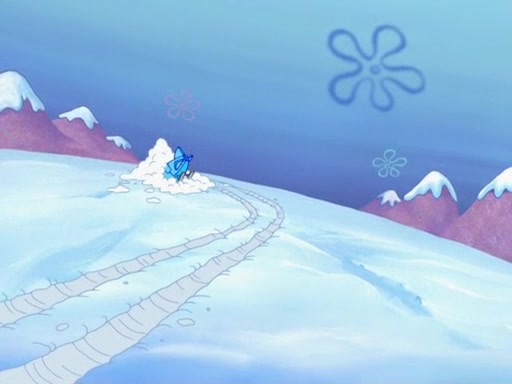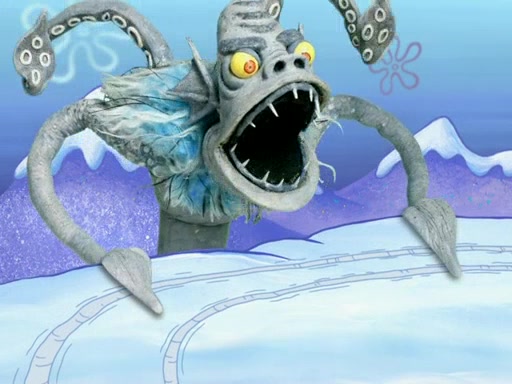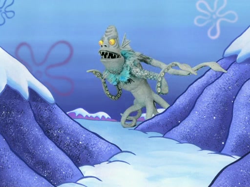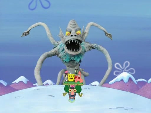 The gang decides to stop there and make a fire. Squidward thaws, just before encountering The Abominable Snow Mollusk who tries to attack the group. Squidward runs away and jumps into a cold body of water which freezes him again. The group (minus Squidward) continue the race and realize that they forgot Squidward soon after. They go after him and save him from the Snow Mollusk with the help of Patrick's last gummy worm. They continue on and Sandy realizes that Mr. Krabs has betrayed the group and gone off on his own so that he could win the prize himself, but got stung by a jellyfish that went into his mouth in the process.