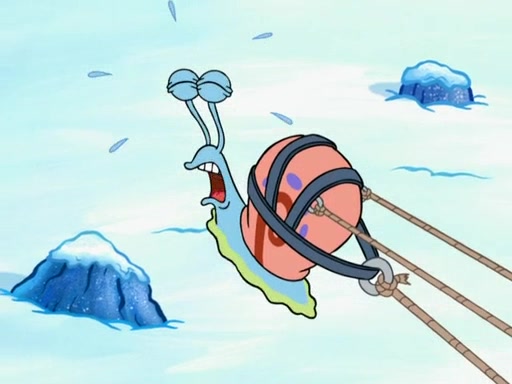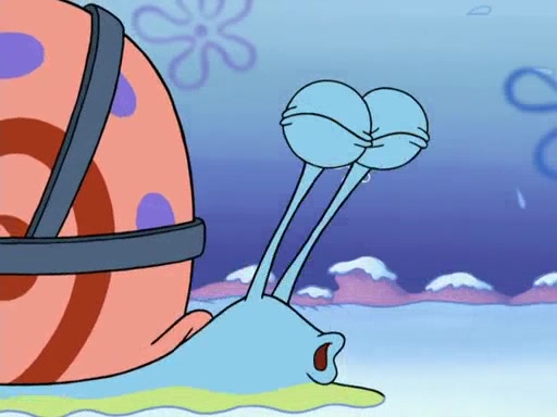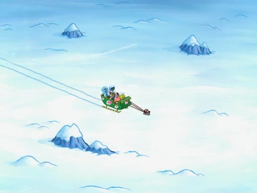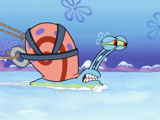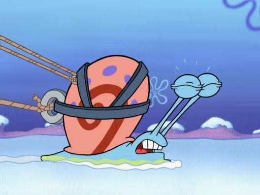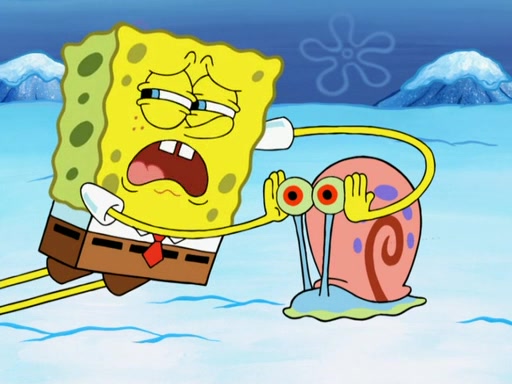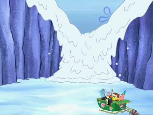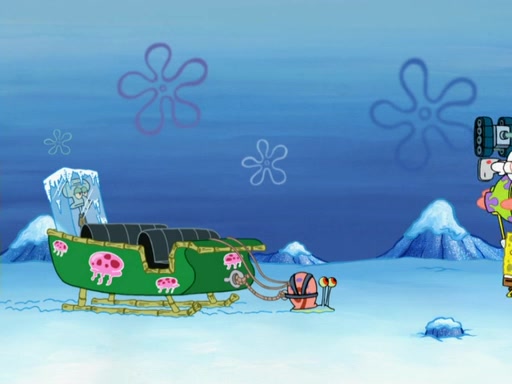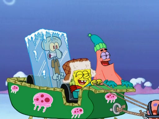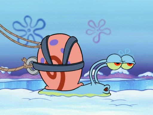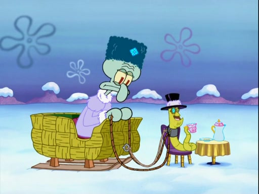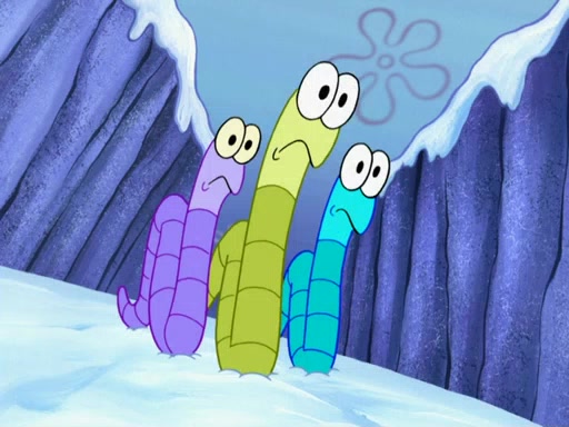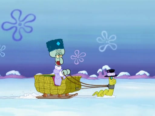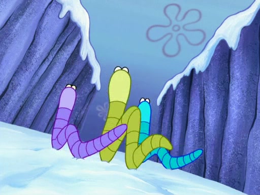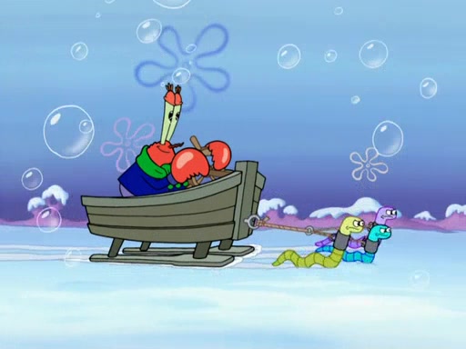 Back in the race, Sandy's sled crashes and Squidward's worm stops racing. Squidward gets angry and goes on foot, only to fall through the ice and freeze. He is soon discovered by SpongeBob and Patrick, who take him along with them. Shortly after, they find Sandy in a pile of snow and they bring her along too. Mr. Krabs' worms become hungry, and they get mad and chase Mr. Krabs. SpongeBob lets Mr. Krabs come along as well. The worms chase SpongeBob and the gang, and Gary has trouble pulling all of them. They are cornered at a dead end and Gary roars like a lion to scare the worms away.