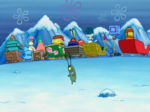 Back at the Krusty Krab, the real Plankton fails to break open the Secret Formula safe yet again. Frustrated, Plankton proceeds to rip an "atom" in half which causes a nuclear explosion, destroying the Krusty Krab and opening the safe. Meanwhile, SpongeBob pulls the sled until they find a frozen Mr, Krabs. All of them, except Sandy, freeze. Sandy saves their lives by starting a fire with parts from the sled. Sandy figures out how to use the members of the group as a substitute sled. They return to Bikini Bottom to see that the Krusty Krab has been destroyed and Plankton has stolen the formula. However, he cannot get the bottle open. The group finds Plankton trying to open it. An angered Karen zaps Plankton.