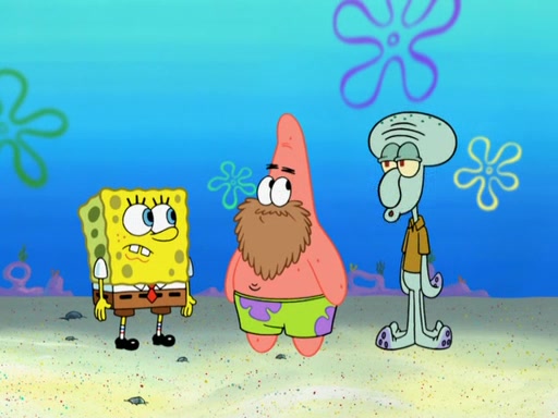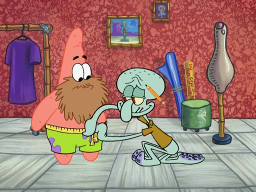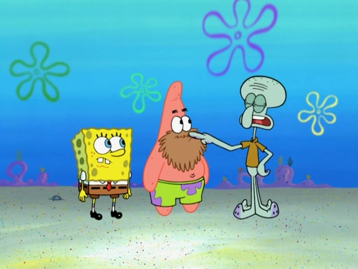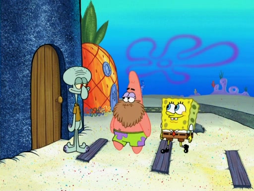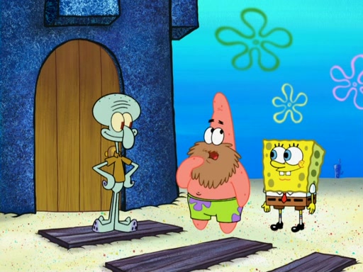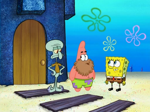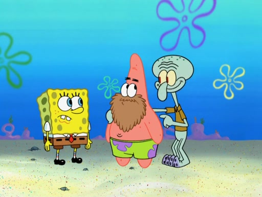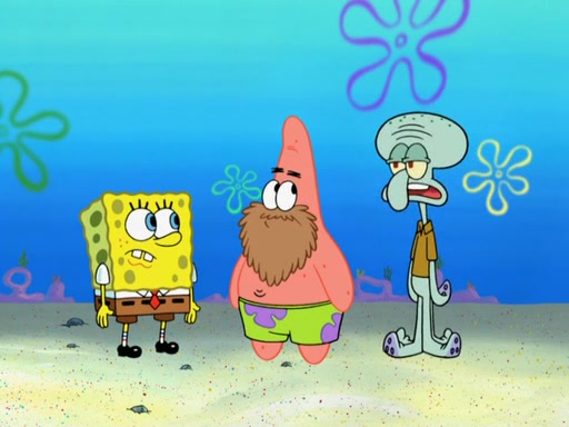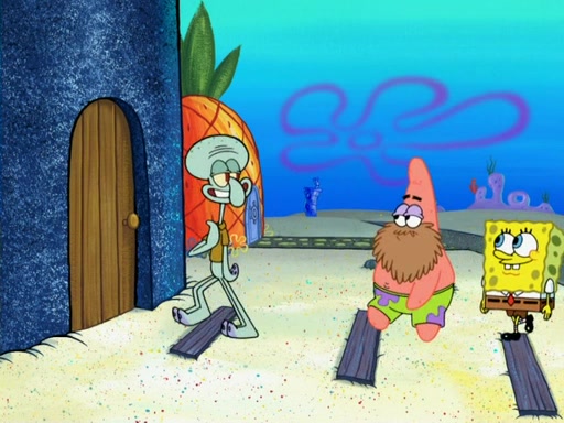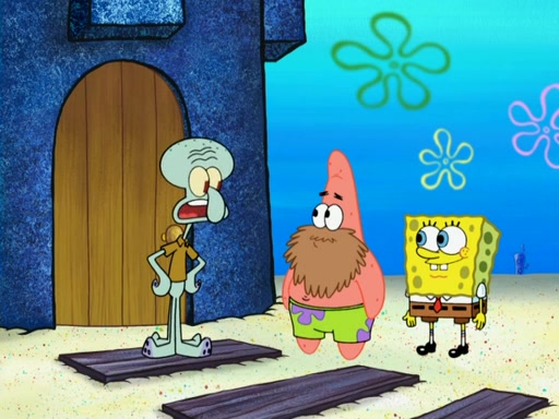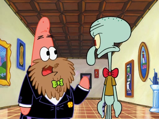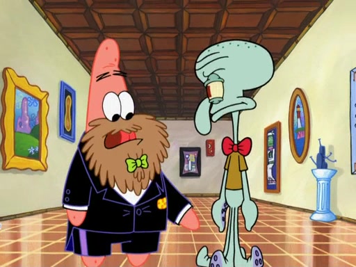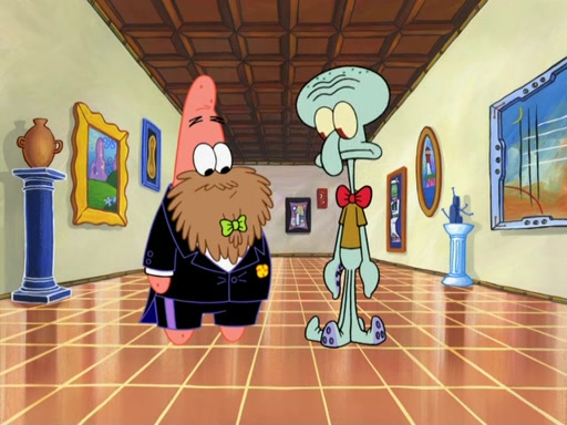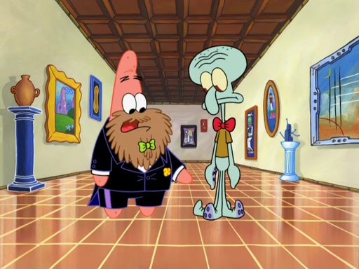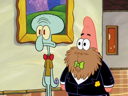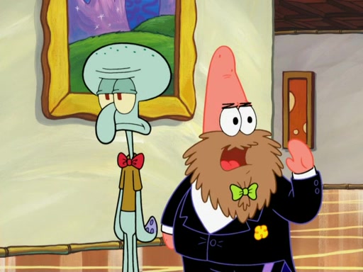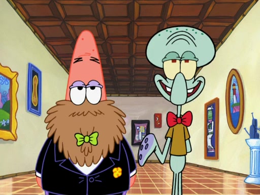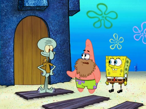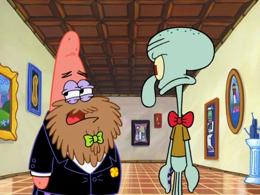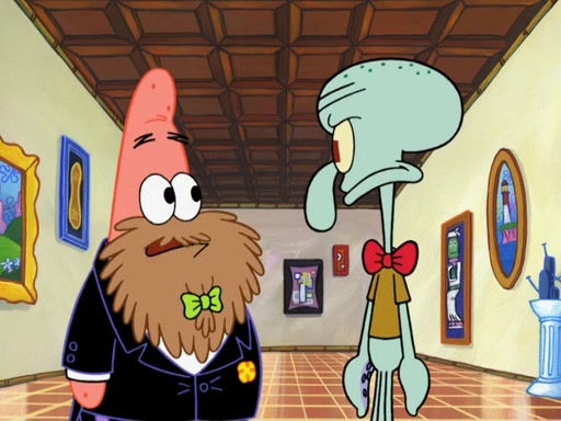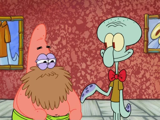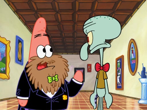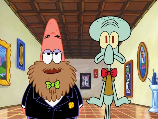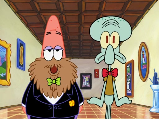Then, they go to the art place and SpongeBob follows them around and Patrick and Squidward tell the security to kick him out and he first put him out softly, but he doesn't leave so he ends up kicking him. SpongeBob sees Squidward and Patrick walking and Squidward mentions that the beard was the best thing that ever happened to Patrick other than himself. SpongeBob tries to remove his beard to restore his friendship. Squidward stops him and says that they are through with him.