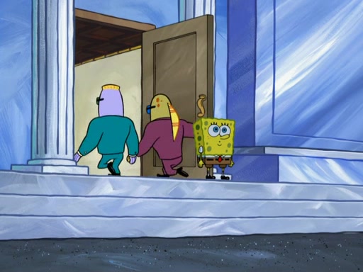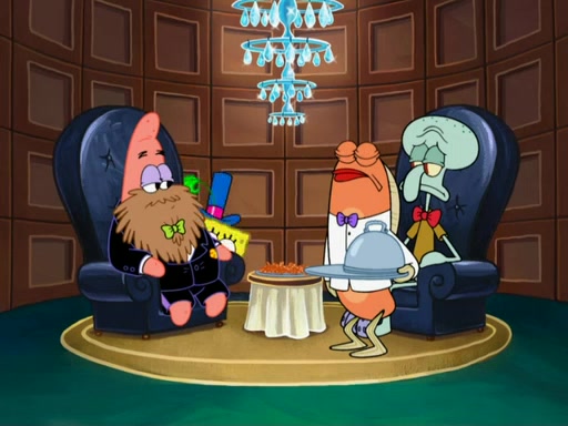 The three go into Squidward's house for a grown-up makeover. SpongeBob shows off his new look. Patrick likes his look until Squidward reminds him that he really shouldn't.