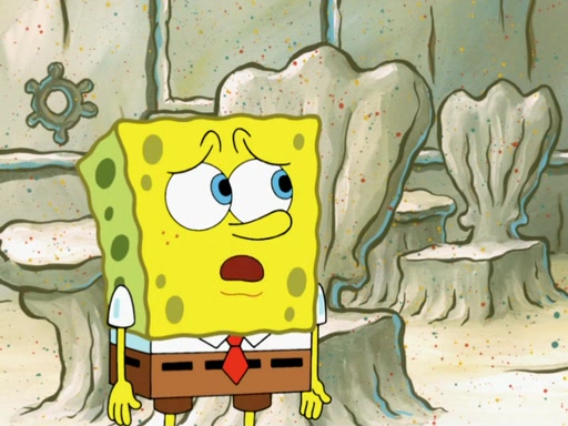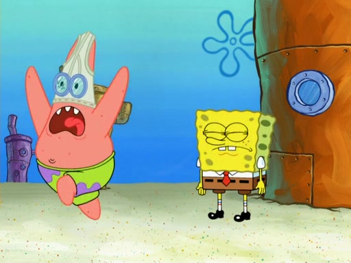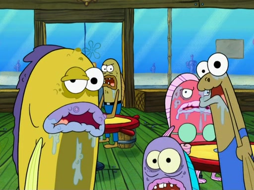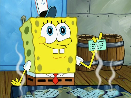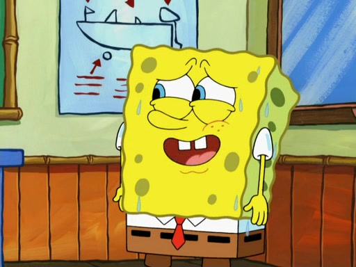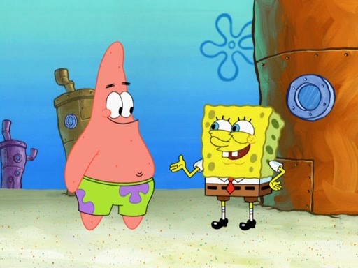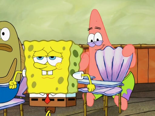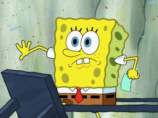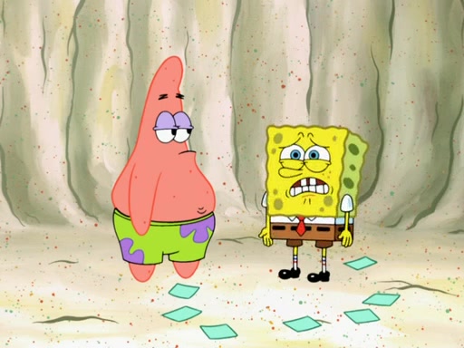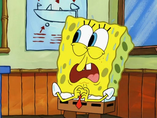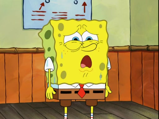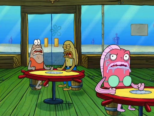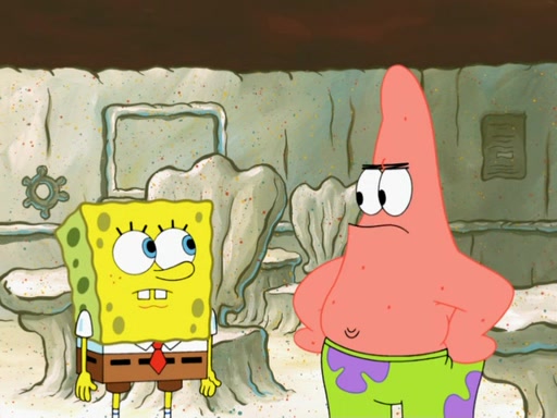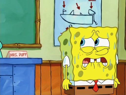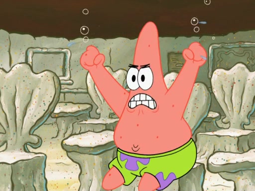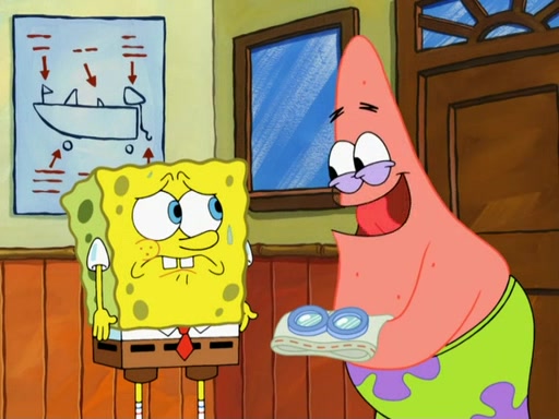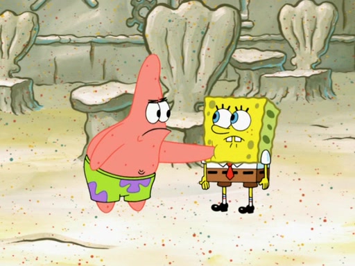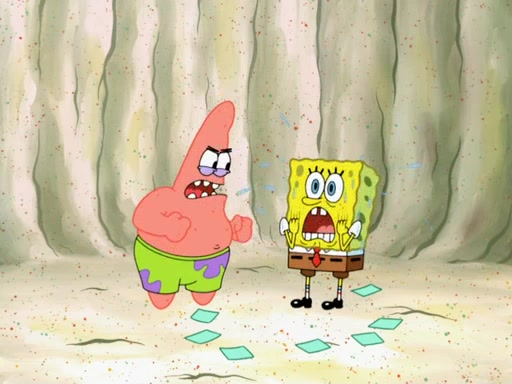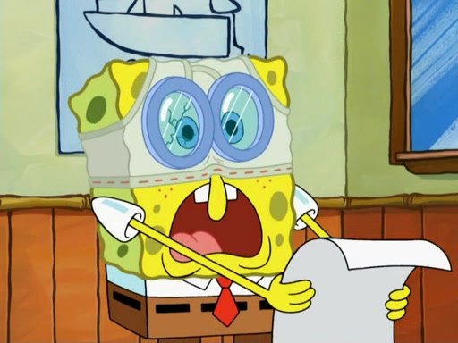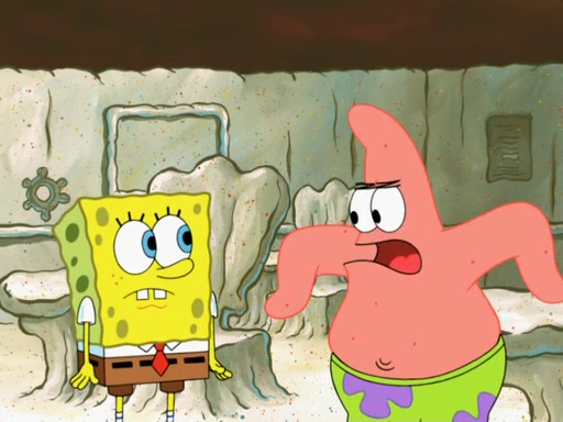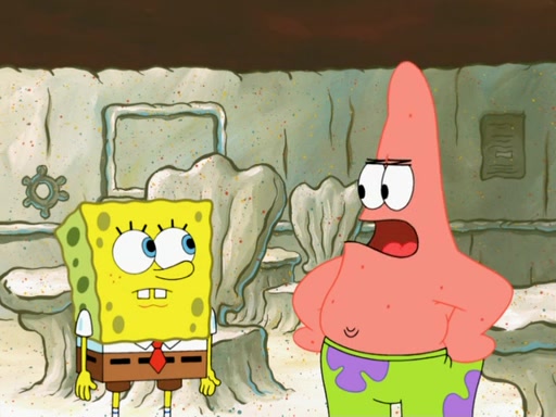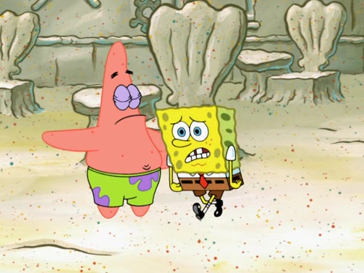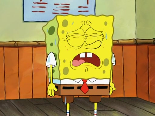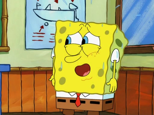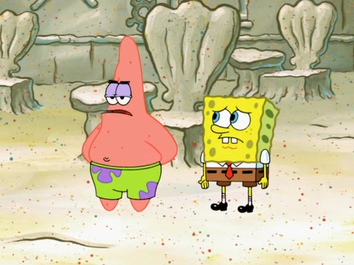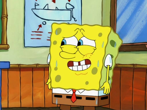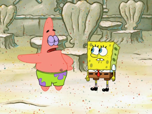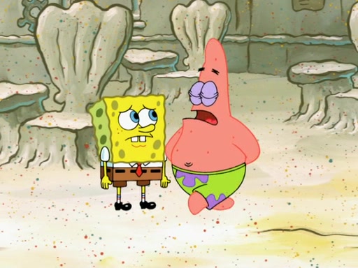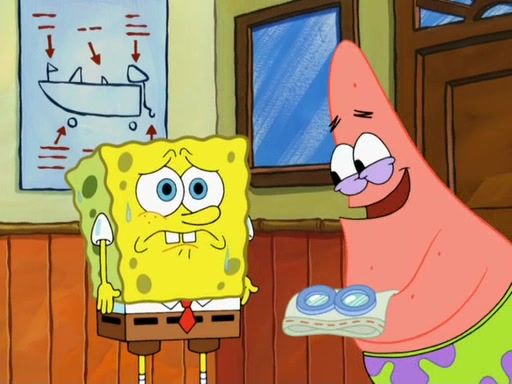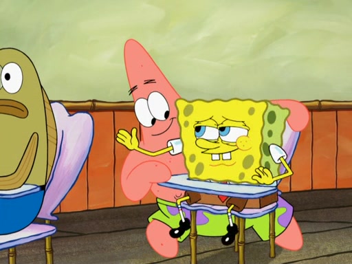 SpongeBob then realizes that he has stage fright. The customers start fighting for the single order as Squidward is beaten up after trying to give a customer his order, which makes SpongeBob even more frightened. It then cuts to Patrick's rock. Patrick opens it, only to realize he has the wrong rock, but SpongeBob pulls him in. SpongeBob asks Patrick to help him practice by listening to his speech. SpongeBob has to practice if he wants to pass then he has to give the report.