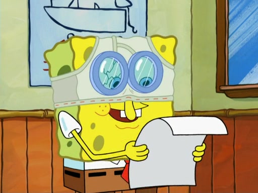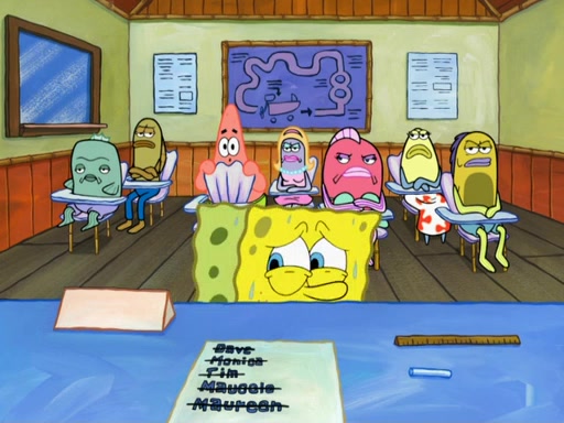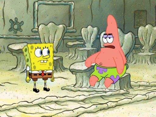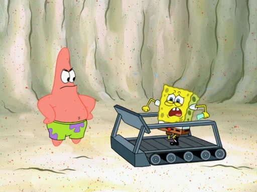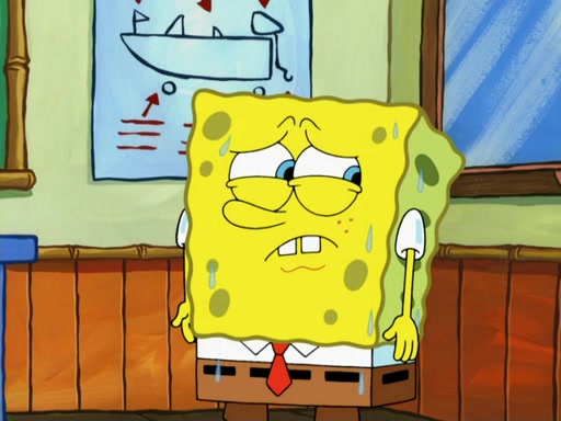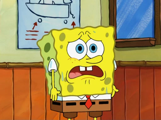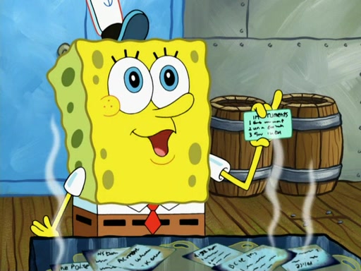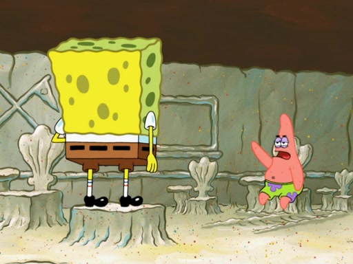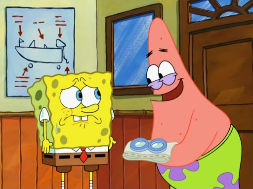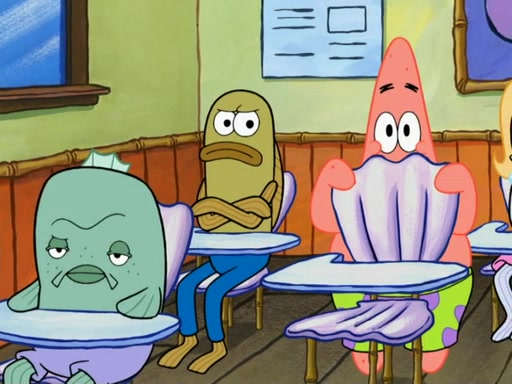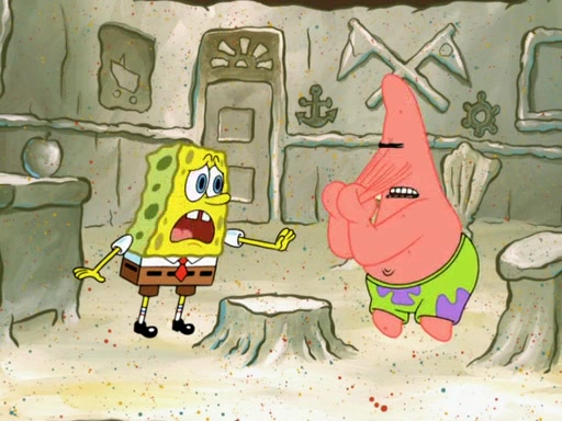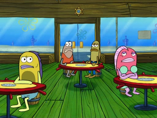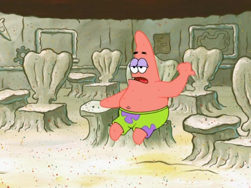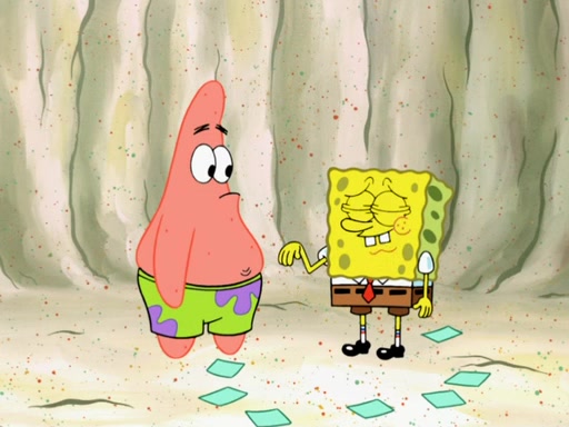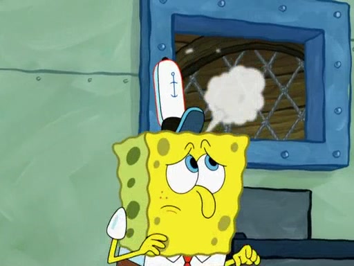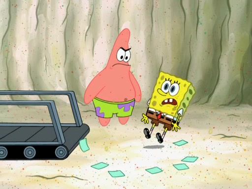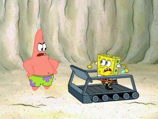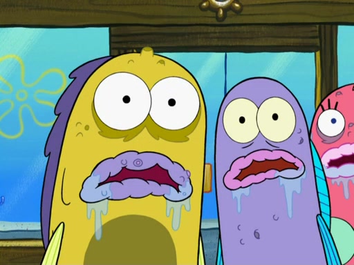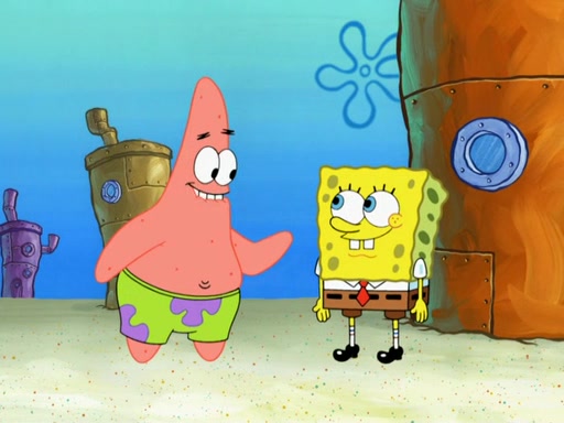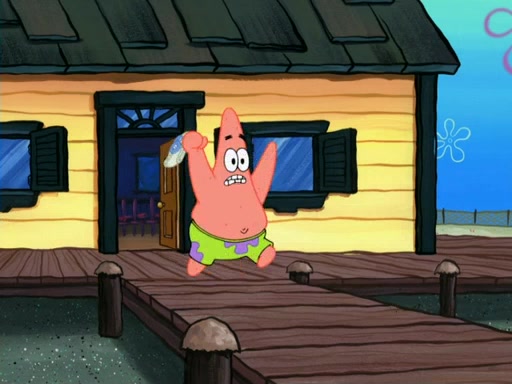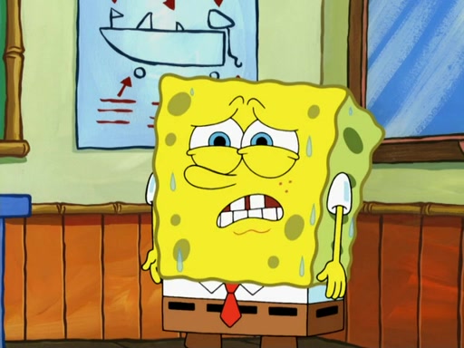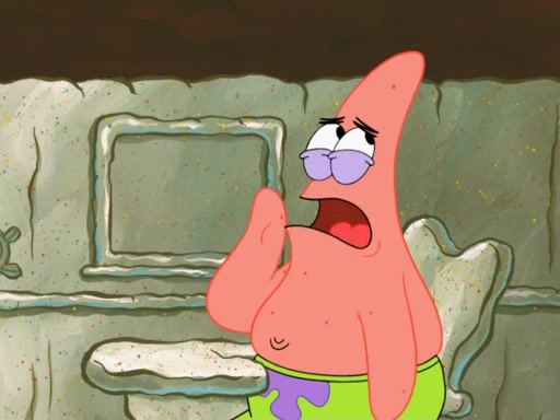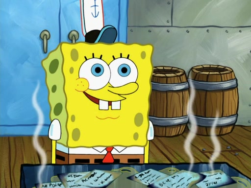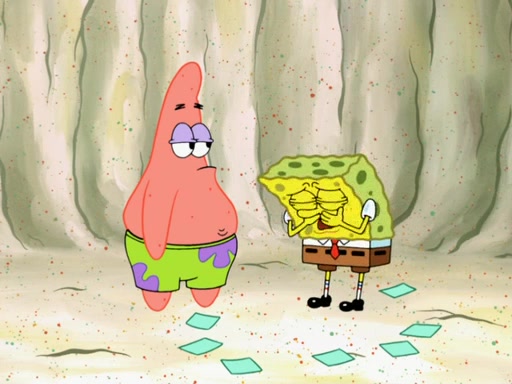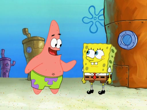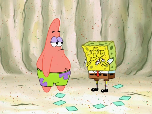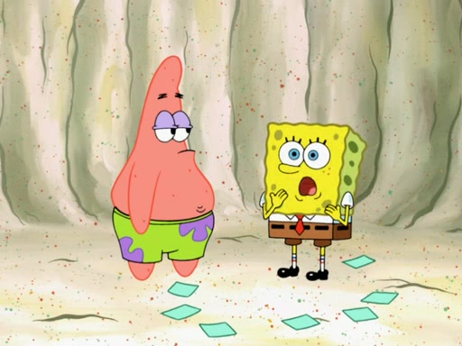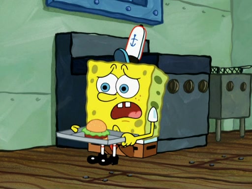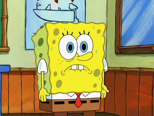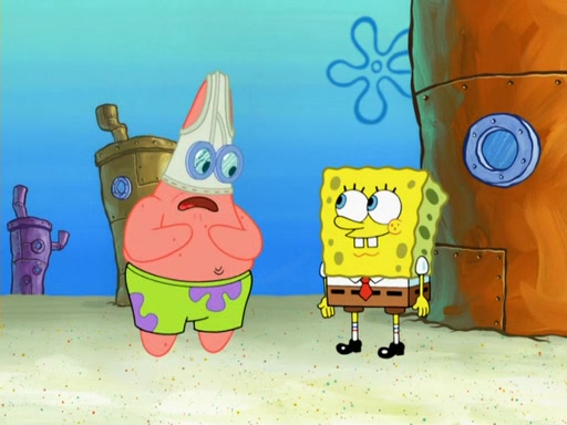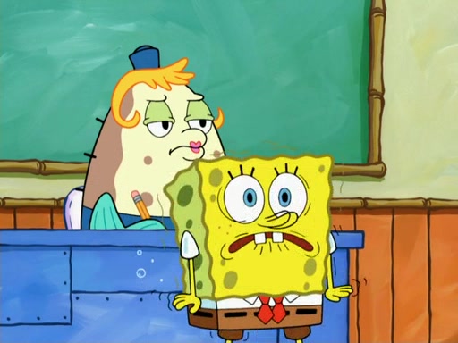 SpongeBob then realizes that he has stage fright. The customers start fighting for the single order as Squidward is beaten up after trying to give a customer his order, which makes SpongeBob even more frightened. It then cuts to Patrick's rock. Patrick opens it, only to realize he has the wrong rock, but SpongeBob pulls him in. SpongeBob asks Patrick to help him practice by listening to his speech. SpongeBob has to practice if he wants to pass then he has to give the report.