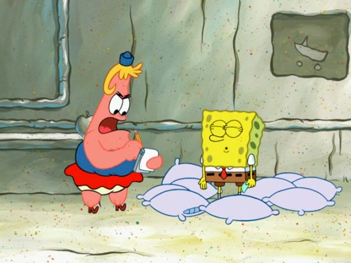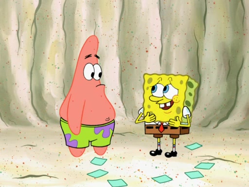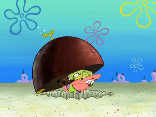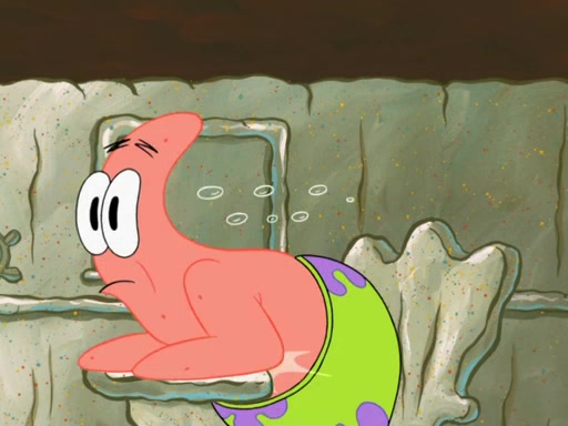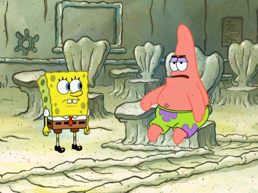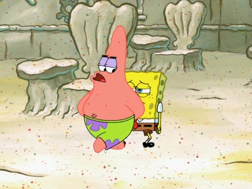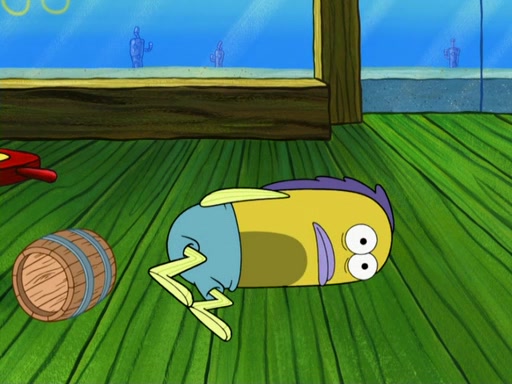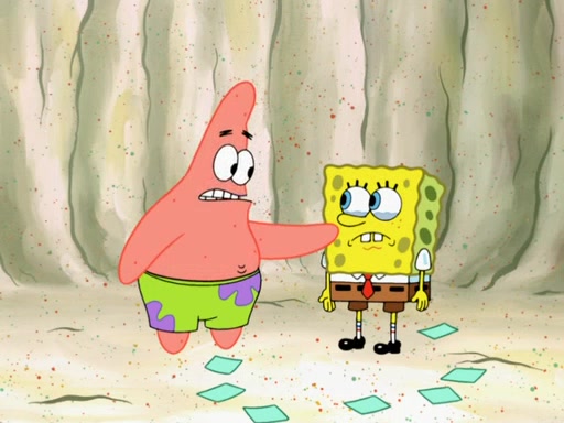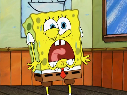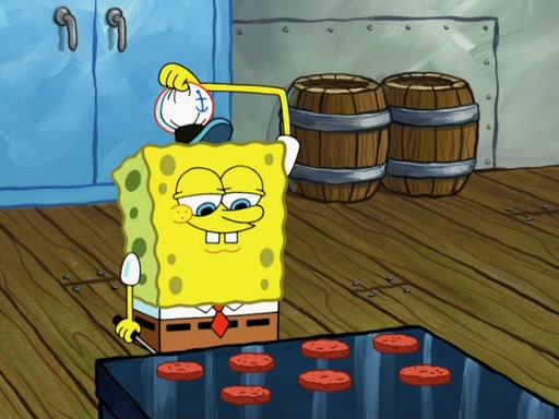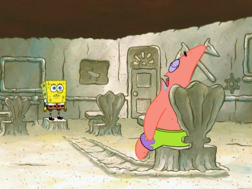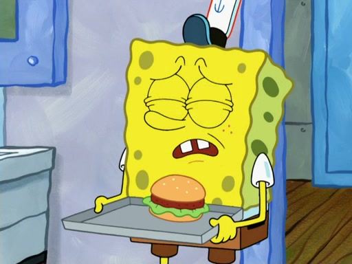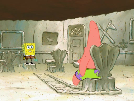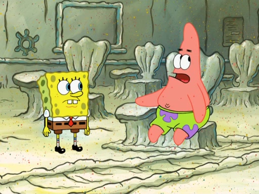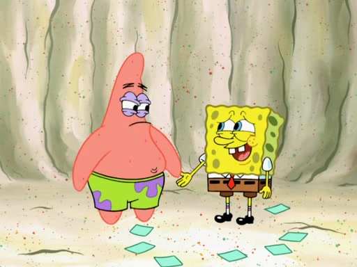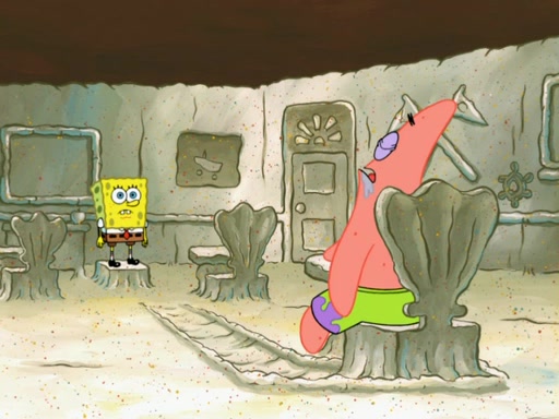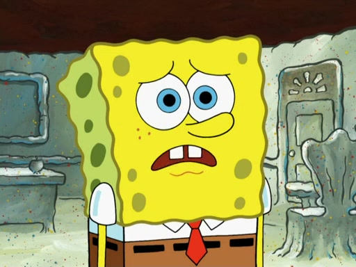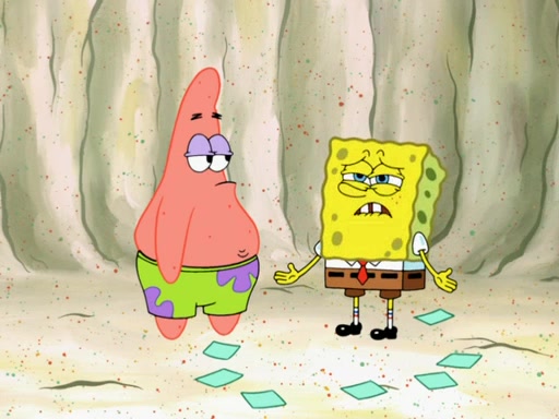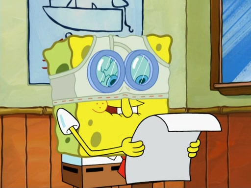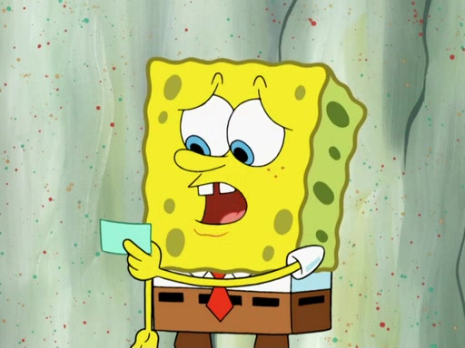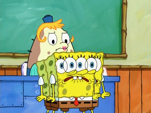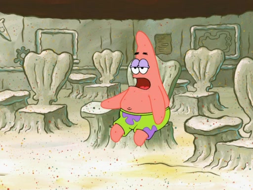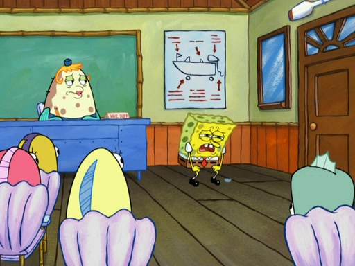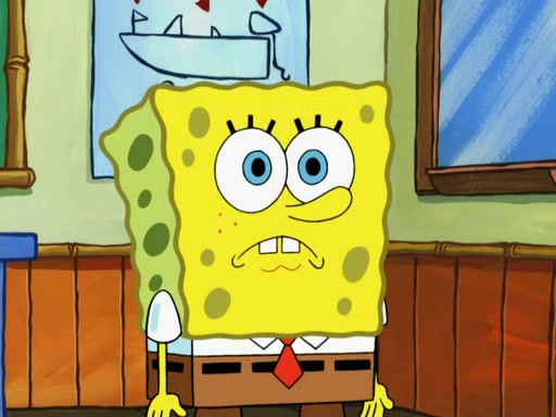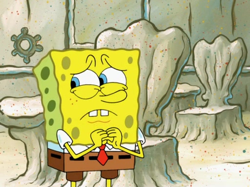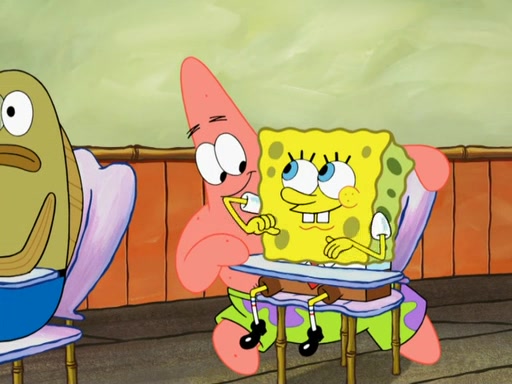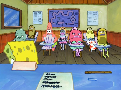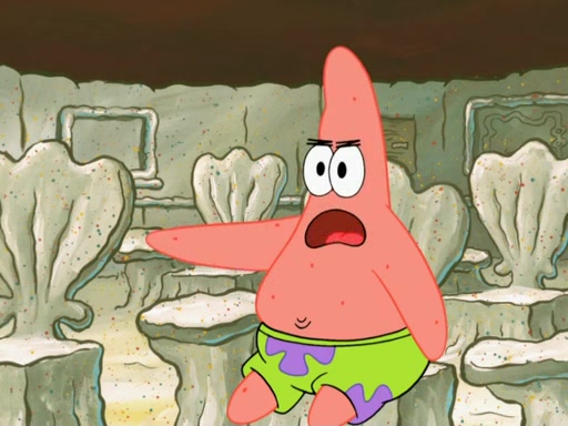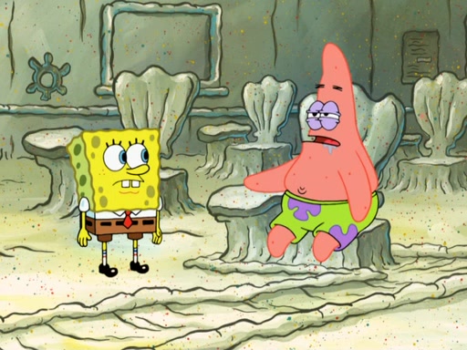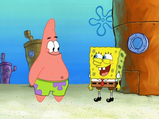 SpongeBob then realizes that he has stage fright. The customers start fighting for the single order as Squidward is beaten up after trying to give a customer his order, which makes SpongeBob even more frightened. It then cuts to Patrick's rock. Patrick opens it, only to realize he has the wrong rock, but SpongeBob pulls him in. SpongeBob asks Patrick to help him practice by listening to his speech. SpongeBob has to practice if he wants to pass then he has to give the report.