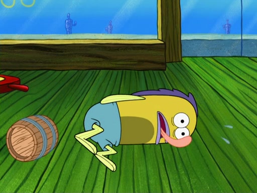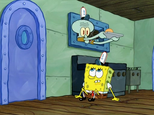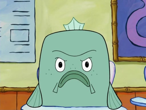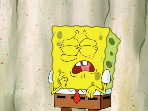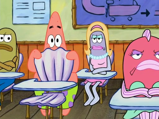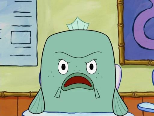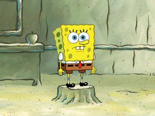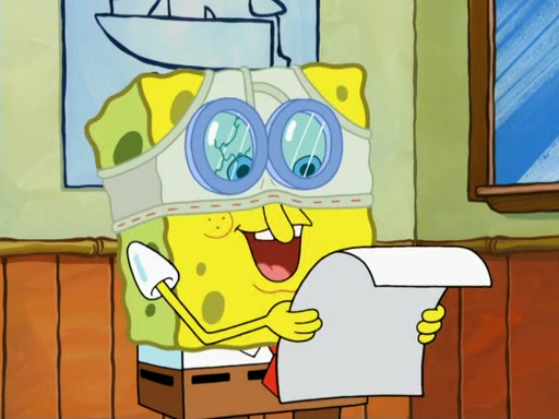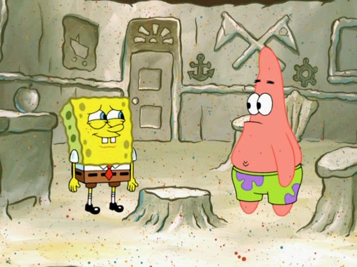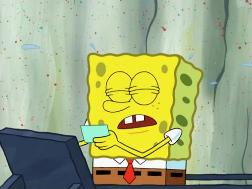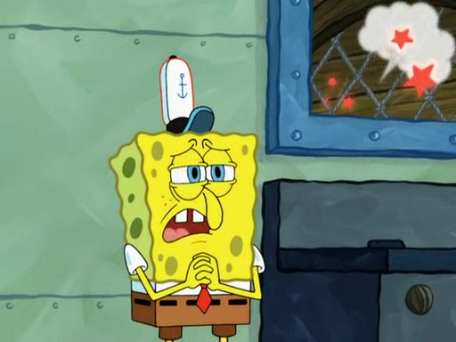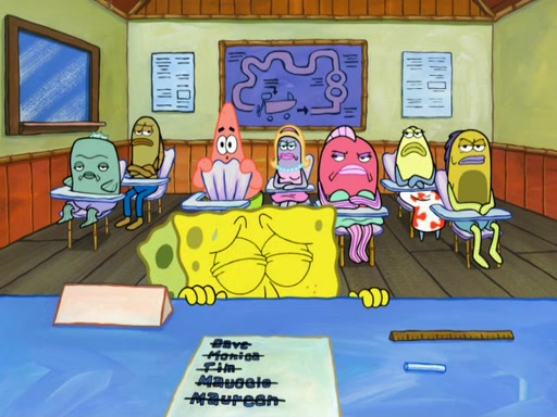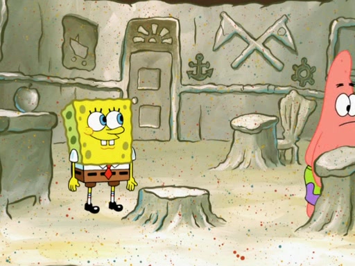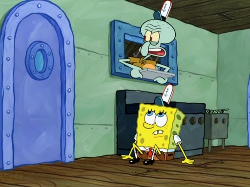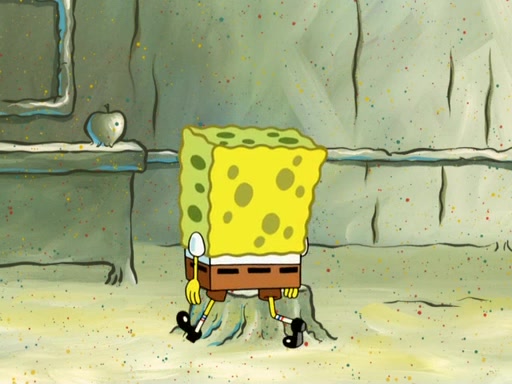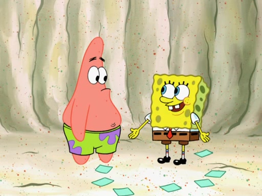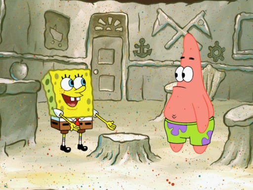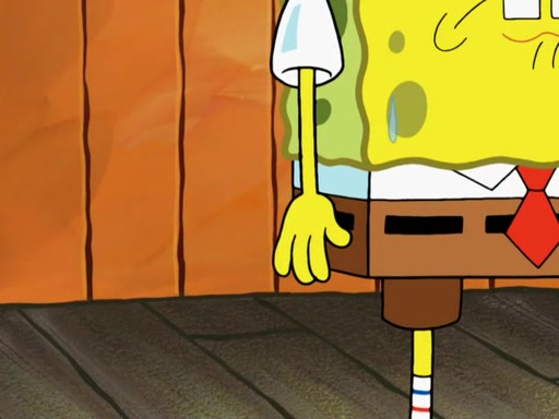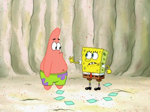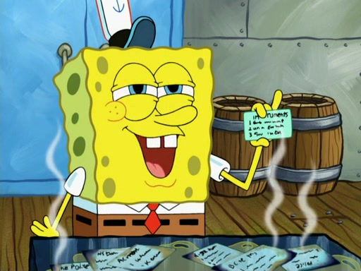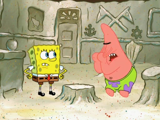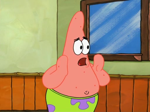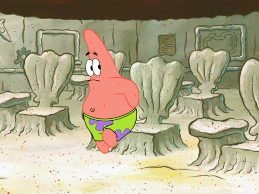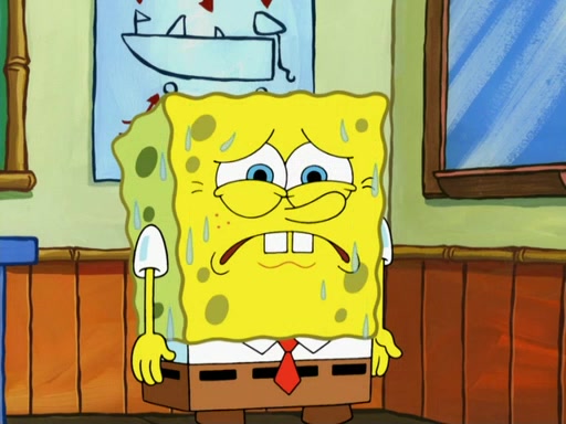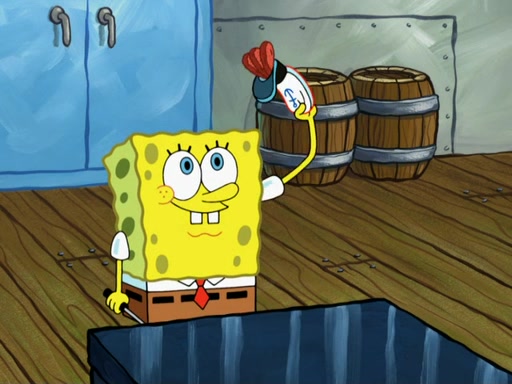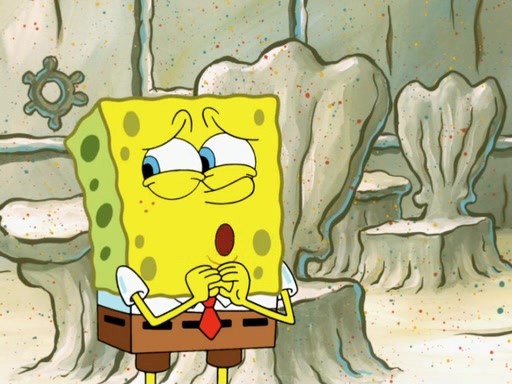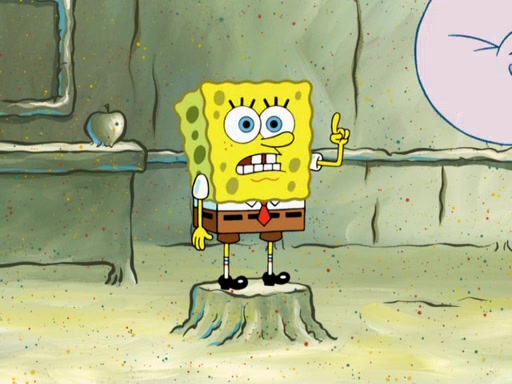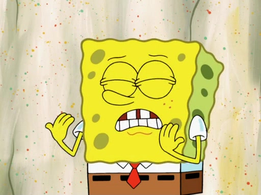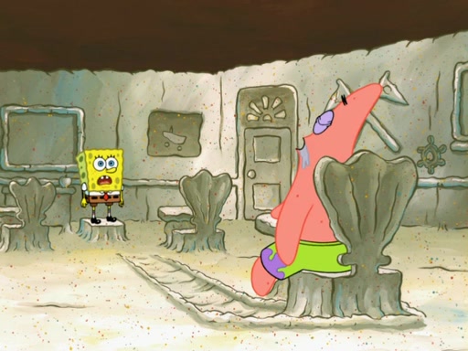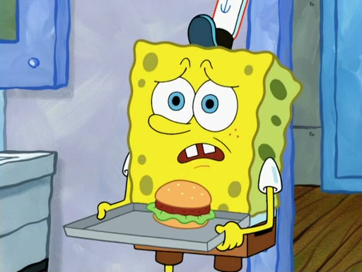 SpongeBob then realizes that he has stage fright. The customers start fighting for the single order as Squidward is beaten up after trying to give a customer his order, which makes SpongeBob even more frightened. It then cuts to Patrick's rock. Patrick opens it, only to realize he has the wrong rock, but SpongeBob pulls him in. SpongeBob asks Patrick to help him practice by listening to his speech. SpongeBob has to practice if he wants to pass then he has to give the report.