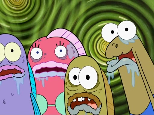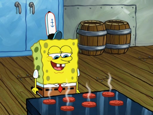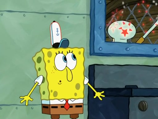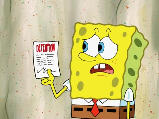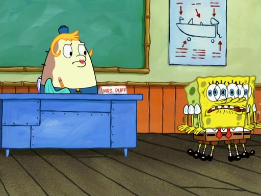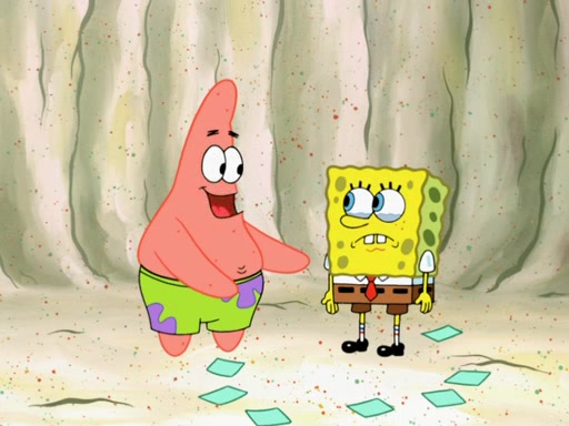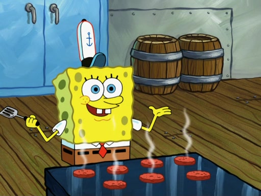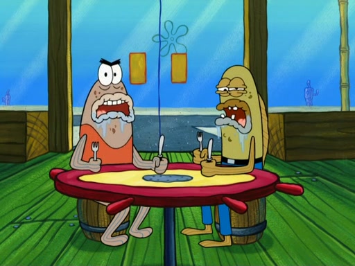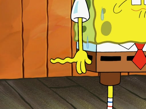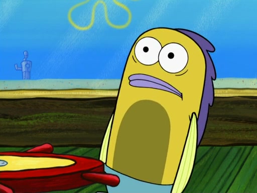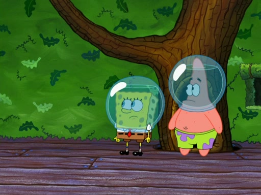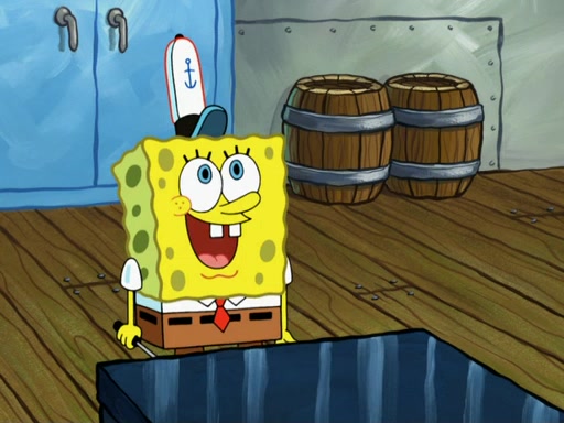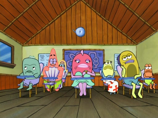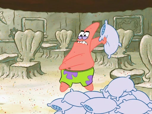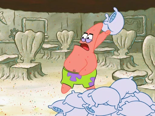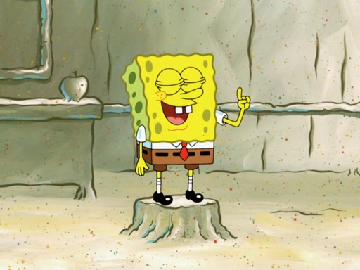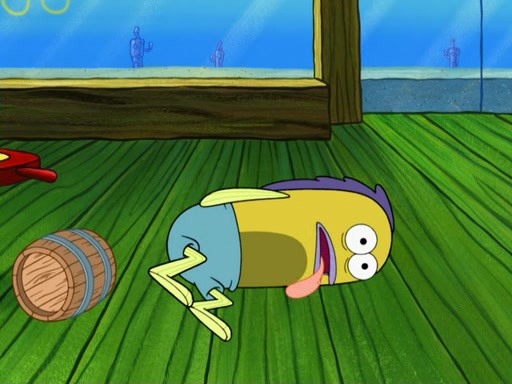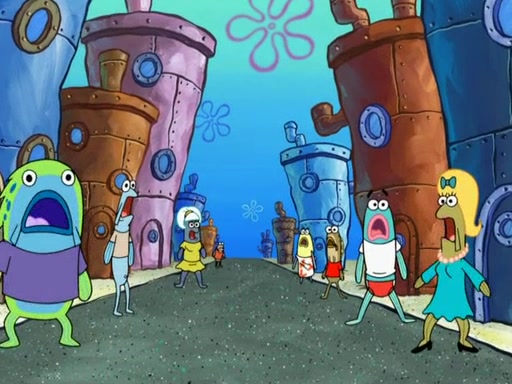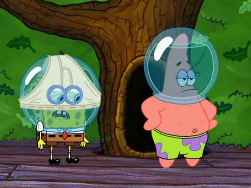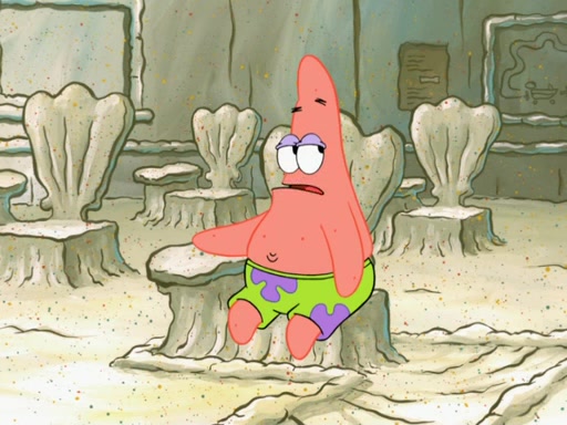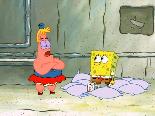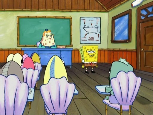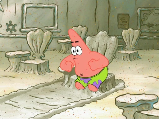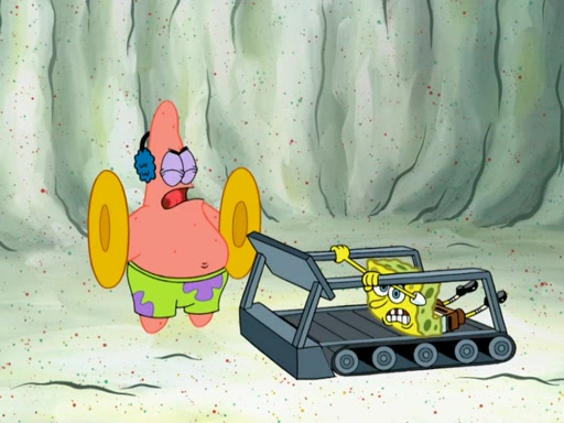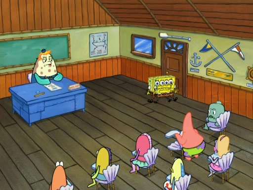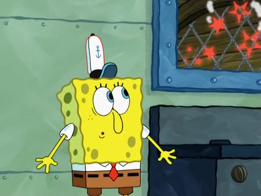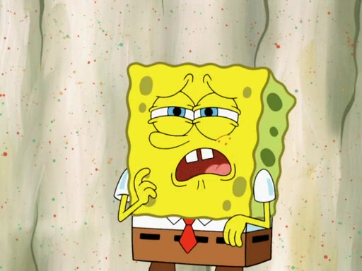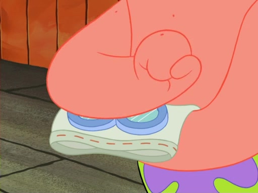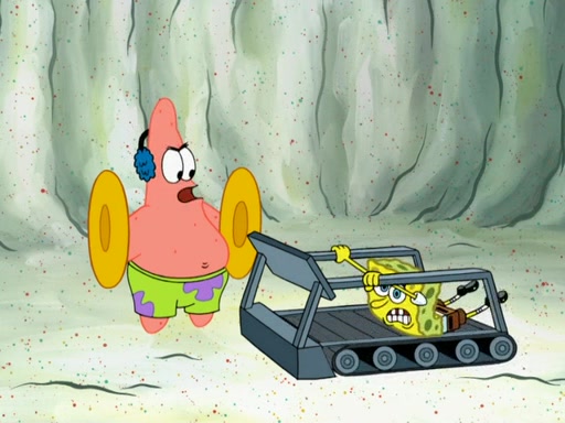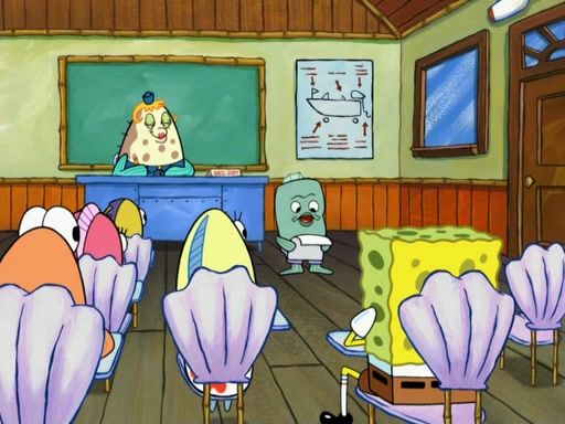 SpongeBob then realizes that he has stage fright. The customers start fighting for the single order as Squidward is beaten up after trying to give a customer his order, which makes SpongeBob even more frightened. It then cuts to Patrick's rock. Patrick opens it, only to realize he has the wrong rock, but SpongeBob pulls him in. SpongeBob asks Patrick to help him practice by listening to his speech. SpongeBob has to practice if he wants to pass then he has to give the report.