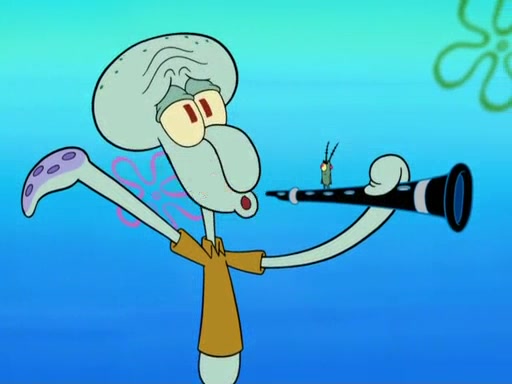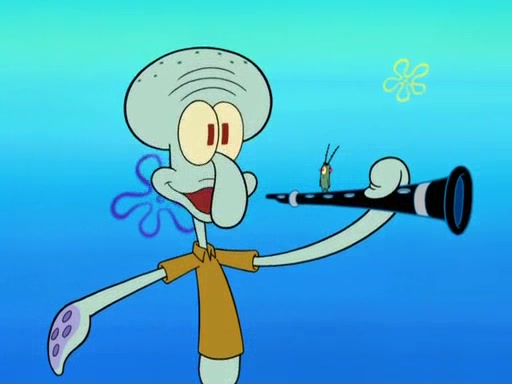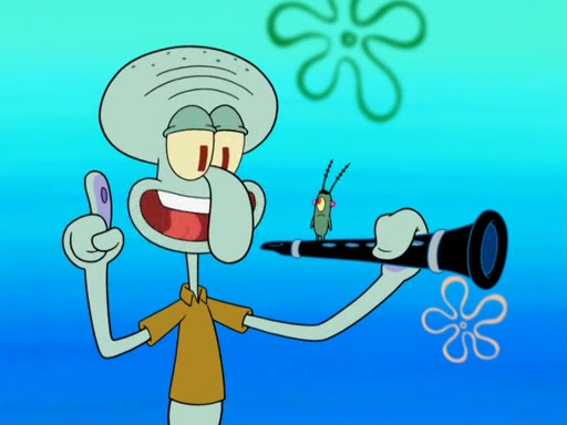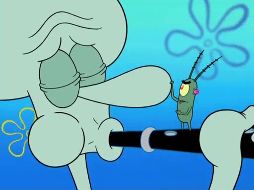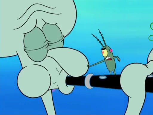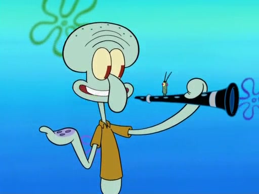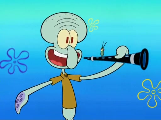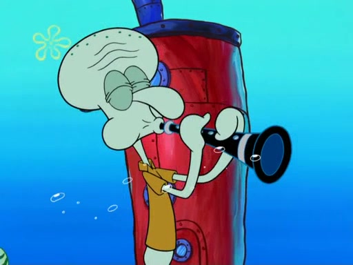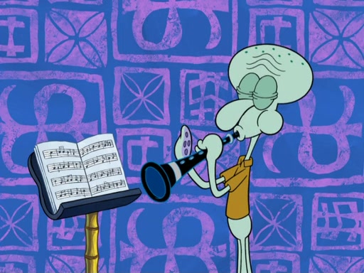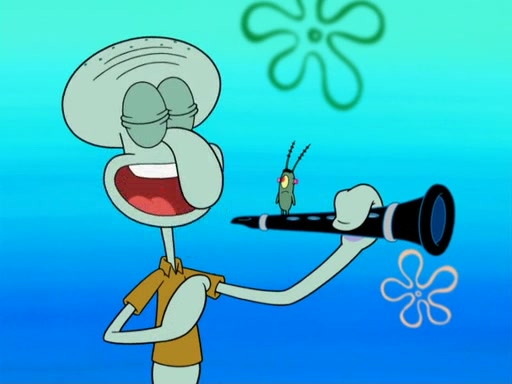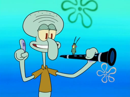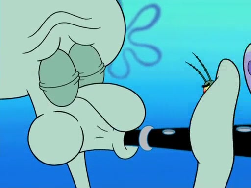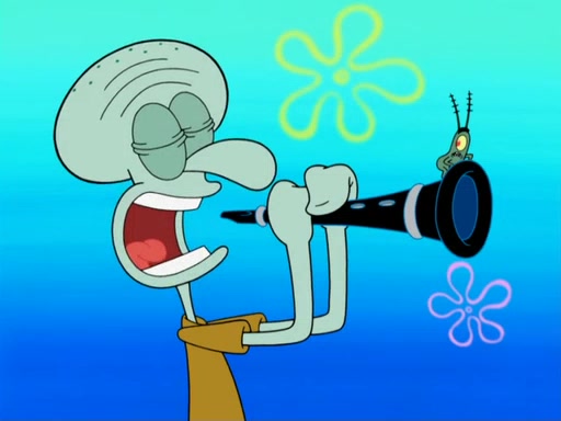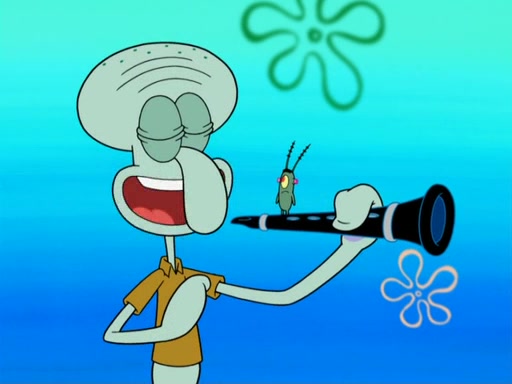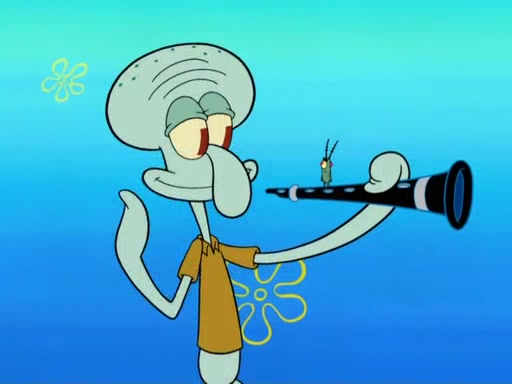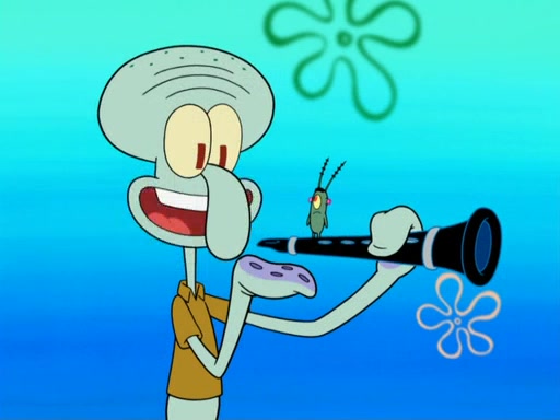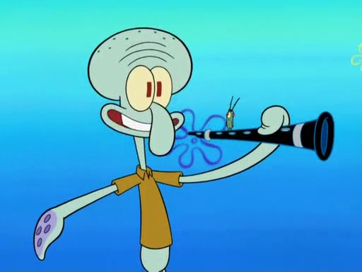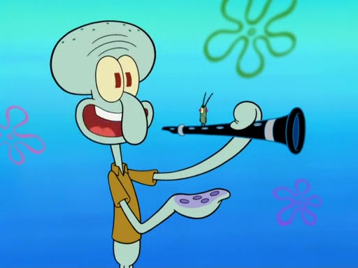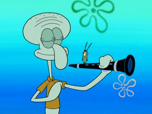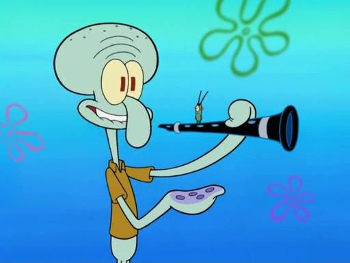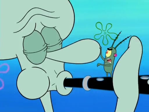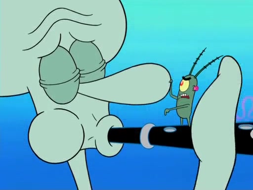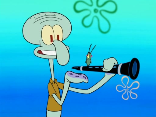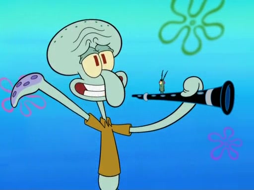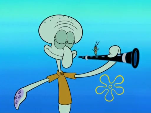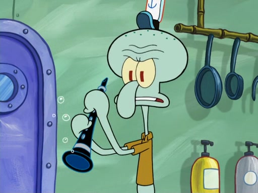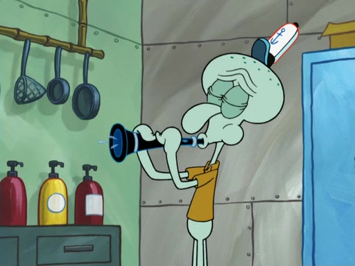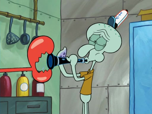 SpongeBob begins singing while cooking the patties. An annoyed Squidward tells him about real music and plays his clarinet, causing the customers to run away from the Krusty Krab. After being told to stop by Mr. Krabs, Squidward goes outside and throws a tantrum, complaining that no one appreciates music. Plankton, watching from the Chum Bucket, believes that Squidward may be the key to the formula.