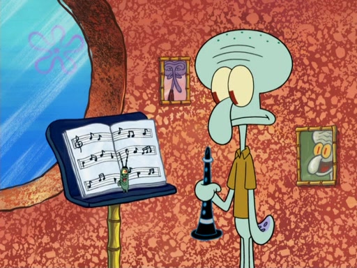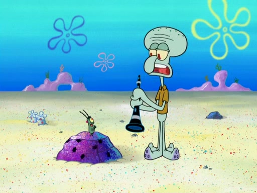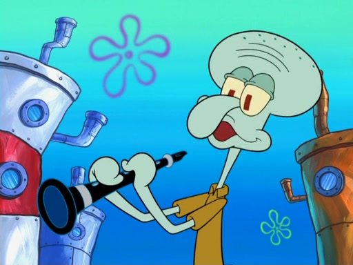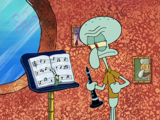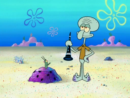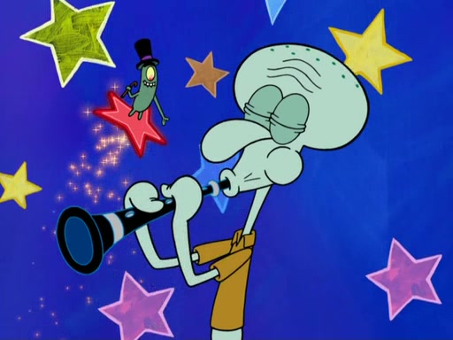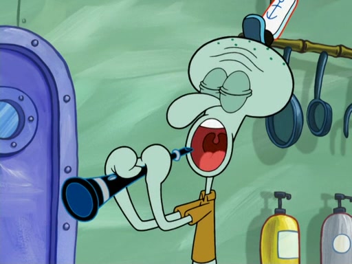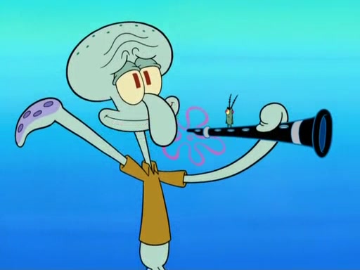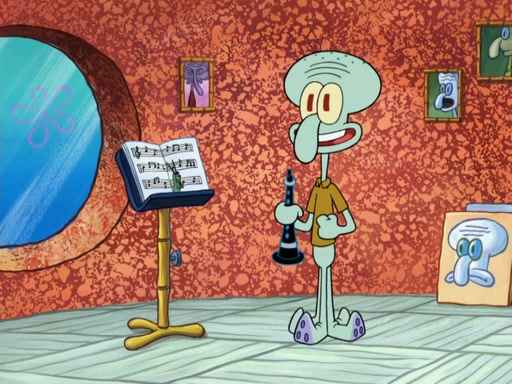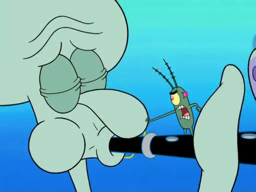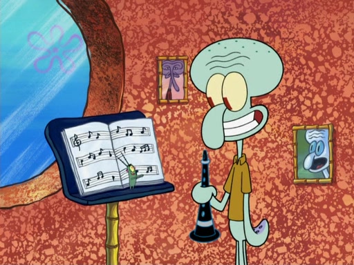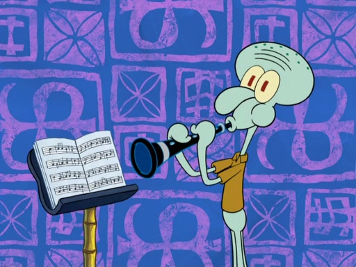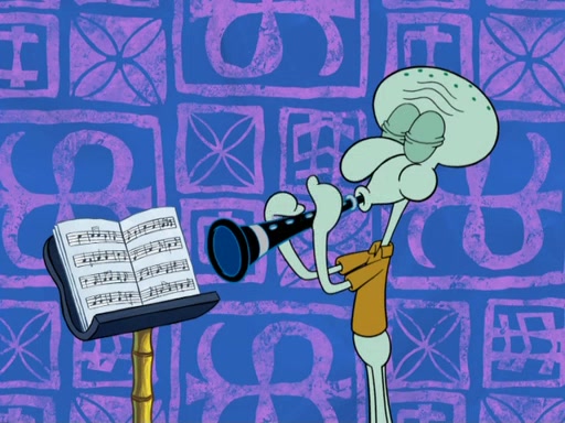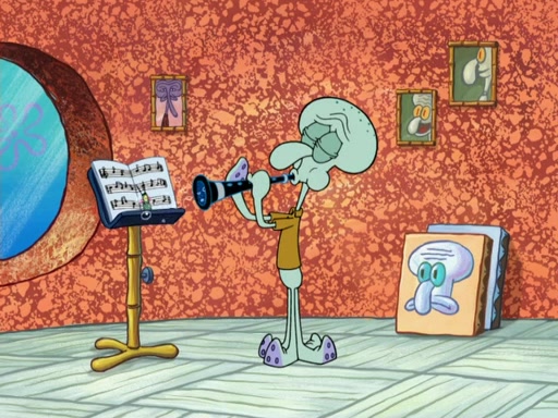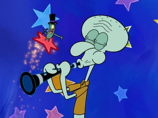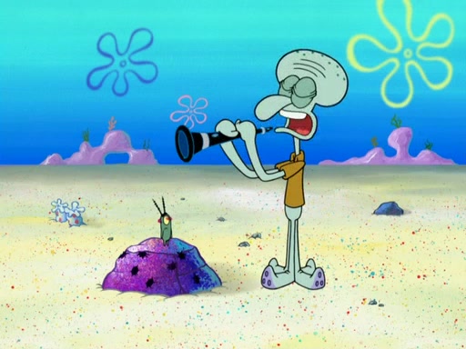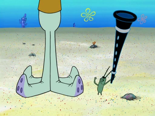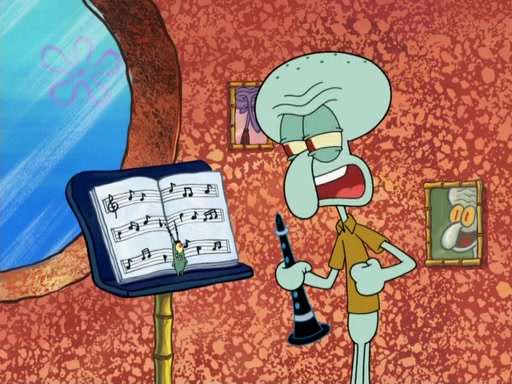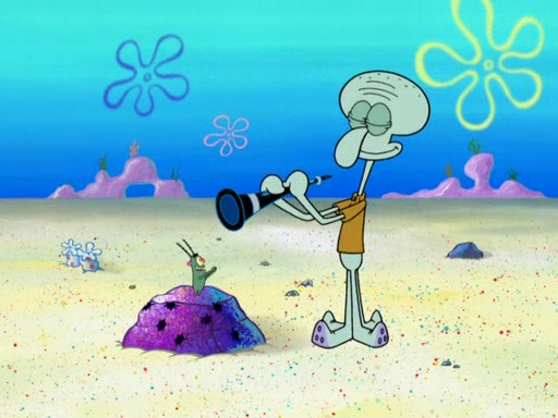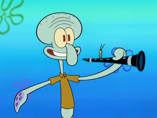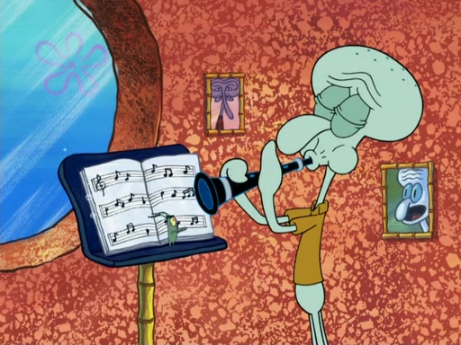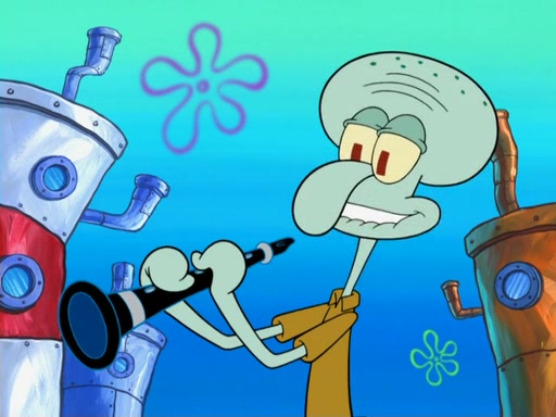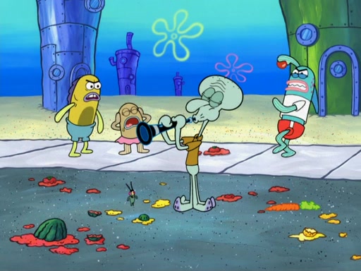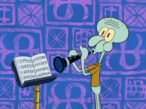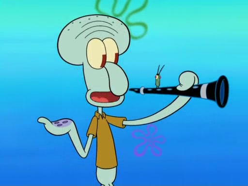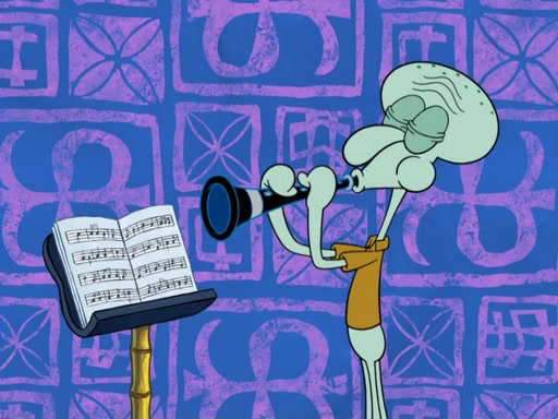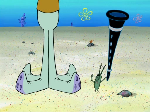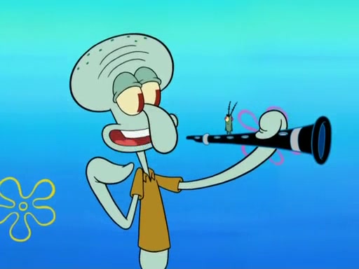 SpongeBob begins singing while cooking the patties. An annoyed Squidward tells him about real music and plays his clarinet, causing the customers to run away from the Krusty Krab. After being told to stop by Mr. Krabs, Squidward goes outside and throws a tantrum, complaining that no one appreciates music. Plankton, watching from the Chum Bucket, believes that Squidward may be the key to the formula.