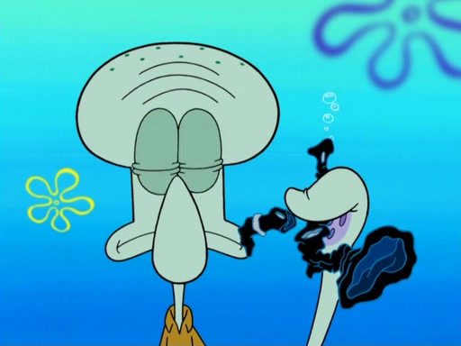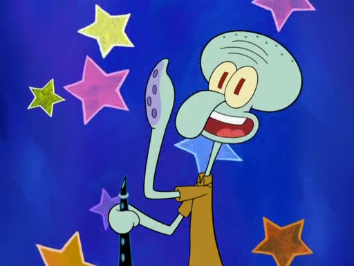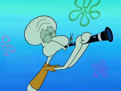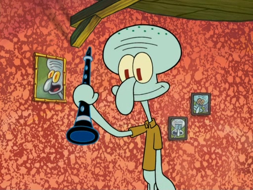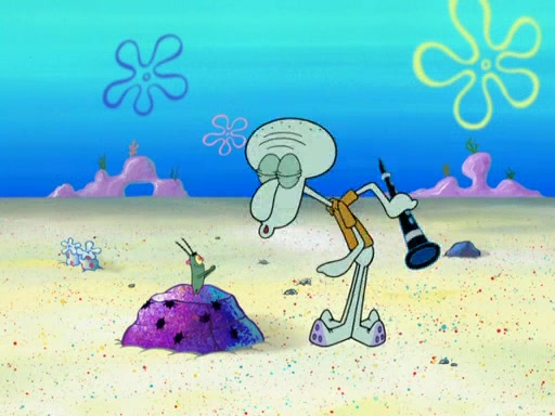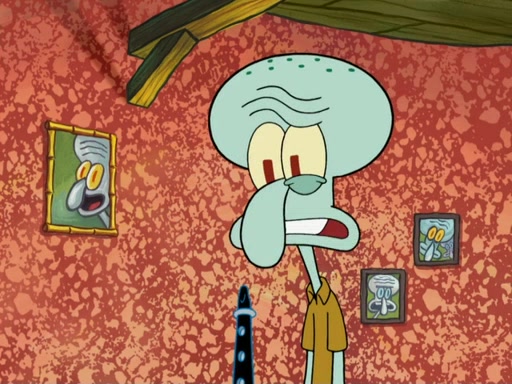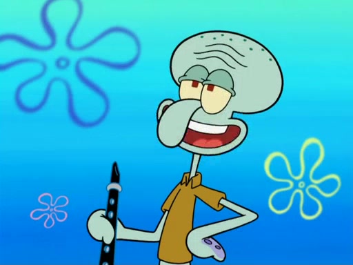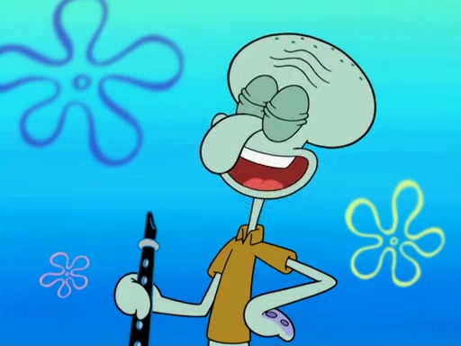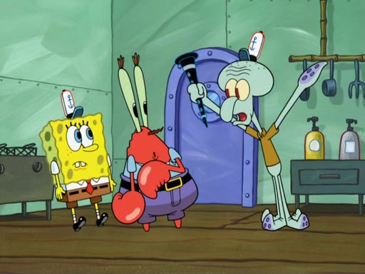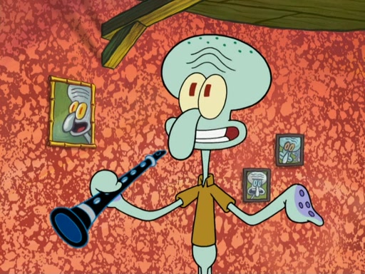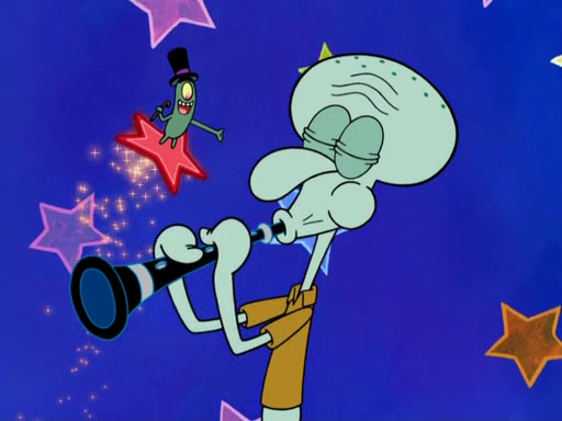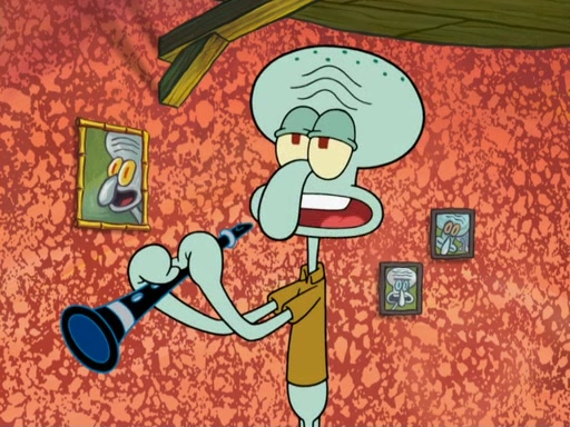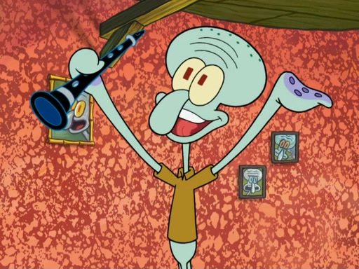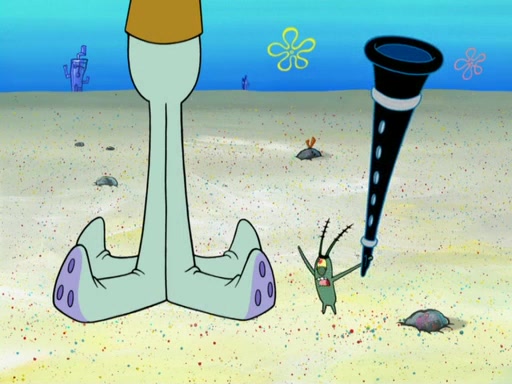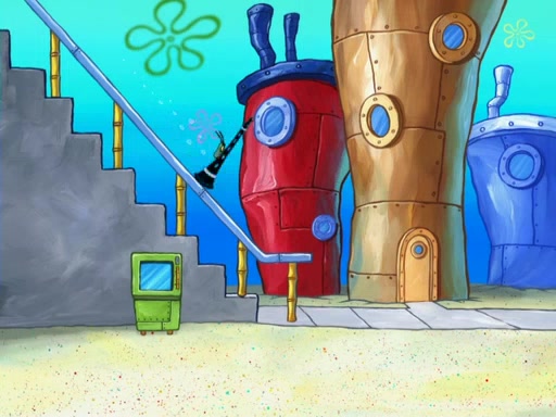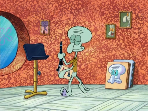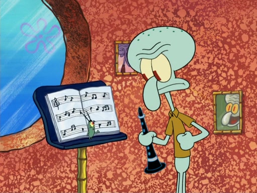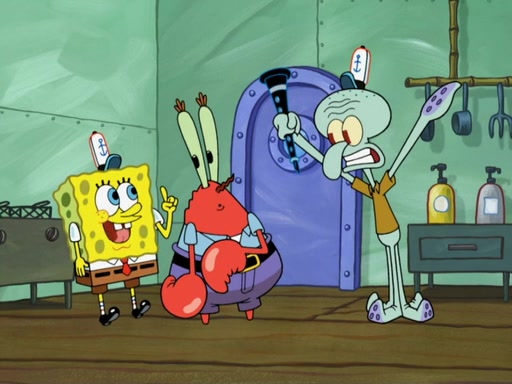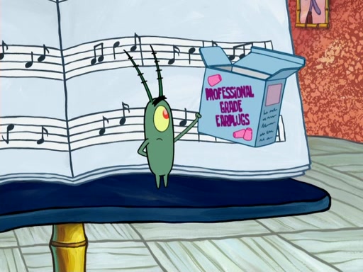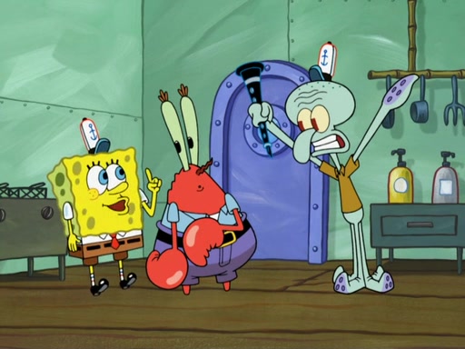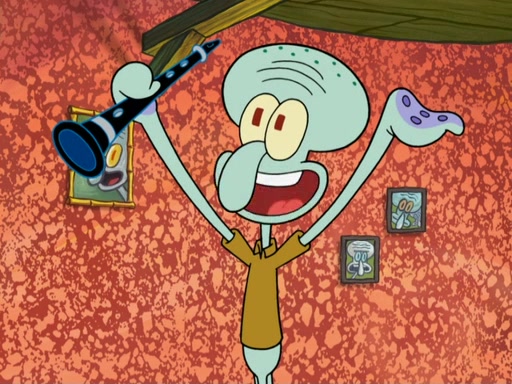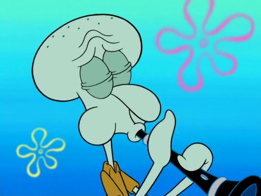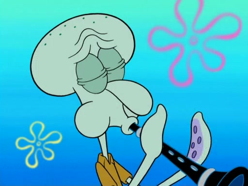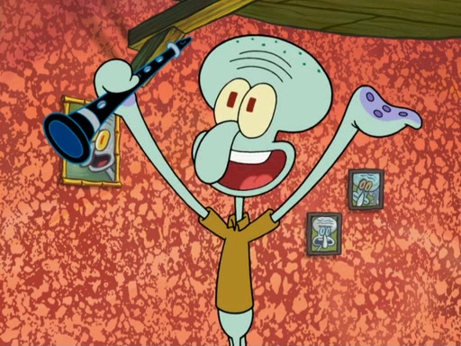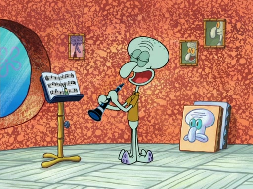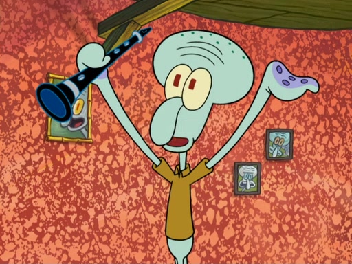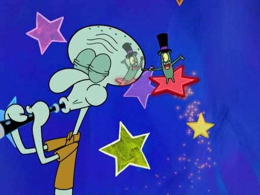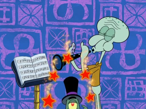 SpongeBob begins singing while cooking the patties. An annoyed Squidward tells him about real music and plays his clarinet, causing the customers to run away from the Krusty Krab. After being told to stop by Mr. Krabs, Squidward goes outside and throws a tantrum, complaining that no one appreciates music. Plankton, watching from the Chum Bucket, believes that Squidward may be the key to the formula.
