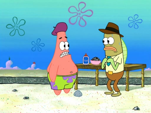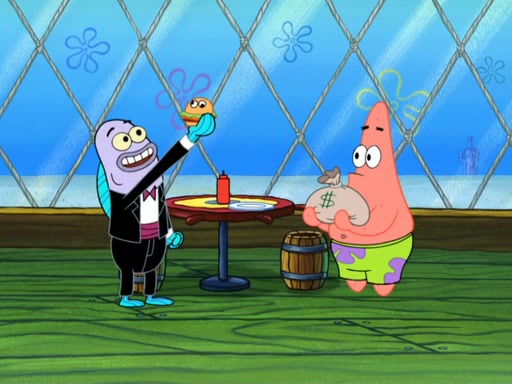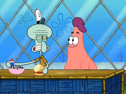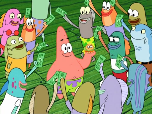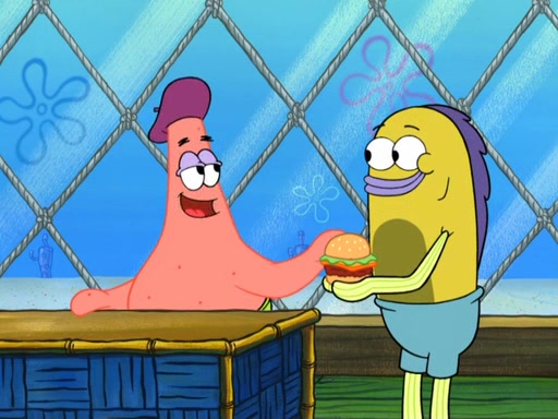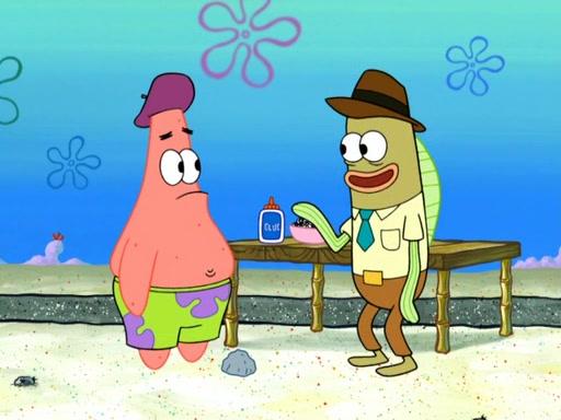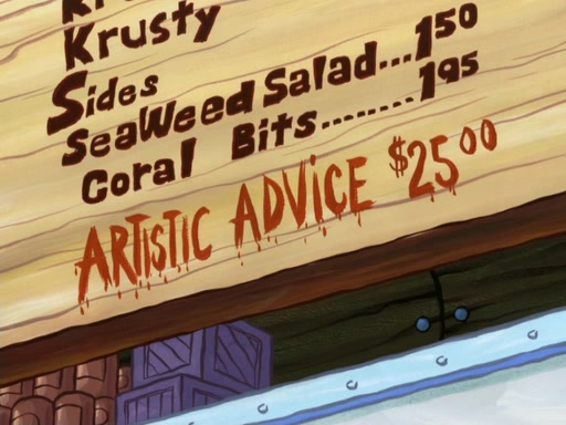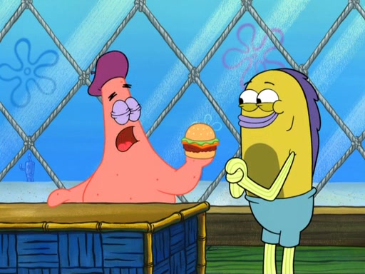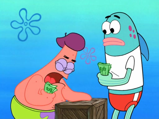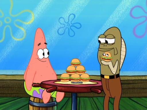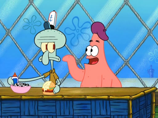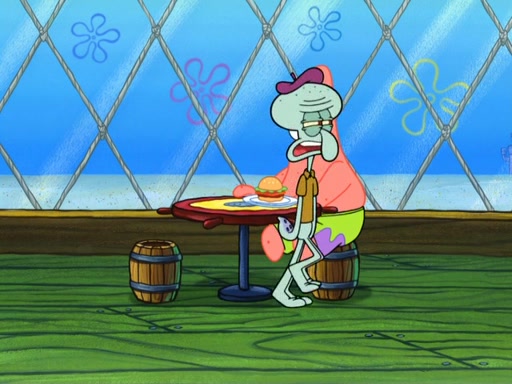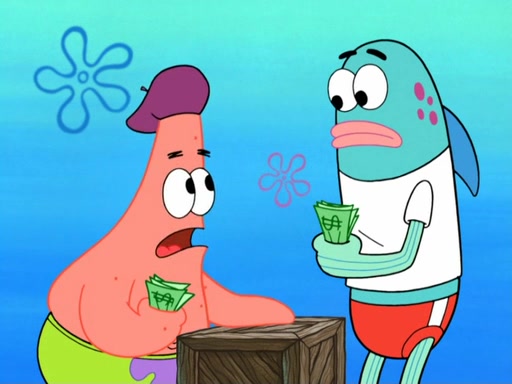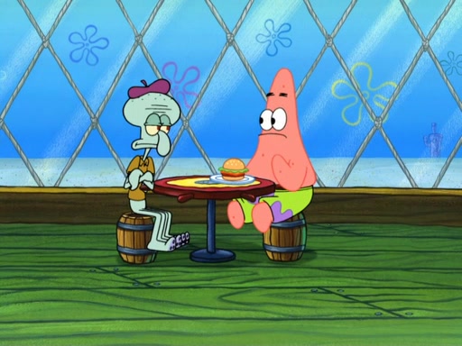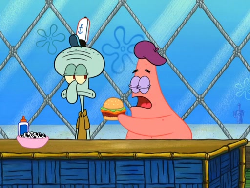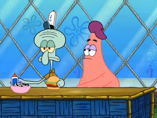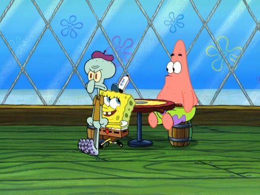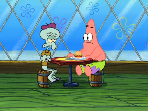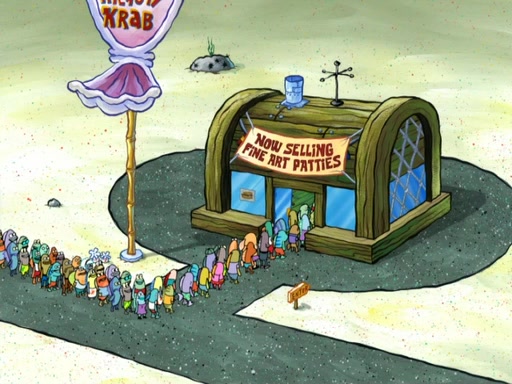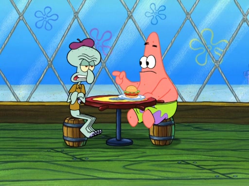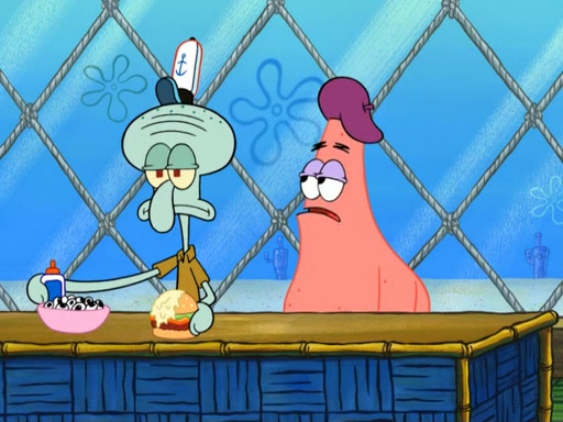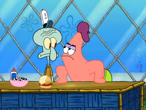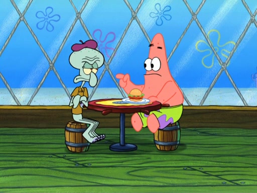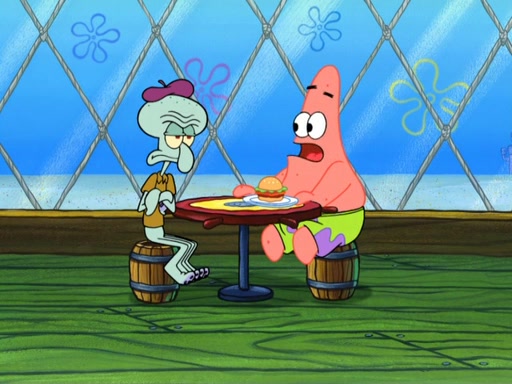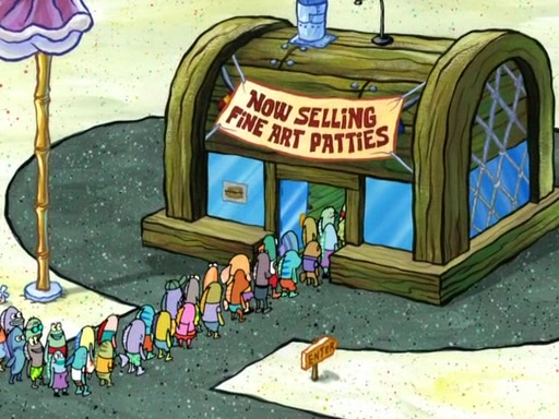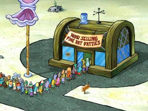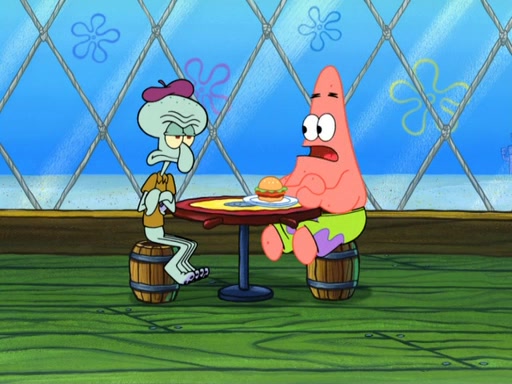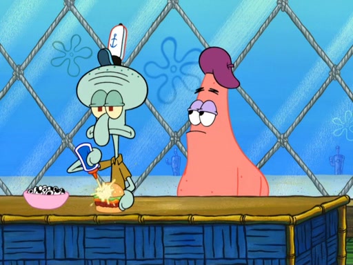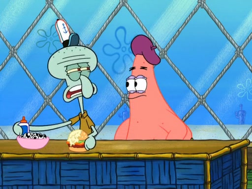 Now, Krabby Patties are sold at $50. The fish who buys the patty said it was not expensive. Then, the fish went to Patrick's stall. Patrick calls his apprentice, which is really Squidward. Squidward puts glue on the fish's patty. Patrick said that Squidward could be an artist one day. Squidward then bursts to tears.
