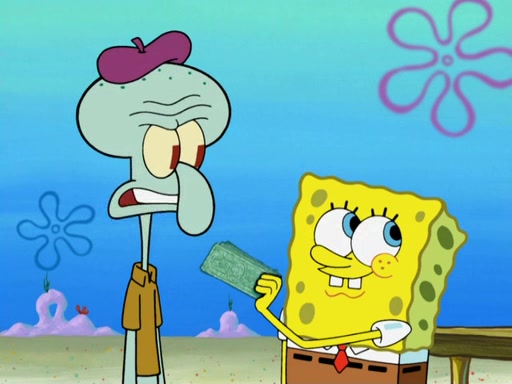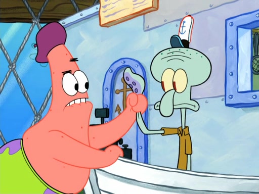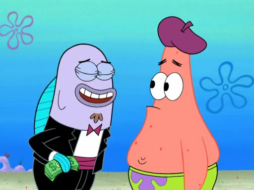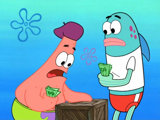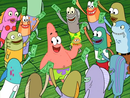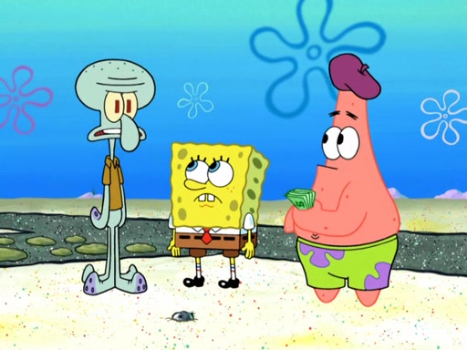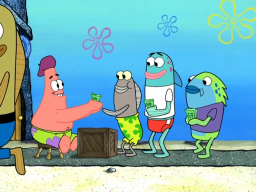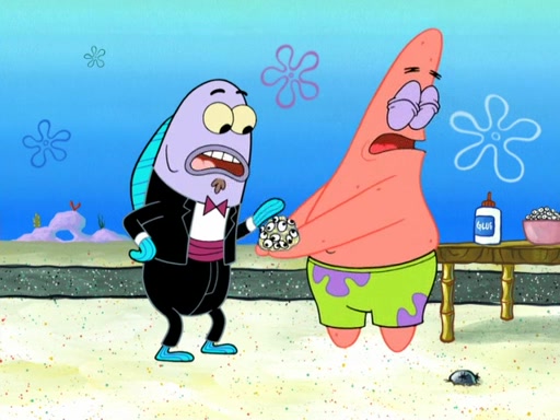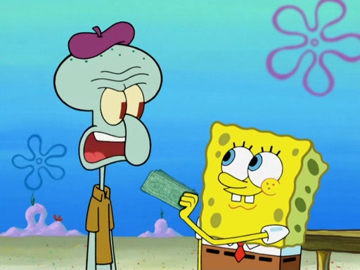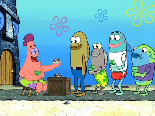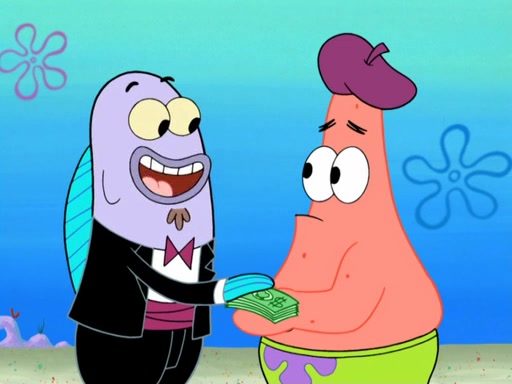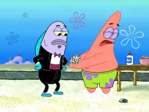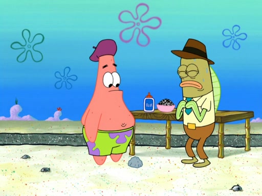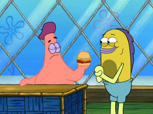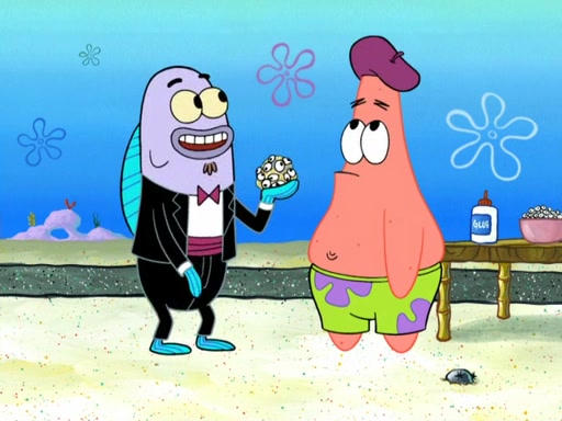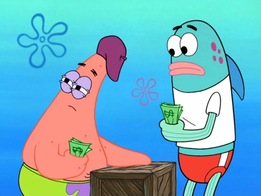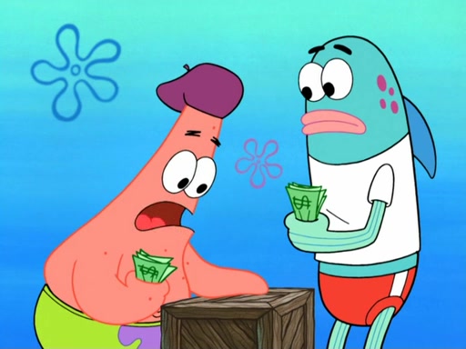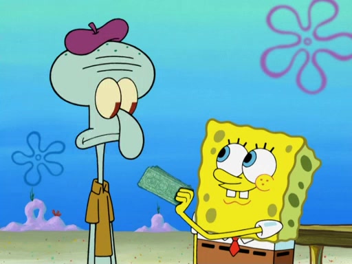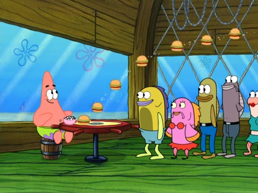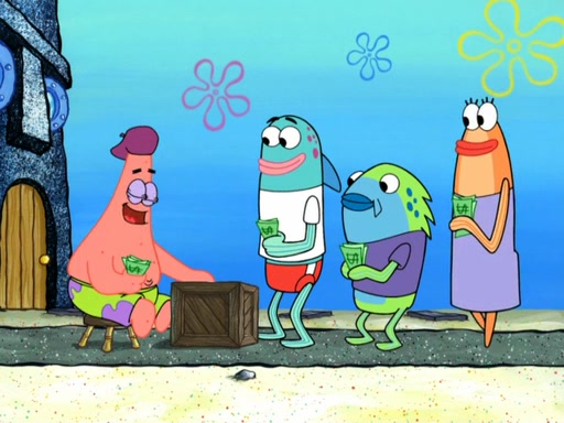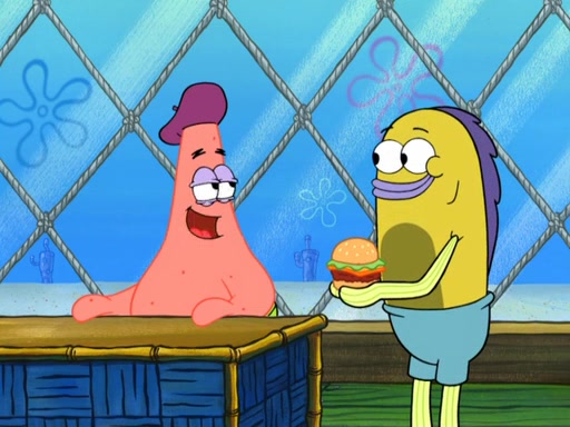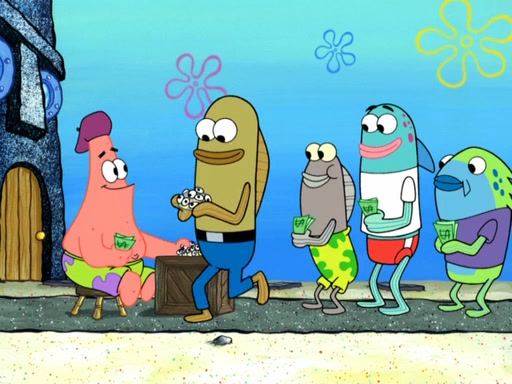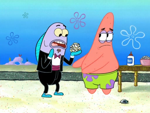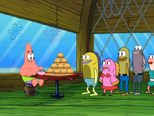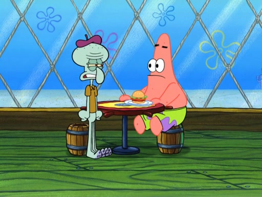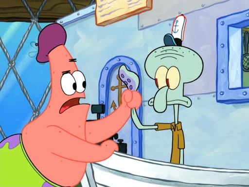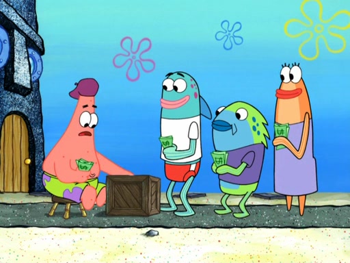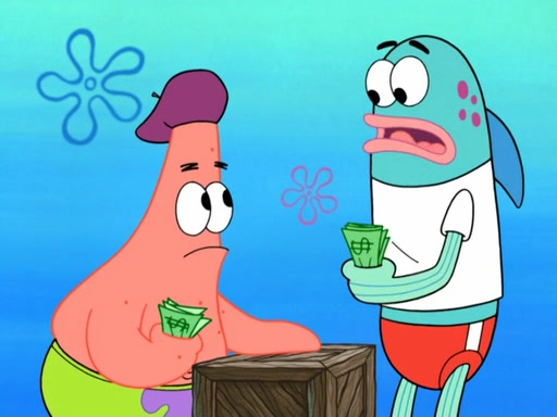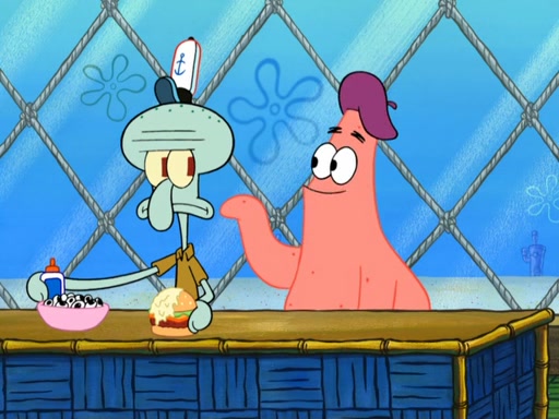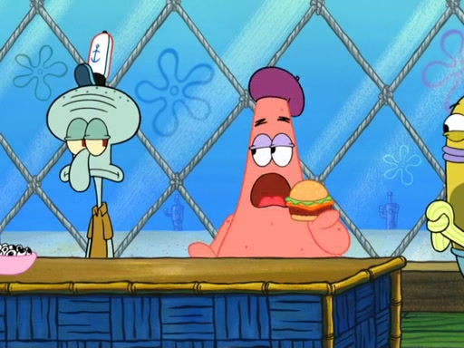 Now, Krabby Patties are sold at $50. The fish who buys the patty said it was not expensive. Then, the fish went to Patrick's stall. Patrick calls his apprentice, which is really Squidward. Squidward puts glue on the fish's patty. Patrick said that Squidward could be an artist one day. Squidward then bursts to tears.