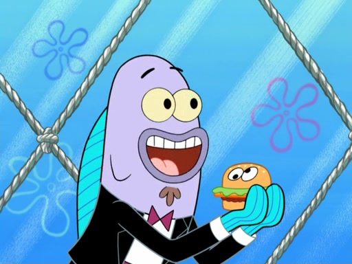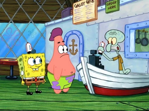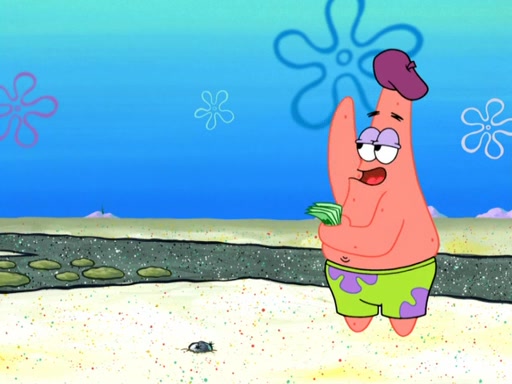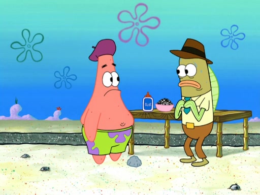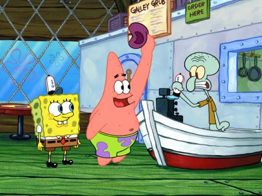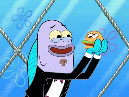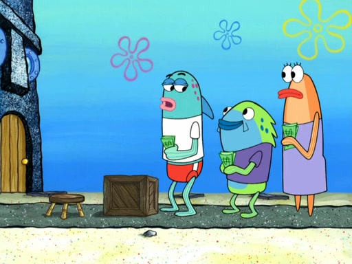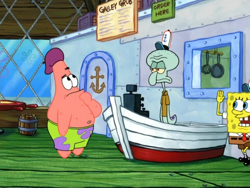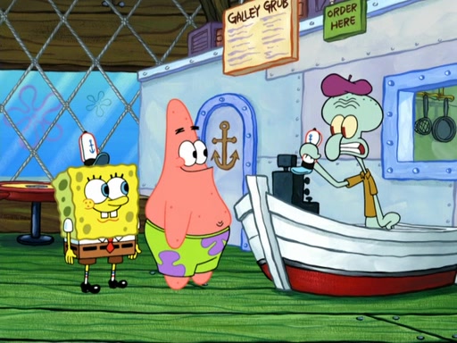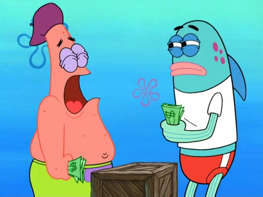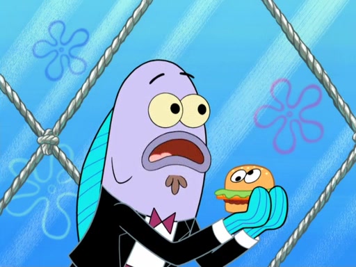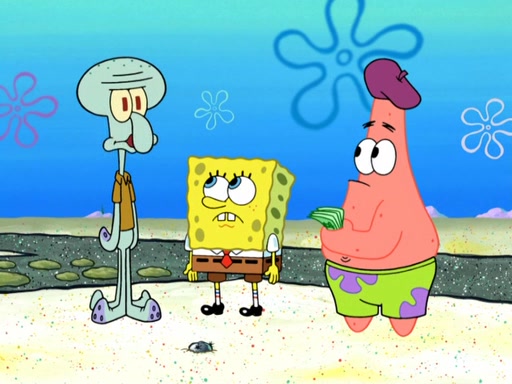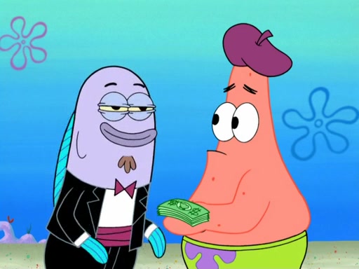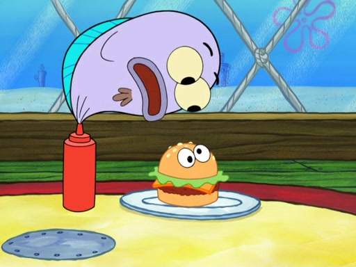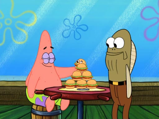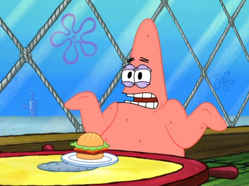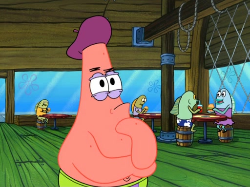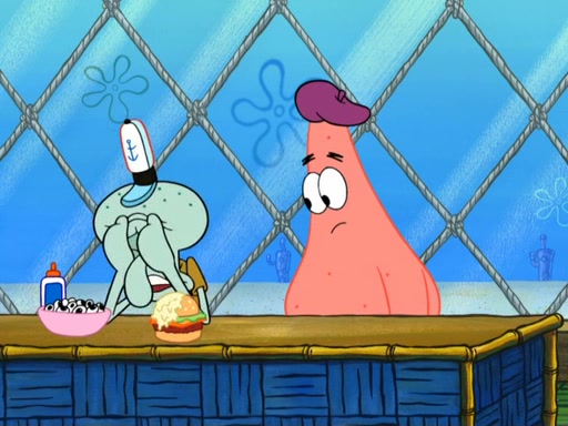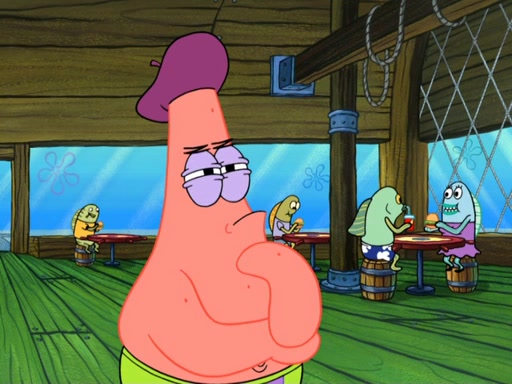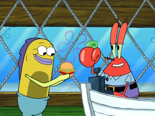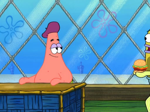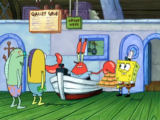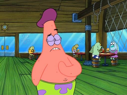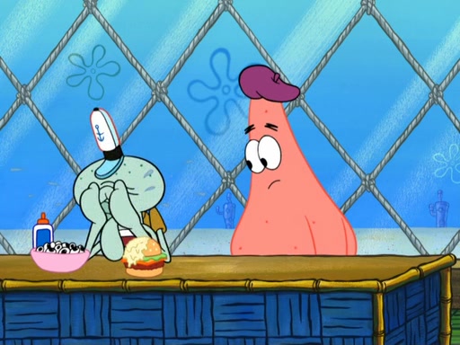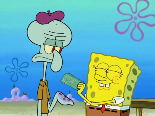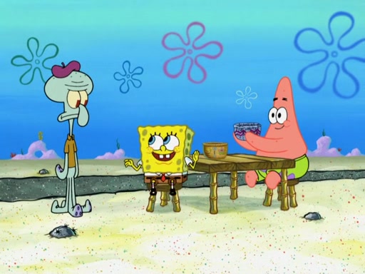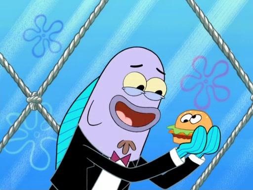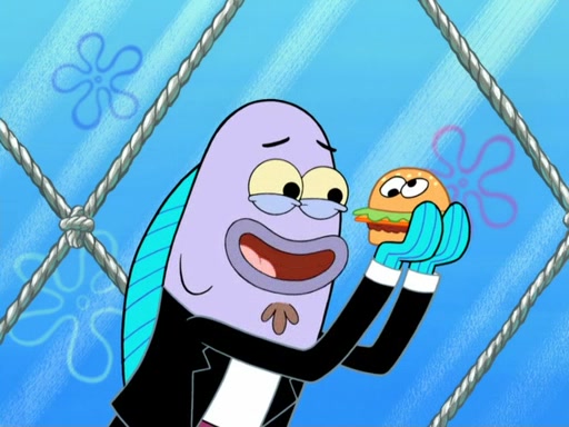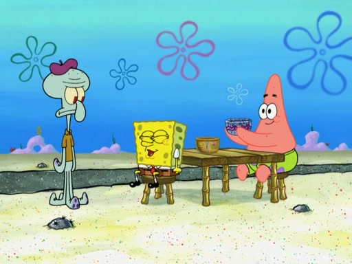 Now, Krabby Patties are sold at $50. The fish who buys the patty said it was not expensive. Then, the fish went to Patrick's stall. Patrick calls his apprentice, which is really Squidward. Squidward puts glue on the fish's patty. Patrick said that Squidward could be an artist one day. Squidward then bursts to tears.