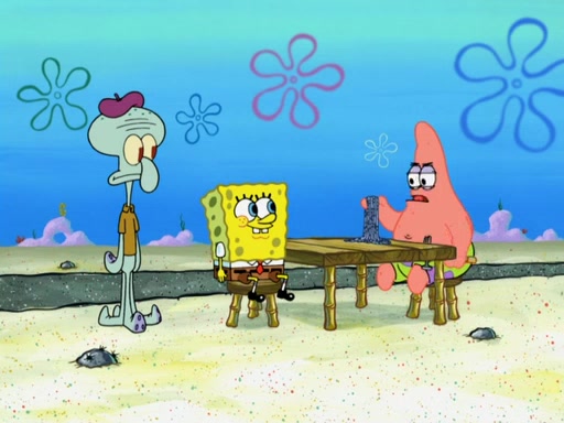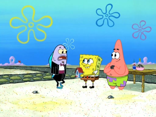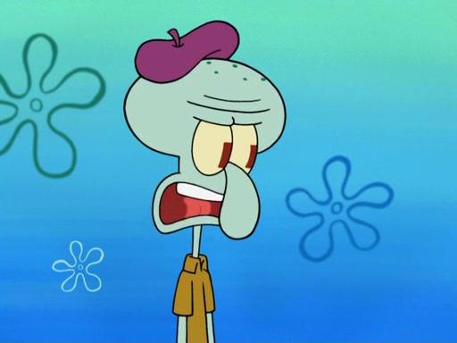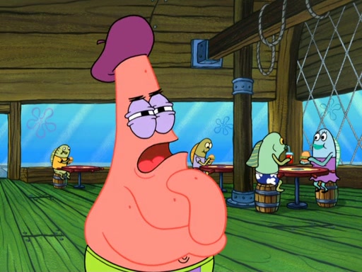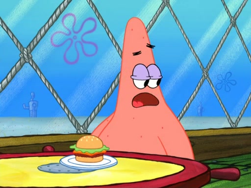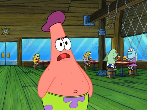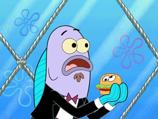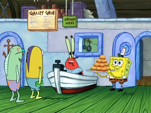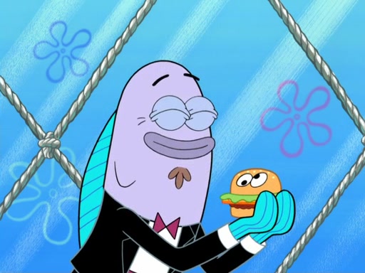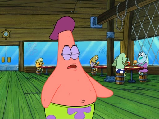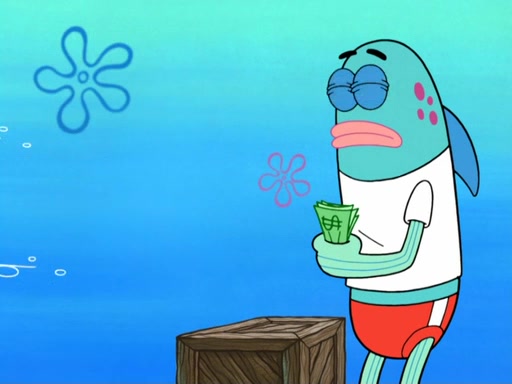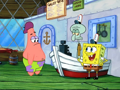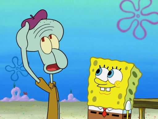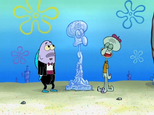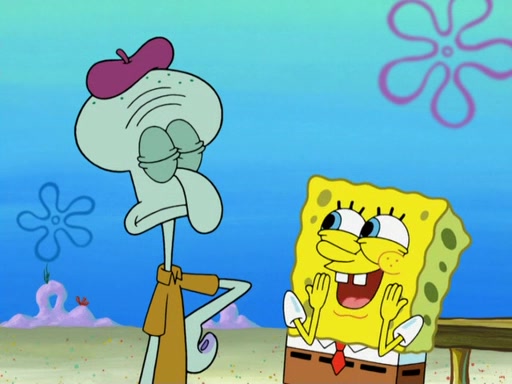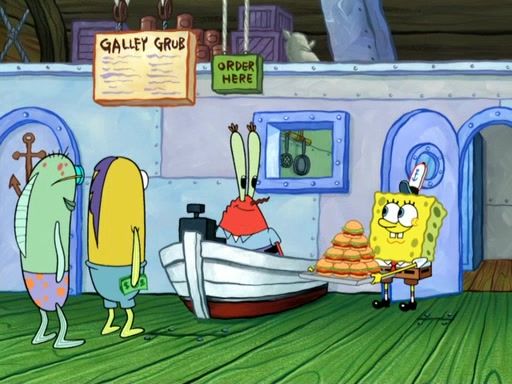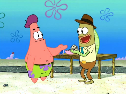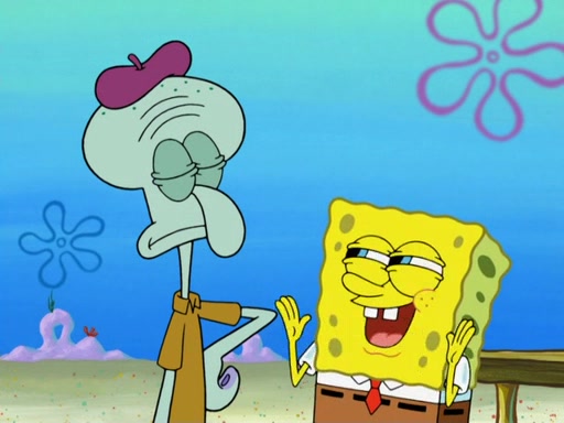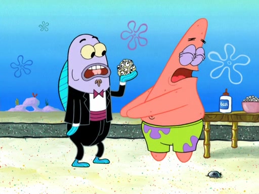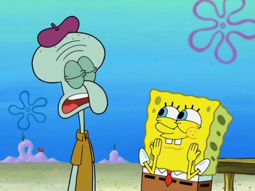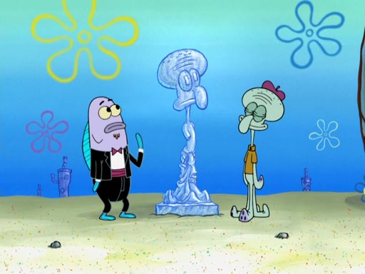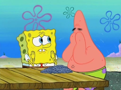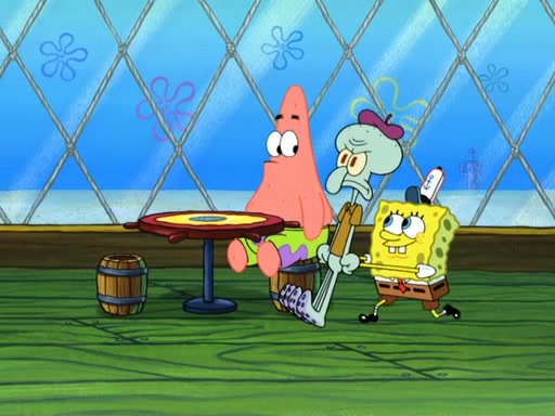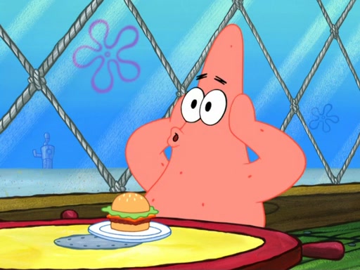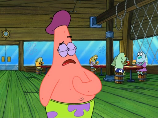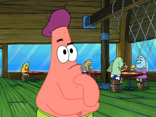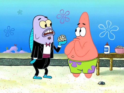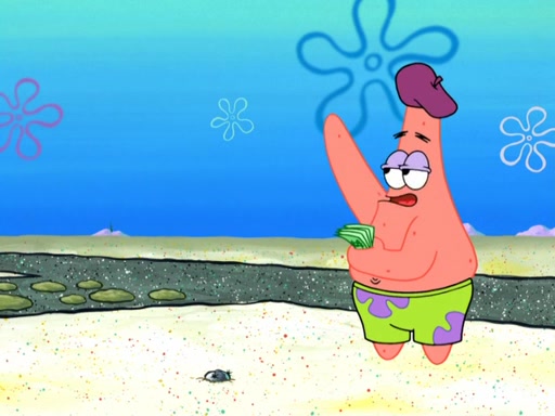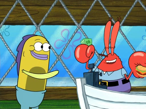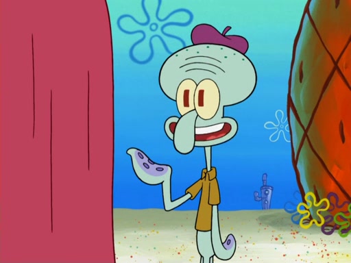 Now, Krabby Patties are sold at $50. The fish who buys the patty said it was not expensive. Then, the fish went to Patrick's stall. Patrick calls his apprentice, which is really Squidward. Squidward puts glue on the fish's patty. Patrick said that Squidward could be an artist one day. Squidward then bursts to tears.