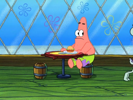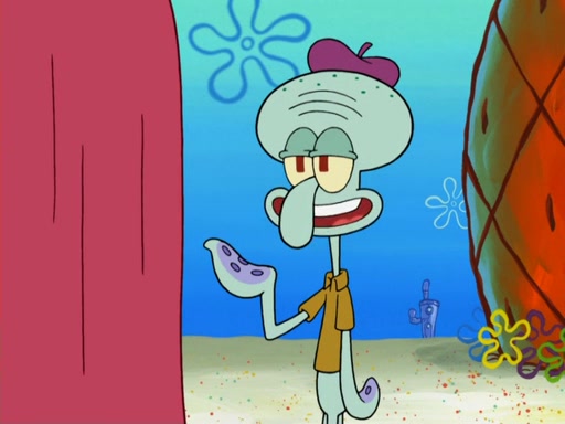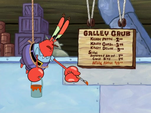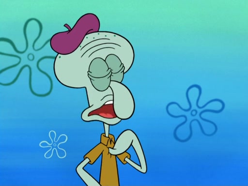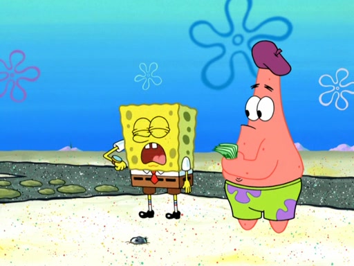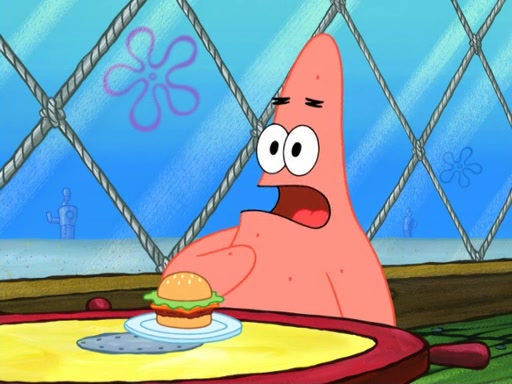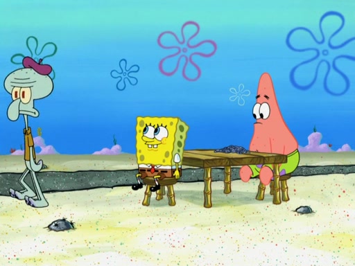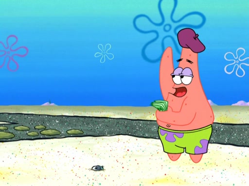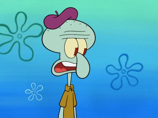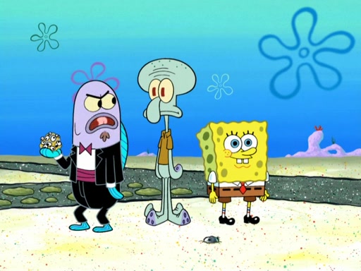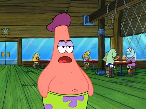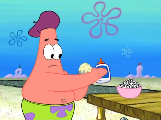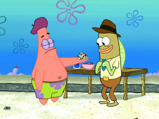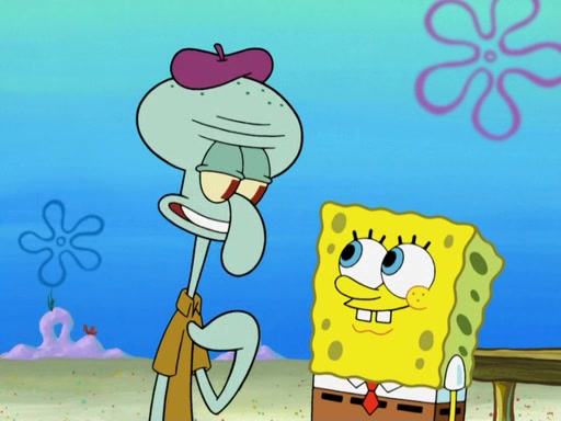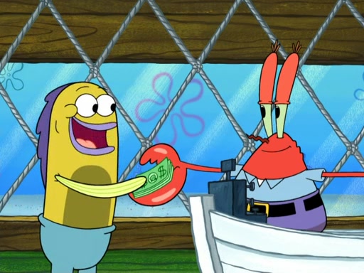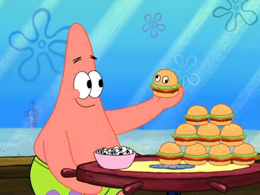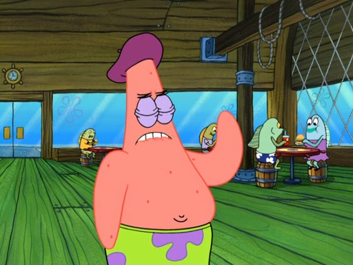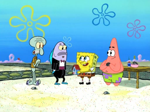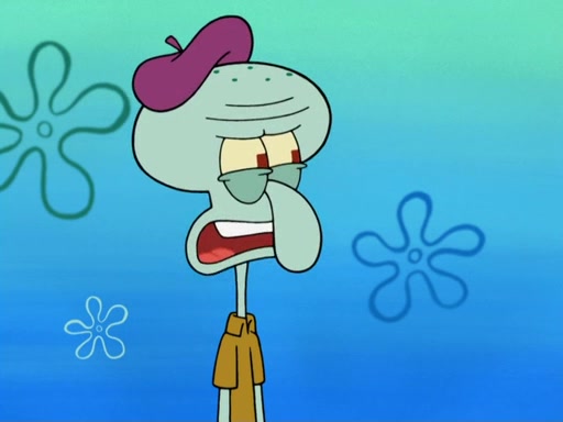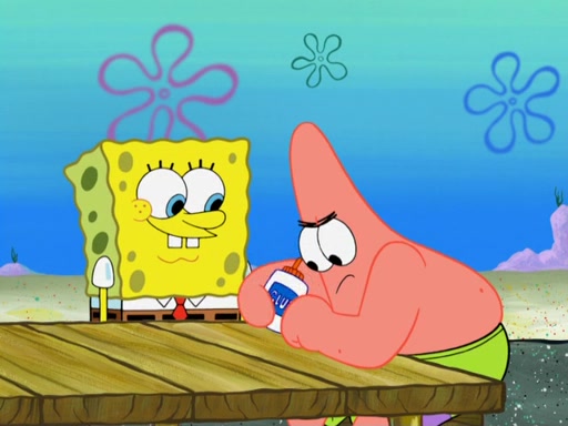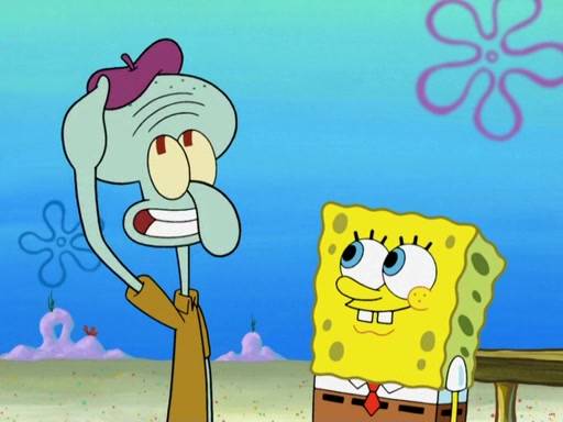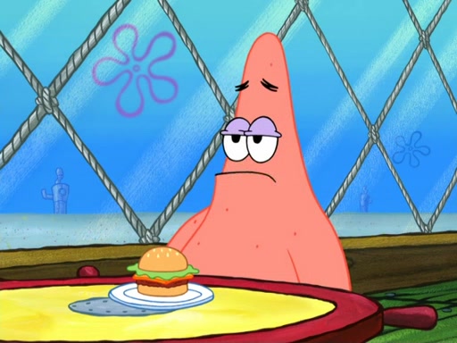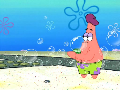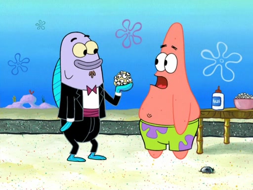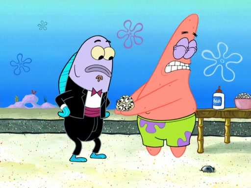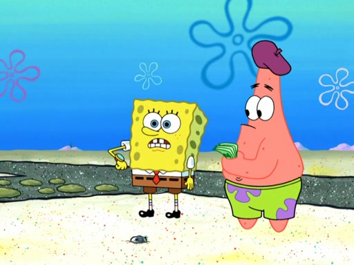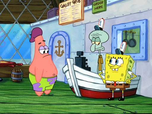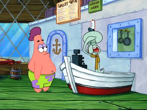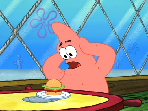 Now, Krabby Patties are sold at $50. The fish who buys the patty said it was not expensive. Then, the fish went to Patrick's stall. Patrick calls his apprentice, which is really Squidward. Squidward puts glue on the fish's patty. Patrick said that Squidward could be an artist one day. Squidward then bursts to tears.