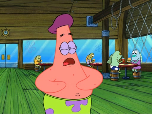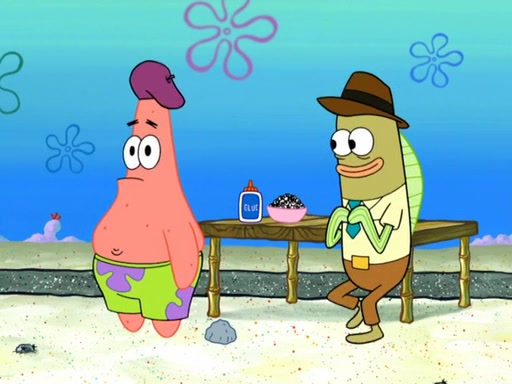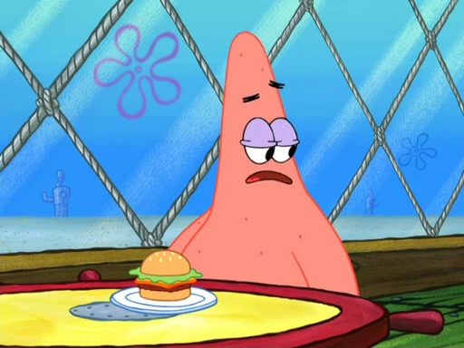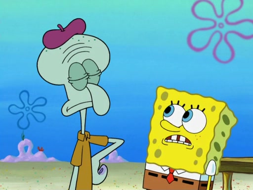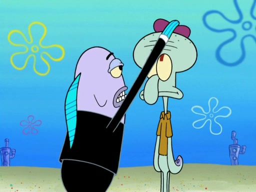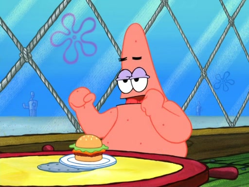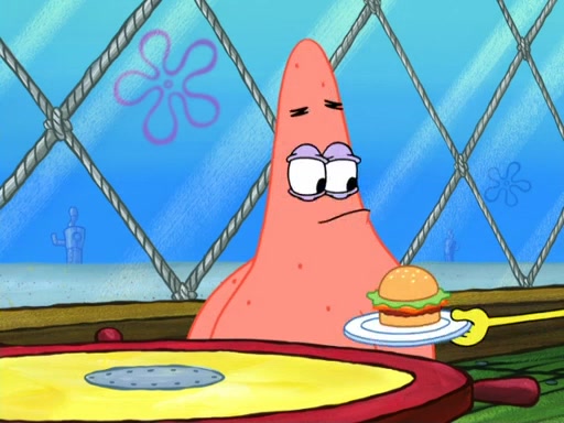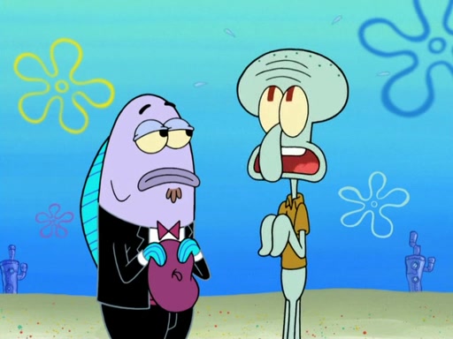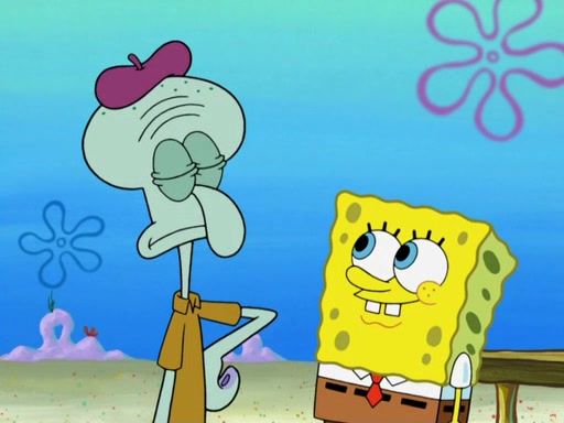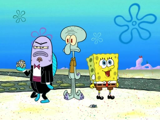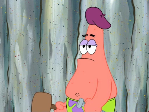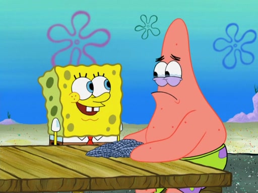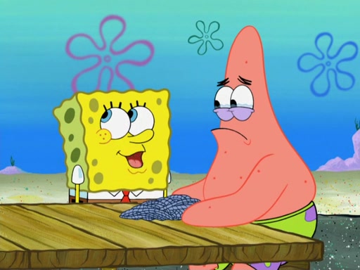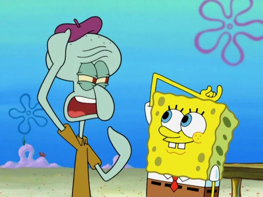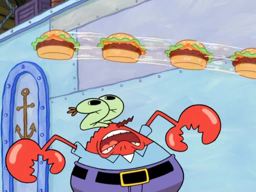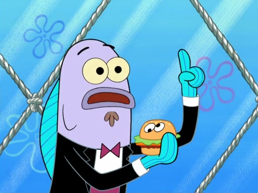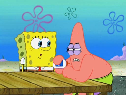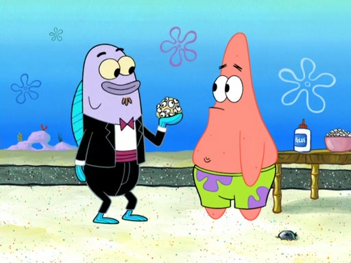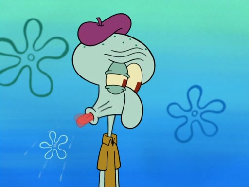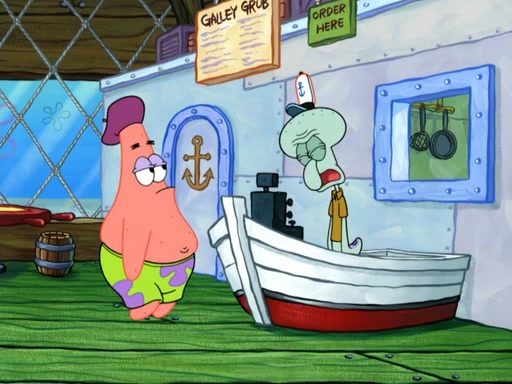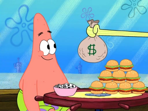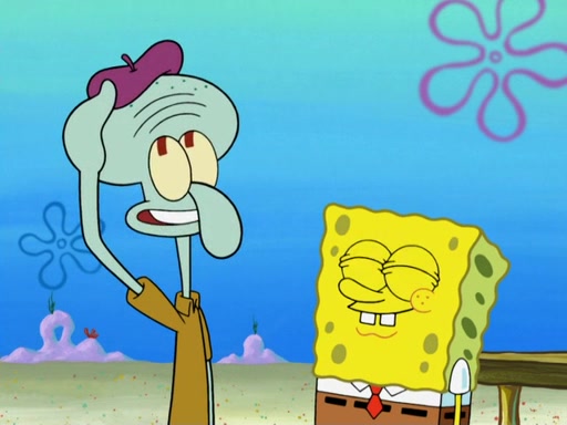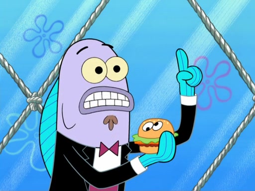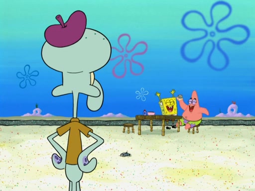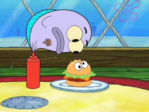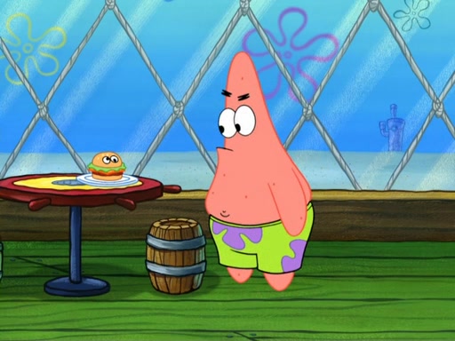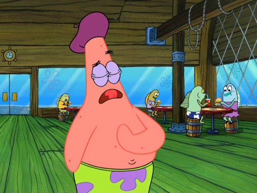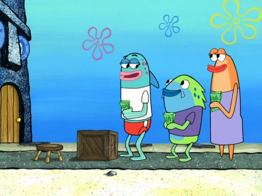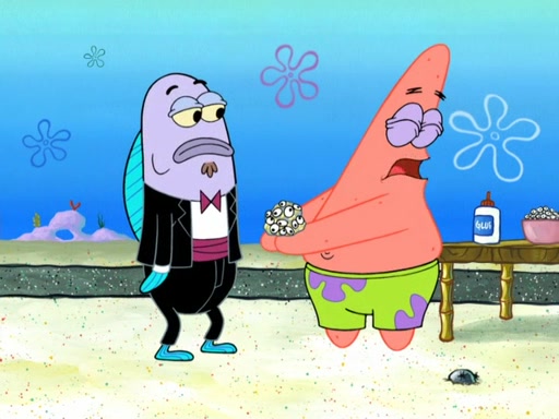 Now, Krabby Patties are sold at $50. The fish who buys the patty said it was not expensive. Then, the fish went to Patrick's stall. Patrick calls his apprentice, which is really Squidward. Squidward puts glue on the fish's patty. Patrick said that Squidward could be an artist one day. Squidward then bursts to tears.