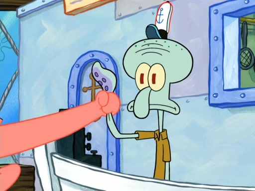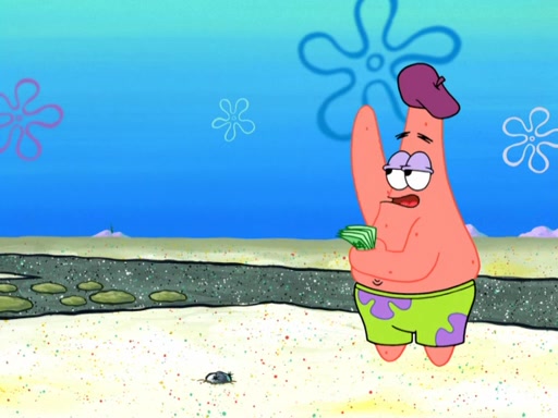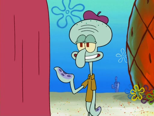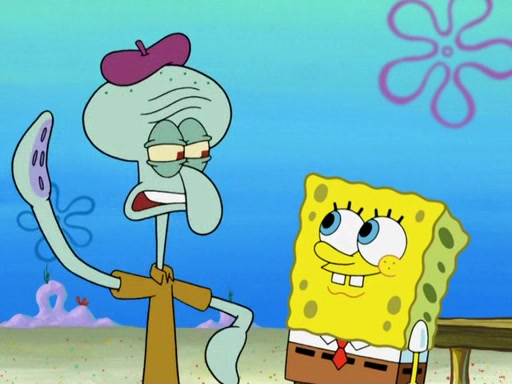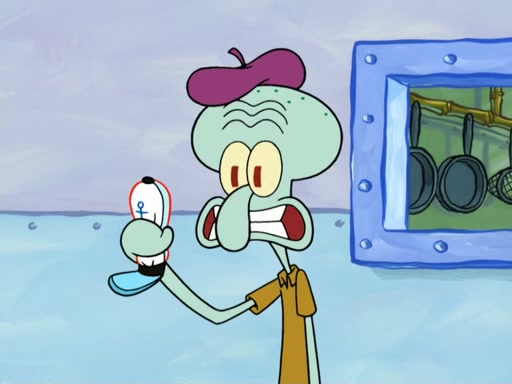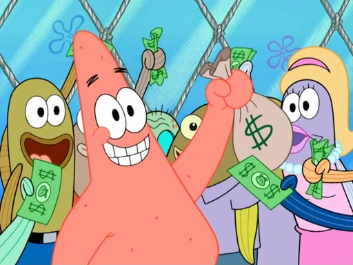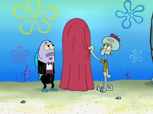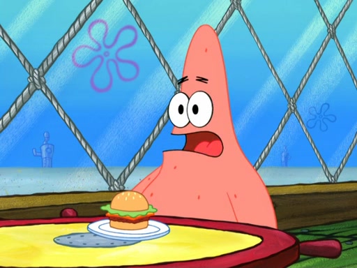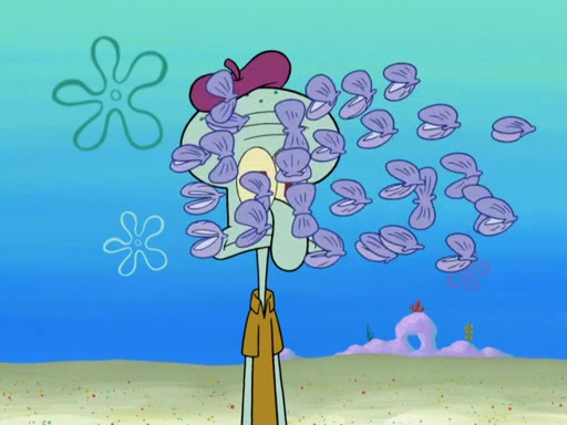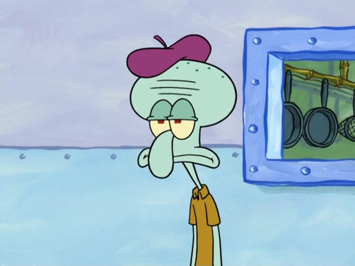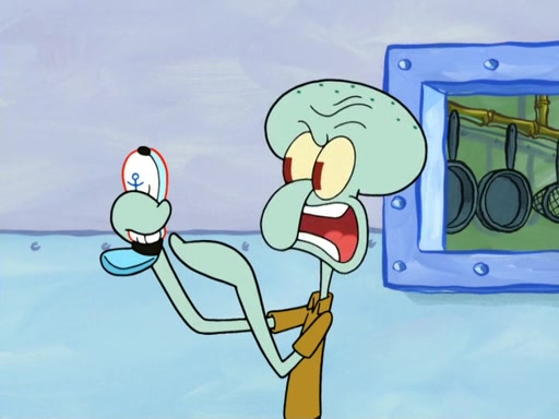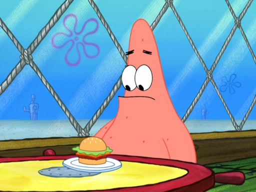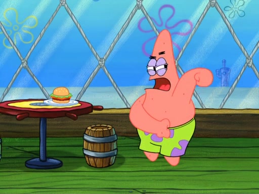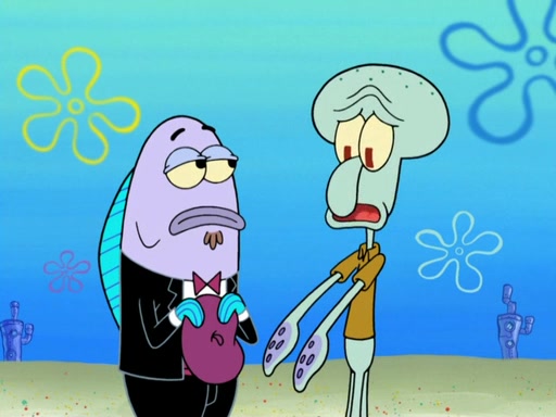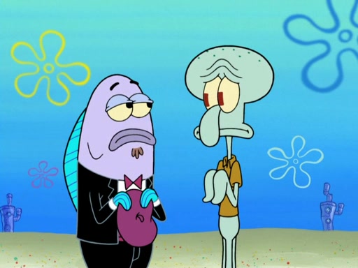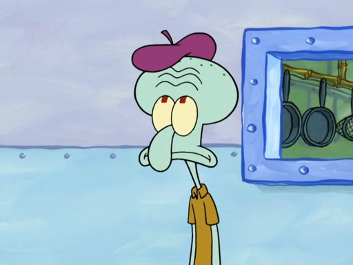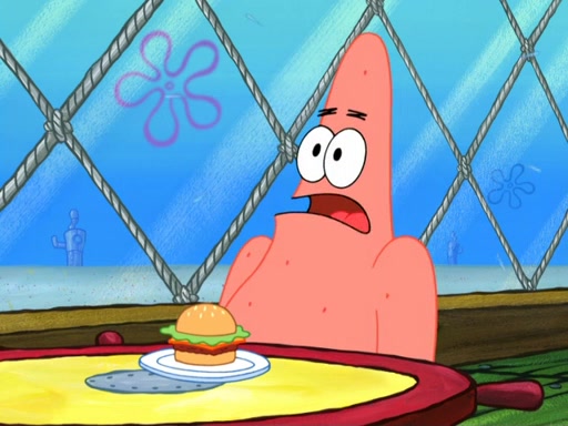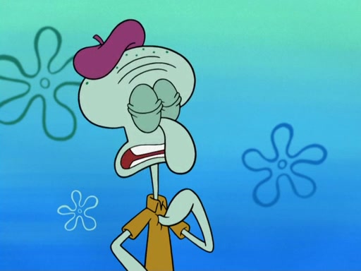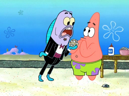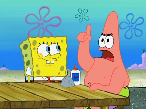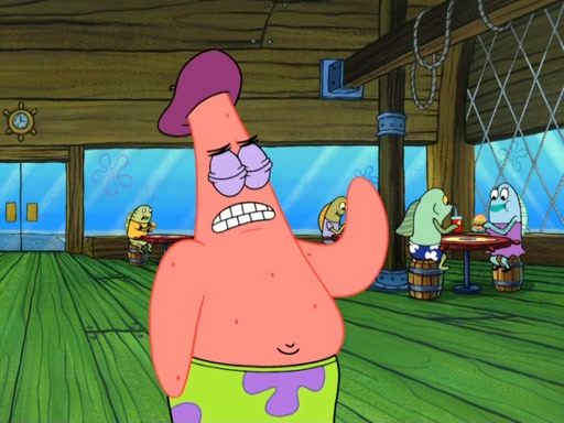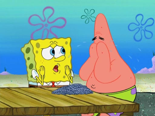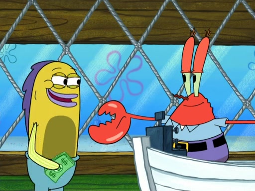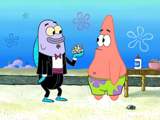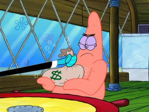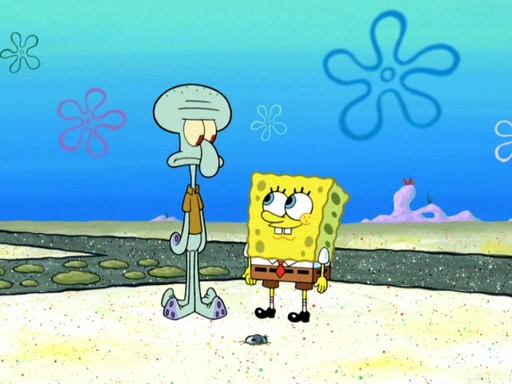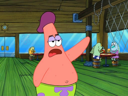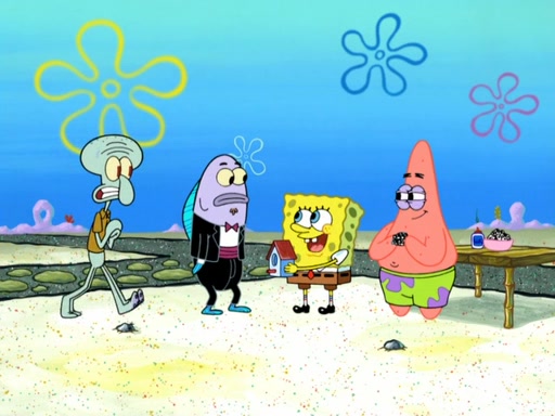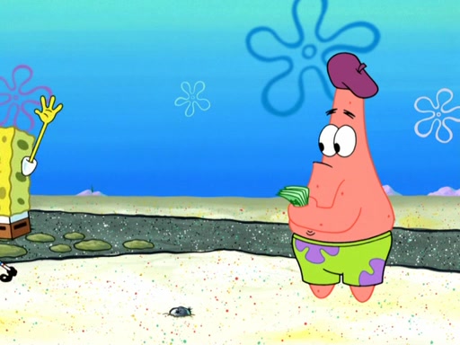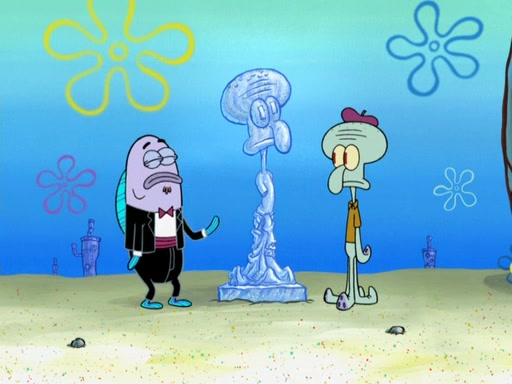 Now, Krabby Patties are sold at $50. The fish who buys the patty said it was not expensive. Then, the fish went to Patrick's stall. Patrick calls his apprentice, which is really Squidward. Squidward puts glue on the fish's patty. Patrick said that Squidward could be an artist one day. Squidward then bursts to tears.