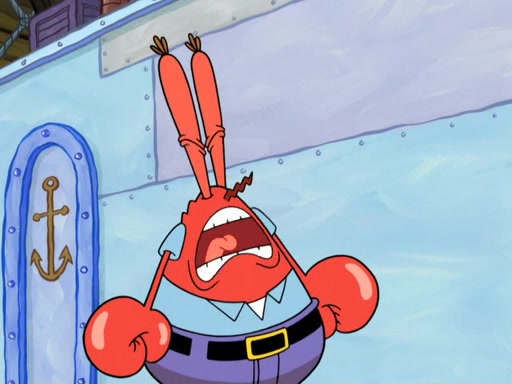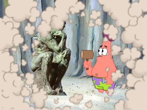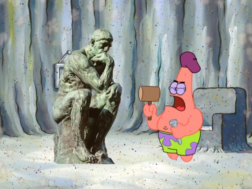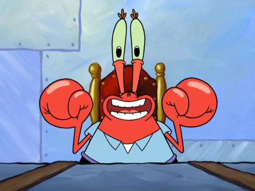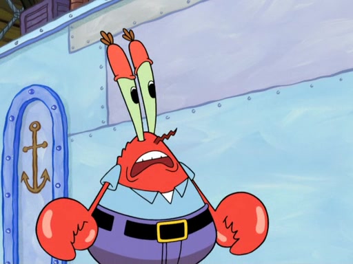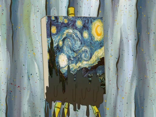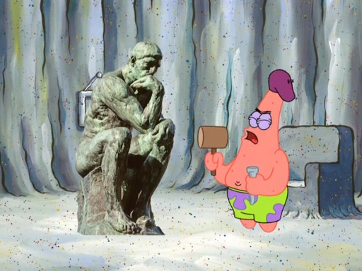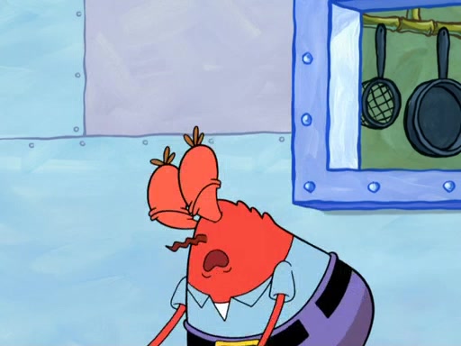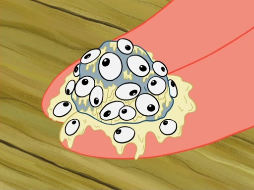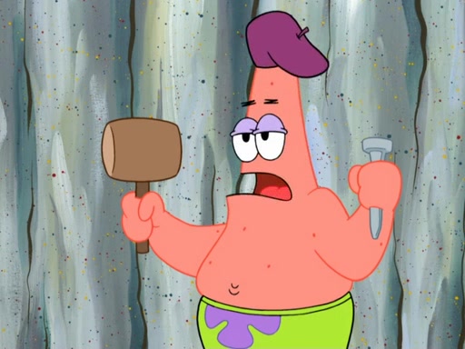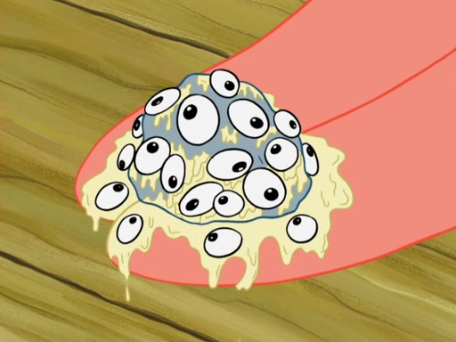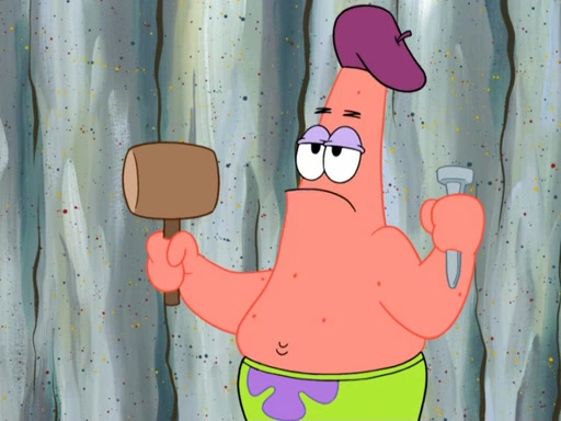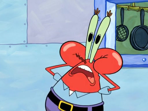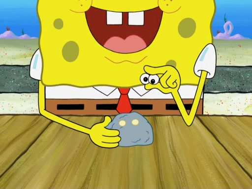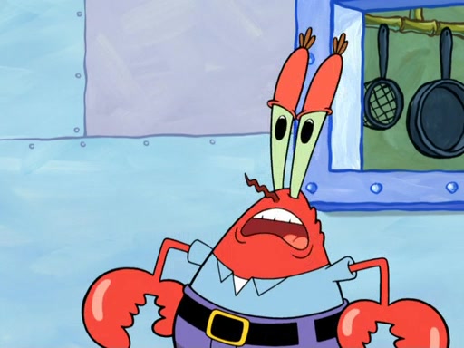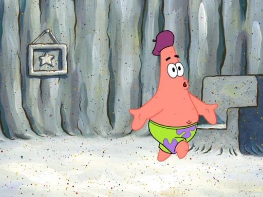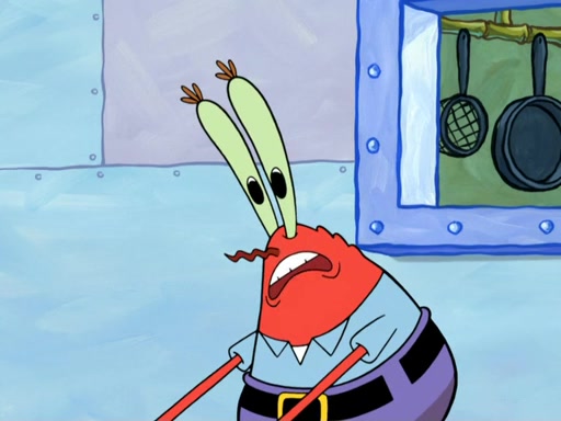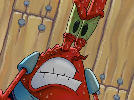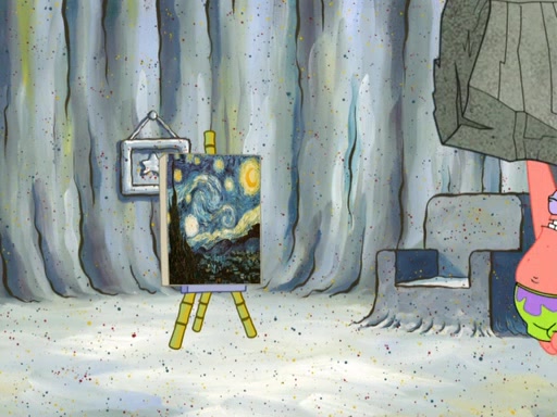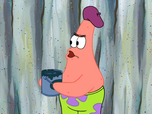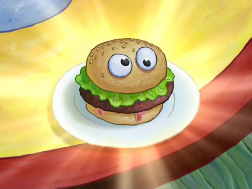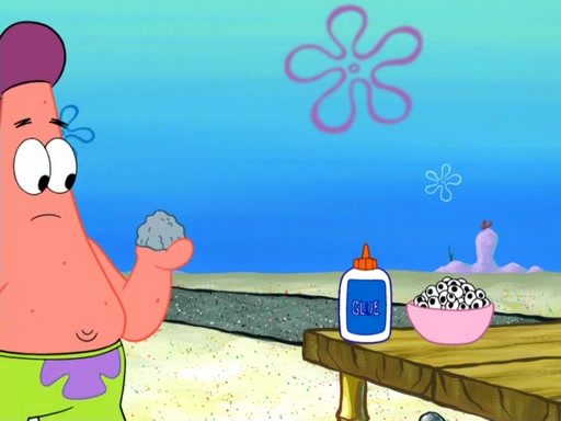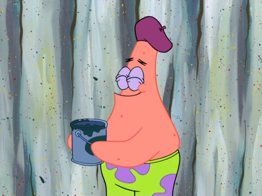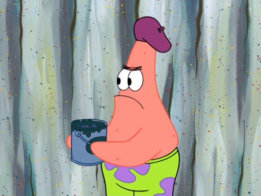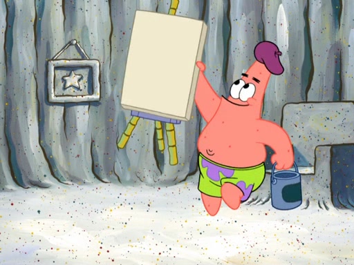 Patrick's artwork becomes so famous that he ran out of rocks, so he tried to find something else to make art with. First, he paints a beautiful scenery of the night sky and says it is lame. Then, he sculpts a man sitting down, thinking and says that it stinks too. Patrick goes to the Krusty Krab since it is his lunch time and he ordered art advice. Squidward complained it wasn't on the menu until Mr. Krabs appeared and put it on the menu. Mr. Krabs told Squidward to give Patrick art advice, but he didn't. He just told him to look at the patty. Then, he discovered that he can put google eyes on the patty. His Googly Patty got real famous when the art critic mentions that it is the next big thing. Everyone was rushing to the Krusty Krab to get one. Then, Mr. Krabs heard money. He rushed to the cash register and found none. He soon figures out that SpongeBob and Patrick were secretly selling Krabby Patties for $50 and holds them in his office. Squidward sneers at them for getting into trouble, but Patrick said that he followed Squidward's advice. Hearing this, Mr. Krabs realized this was all Squidward's doing and gets really angry at him. So, Mr. Krabs put good use to Squidward.