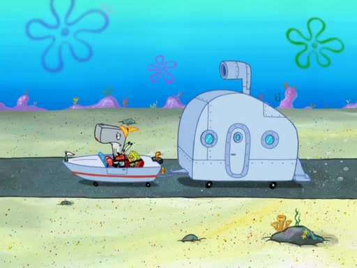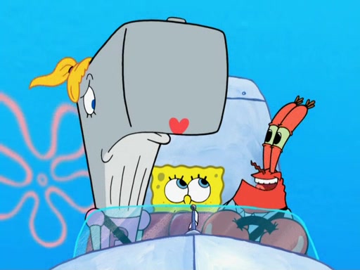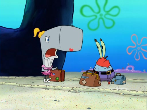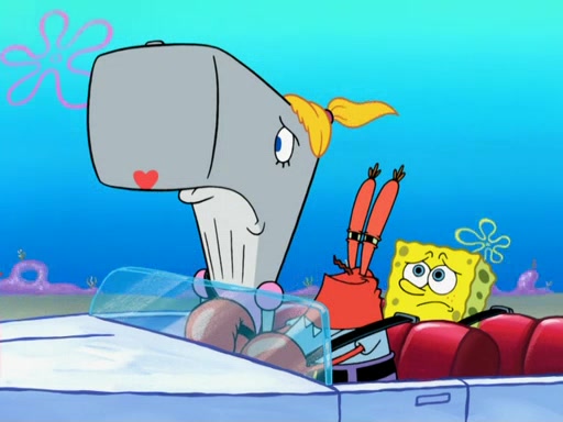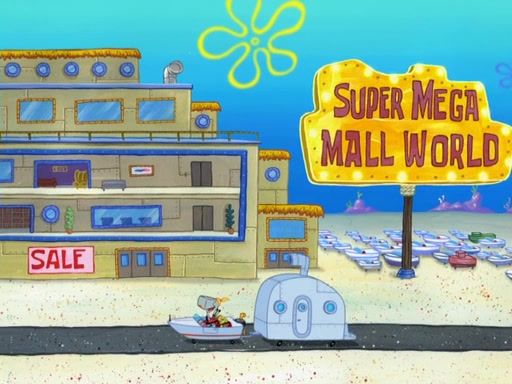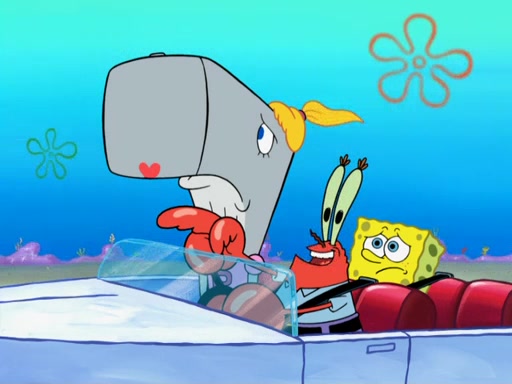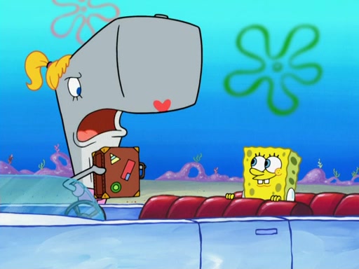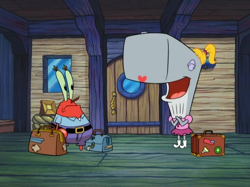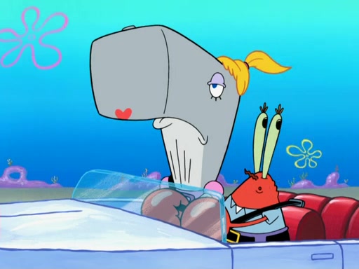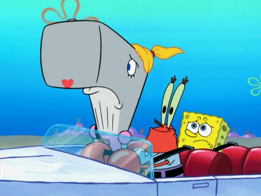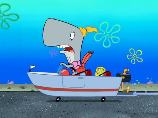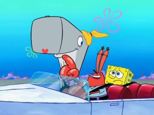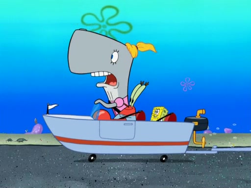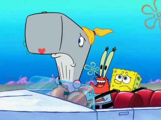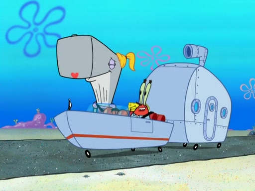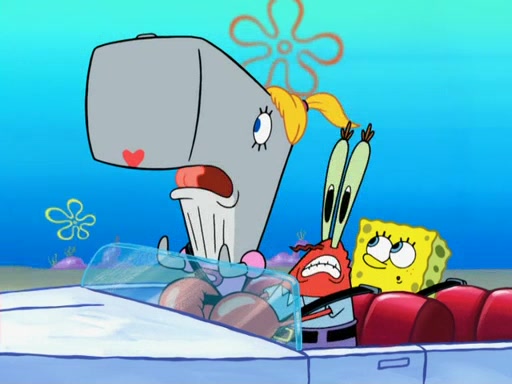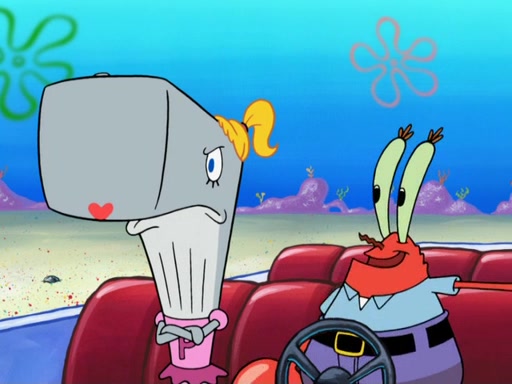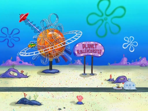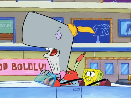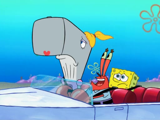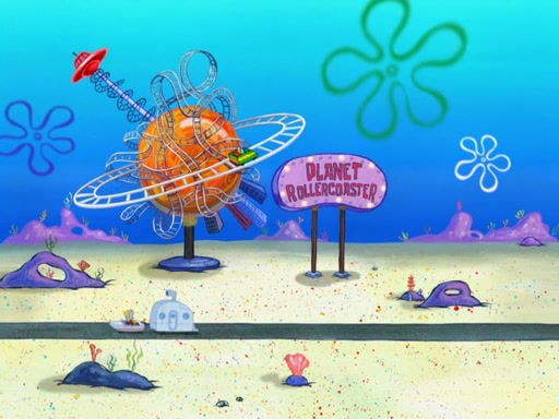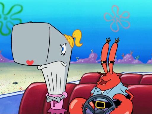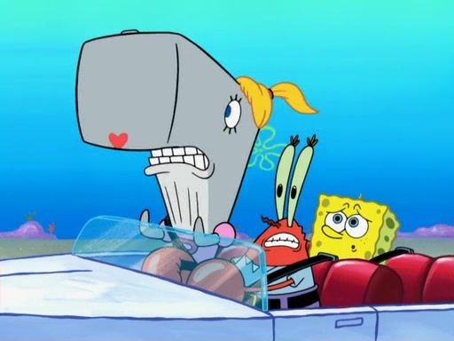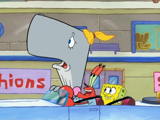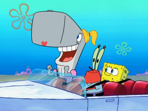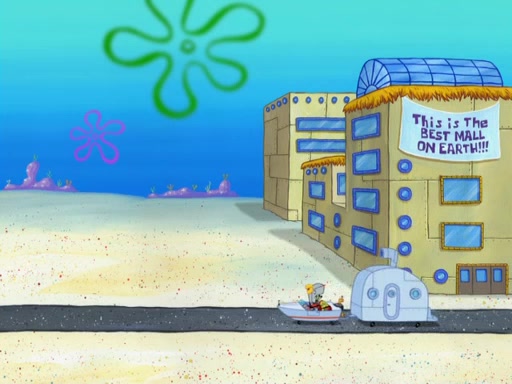 Cuts to flashback, Squidward is about to give out change to a customer but suddenly, Mr. Krabs calls all his employees into his office. In his office, Mr. Krabs says that he will take either Squidward or SpongeBob with him and Pearl on a roadtrip, but then Squidward gets up and leaves (glad that he's closing it down), leaving Mr. Krabs to choose SpongeBob for the trip. Pearl isn't happy, throwing a suitcase on to SpongeBob, telling him not to get up until they leave town. After they leave, SpongeBob asks if he can get up and Pearl says "sure." They pass Super Mega Mall World and Pearl thinks that they are going there, but Mr. Krabs promises where they are going is way better. They then pass Planet Rollercoaster and once again, Pearl thinks that they are going there and Mr. Krabs says where they are going is a hundred times better.